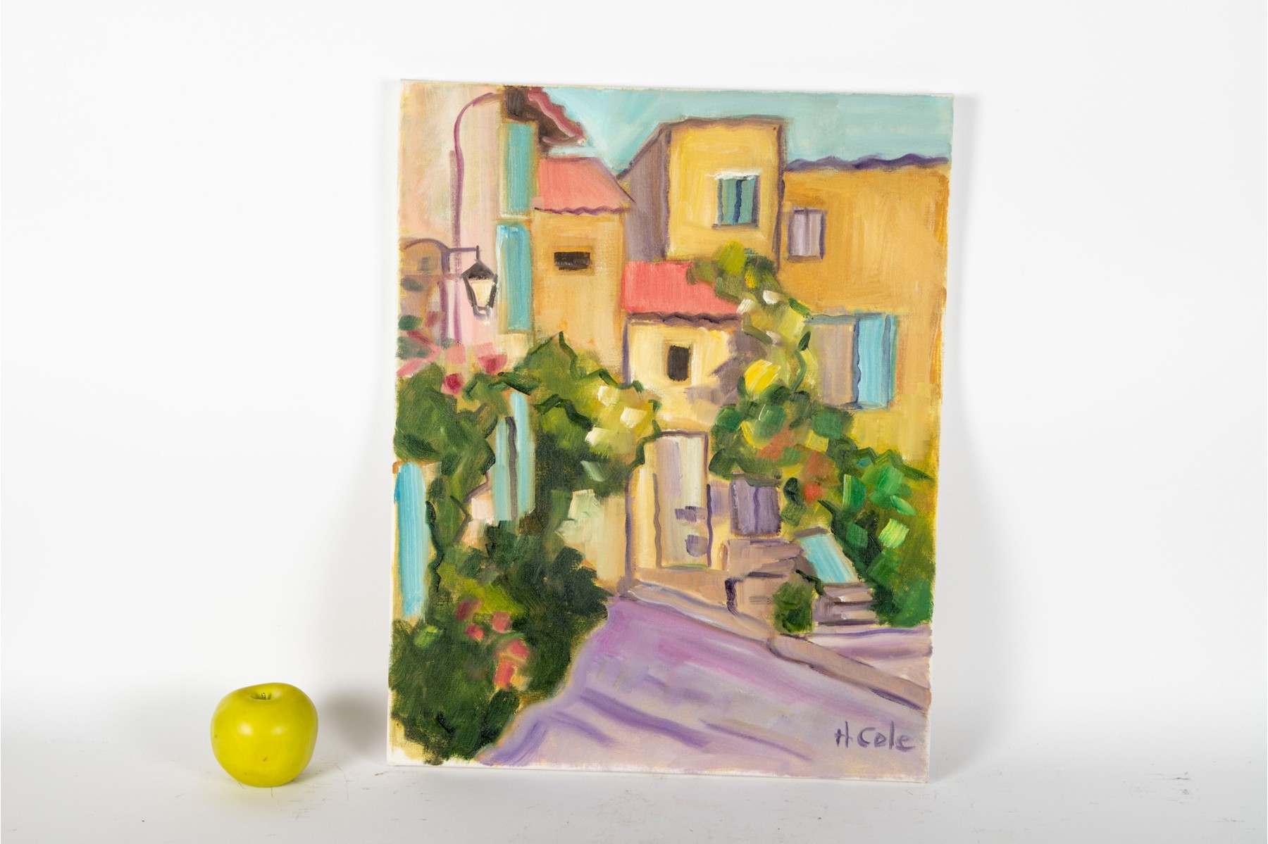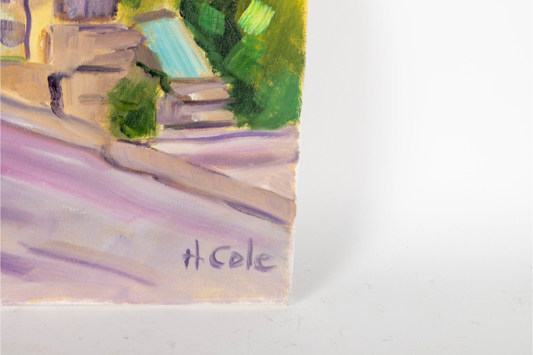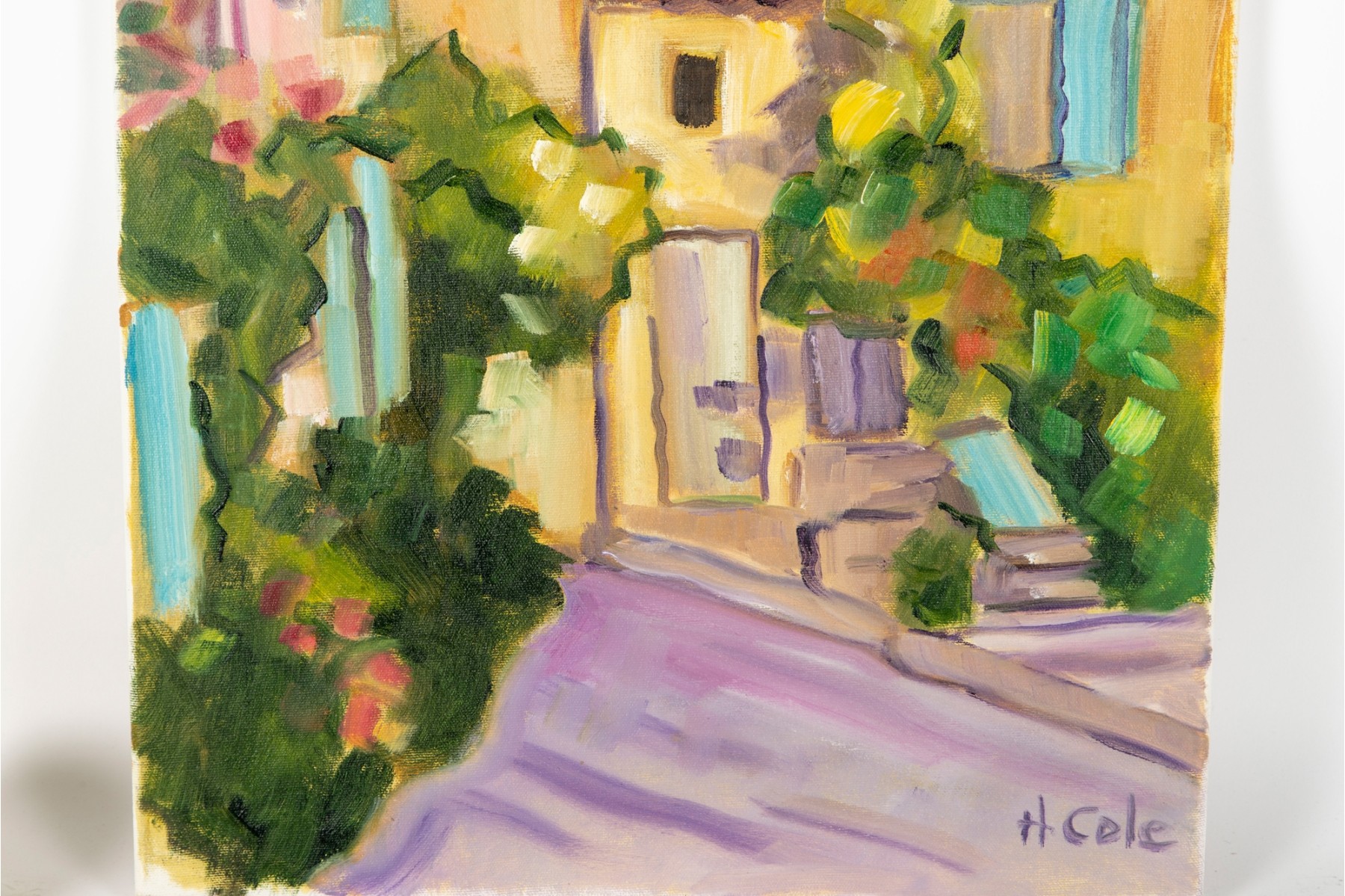 A classic painterly style oil on canvas scene of Brantome, France's vibrant streets. The artwork was created and signed by local North Carolina artist Hannah Cole Buie (B. 1955), and is presented openly without a frame.