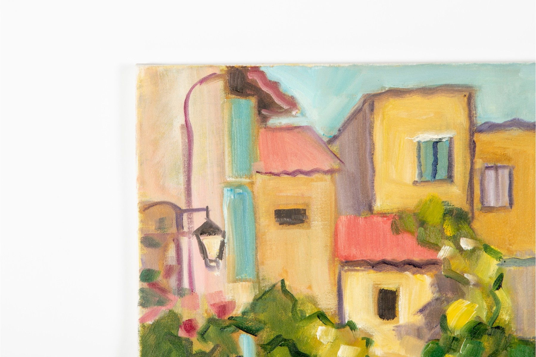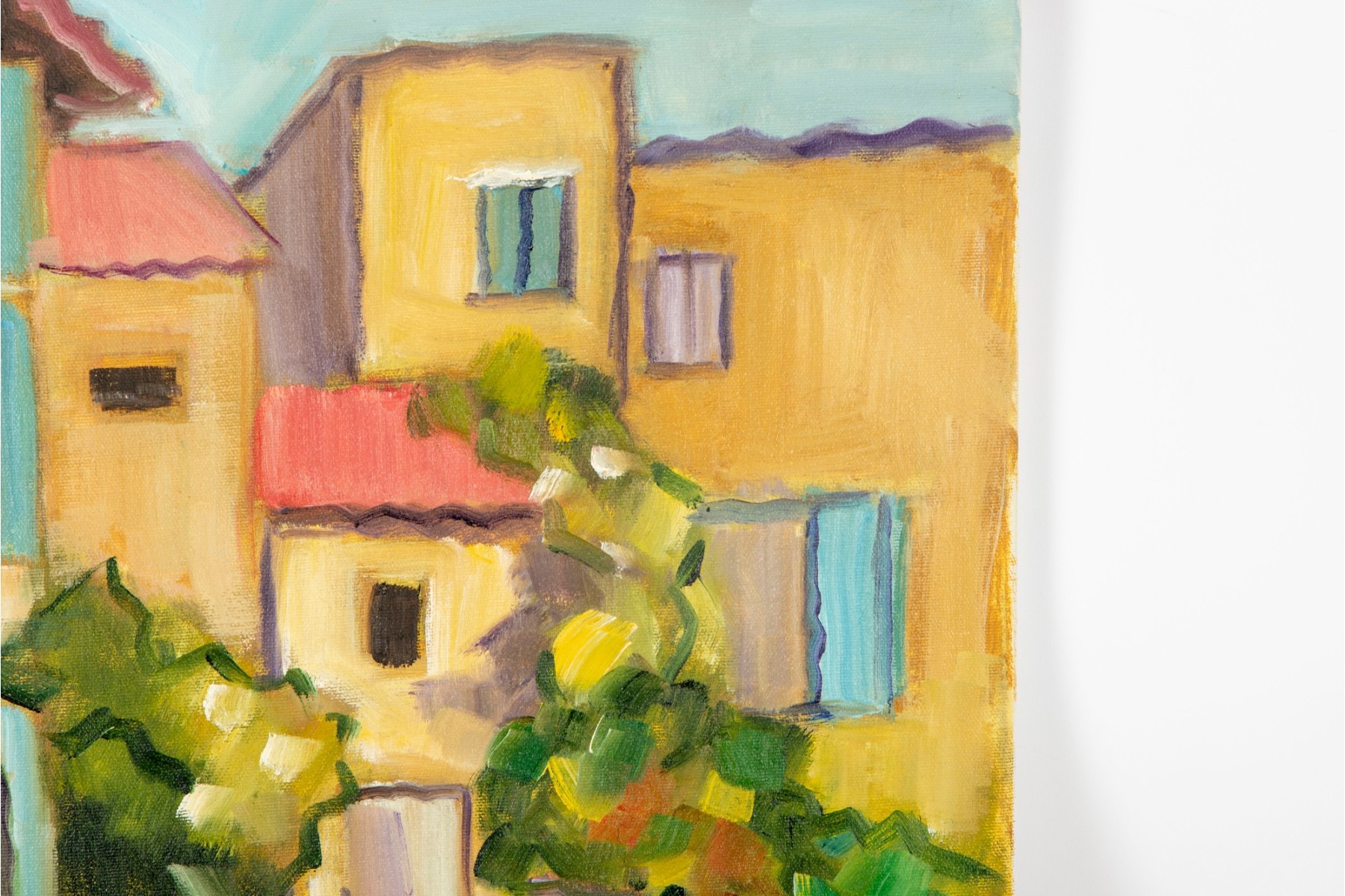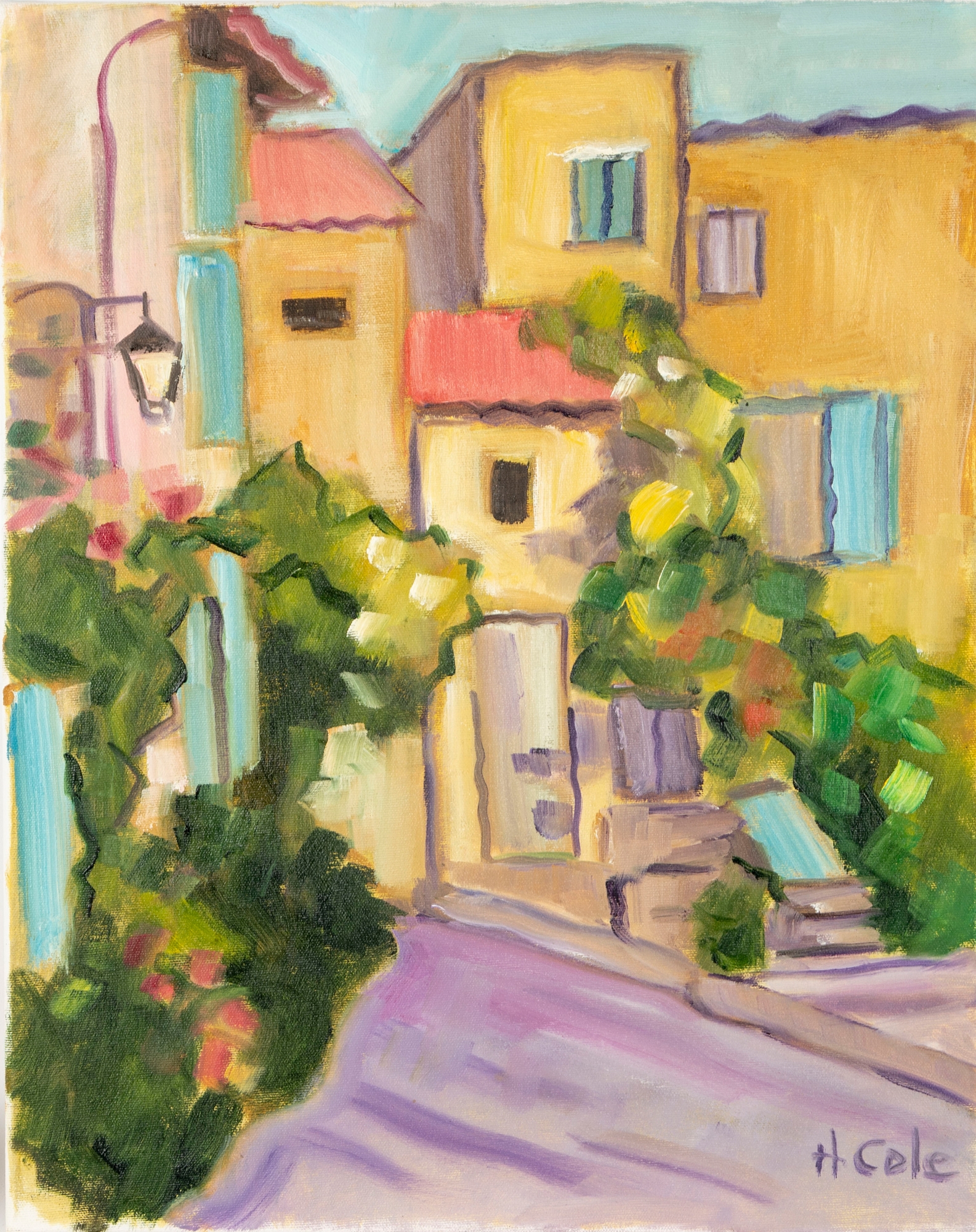 A classic painterly style oil on canvas scene of Brantome, France's vibrant streets. The artwork was created and signed by local North Carolina artist Hannah Cole Buie (B. 1955), and is presented openly without a frame.