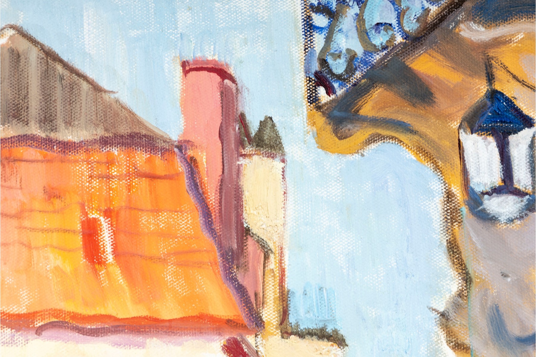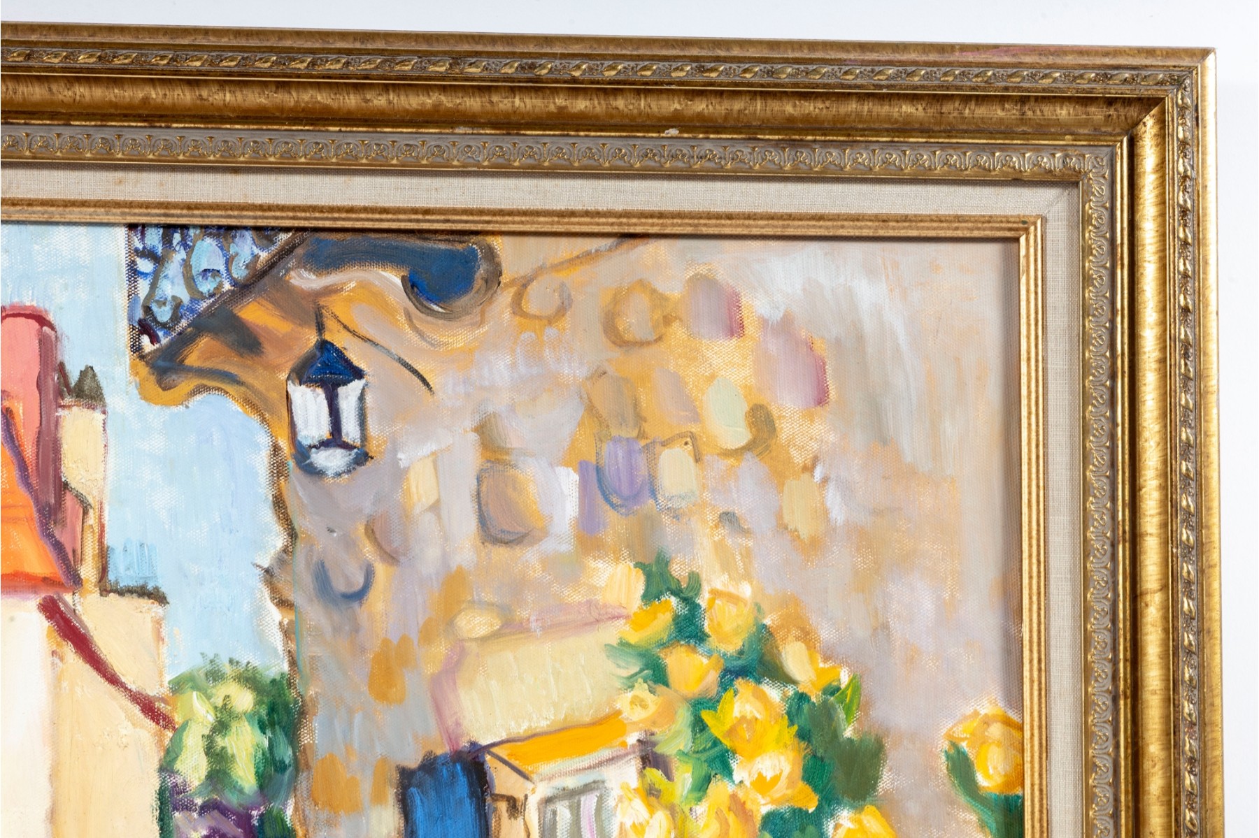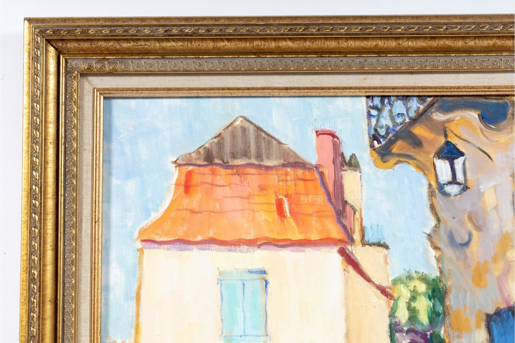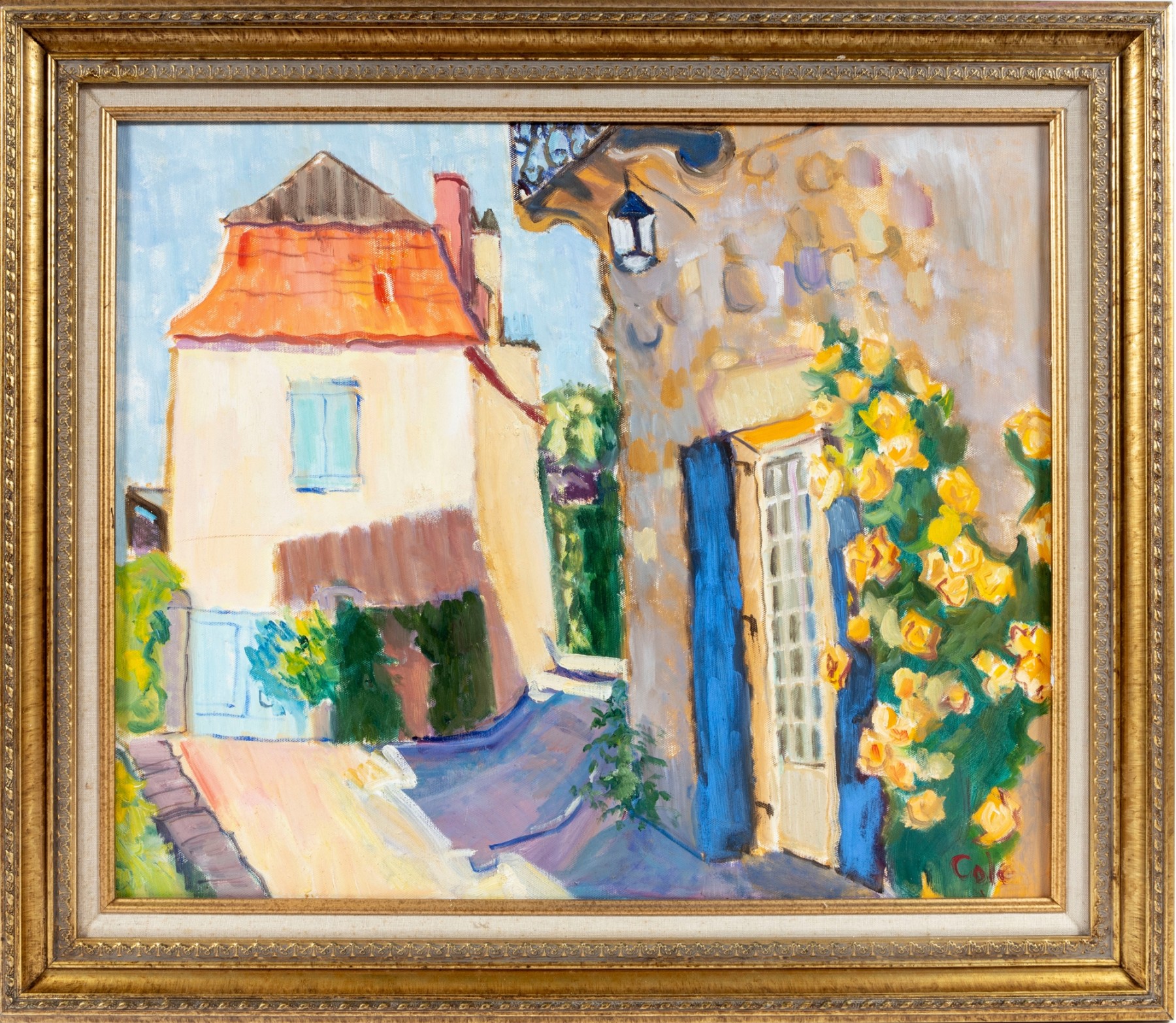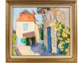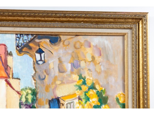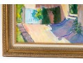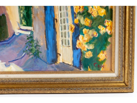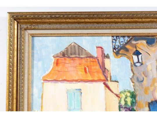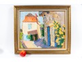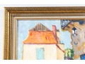 An oil on canvas painting displaying a landscape likely inspired by the dwellings of Brantome, France. The artwork was created and signed by local North Carolina artist Hannah Cole Buie (B. 1955), and is presented openly within an ornate. distr gold-tone wood frame.