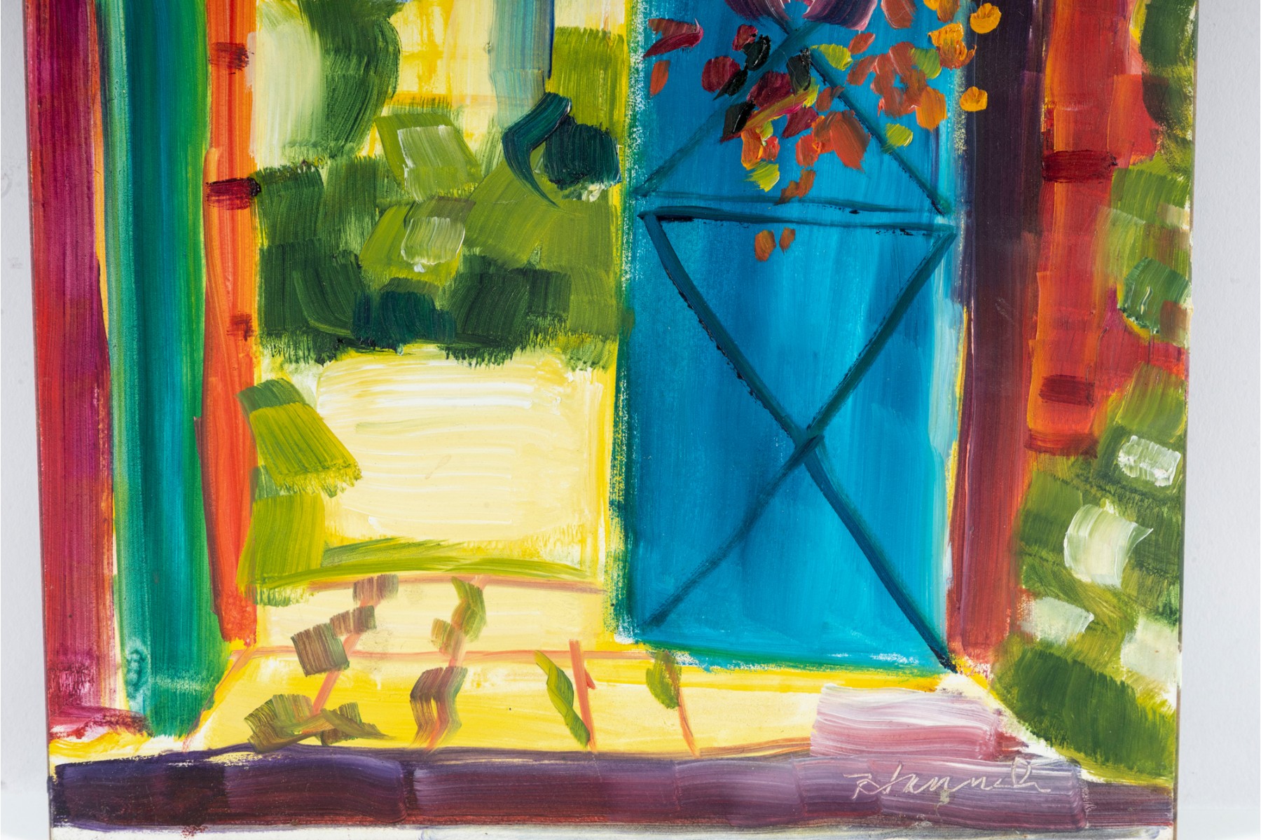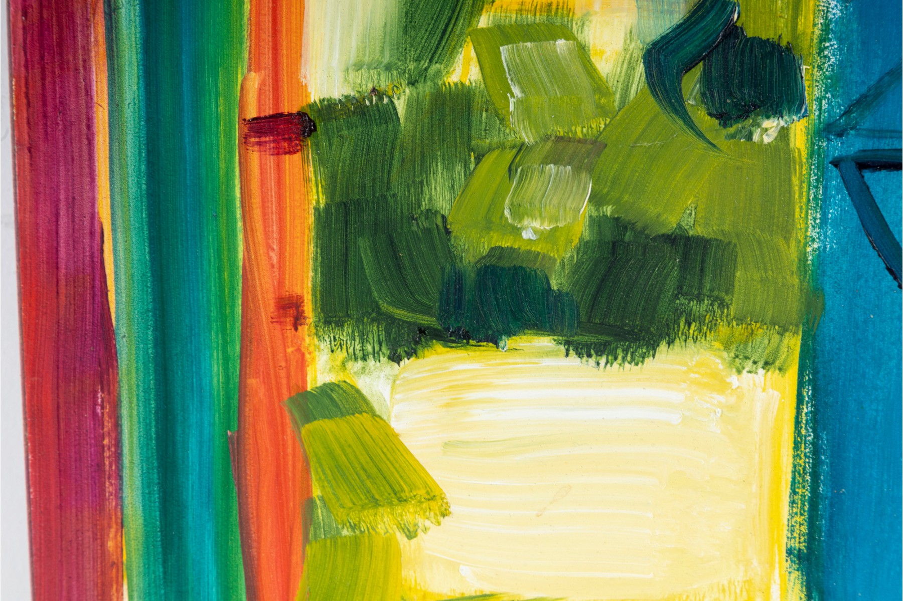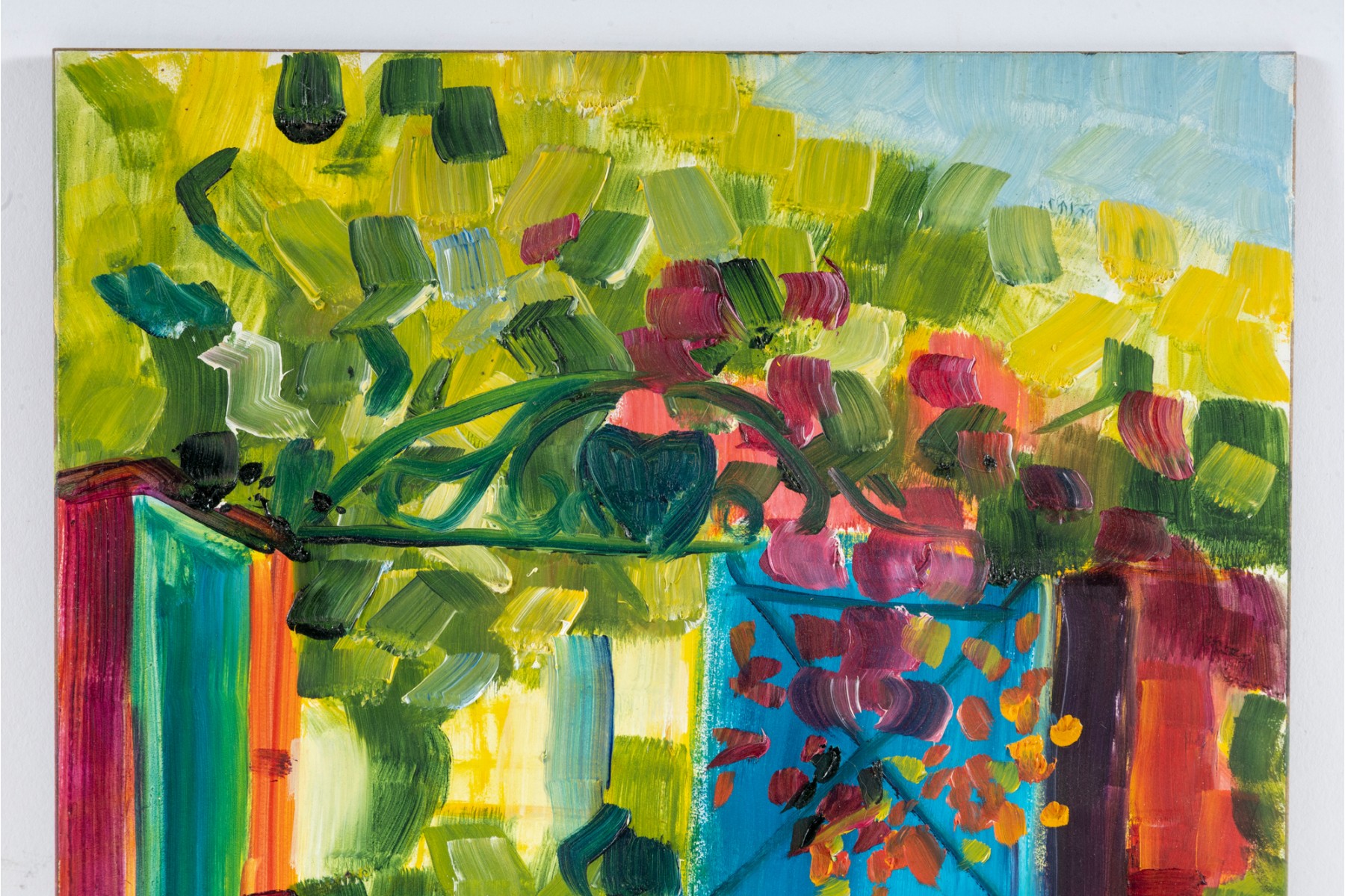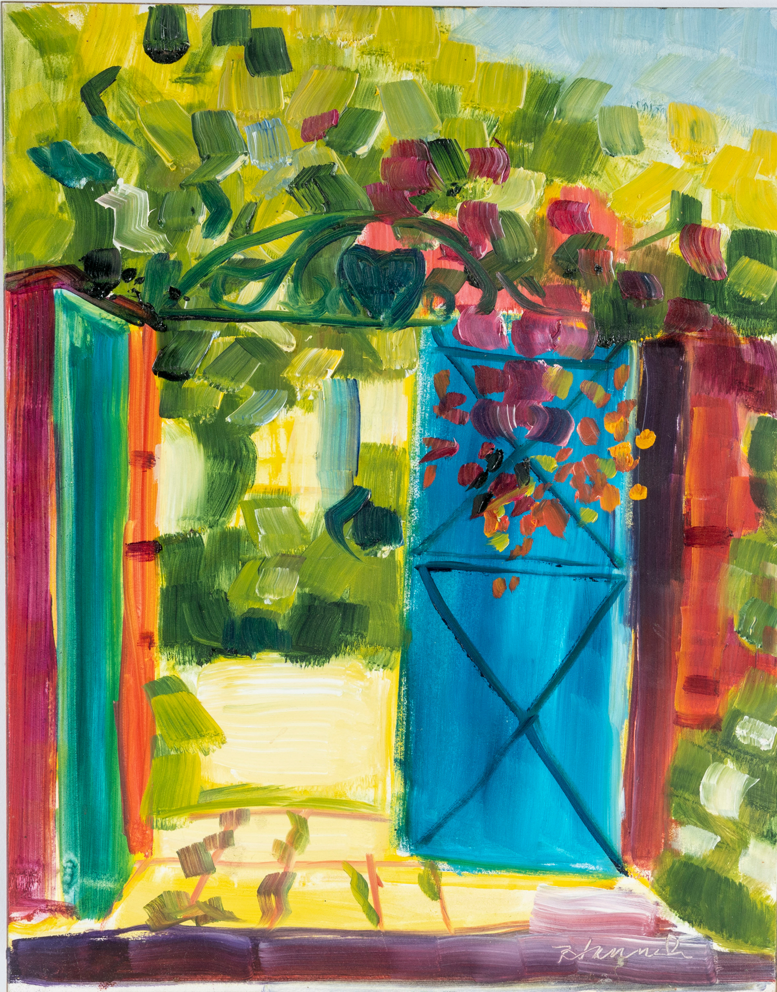Hannah Cole Buie (American, B. 1955) oil painting on board depicting an impressionist garden gate with a vibrant polychromatic door in blue, orange, and burgundy topped with a green openwork crest adorned with a heart motif. The gate opens to a lush forest of dappled greens under a clear blue sky. Signed lower right. Unframed.