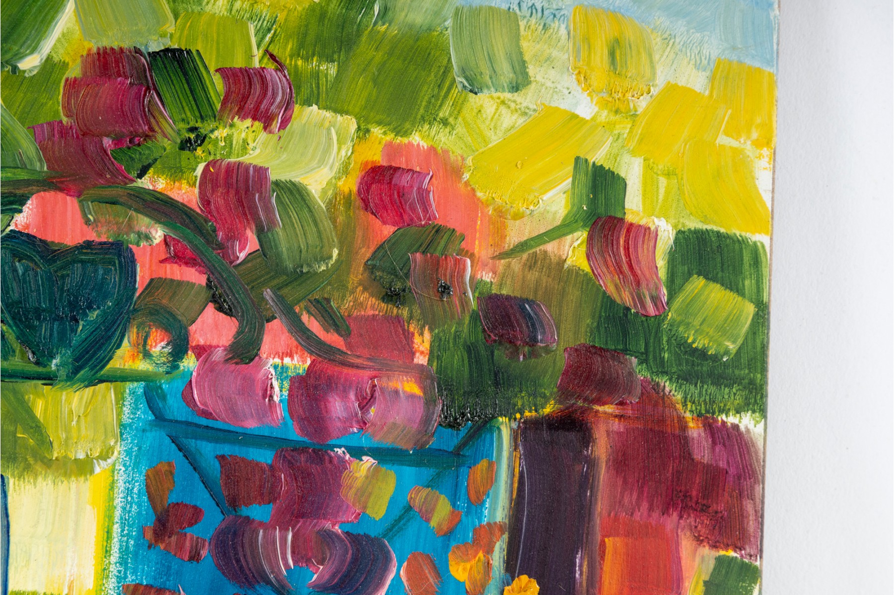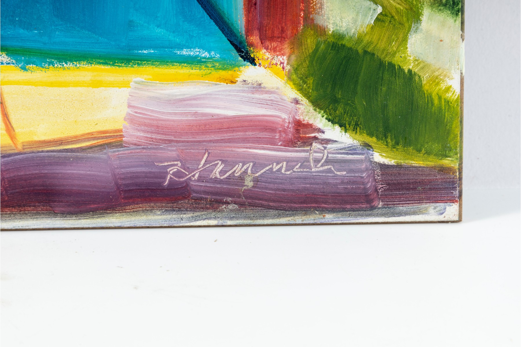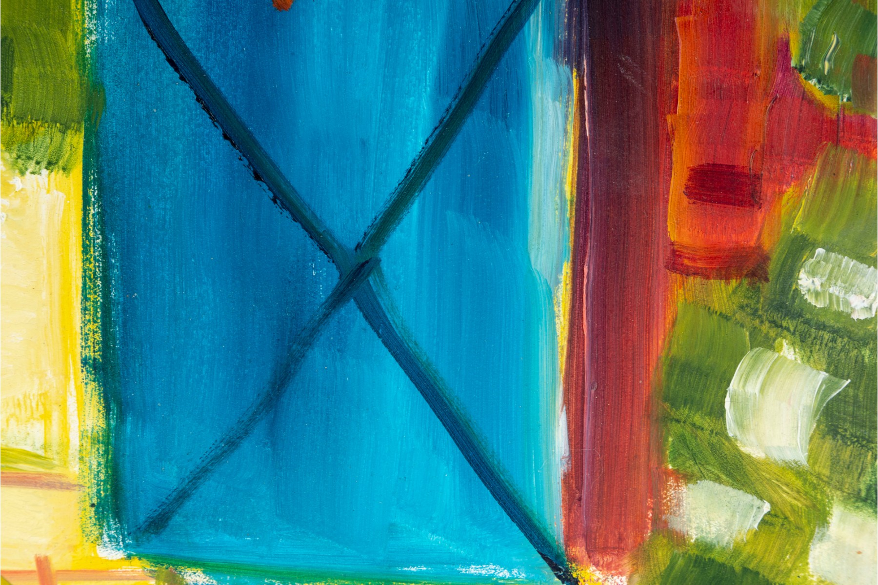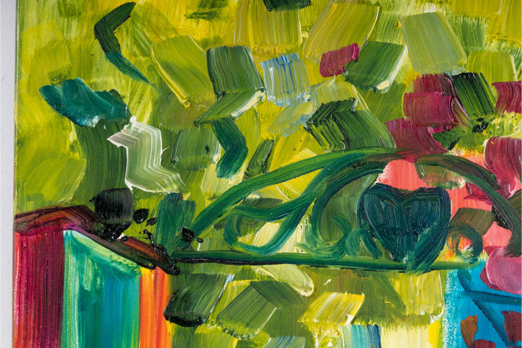 Hannah Cole Buie (American, B. 1955) oil painting on board depicting an impressionist garden gate with a vibrant polychromatic door in blue, orange, and burgundy topped with a green openwork crest adorned with a heart motif. The gate opens to a lush forest of dappled greens under a clear blue sky. Signed lower right. Unframed.