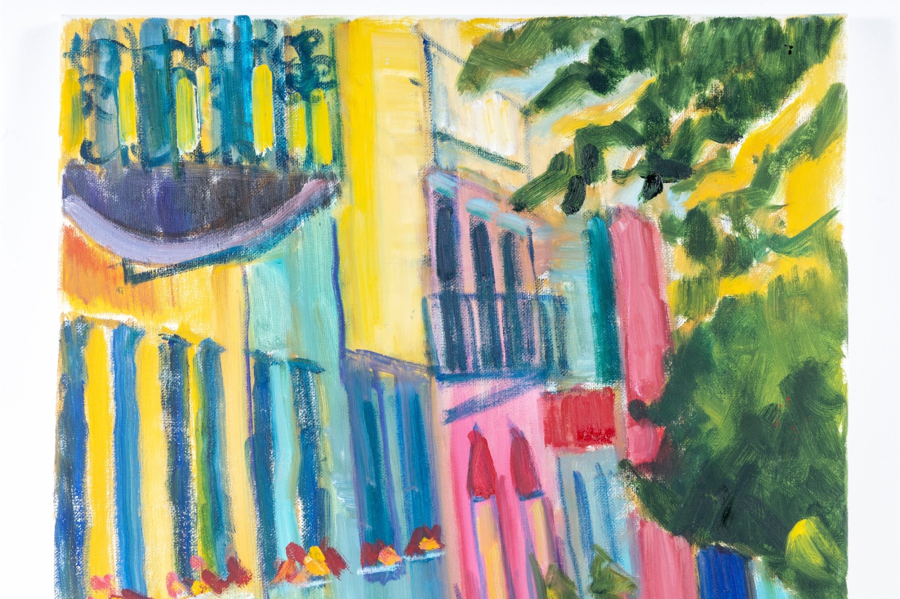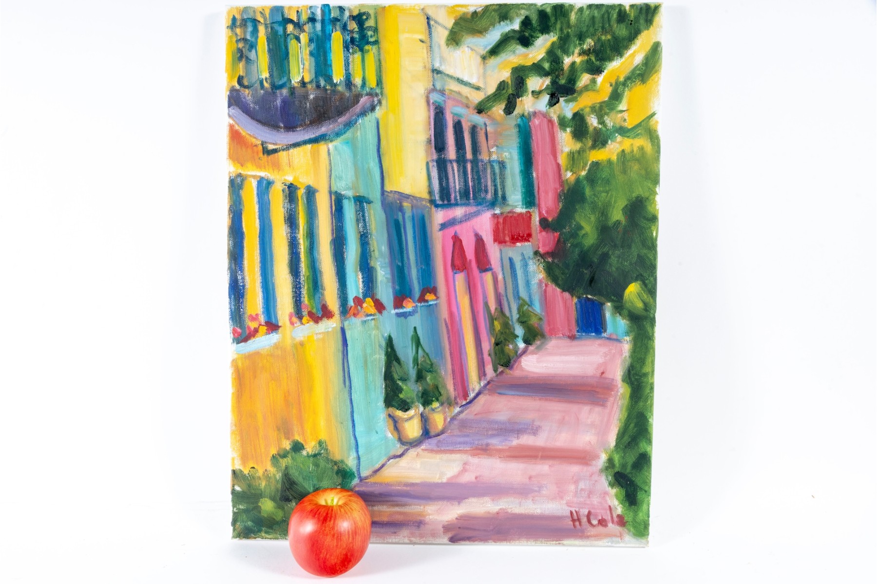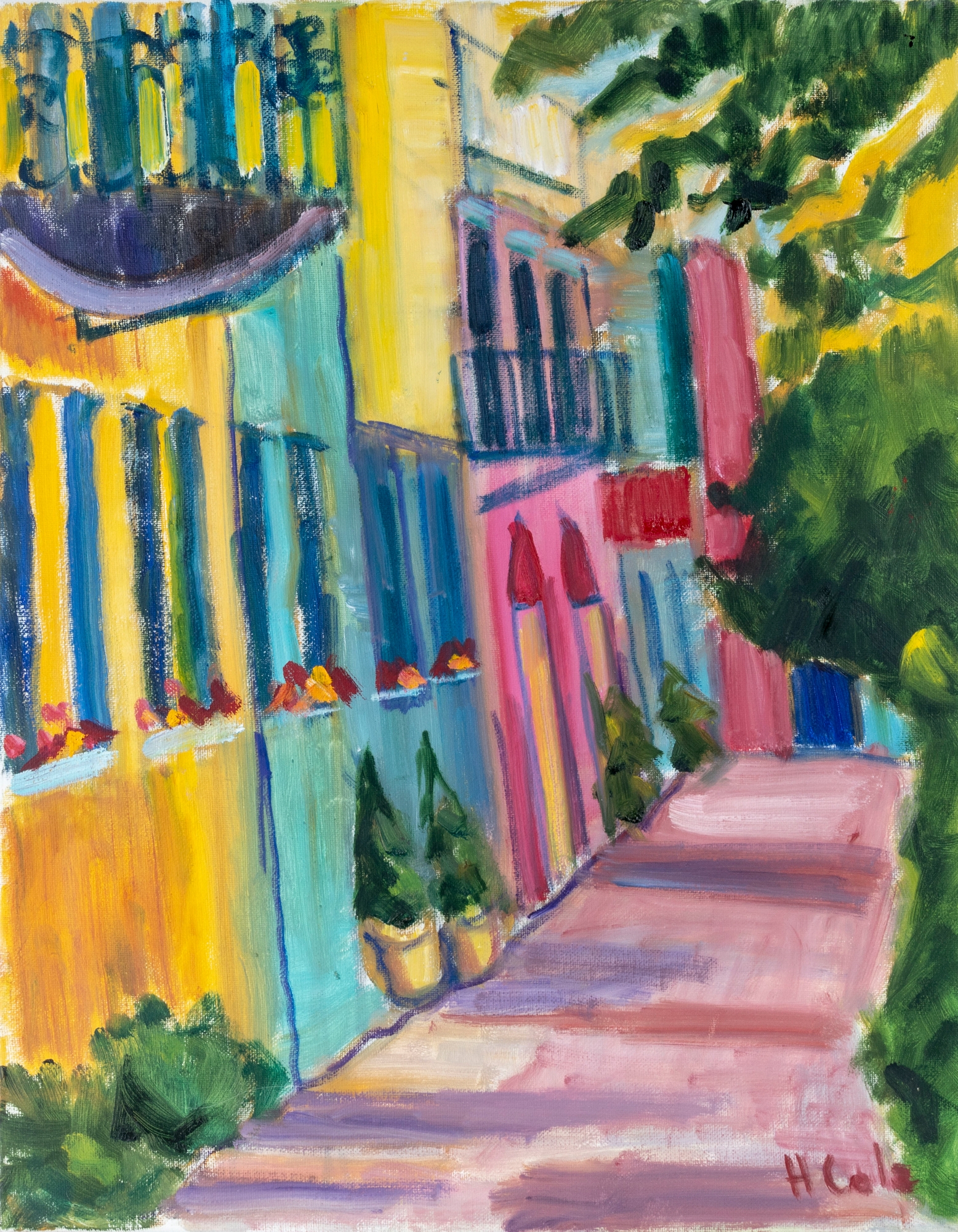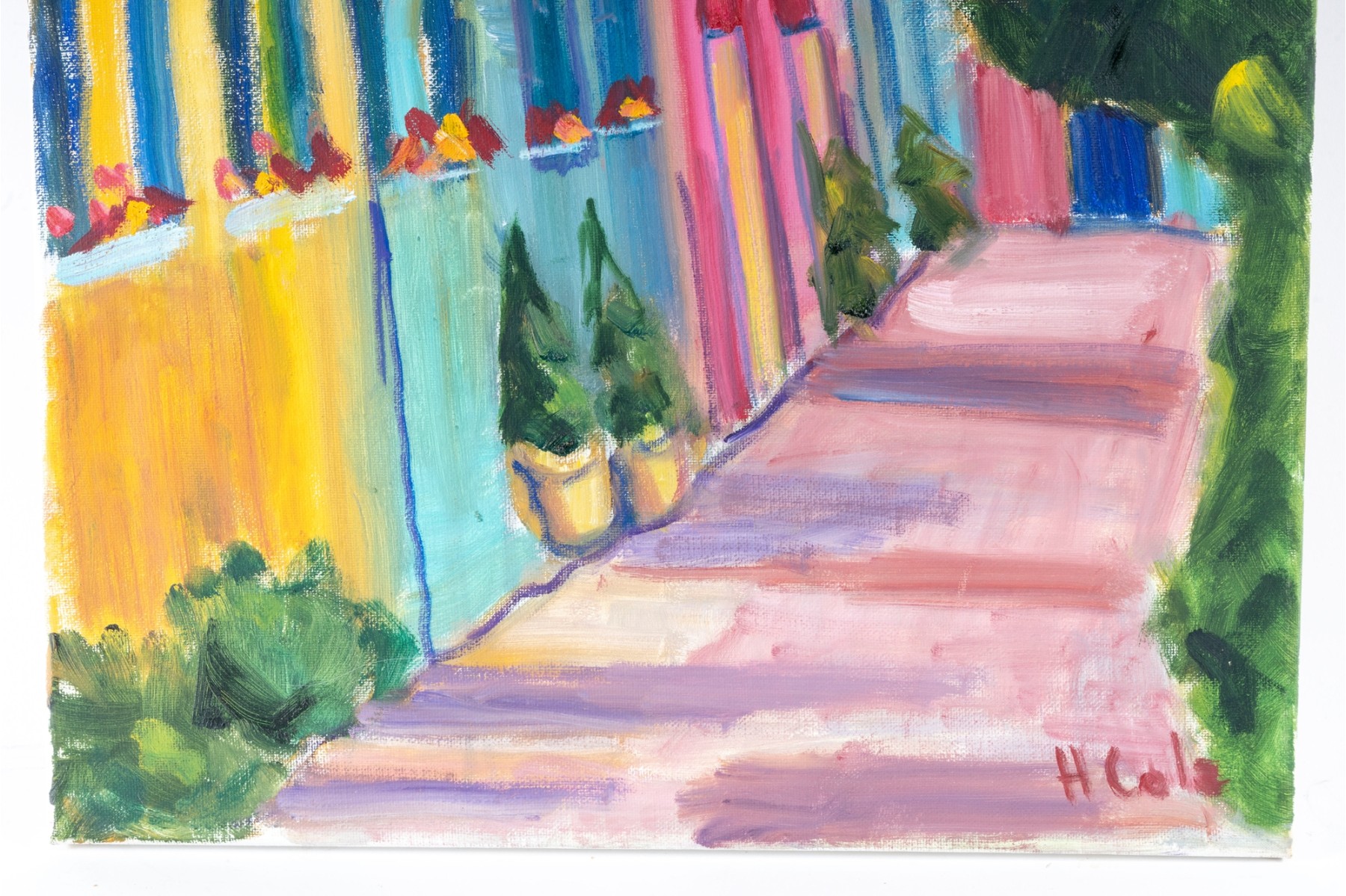 Hannah Cole Buie (American, B. 1955) oil painting on canvas depicting an urban sidewalk along a tall building facade lined with vibrant, lush foliage. The scene is rendered in vibrant yellow, aqua, pink, red, and blue, creating a cheerful and uplifting atmosphere. Signed lower right. The canvas is mounted to a stretcher, unframed.