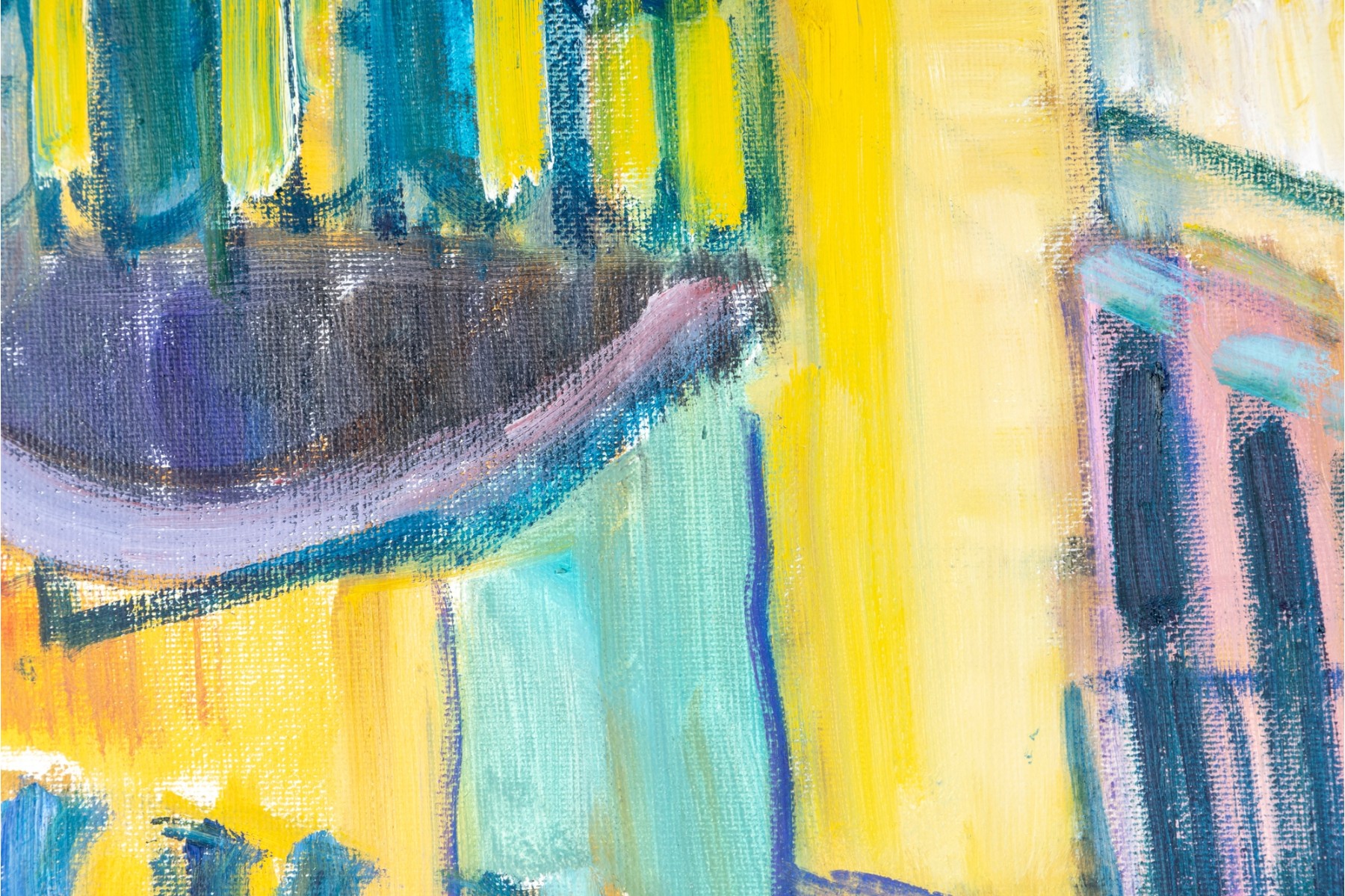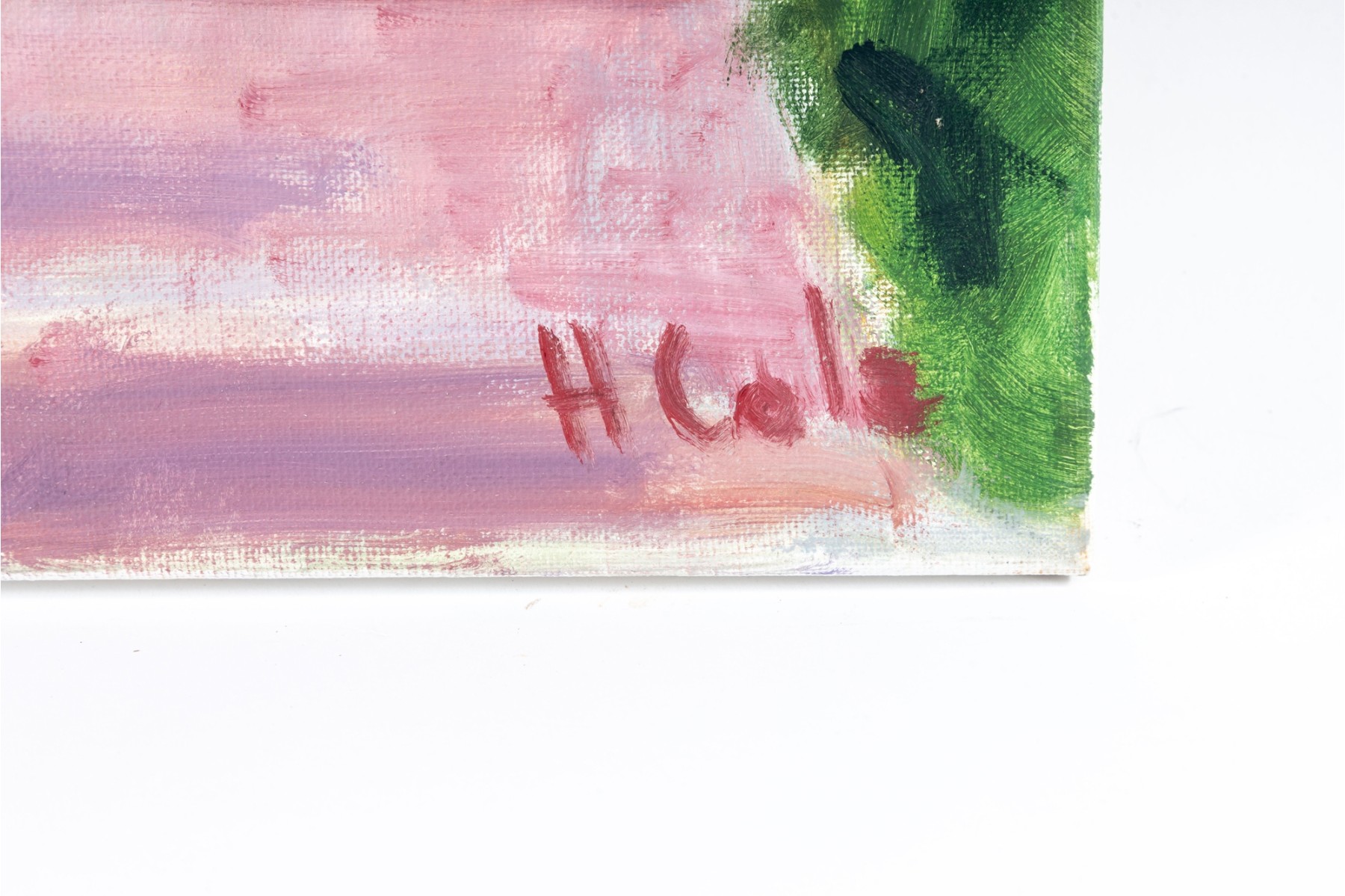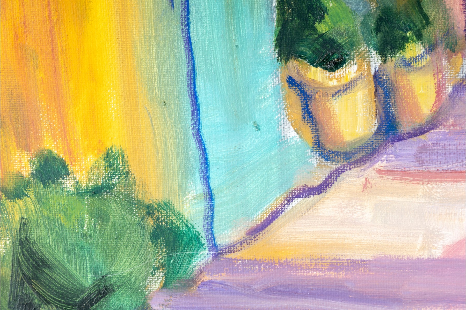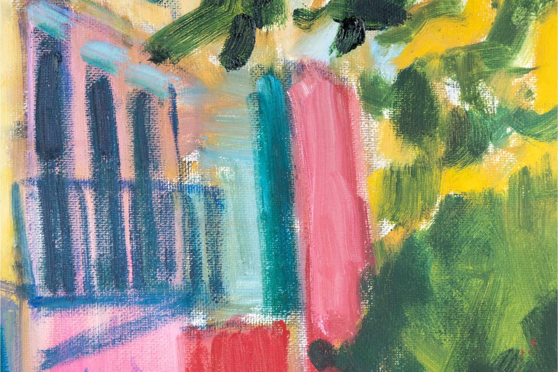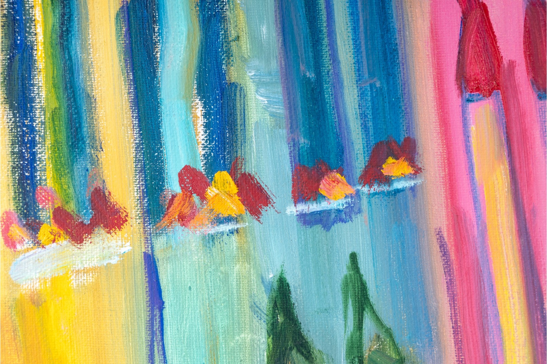 Hannah Cole Buie (American, B. 1955) oil painting on canvas depicting an urban sidewalk along a tall building facade lined with vibrant, lush foliage. The scene is rendered in vibrant yellow, aqua, pink, red, and blue, creating a cheerful and uplifting atmosphere. Signed lower right. The canvas is mounted to a stretcher, unframed.