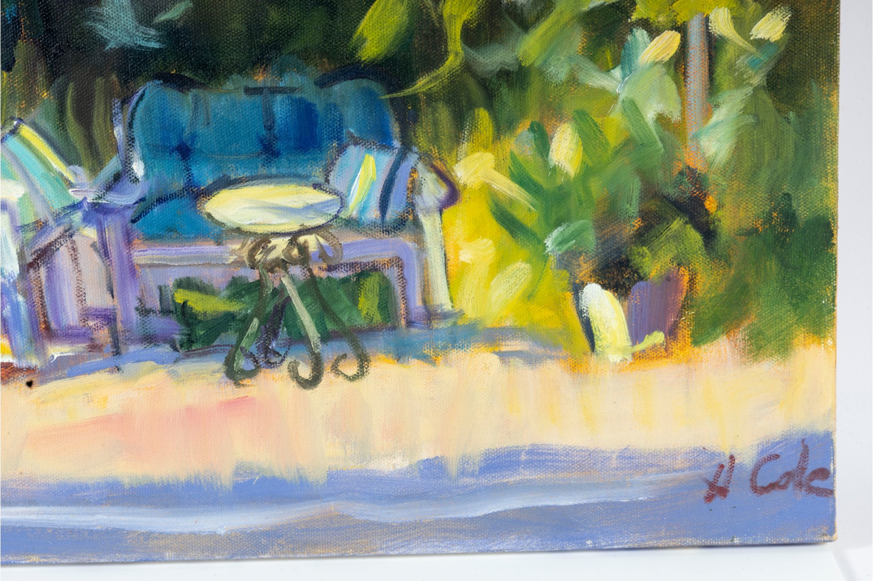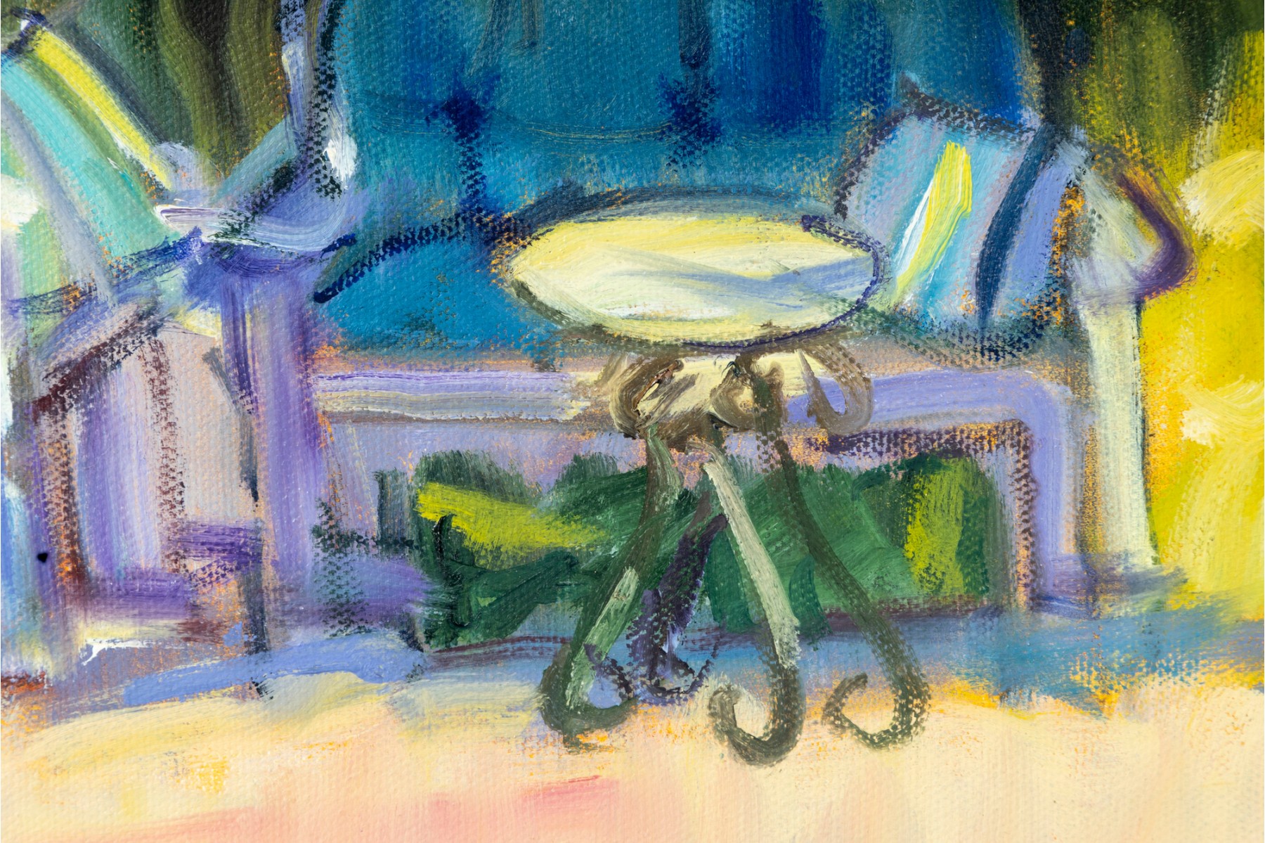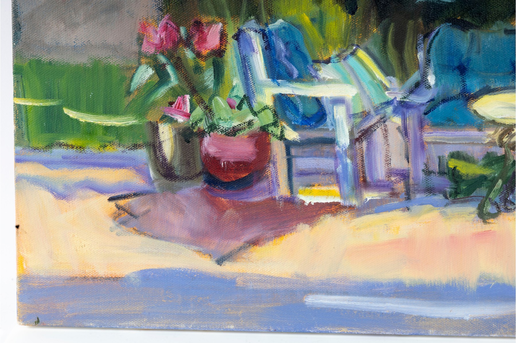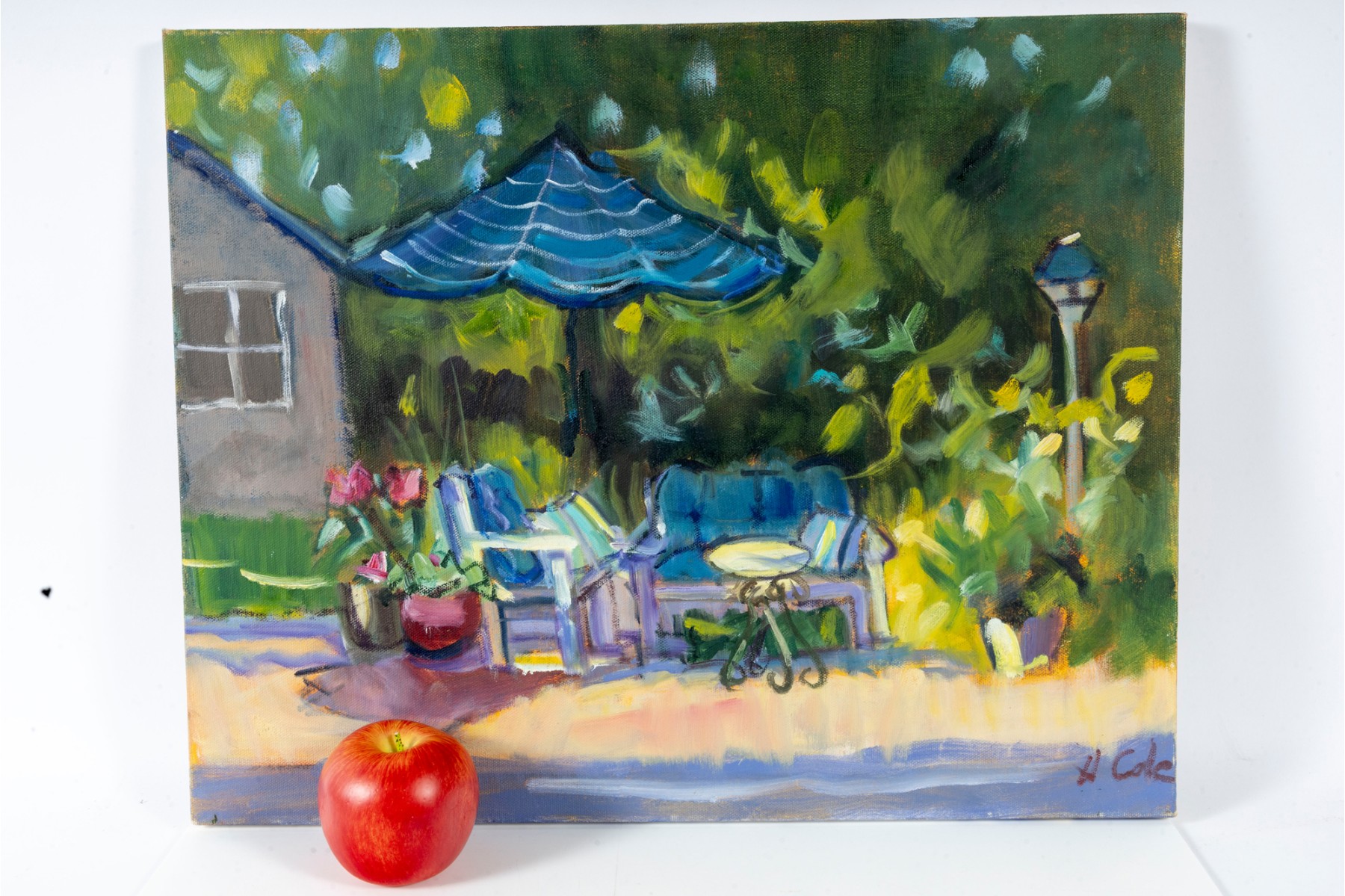 An oil on canvas painting produced and signed by local North Carolina artist Hannah Cole Buie. The painting depicts a bright and colorful scene of a lone patio set, and is presented openly without a frame.