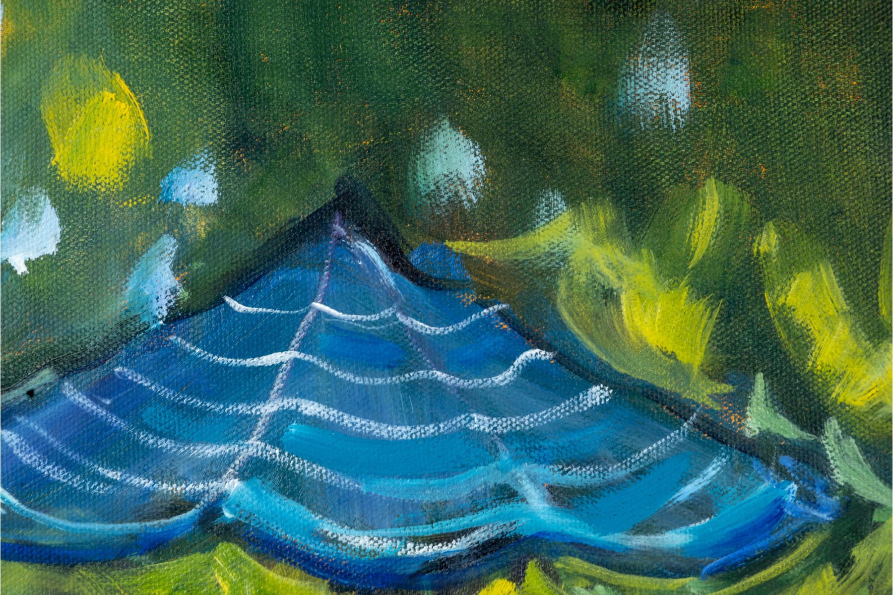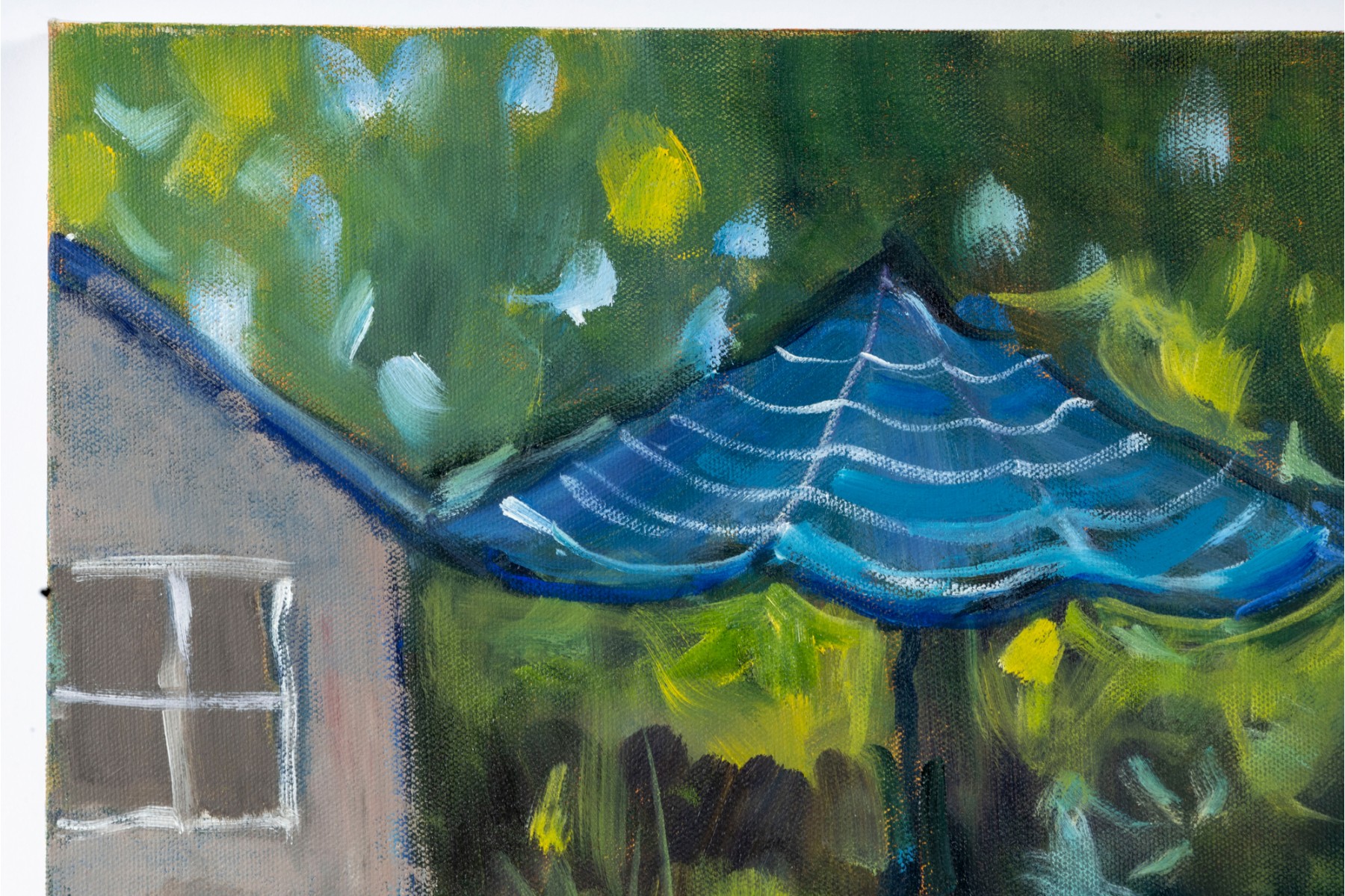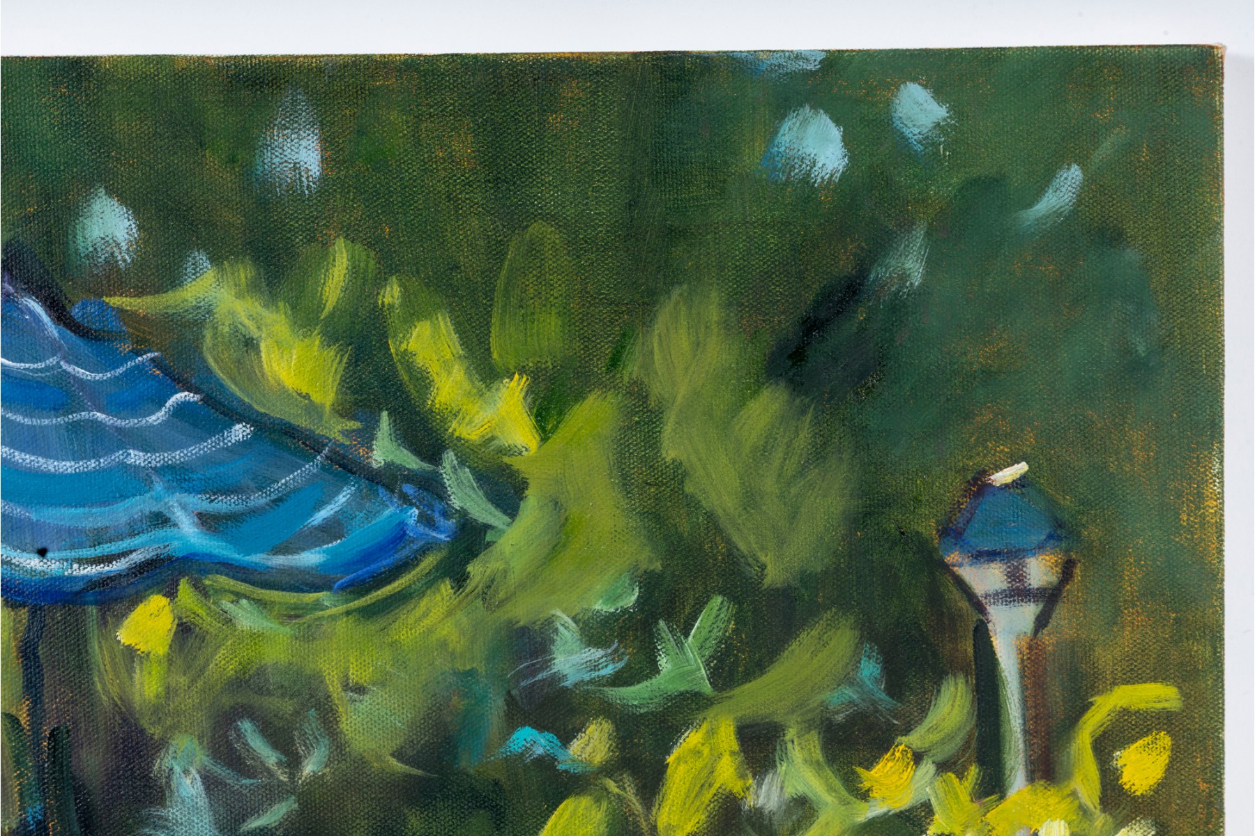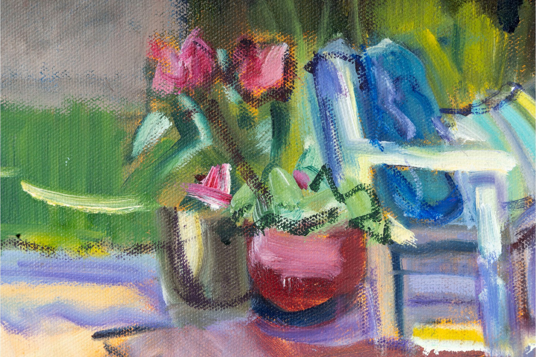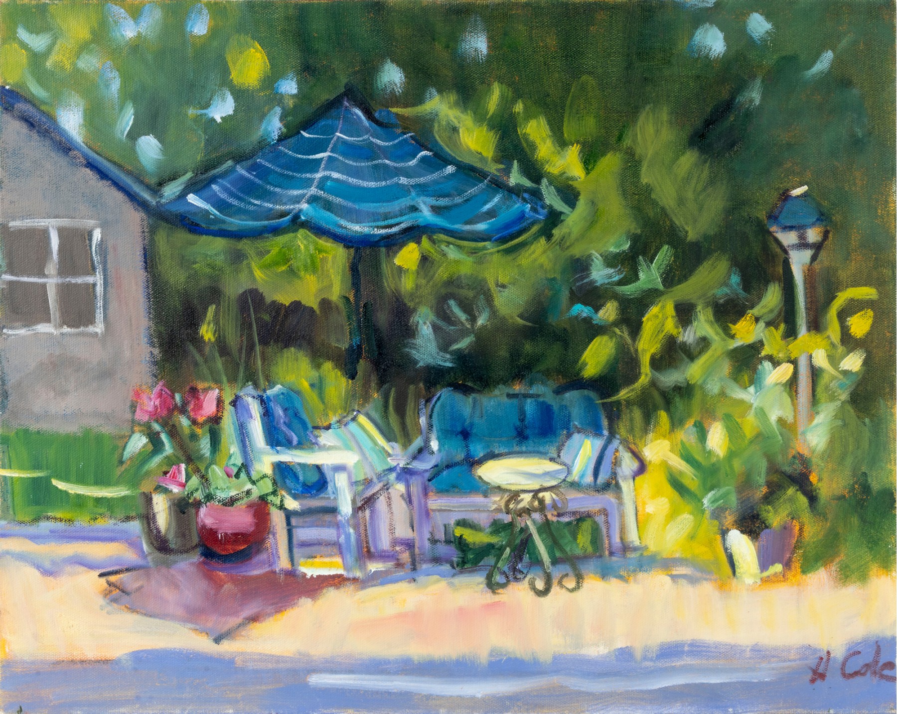 An oil on canvas painting produced and signed by local North Carolina artist Hannah Cole Buie. The painting depicts a bright and colorful scene of a lone patio set, and is presented openly without a frame.
