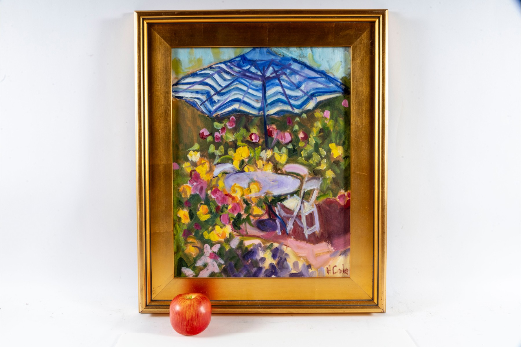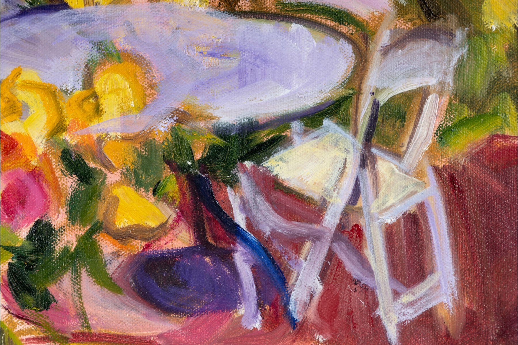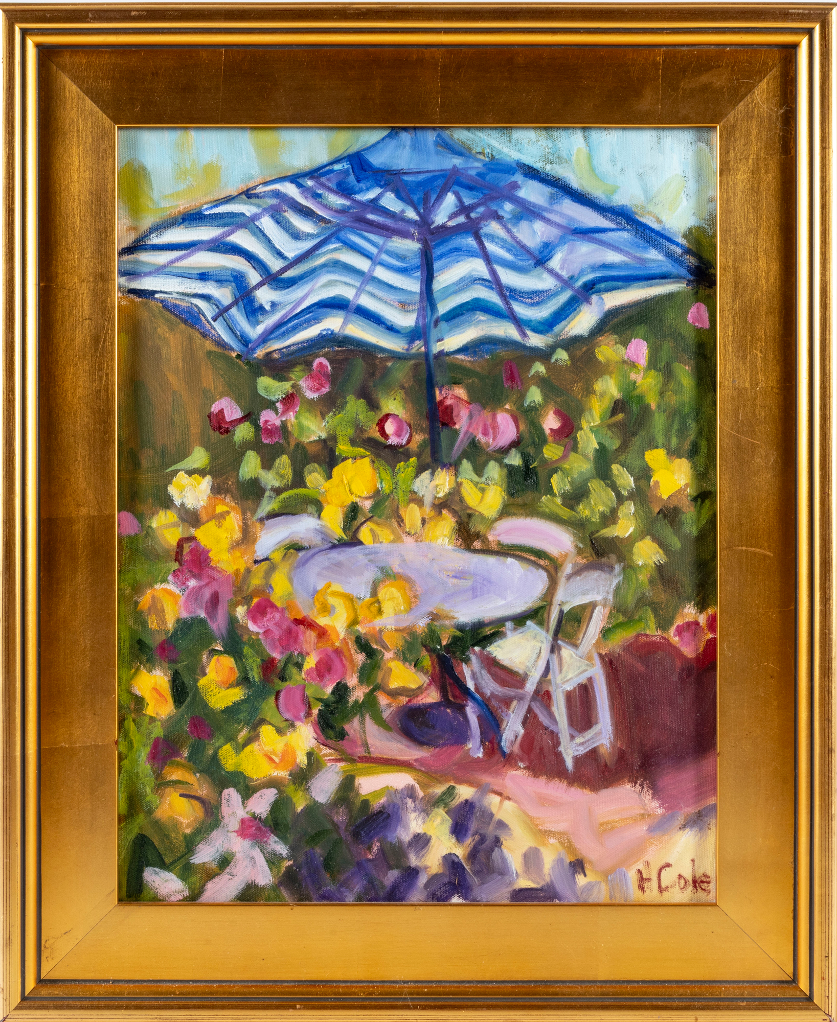 An oil on canvas painting produced and signed by local North Carolina artist Hannah Cole Buie. The painting depicts a bright and colorful scene of a lone patio set, and is presented openly within a a gold tone wood frame.