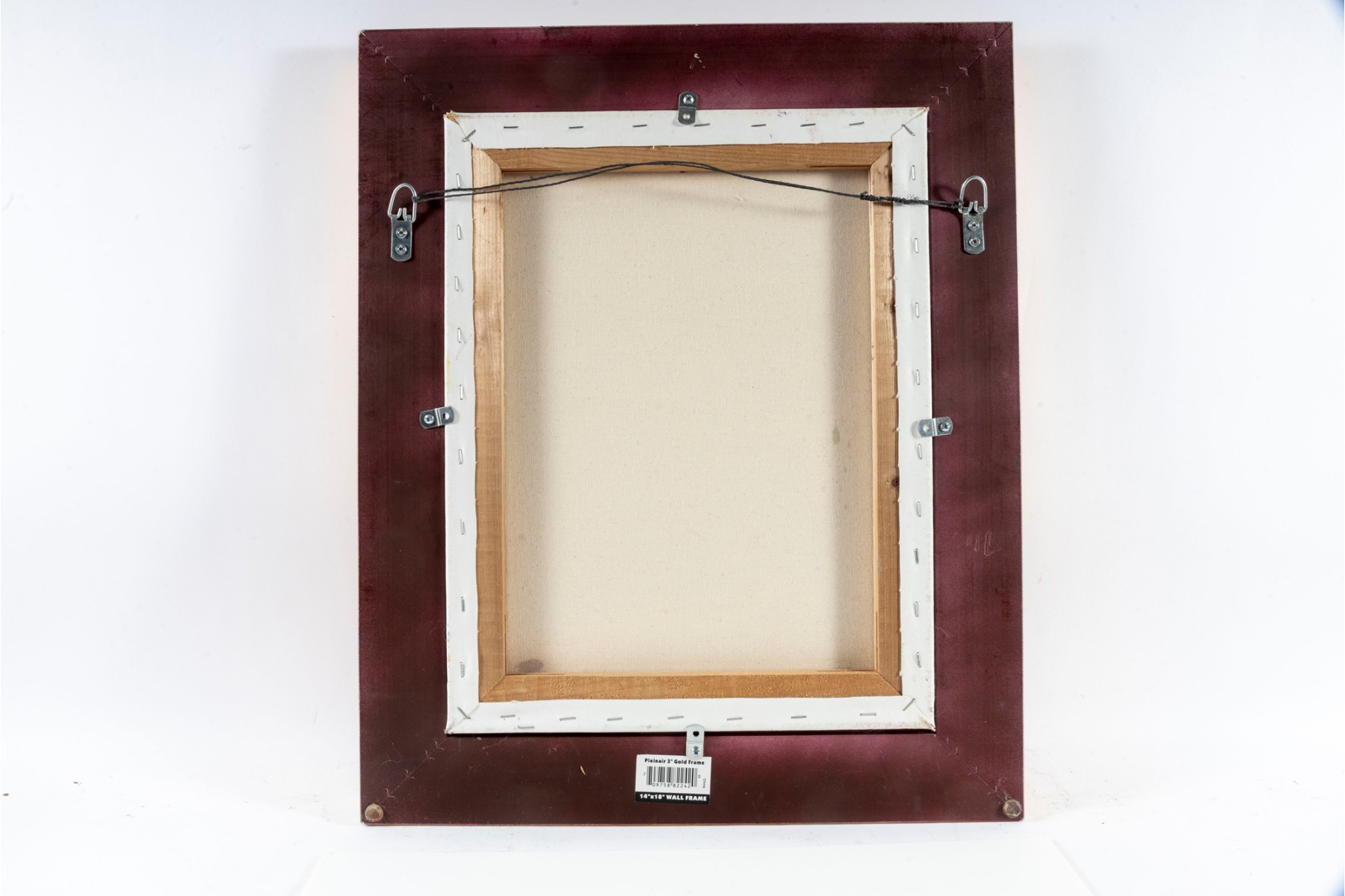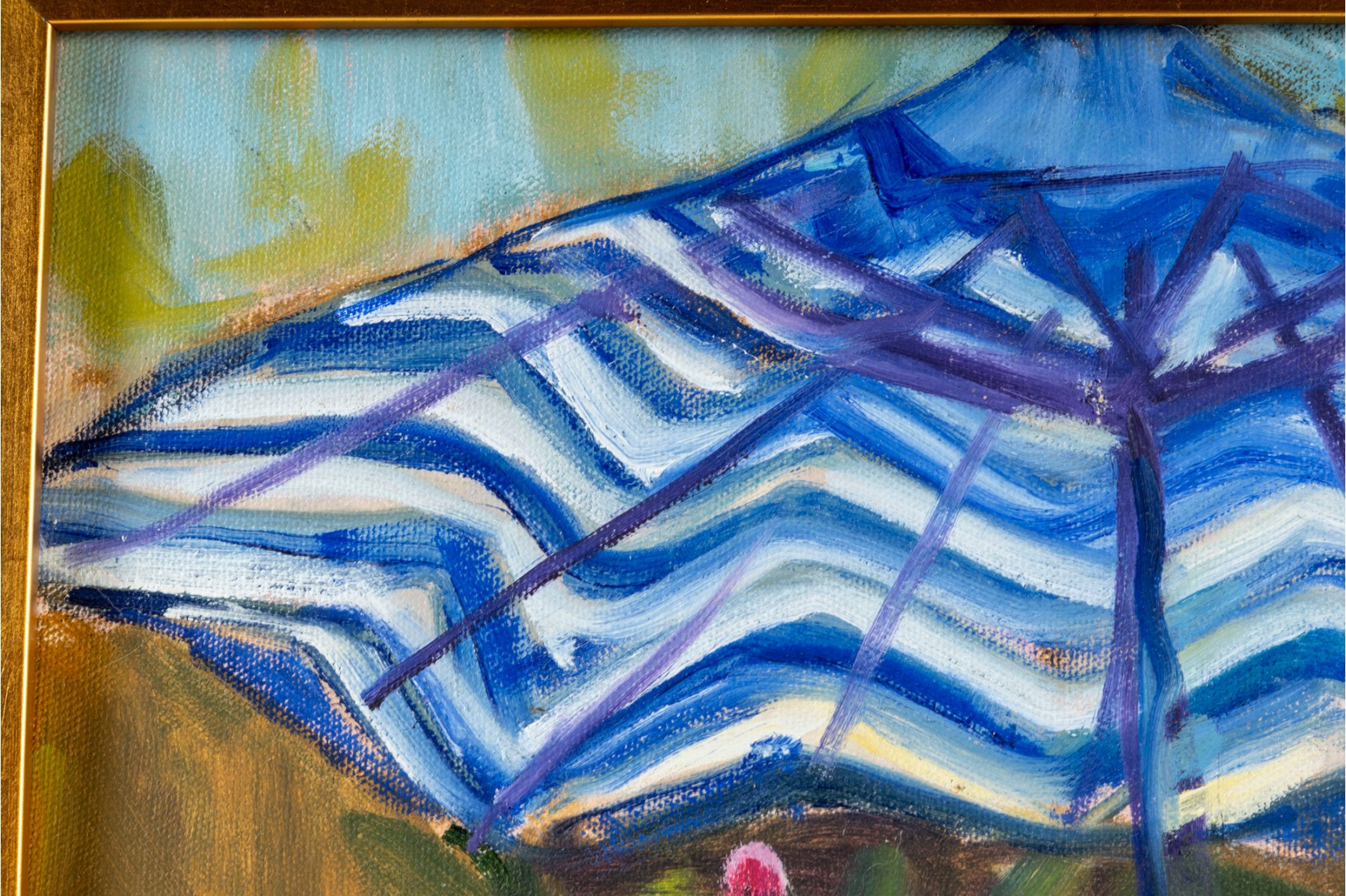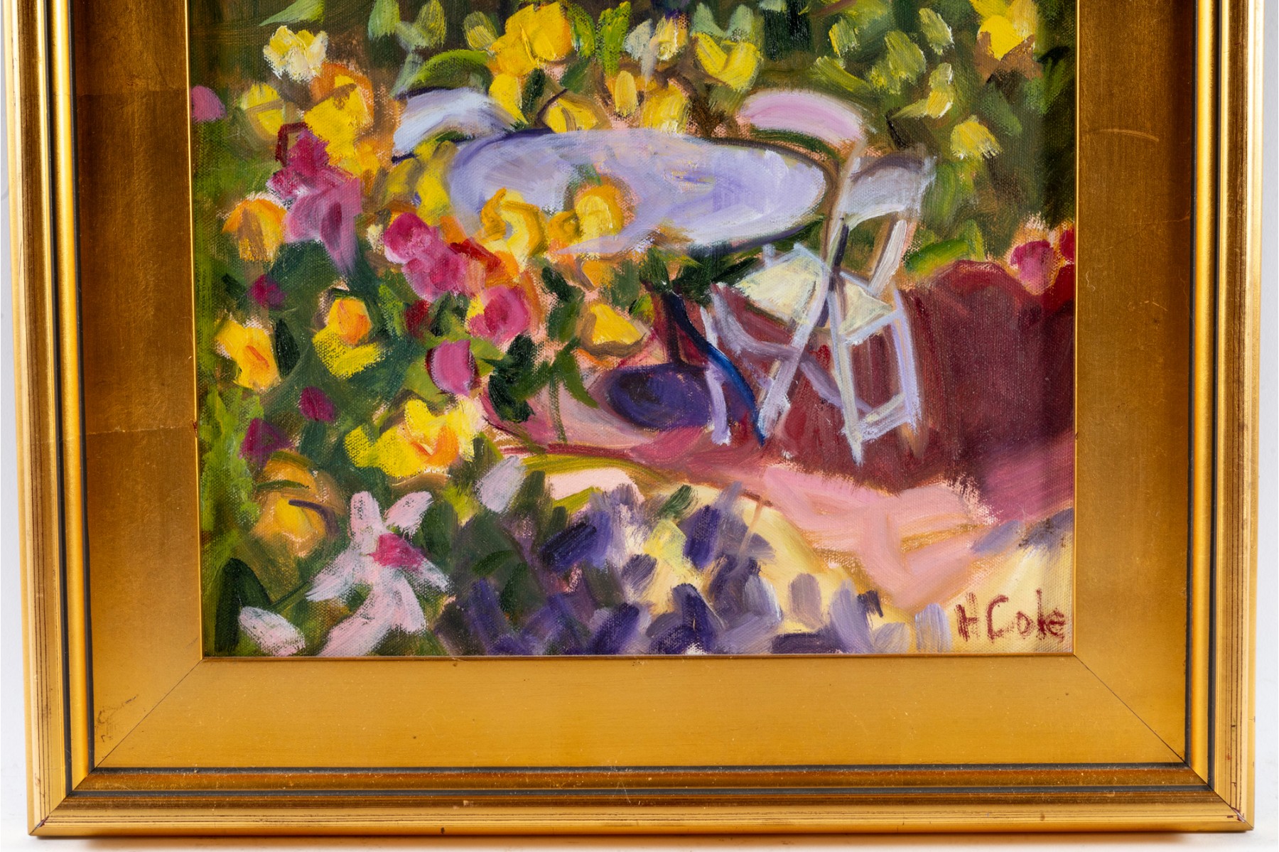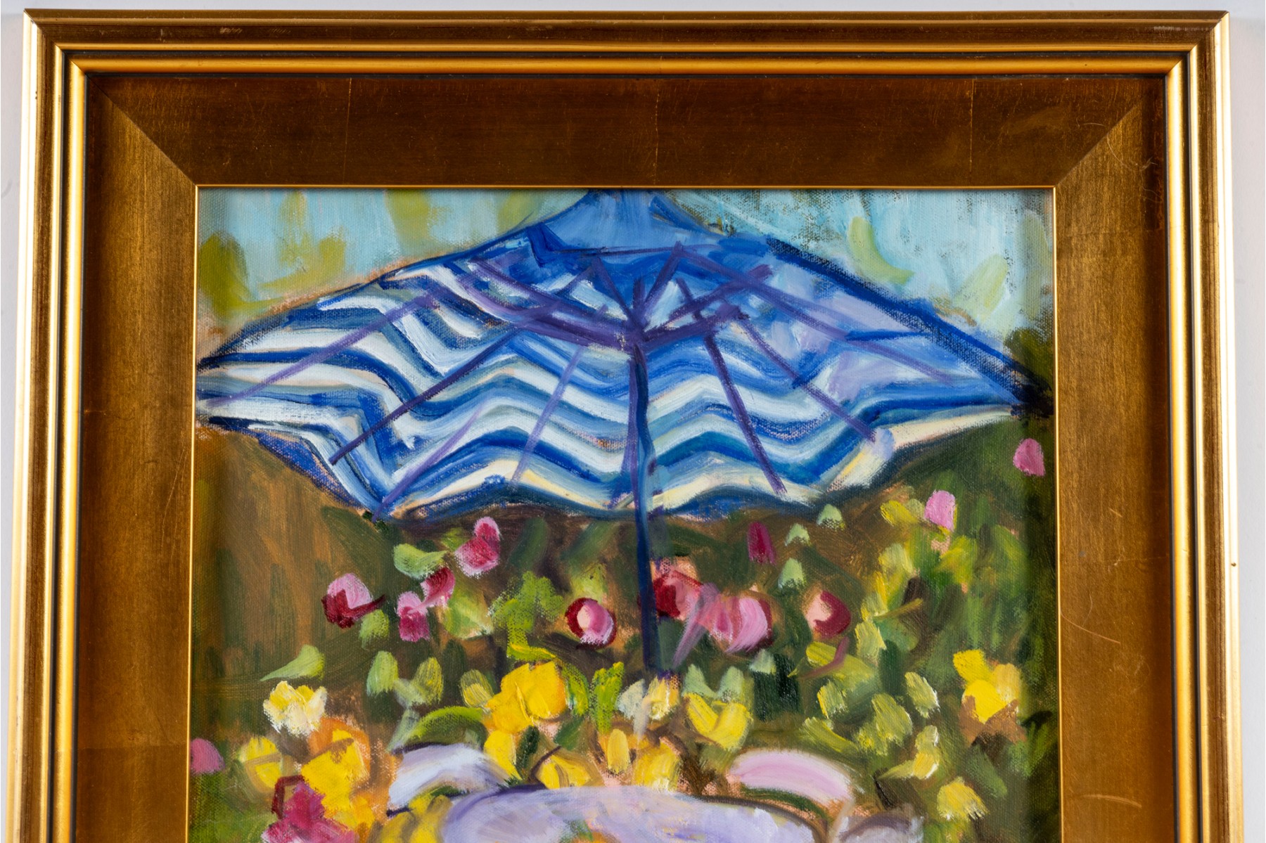 An oil on canvas painting produced and signed by local North Carolina artist Hannah Cole Buie. The painting depicts a bright and colorful scene of a lone patio set, and is presented openly within a a gold tone wood frame.