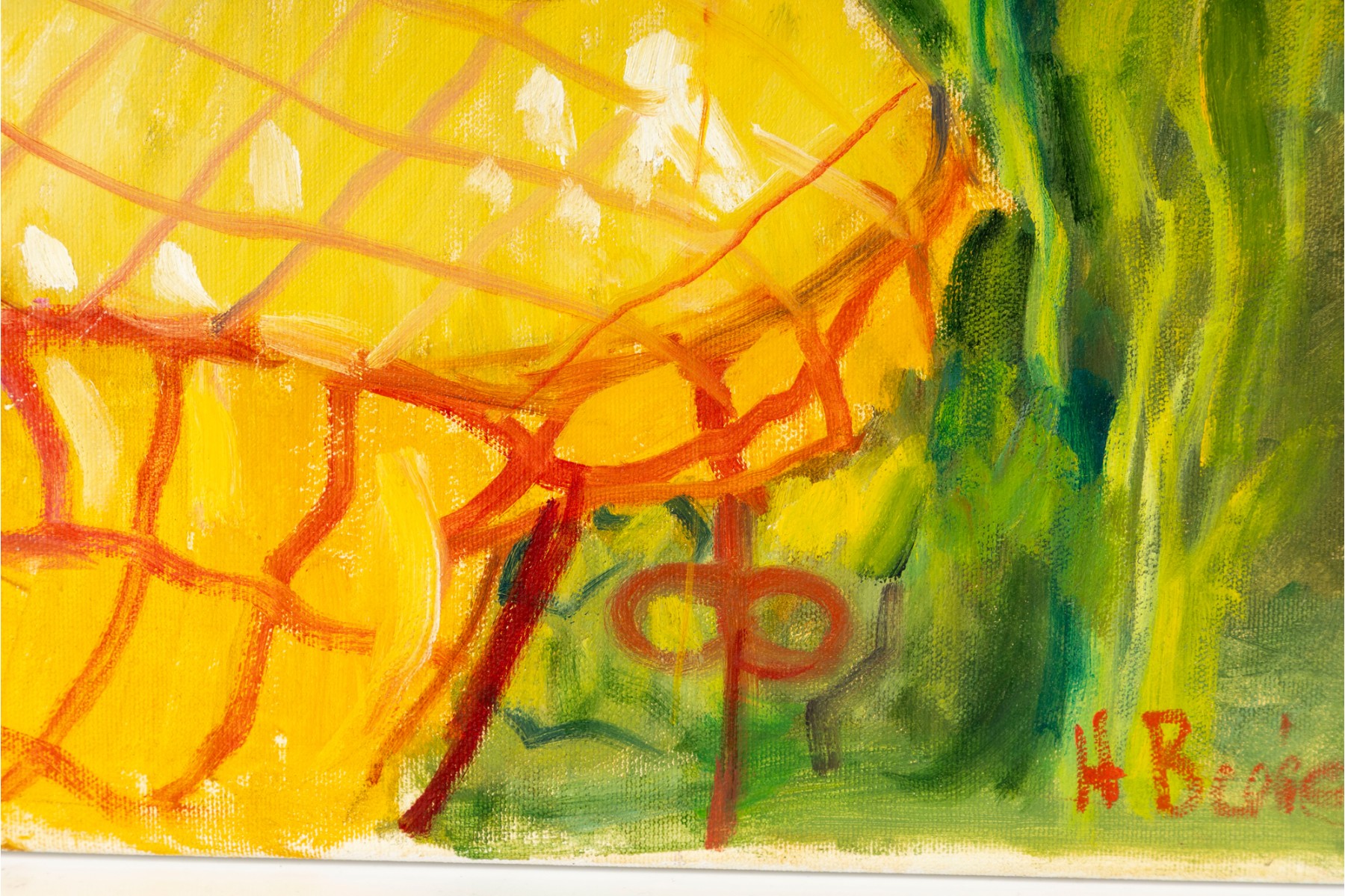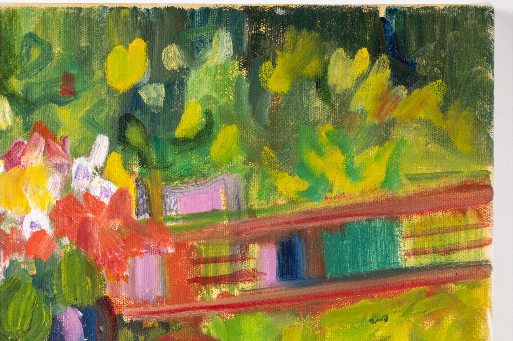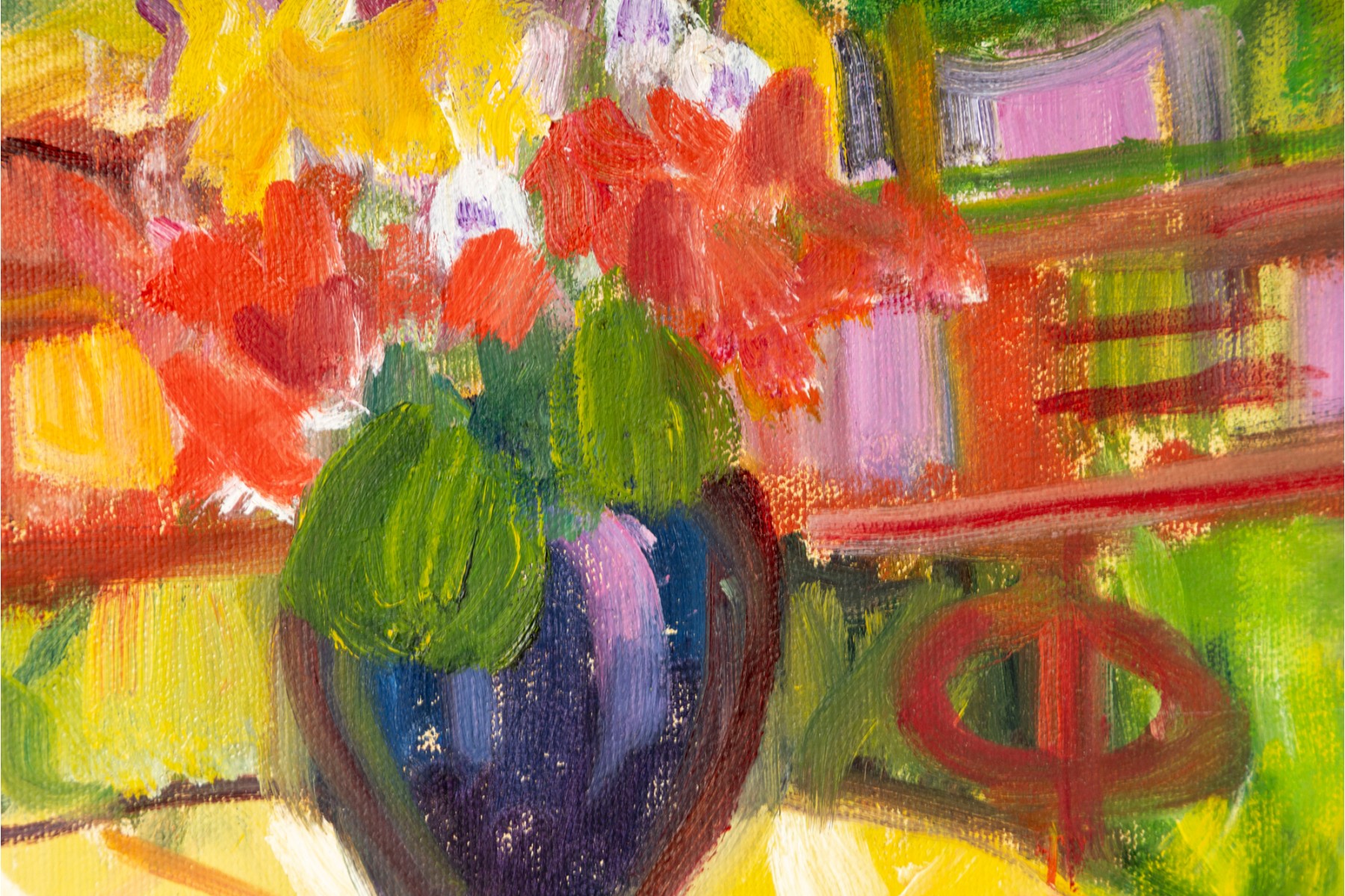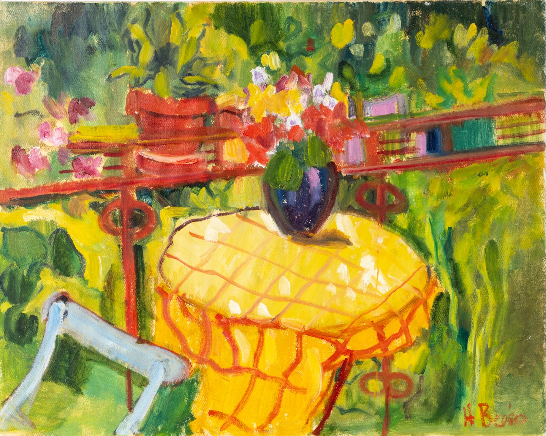 An oil on canvas painting produced and signed by local North Carolina artist Hannah Cole Buie. The painting depicts a bright and colorful scene of a lone patio set, and is presented openly without a frame.