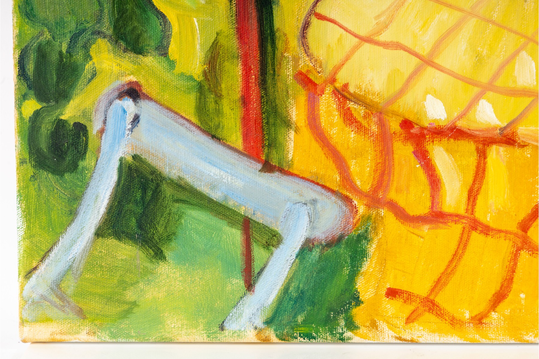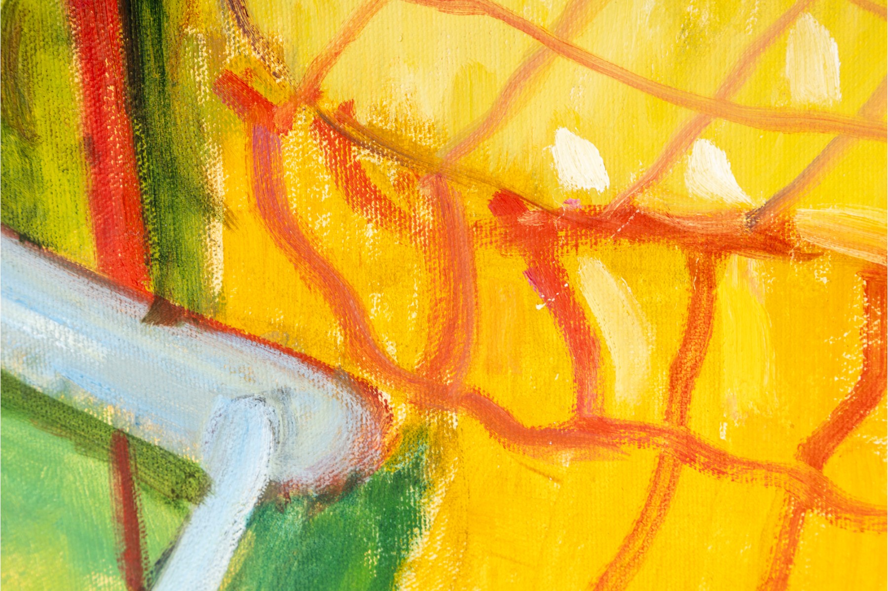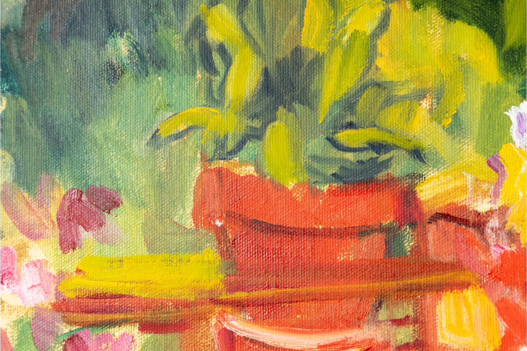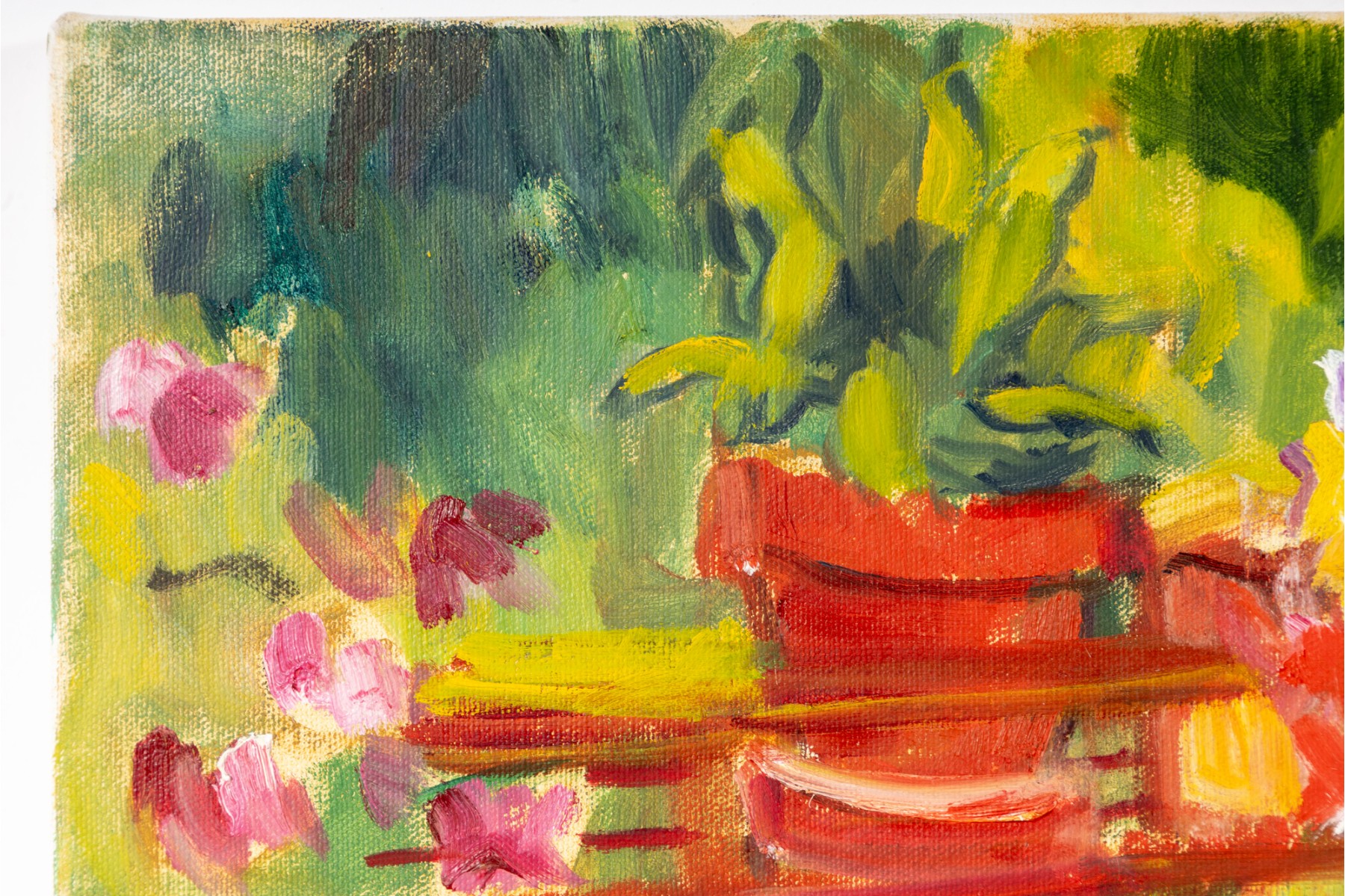 An oil on canvas painting produced and signed by local North Carolina artist Hannah Cole Buie. The painting depicts a bright and colorful scene of a lone patio set, and is presented openly without a frame.