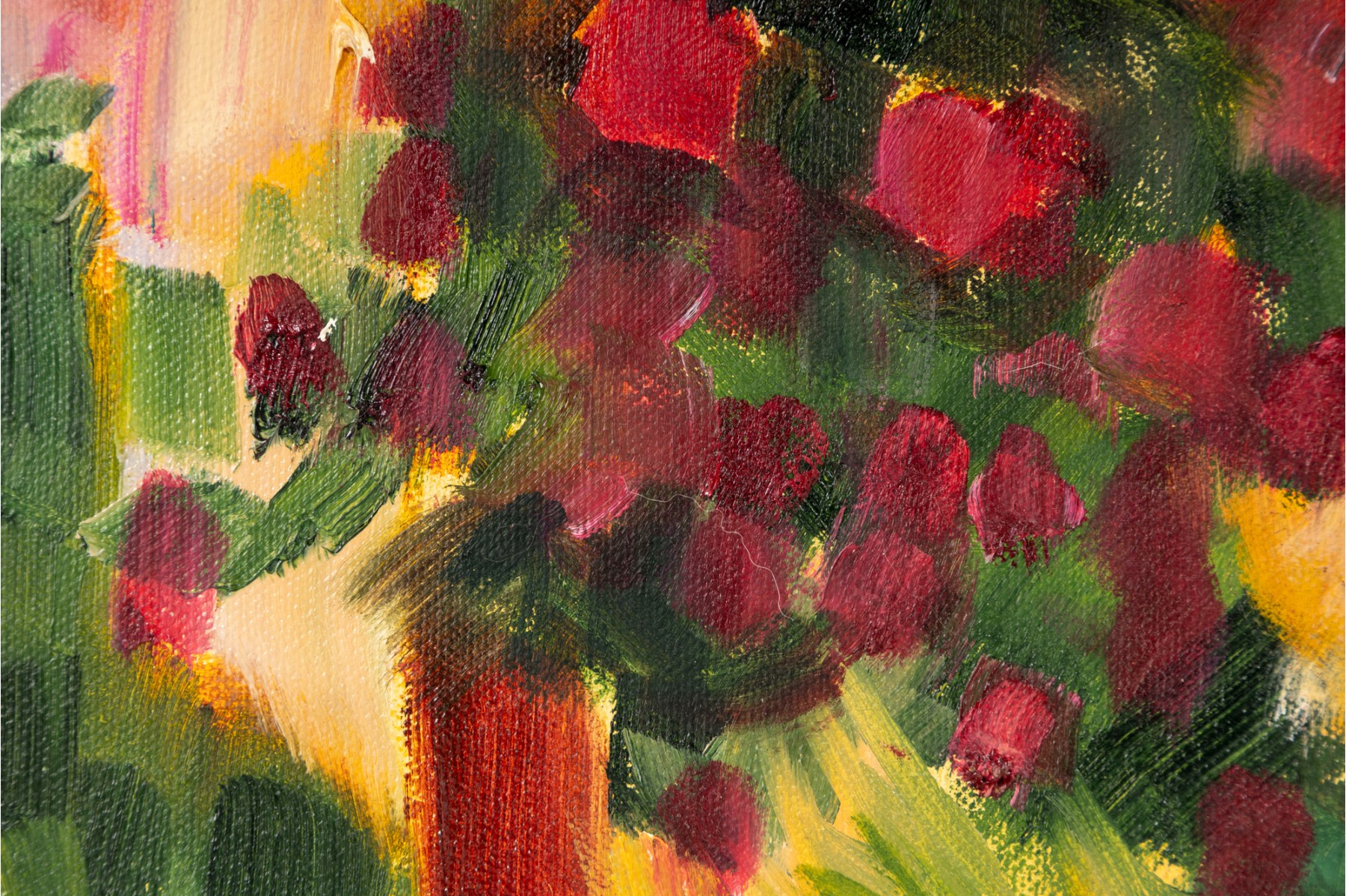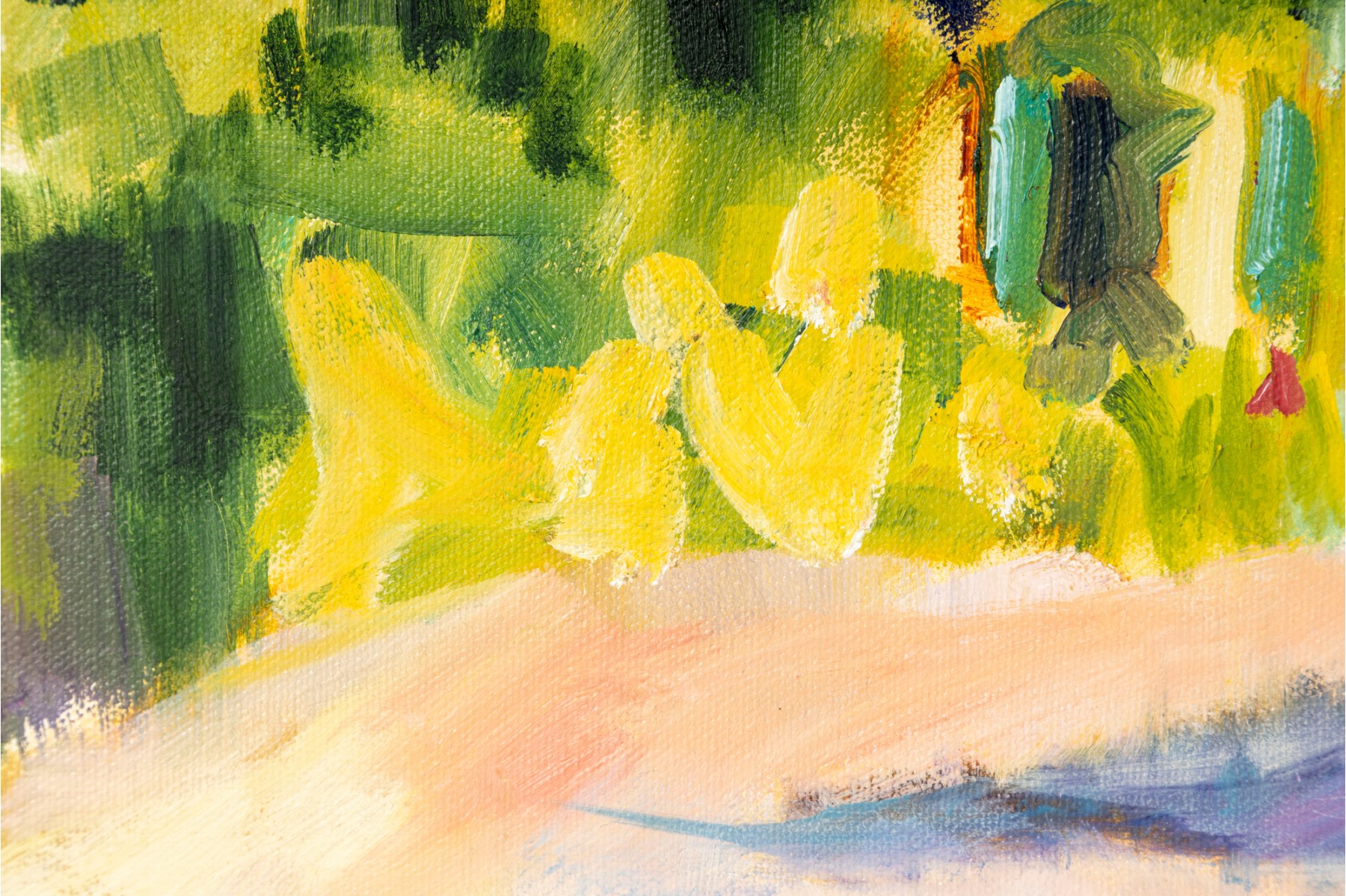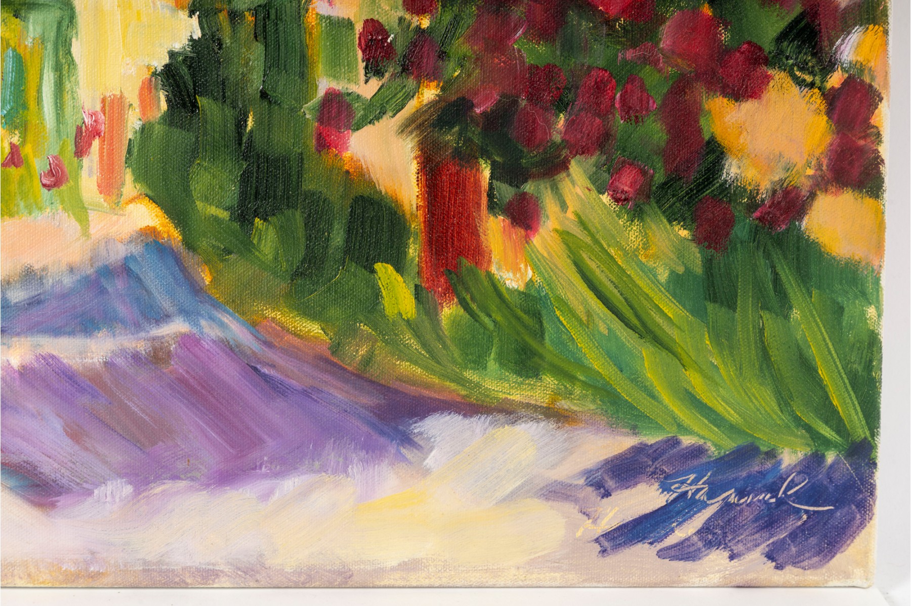 A lovely oil on canvas landscape painting produced in the 'Painterly' style with heavy brushstrokes, creating depth through subtle texture in foliage and greenery to create the welcoming depiction of a sunny villa. Untitled, this piece was created and signed by local North Carolina artist Hannah Cole Buie, and is presented openly without a frame.