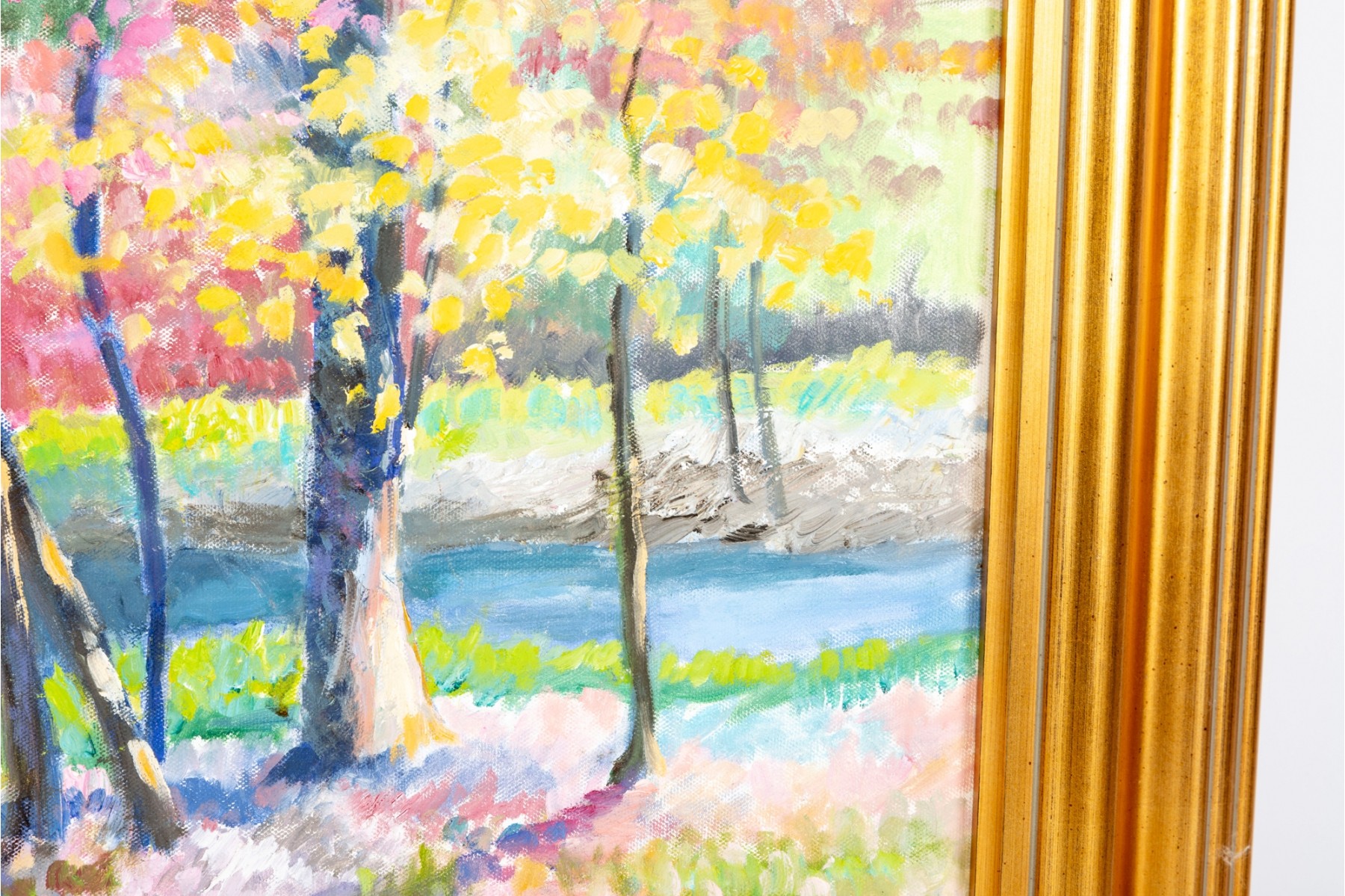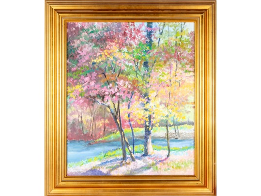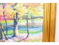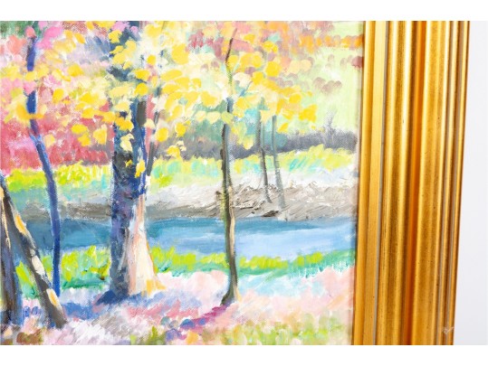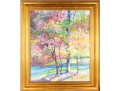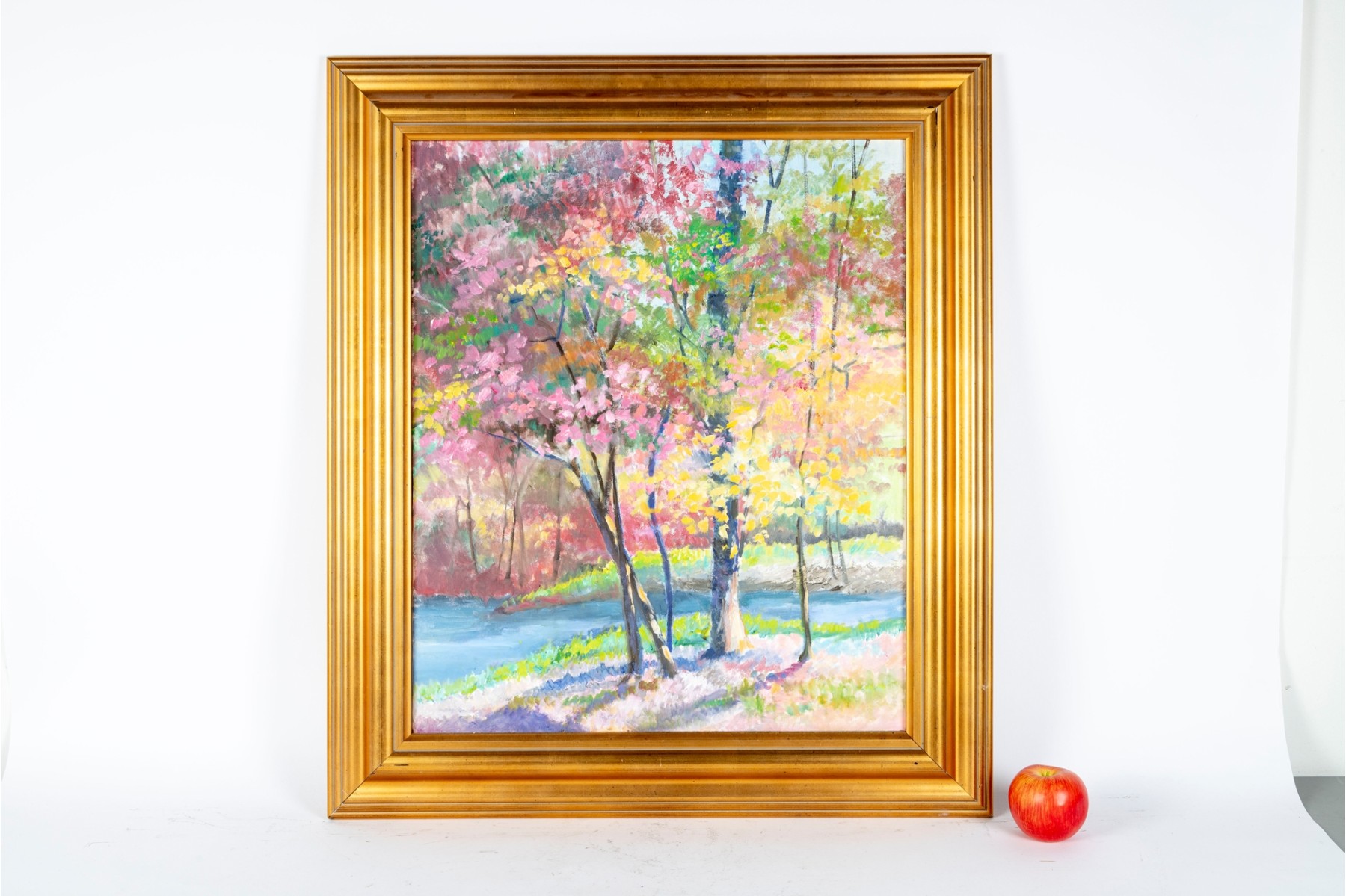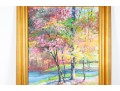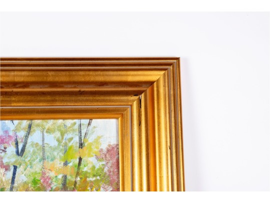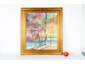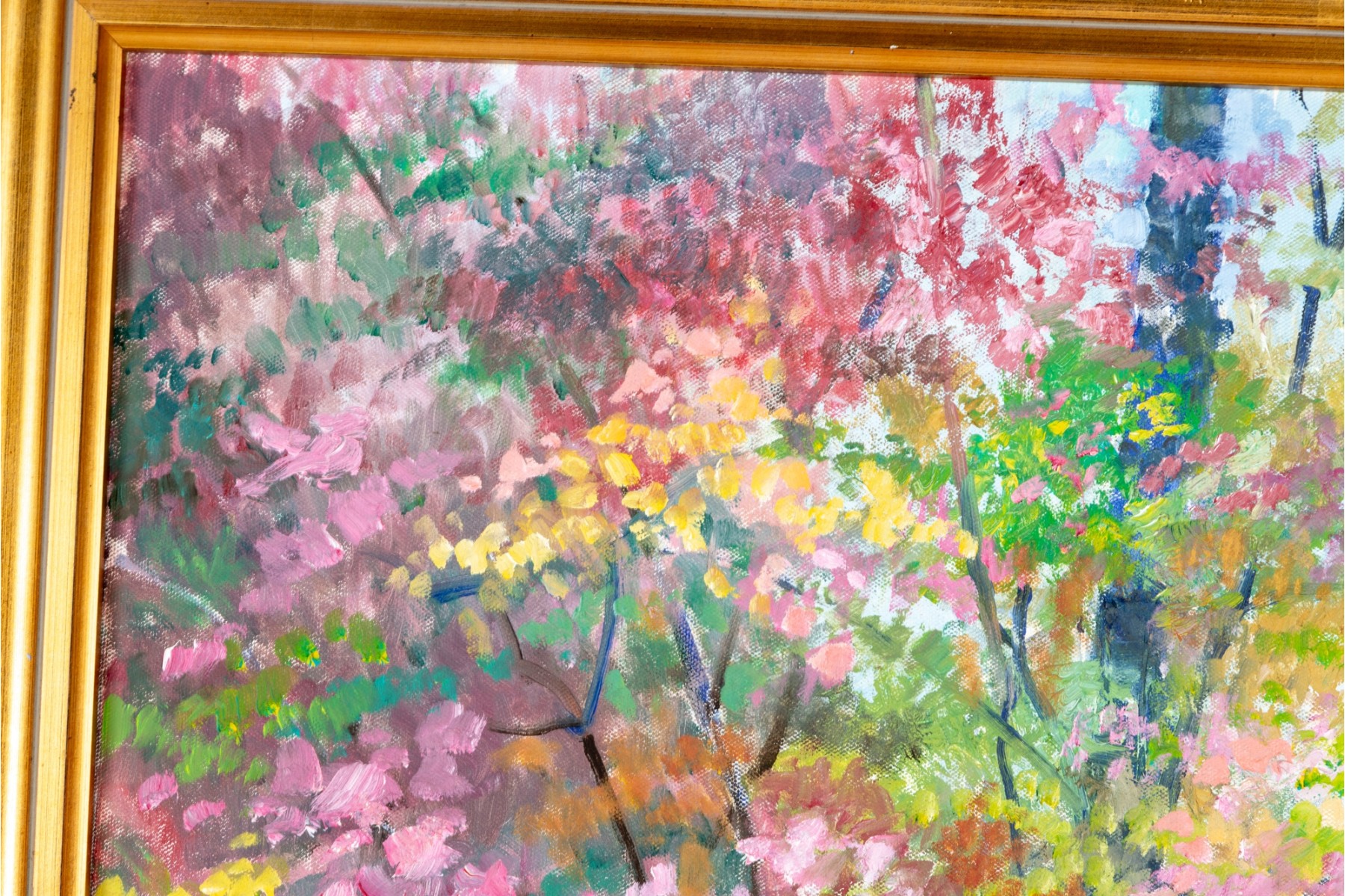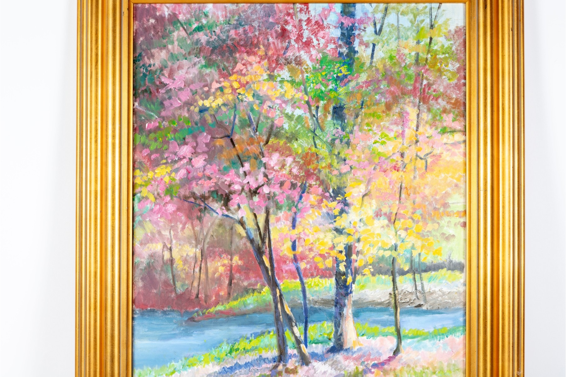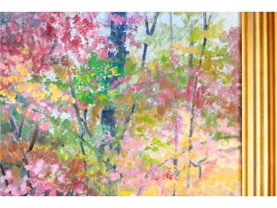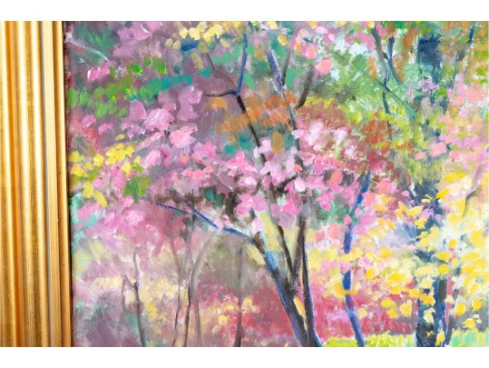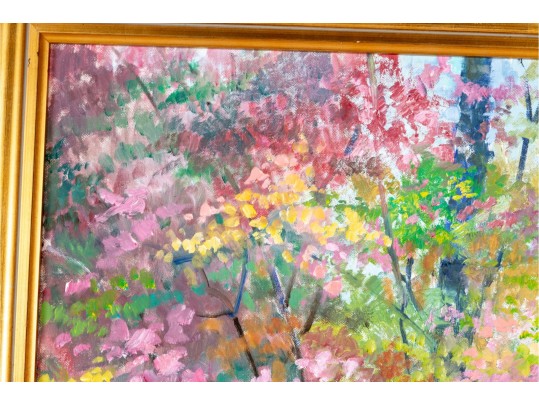 A vibrant, painterly style oil on canvas scene displaying a beautiful nature scene composed of multicolor trees, foliage and florals. The artwork was created and signed by local North Carolina artist Hannah Cole Buie (B. 1955), and is presented openly within an ornate distressed gold-tone wood frame.