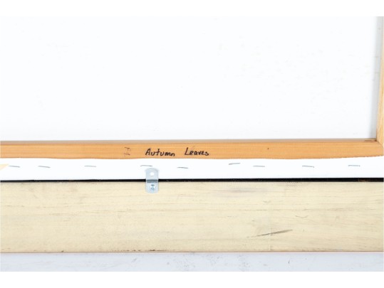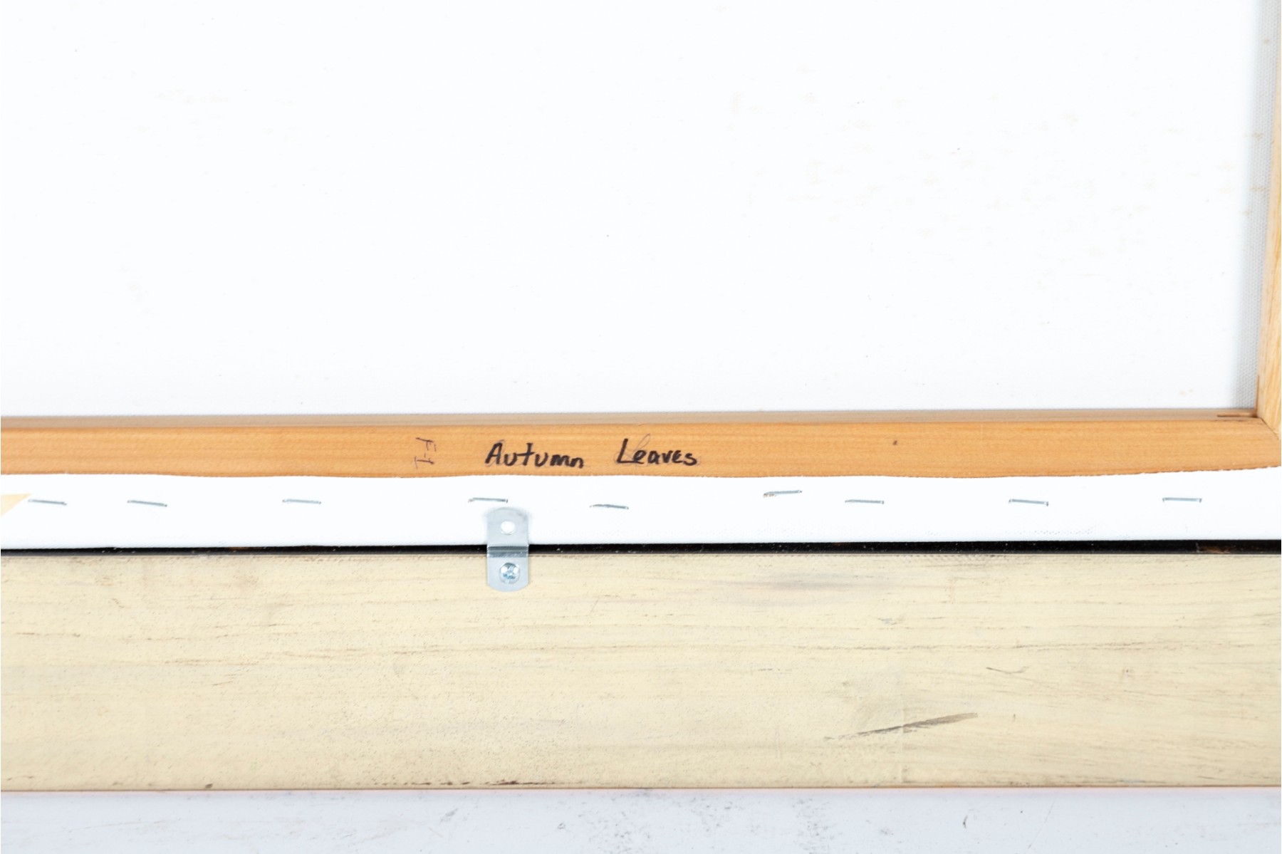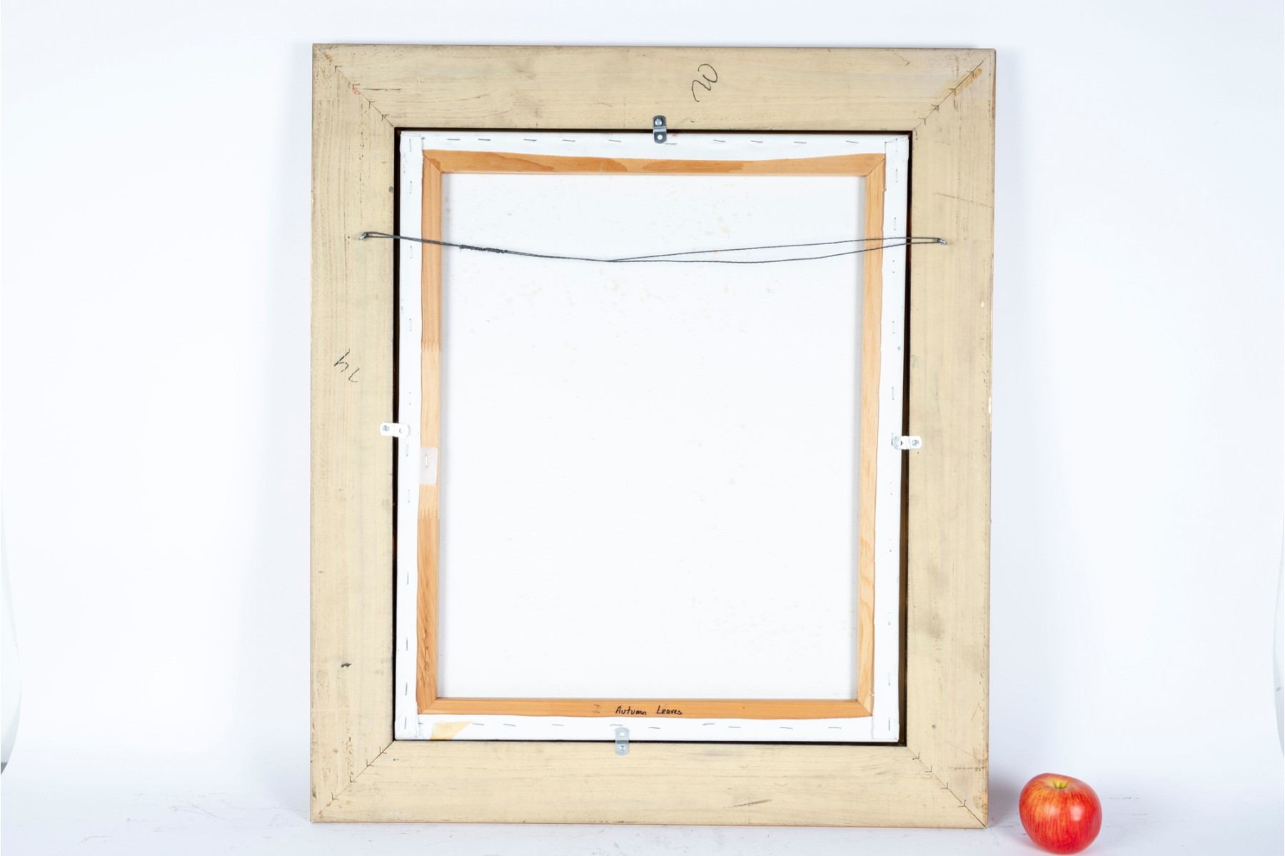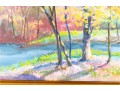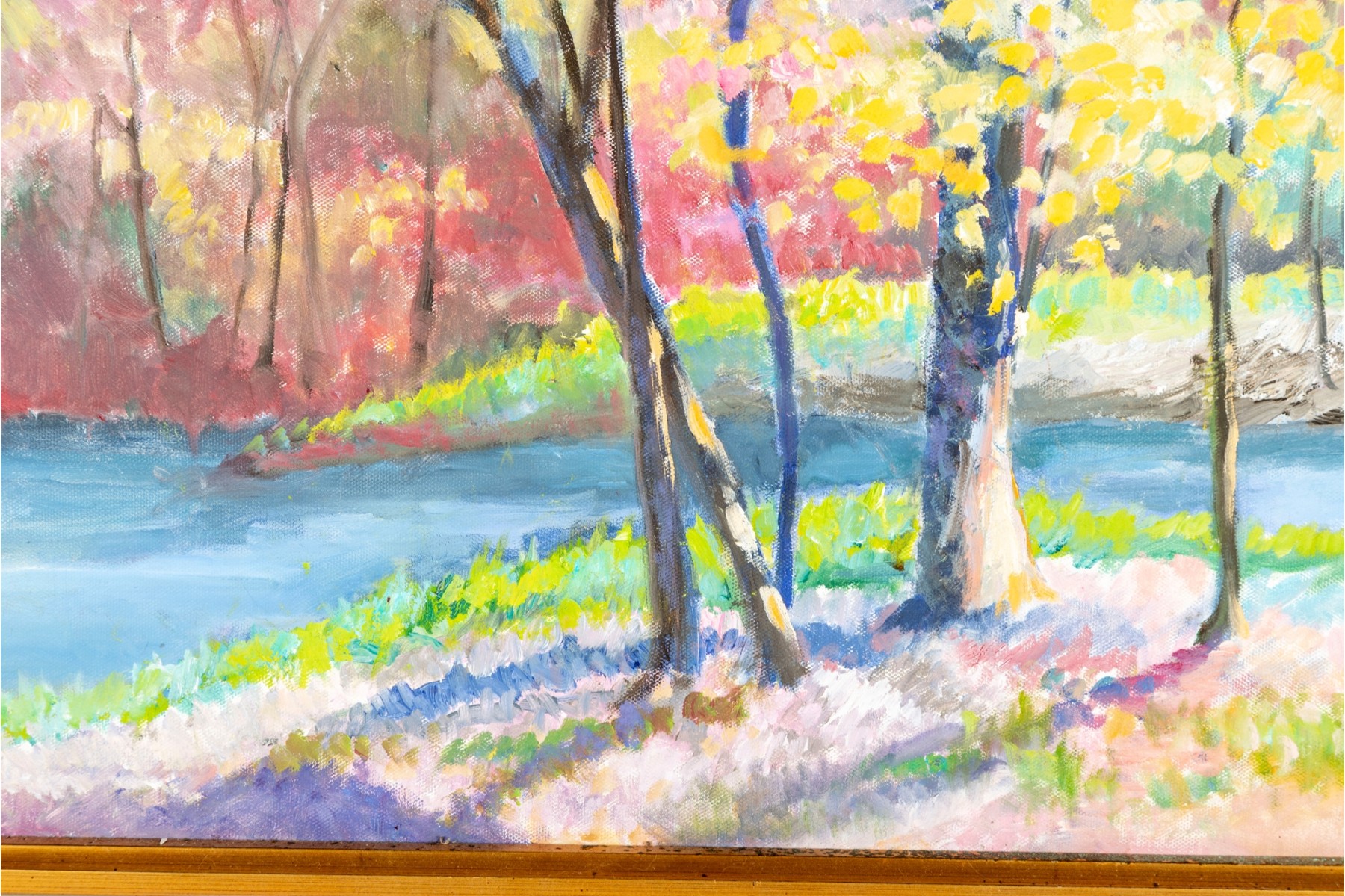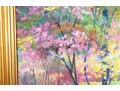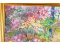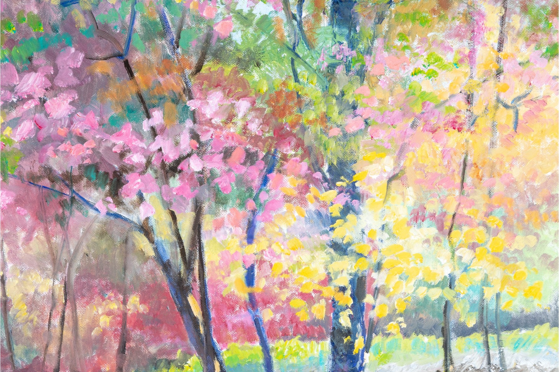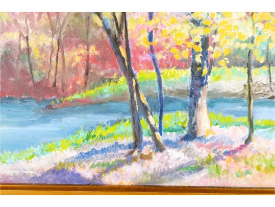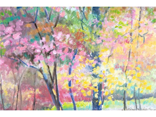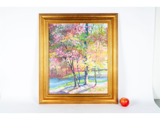 A vibrant, painterly style oil on canvas scene displaying a beautiful nature scene composed of multicolor trees, foliage and florals. The artwork was created and signed by local North Carolina artist Hannah Cole Buie (B. 1955), and is presented openly within an ornate distressed gold-tone wood frame.