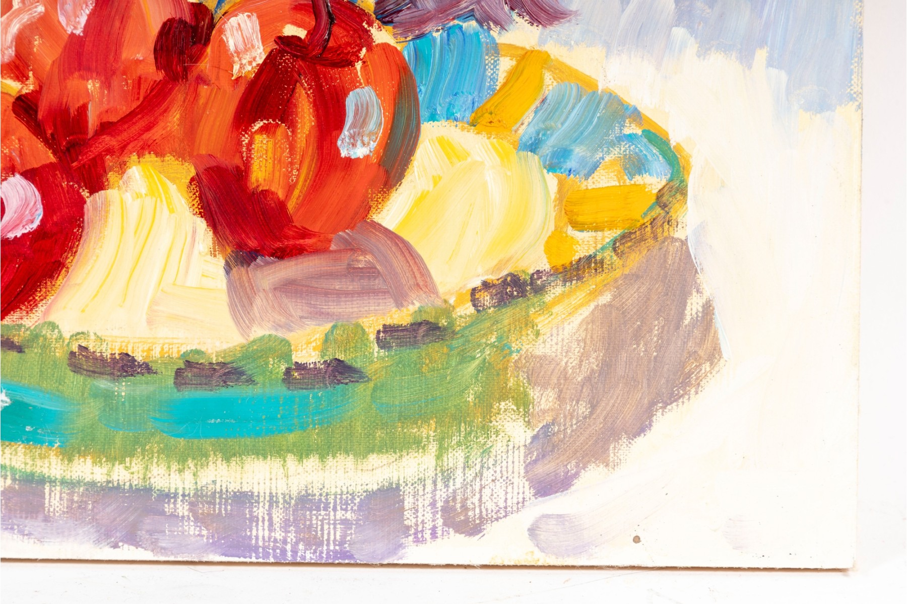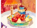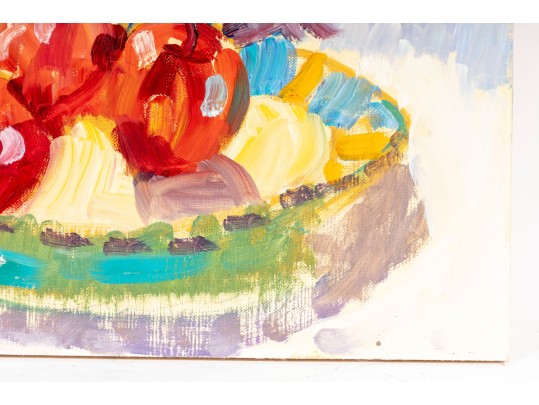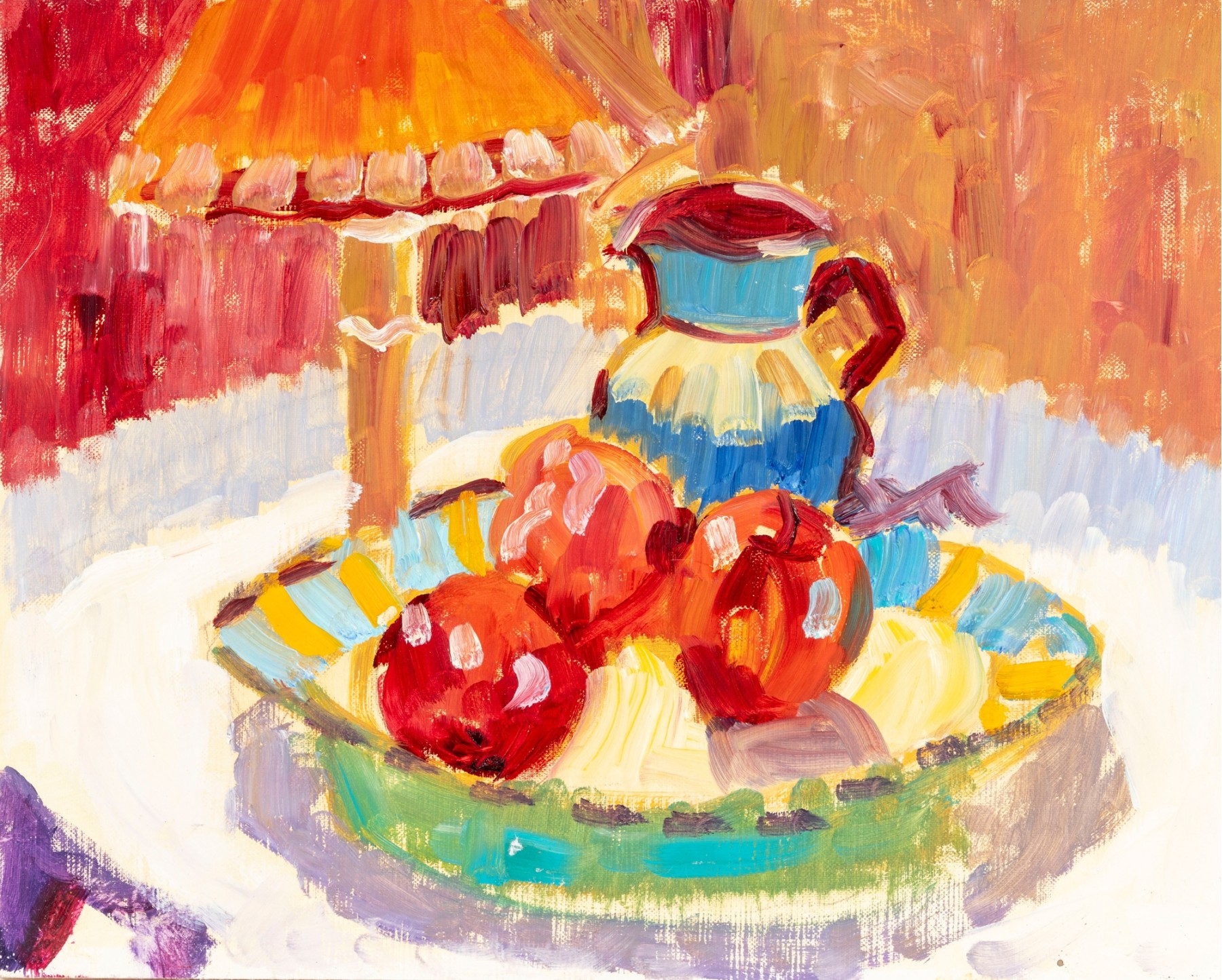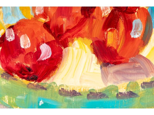 An oil on board painting displaying a simple still-life scene of apples in the painterly style. The artwork was created and signed by local North Carolina artist Hannah Cole Buie (B. 1955), and is presented openly without a frame.