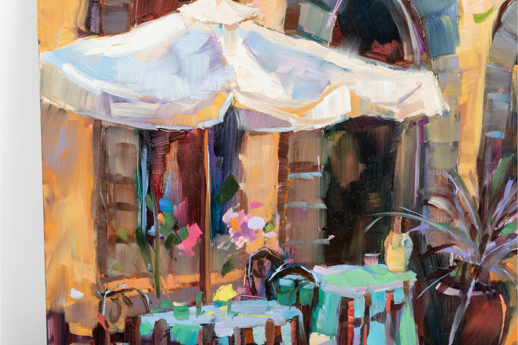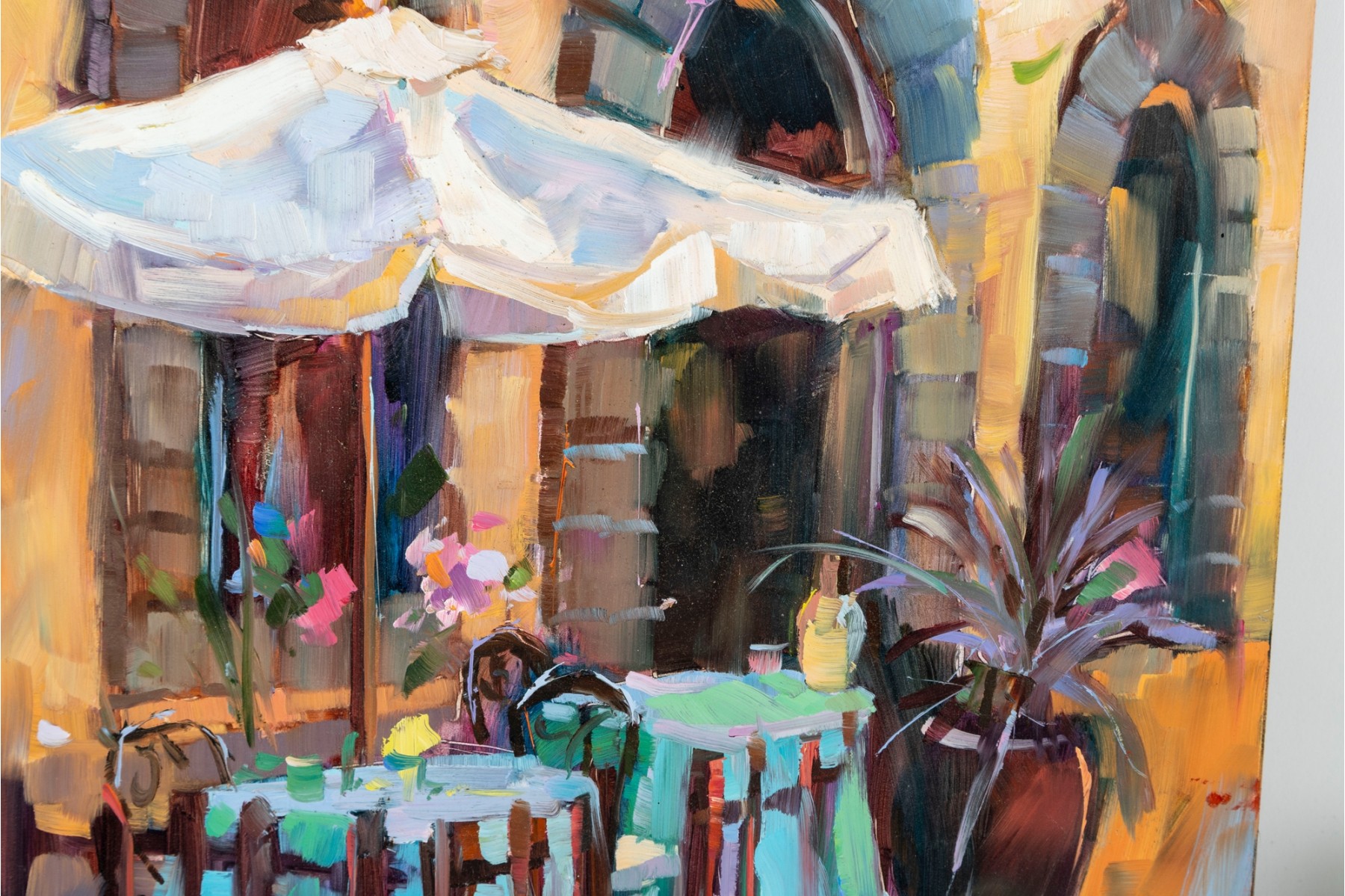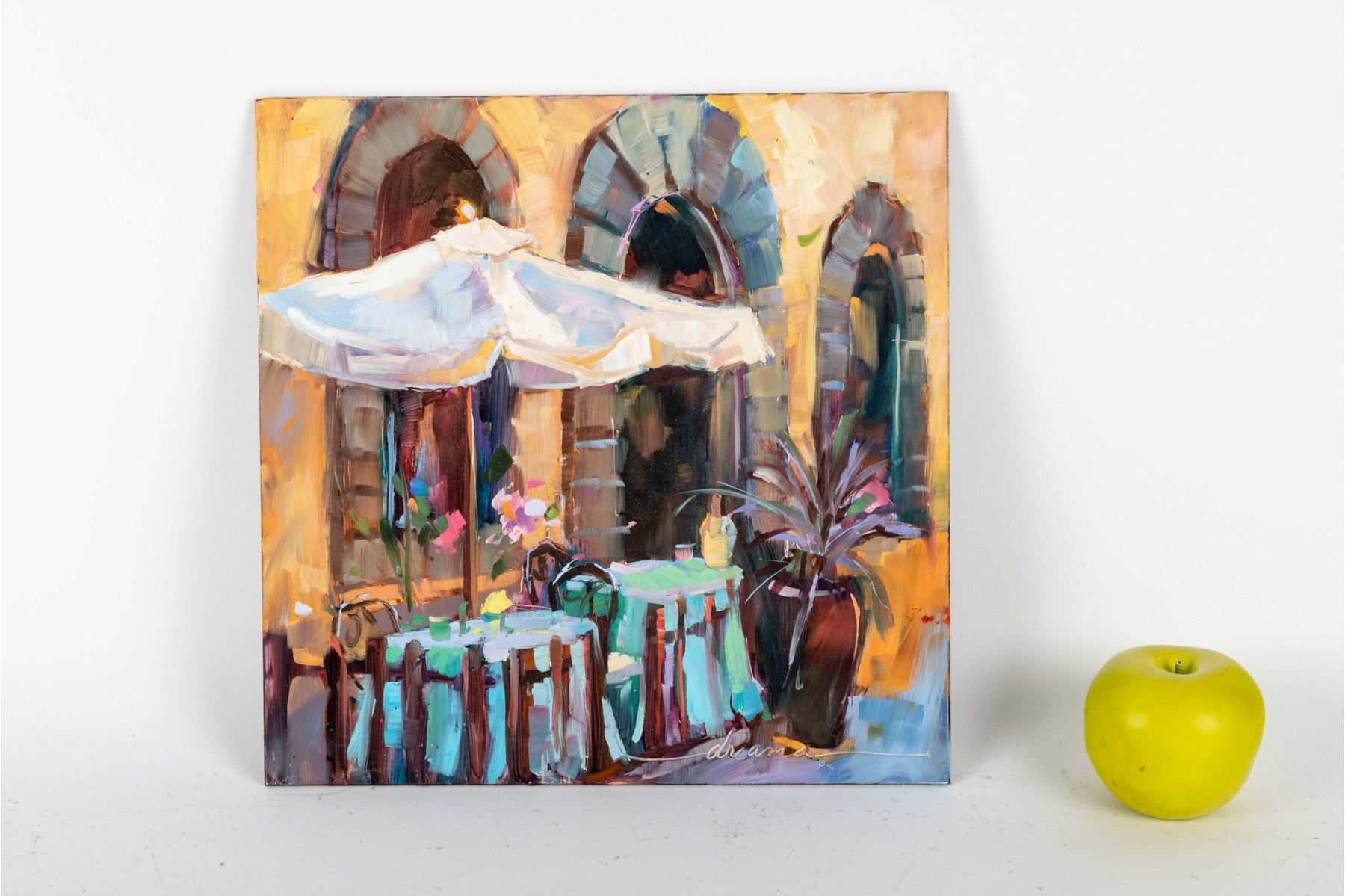 A beautiful oil on board artwork displaying an empty outdoor cafe venue. The artwork was created and signed by local North Carolina artist Hannah Cole Buie (B. 1955), and is presented without a frame.