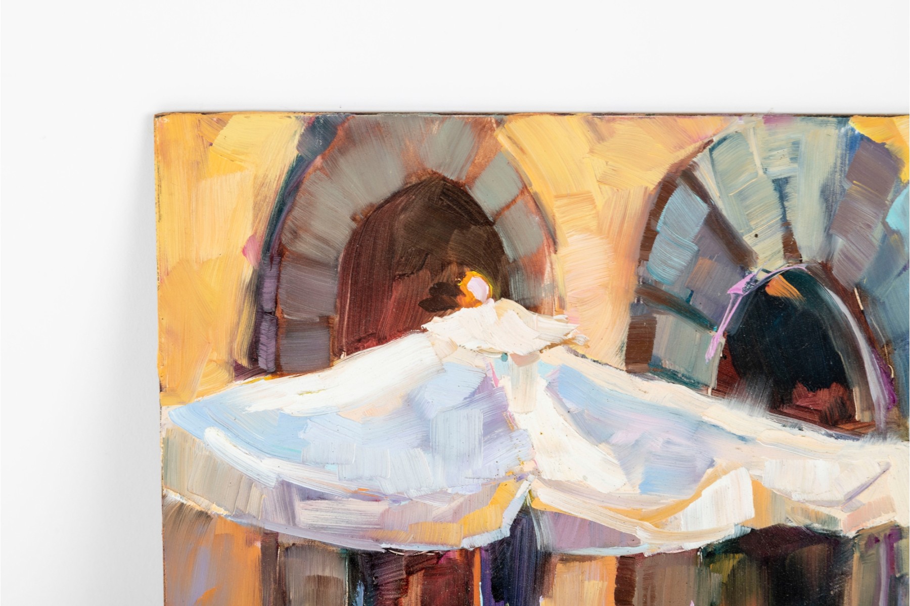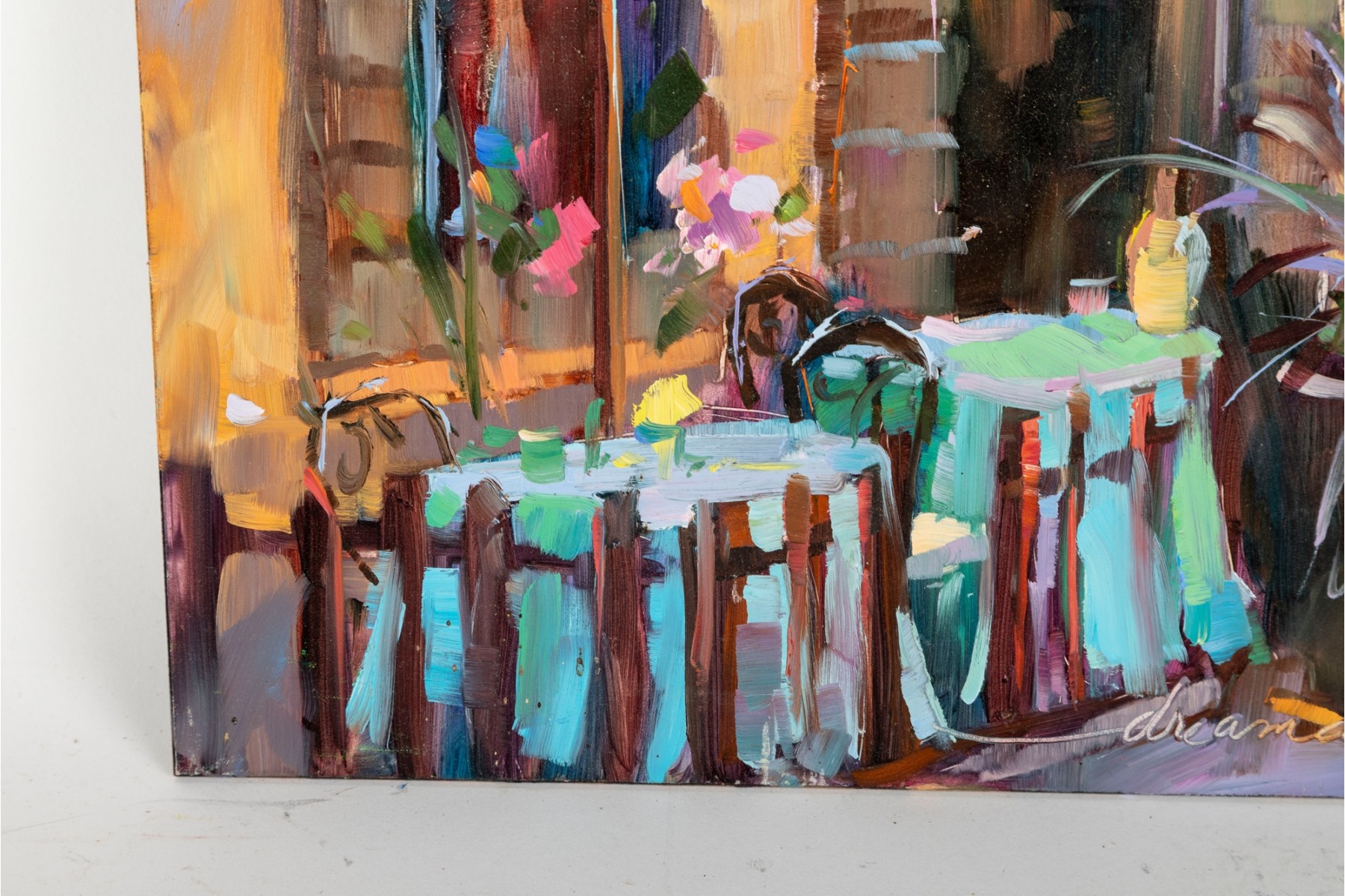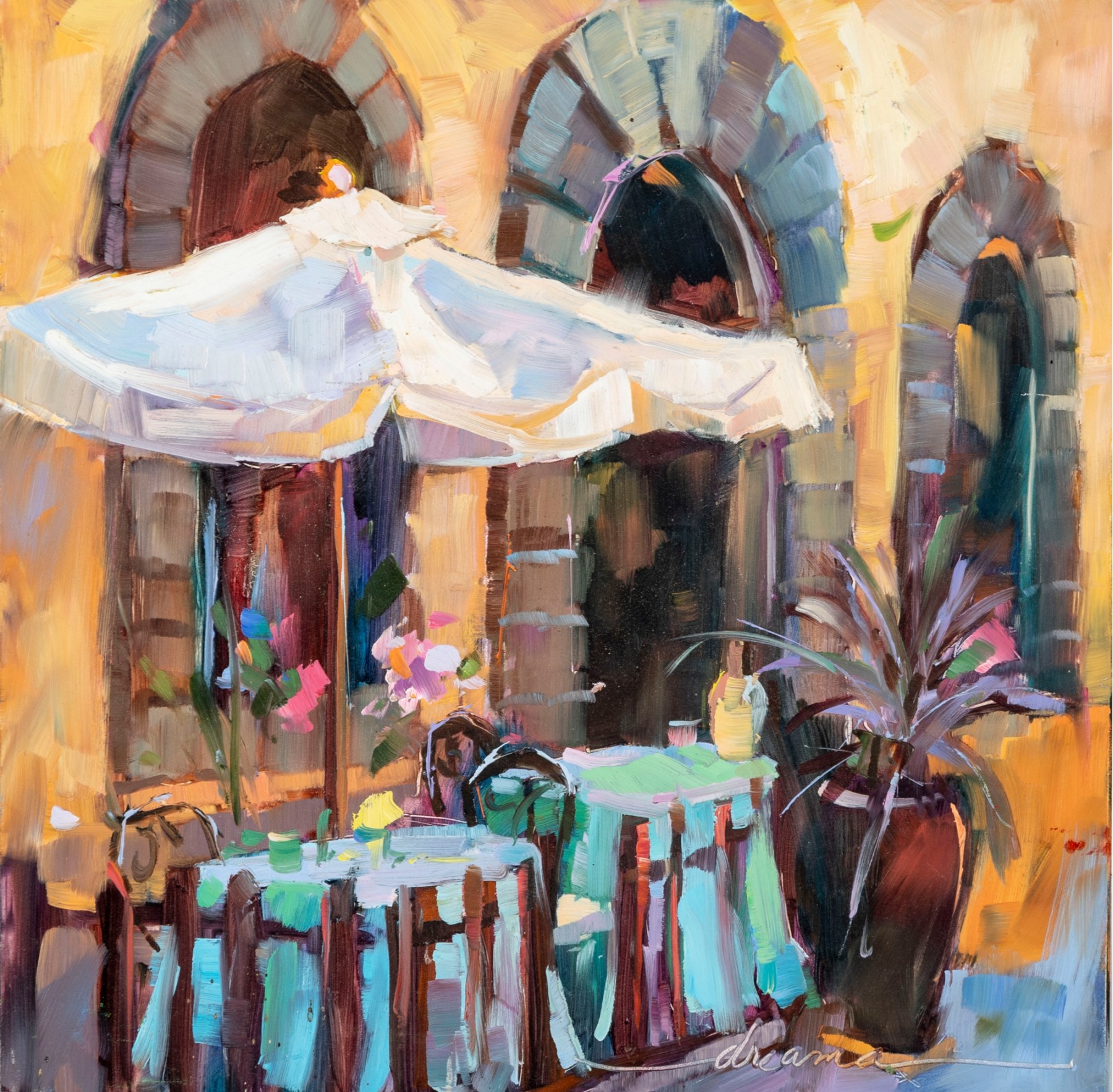 A beautiful oil on board artwork displaying an empty outdoor cafe venue. The artwork was created and signed by local North Carolina artist Hannah Cole Buie (B. 1955), and is presented without a frame.