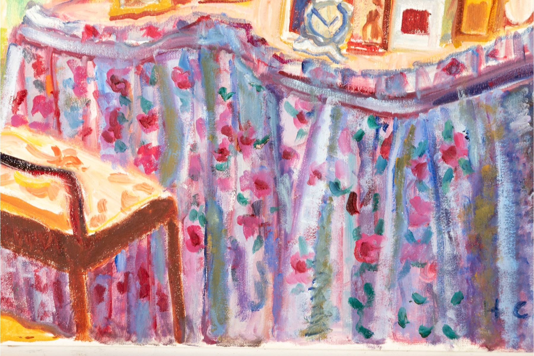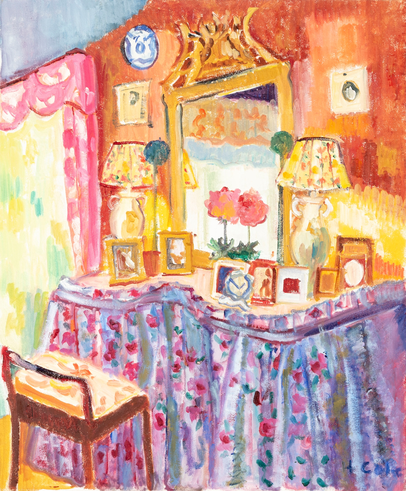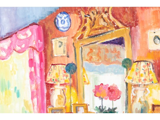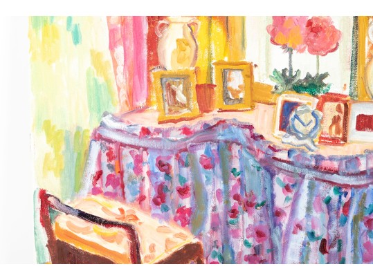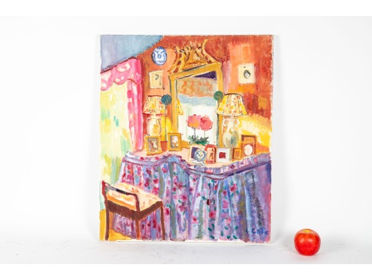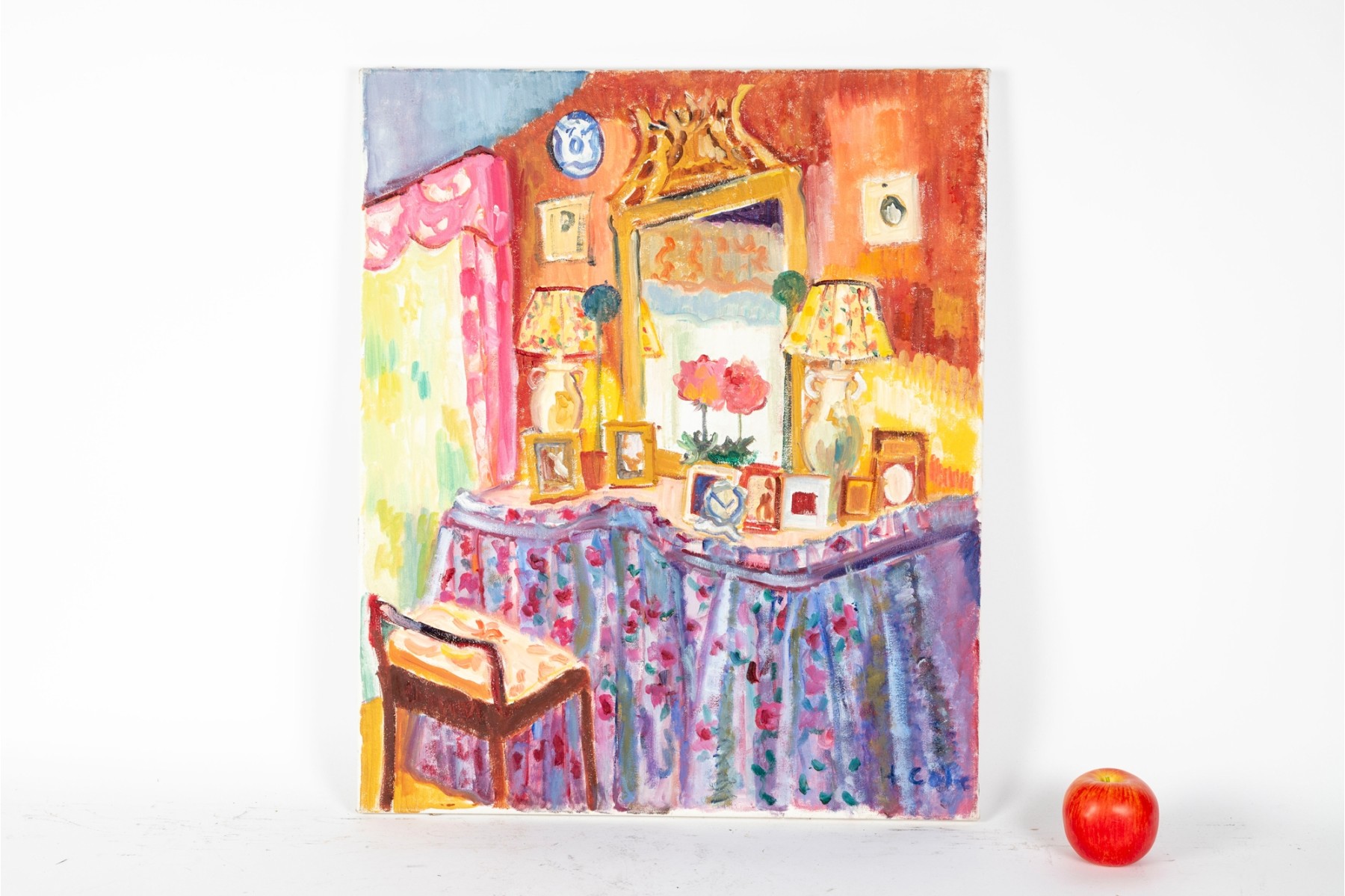 Hannah Cole Buie (American [NC], B. 1955) impressionist oil painting on canvas depicting a charming interior with a brown chair set next to an oxbow curved vanity draped in purple floral fabric. The vanity is detailed with two vase form lamps and a collection of picture frames surrounded a large gilt mirror with a decorative pediment against a red wall leading to a window with pink curtains. Signed lower right. The canvas is mounted to a stretcher, unframed.