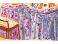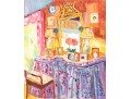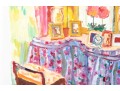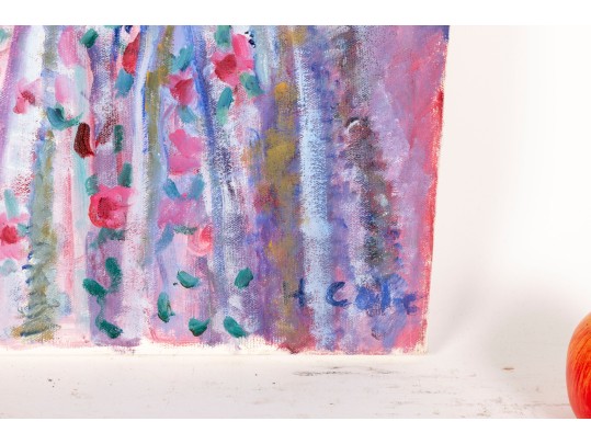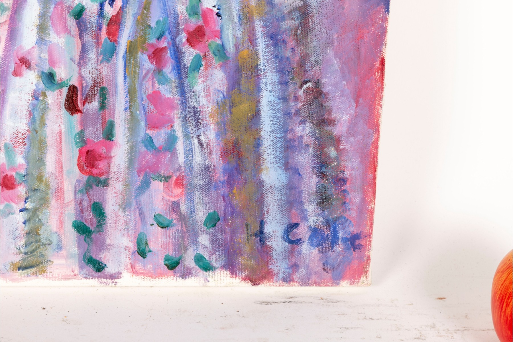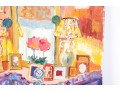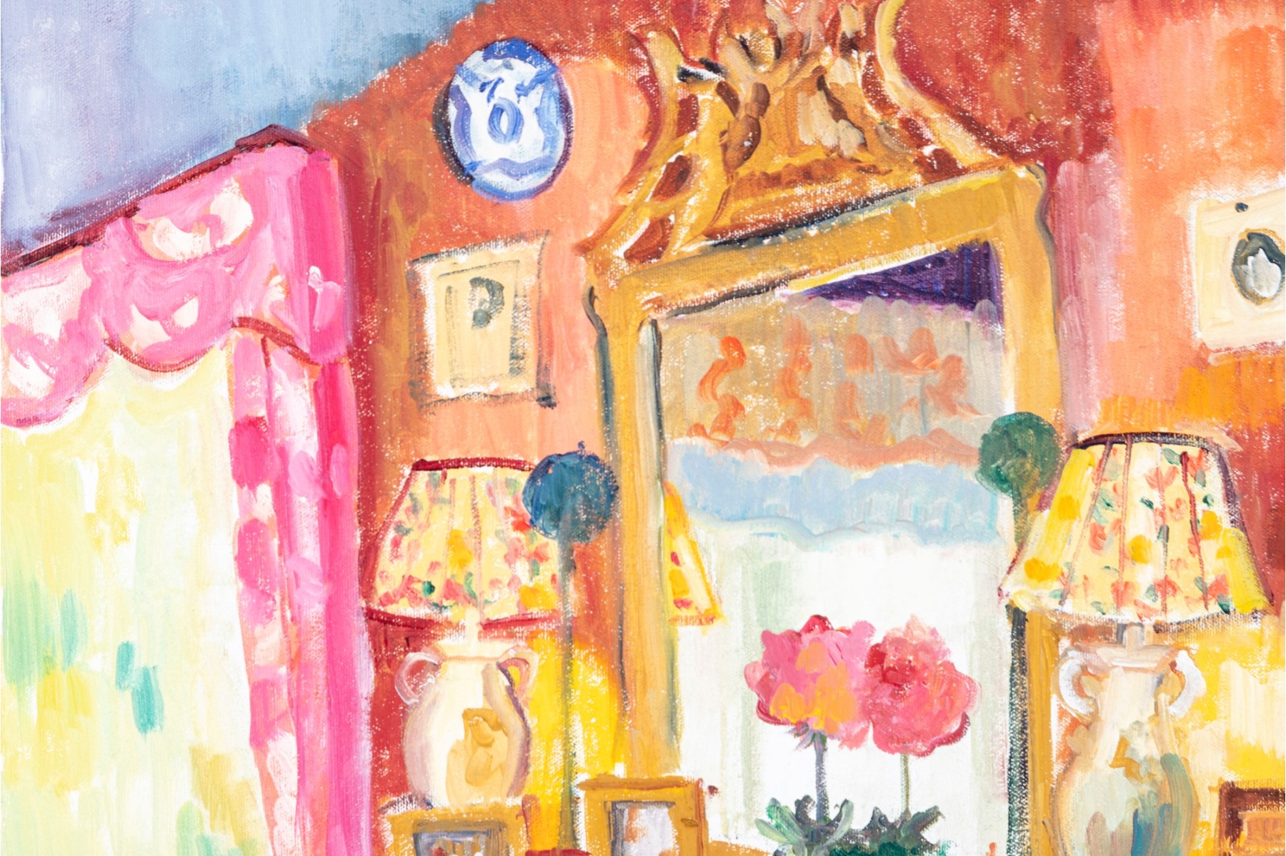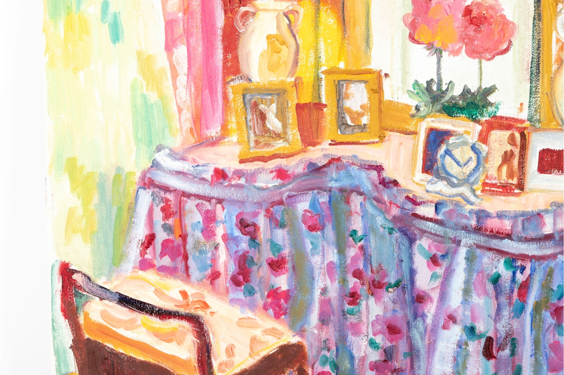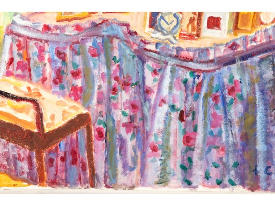Hannah Cole Buie (American [NC], B. 1955) impressionist oil painting on canvas depicting a charming interior with a brown chair set next to an oxbow curved vanity draped in purple floral fabric. The vanity is detailed with two vase form lamps and a collection of picture frames surrounded a large gilt mirror with a decorative pediment against a red wall leading to a window with pink curtains. Signed lower right. The canvas is mounted to a stretcher, unframed.