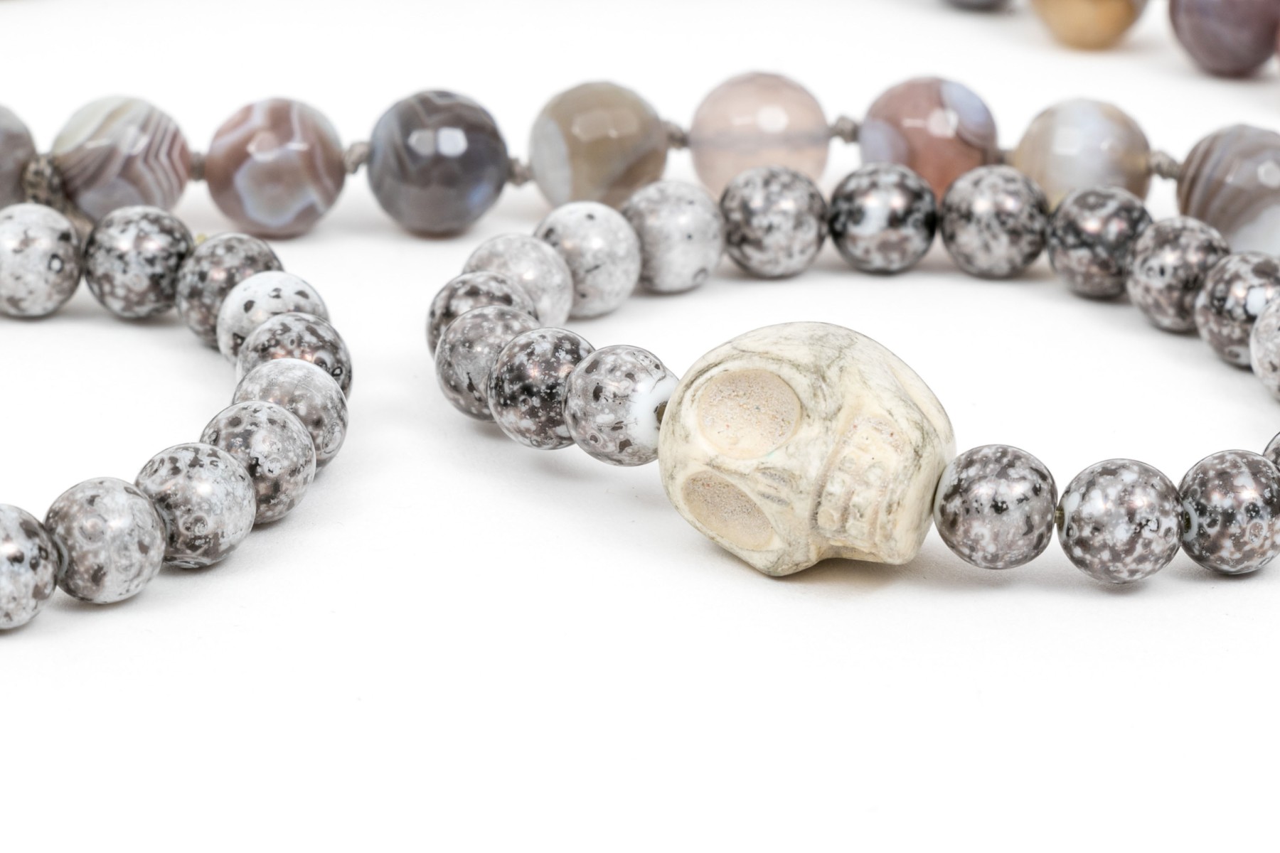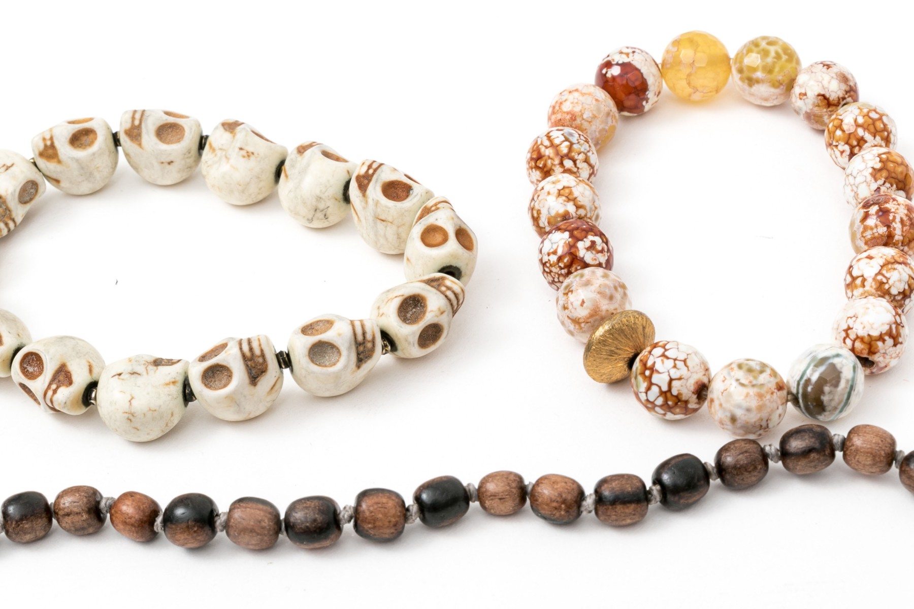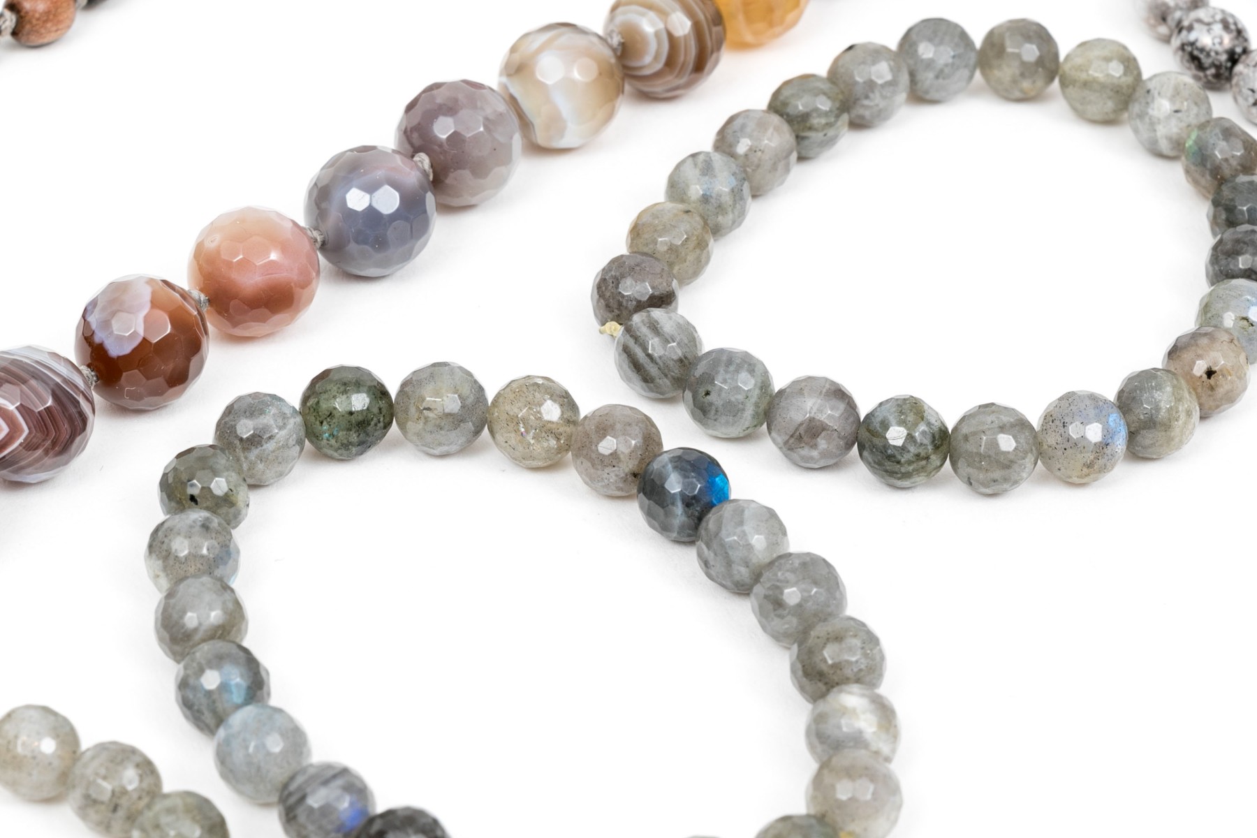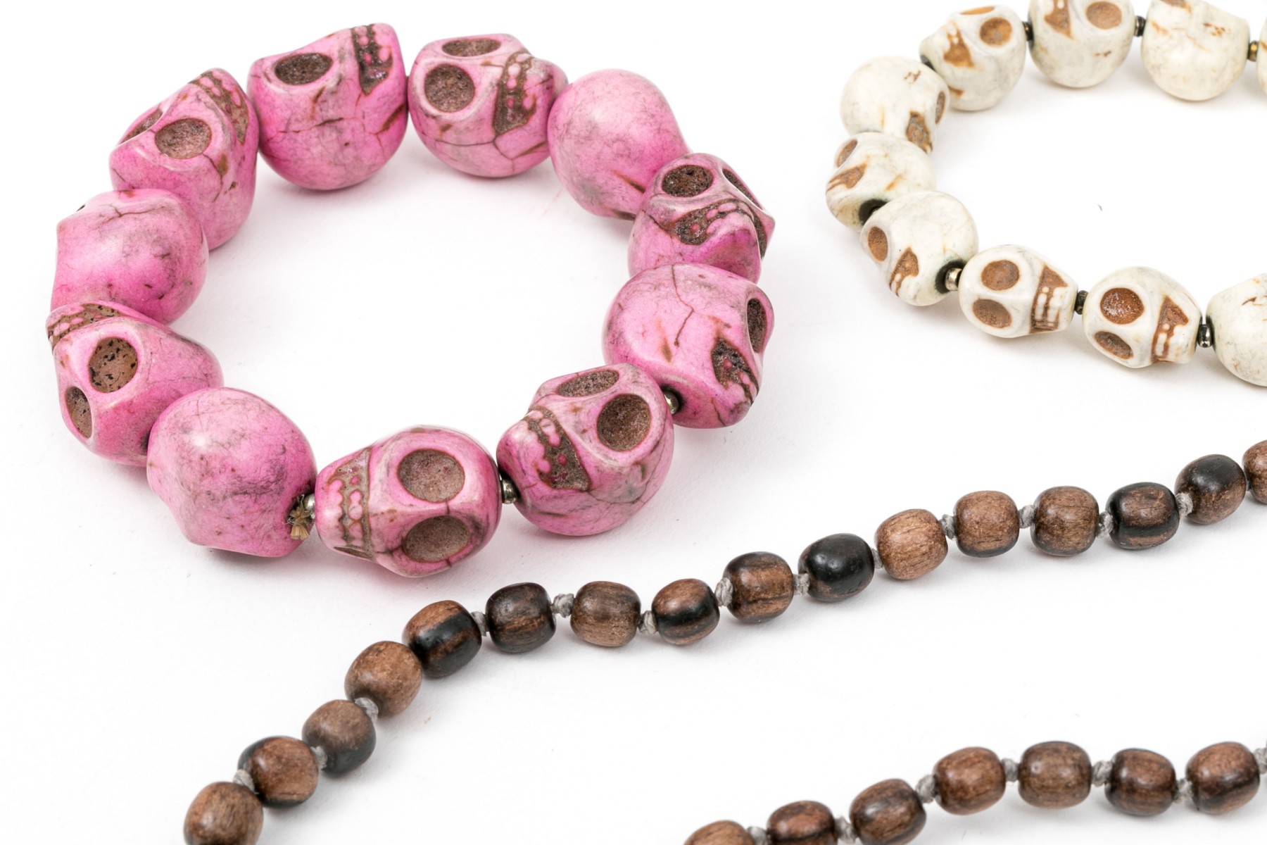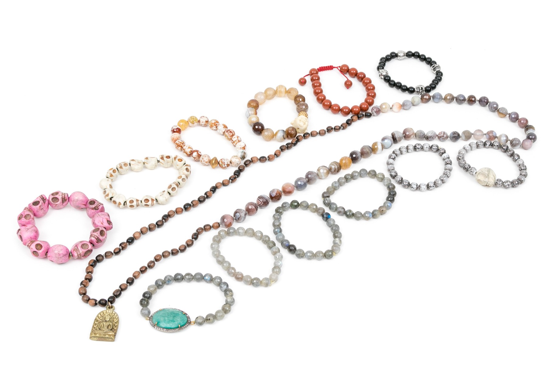 Lot of hard stone and wooden beaded necklaces and bracelets, including labradorite, agate and jasper. Bracelets are strung on stretch bands. Pink and white carved skull beads.