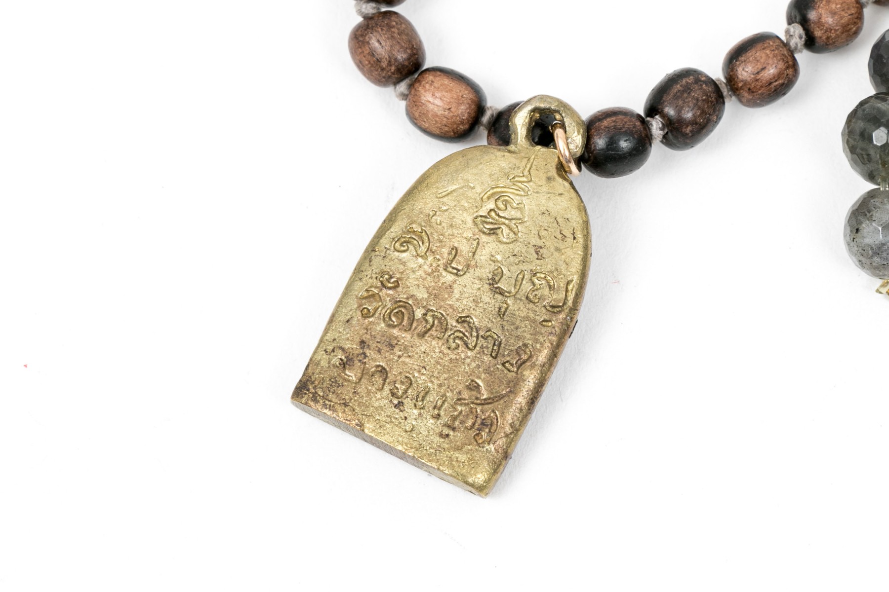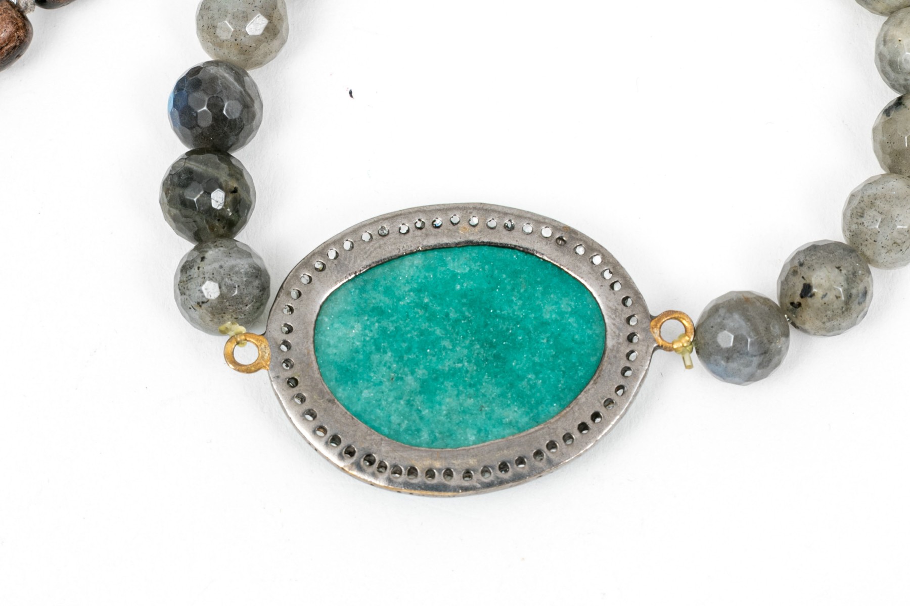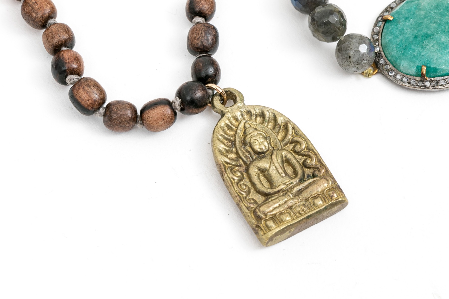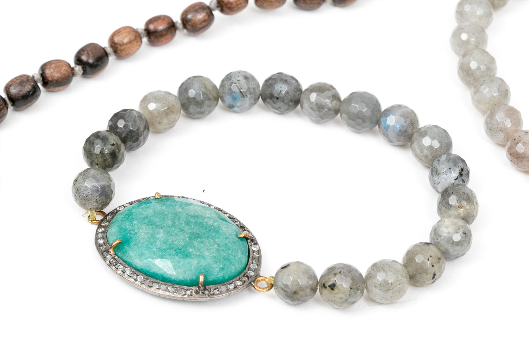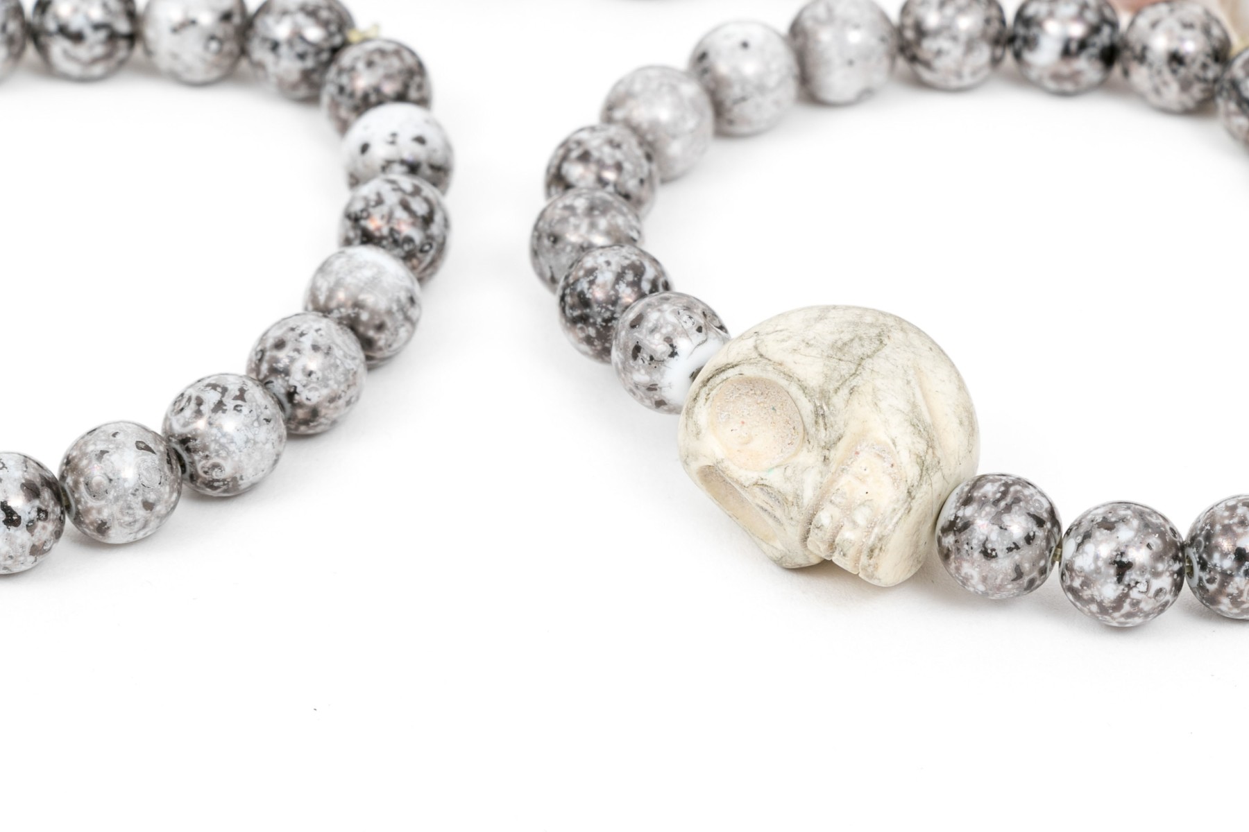 Lot of hard stone and wooden beaded necklaces and bracelets, including labradorite, agate and jasper. Bracelets are strung on stretch bands. Pink and white carved skull beads.
