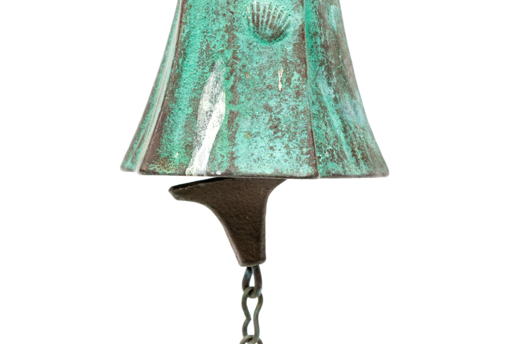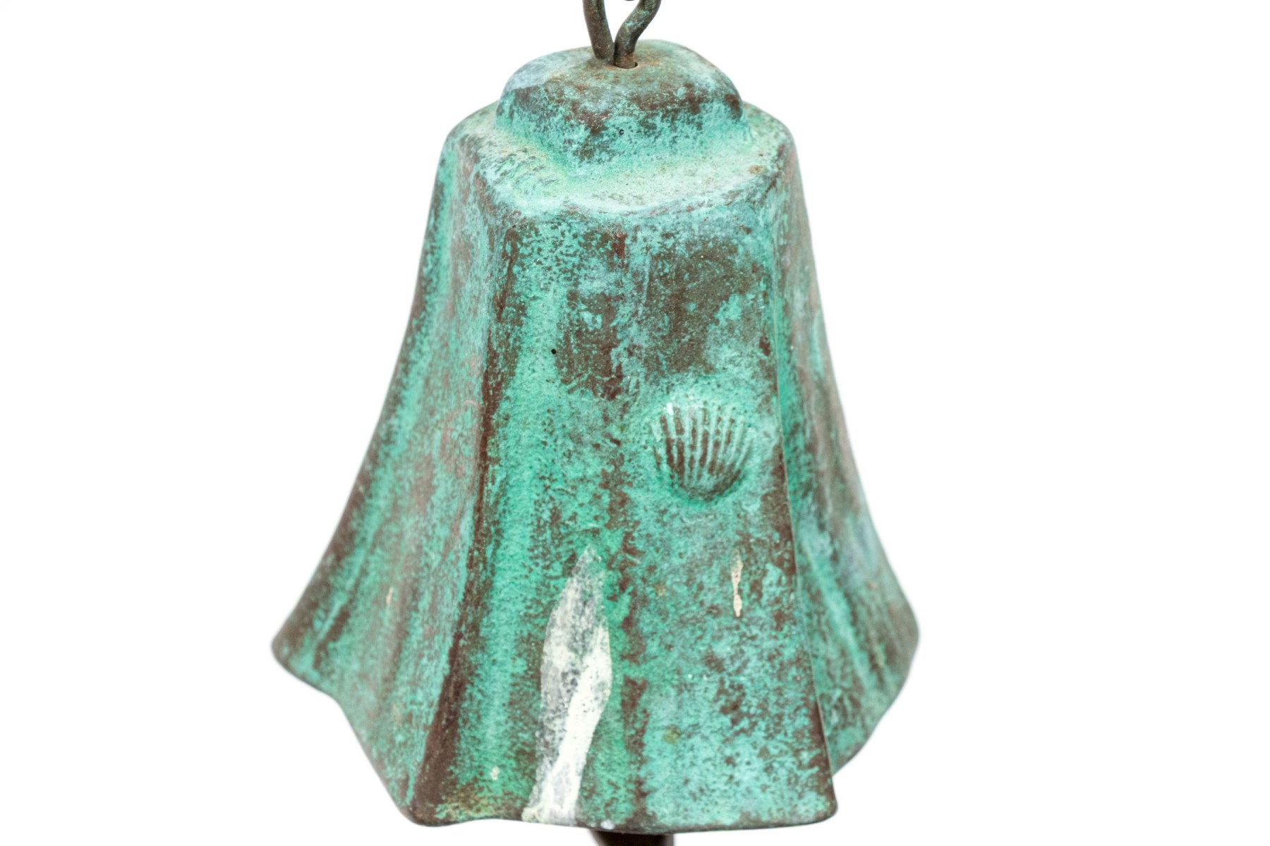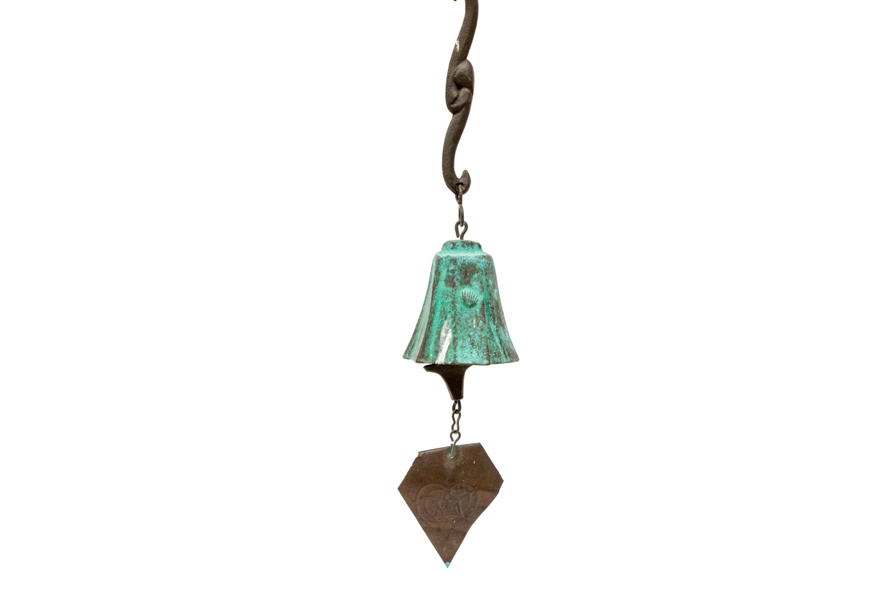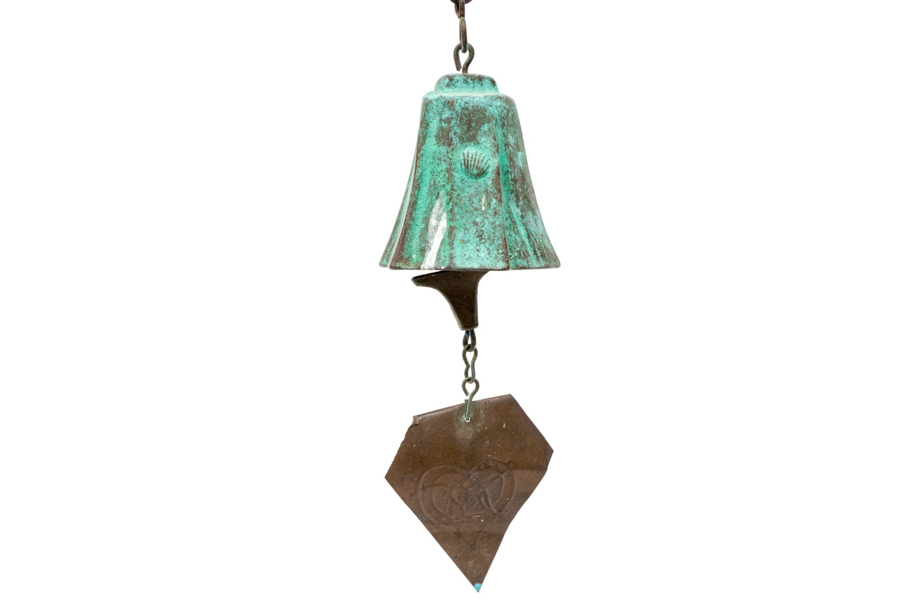 A charming Harmony Hollow Bell Works bronze wind bell with a textural raised shell motif on the side and a three-prong clapper adorned with a gem-shaped sheet copper fin with the maker's emblem on it. The bell is marked HHBW on the top and hangs from a double-S style hook at the top.
