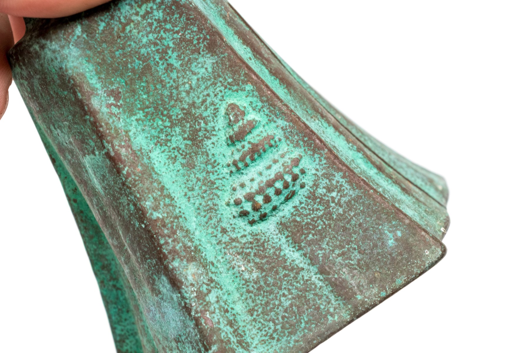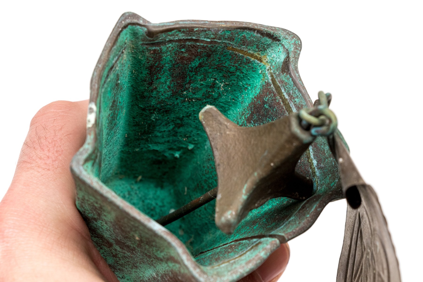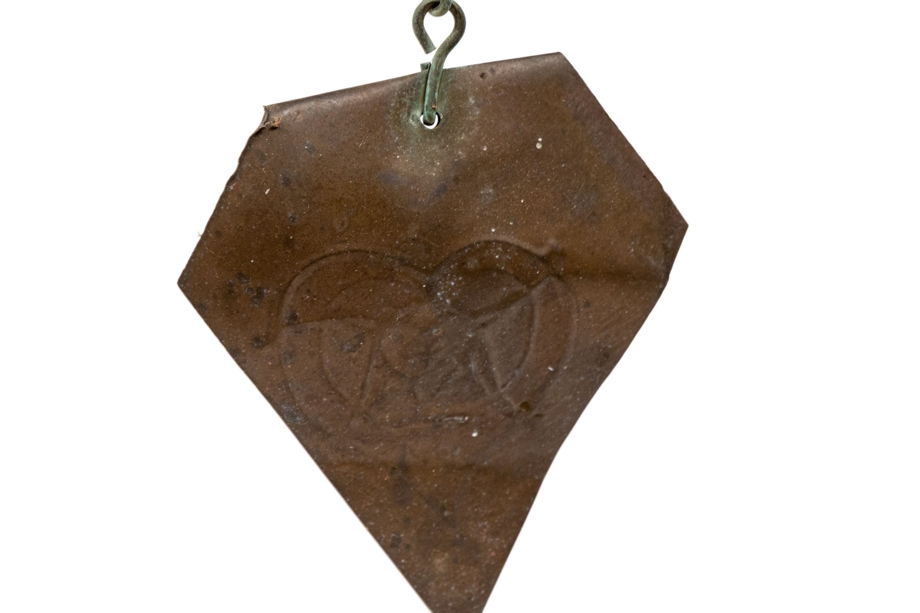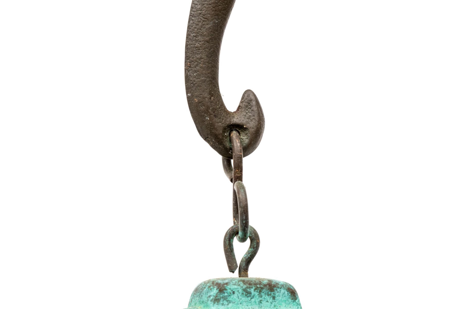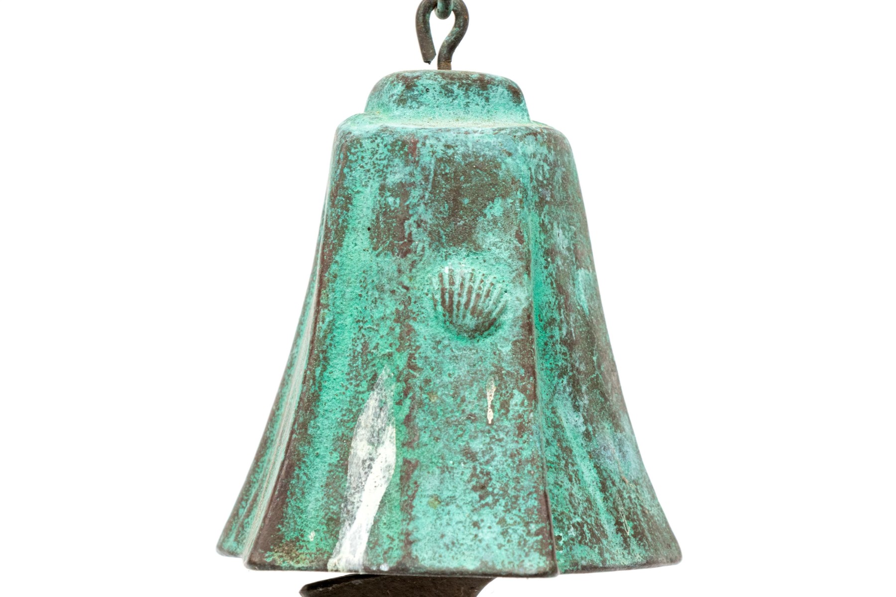 A charming Harmony Hollow Bell Works bronze wind bell with a textural raised shell motif on the side and a three-prong clapper adorned with a gem-shaped sheet copper fin with the maker's emblem on it. The bell is marked HHBW on the top and hangs from a double-S style hook at the top.