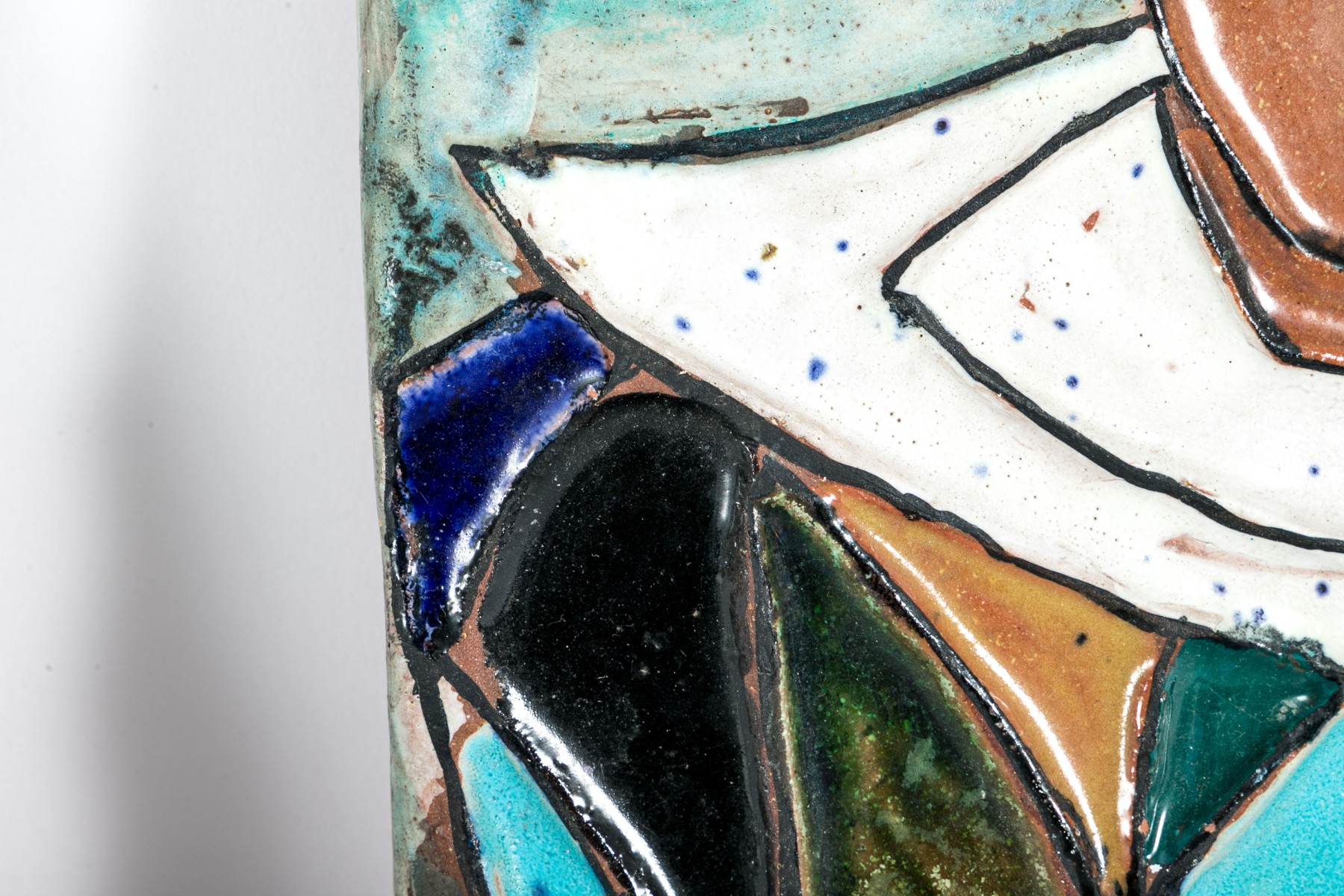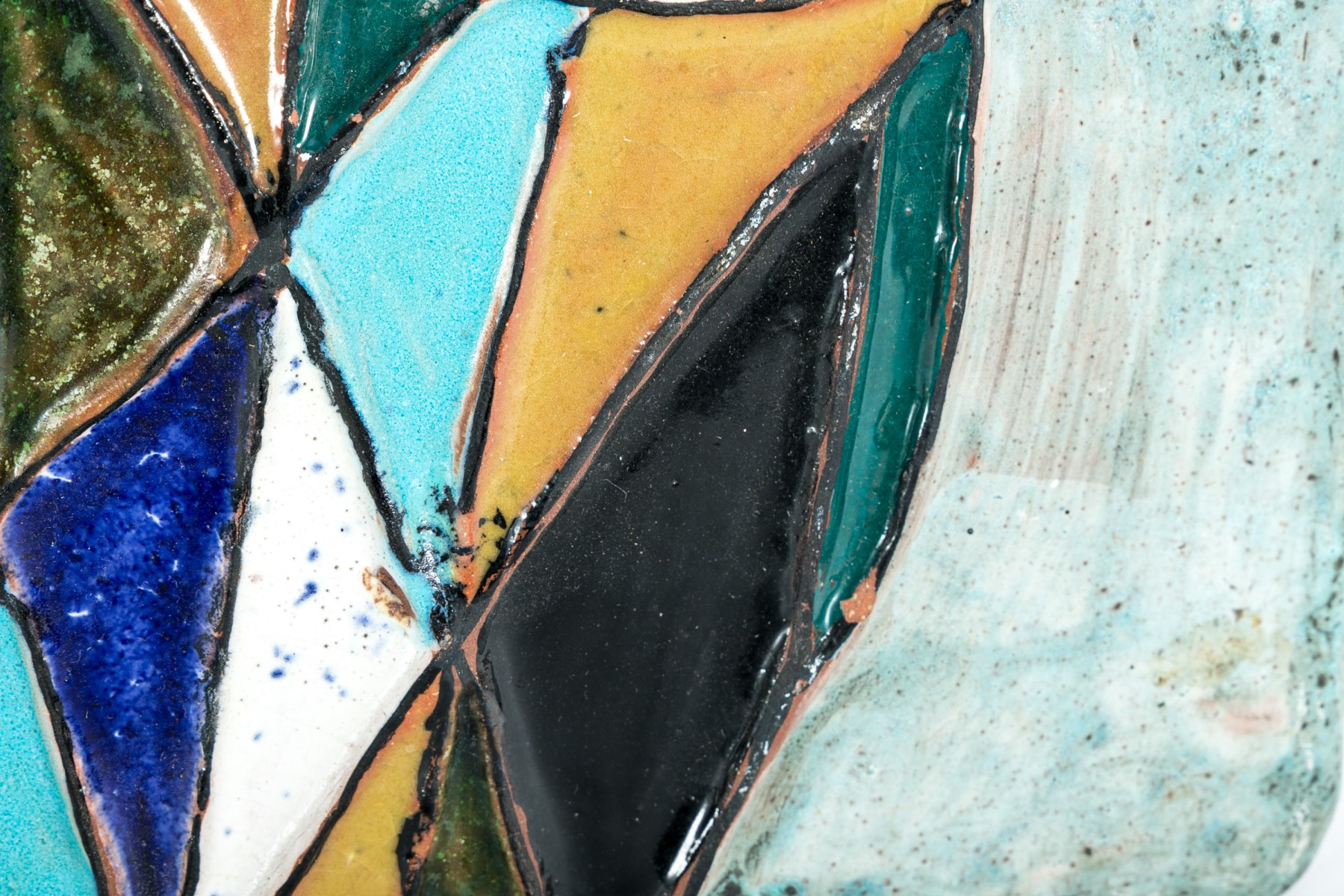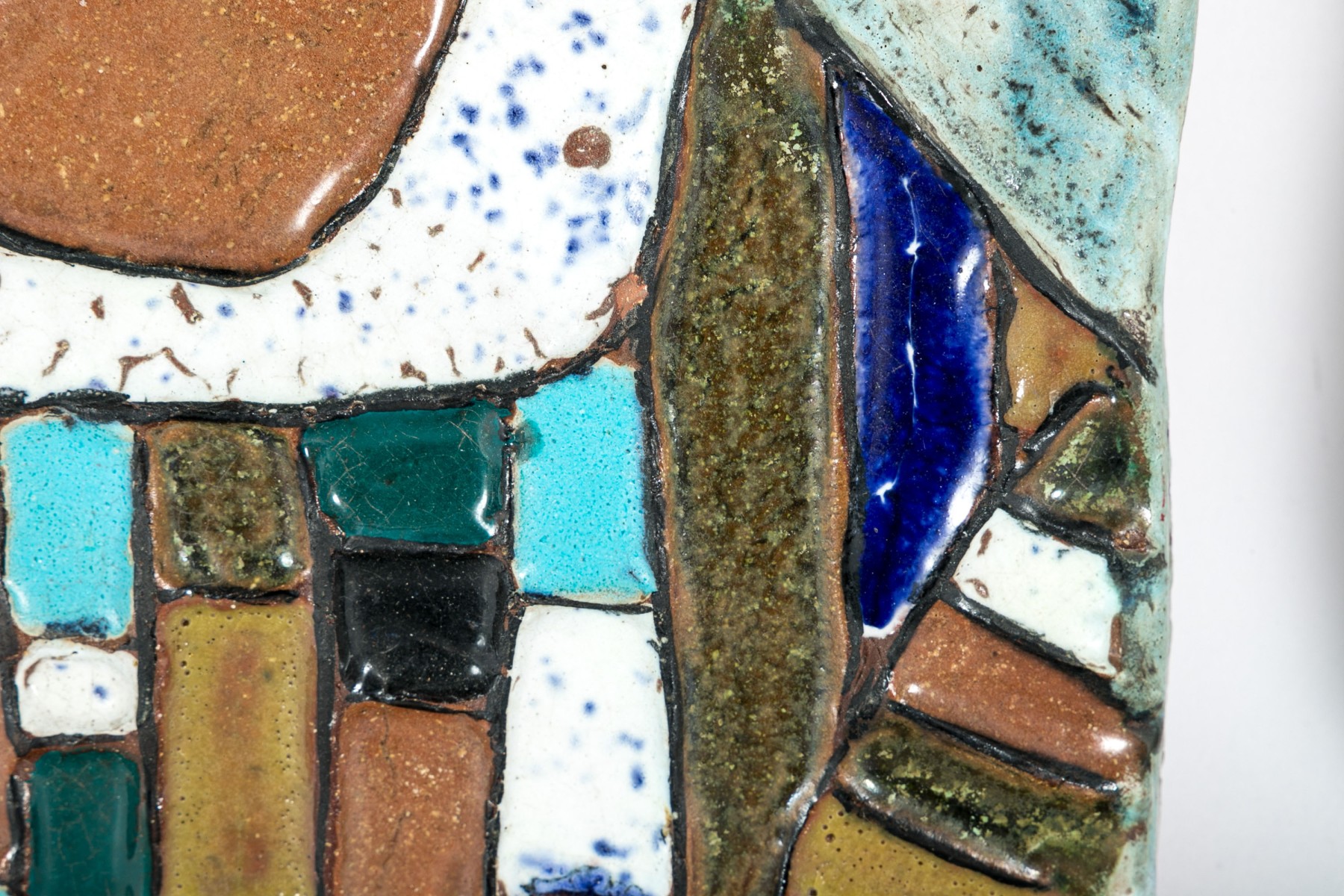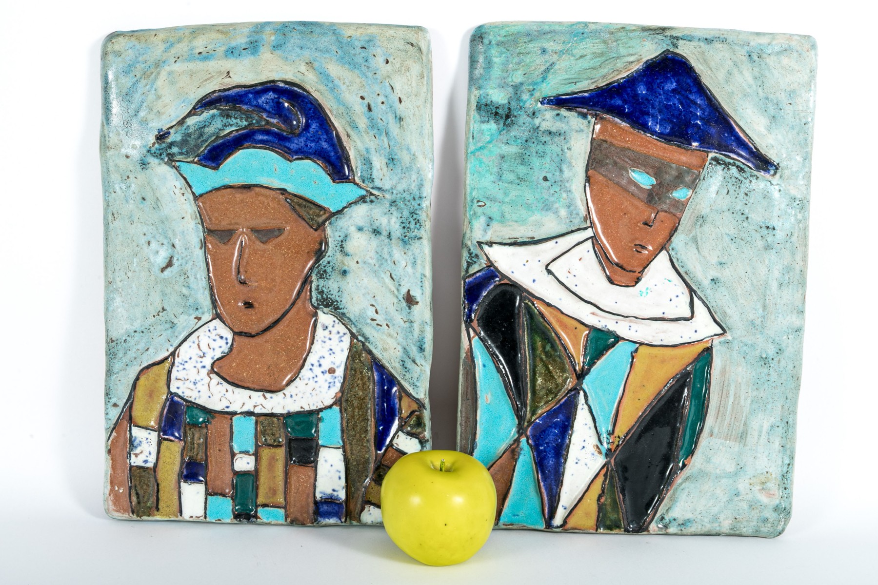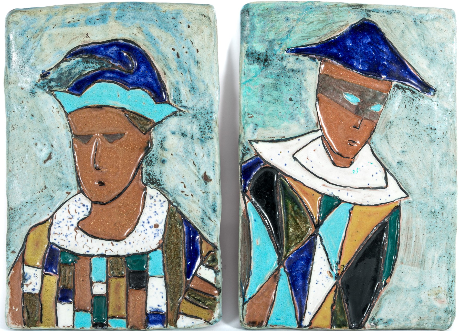 Harris G. Strong (American, 1920-2006) pair of ceramic plaque wall sculptures depicting portraits of harlequin figures in patterned attire colorblocked in yellow, green, light blue, and dark blue, standing against textural light blue backgrounds. Unsigned, affixed with hanging hardware on the backs.