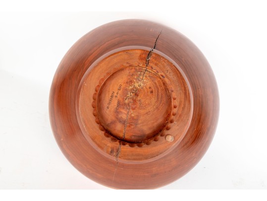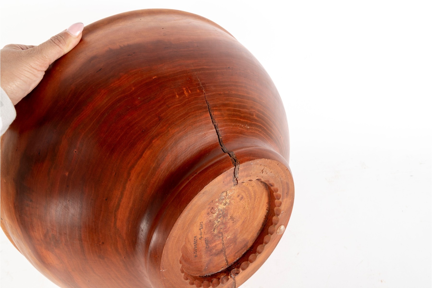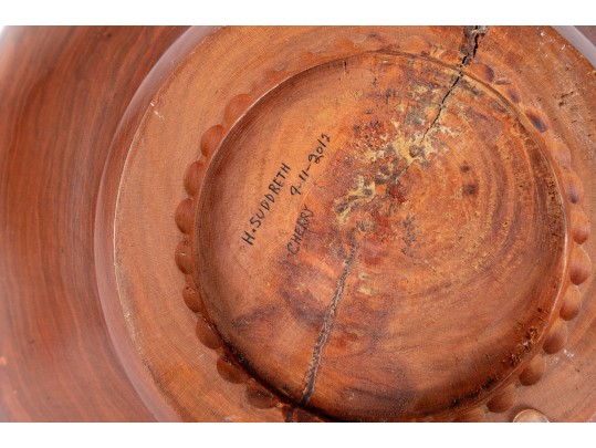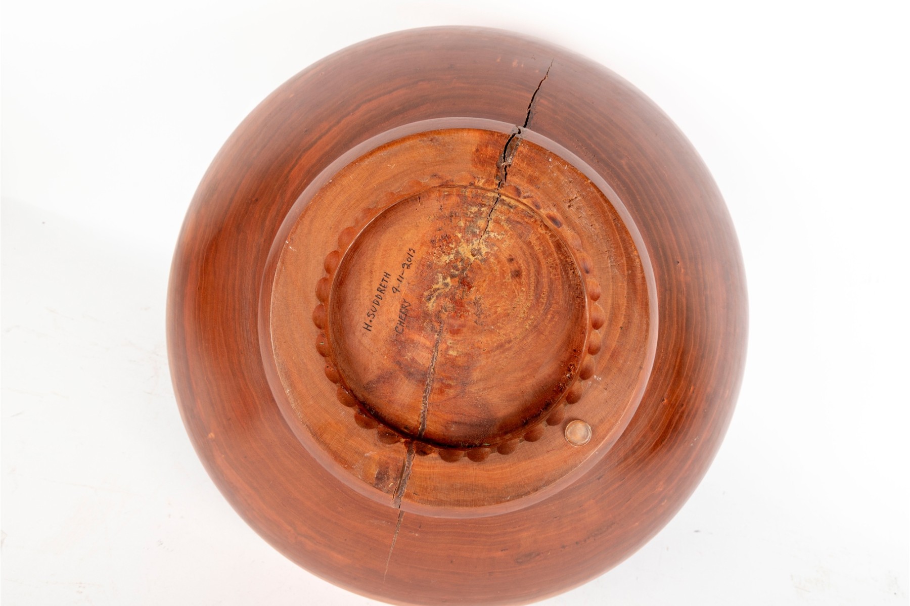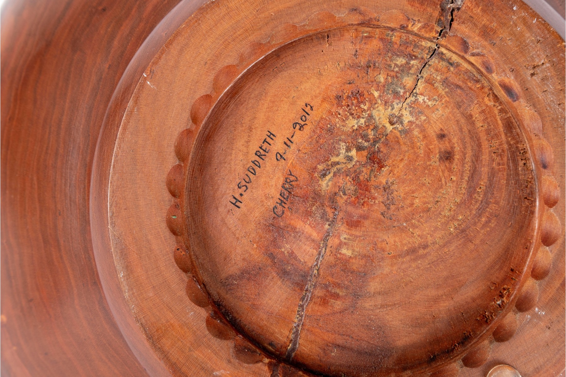 Harry Suddreth (American [NC], 20th C.) turned cherry wood centerpiece bowl in a gorgeous orange-brown finish with a darker brown undulating ombre towards the foot. Signed and dated 2012 underfoot.