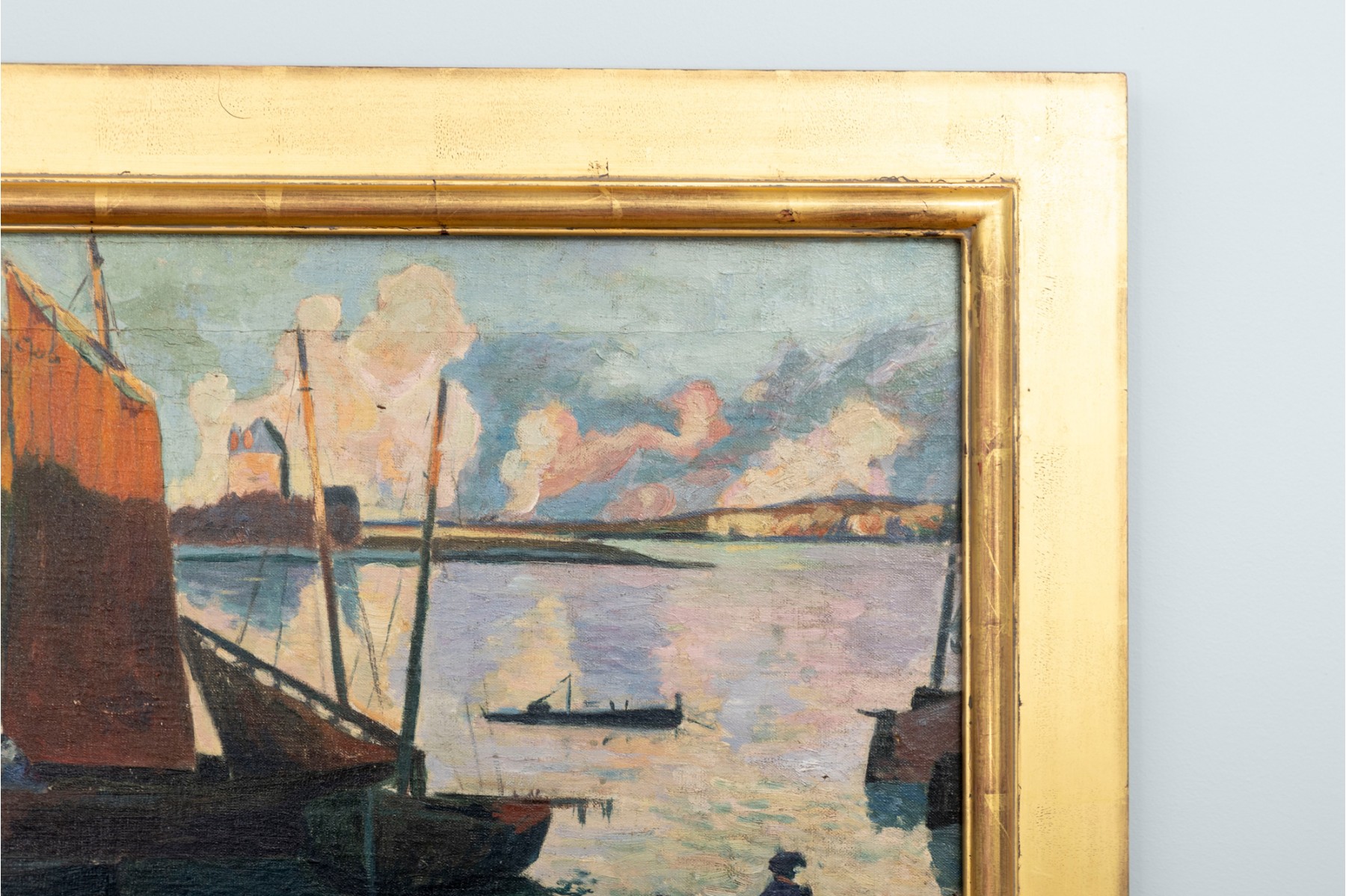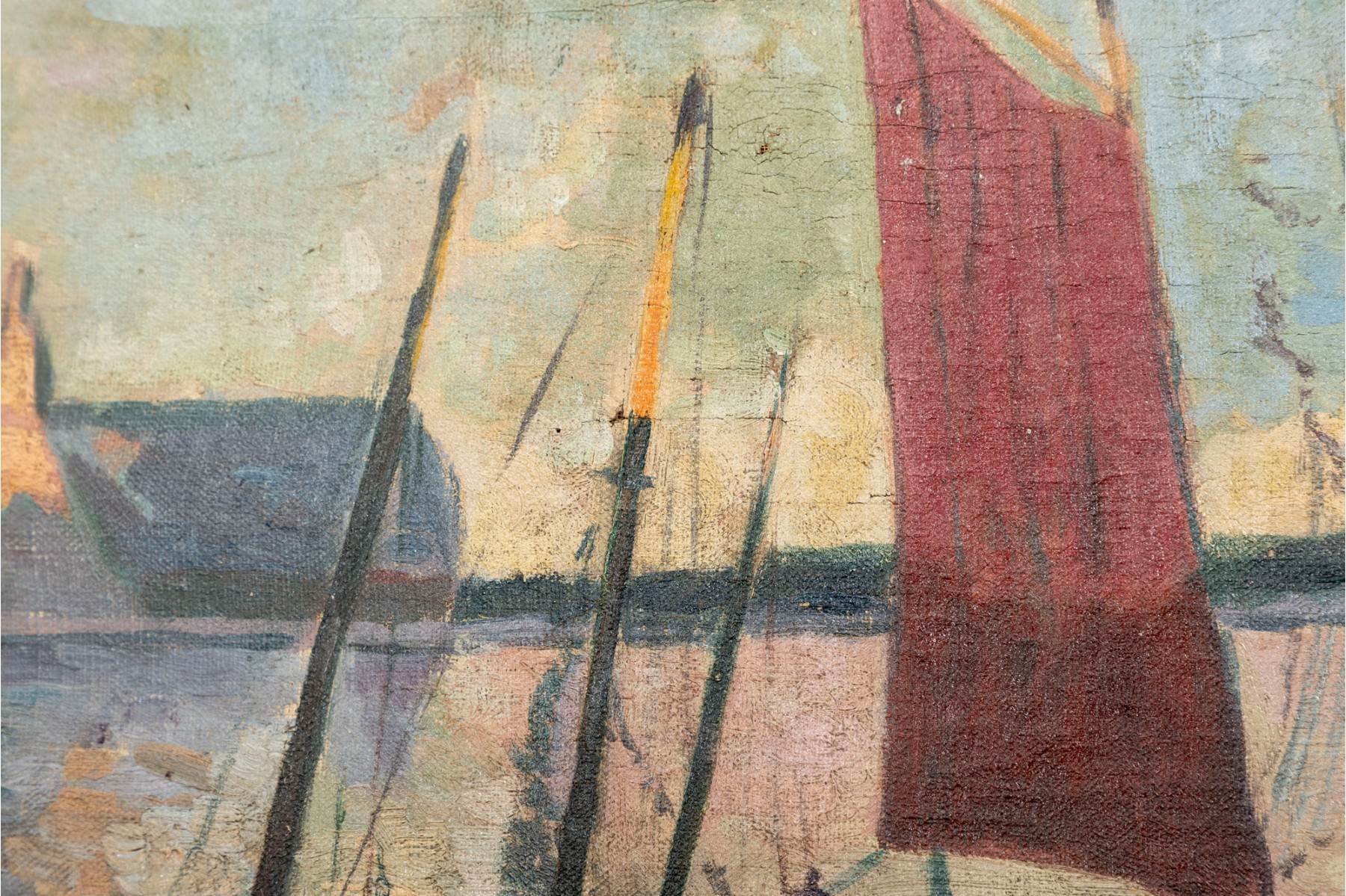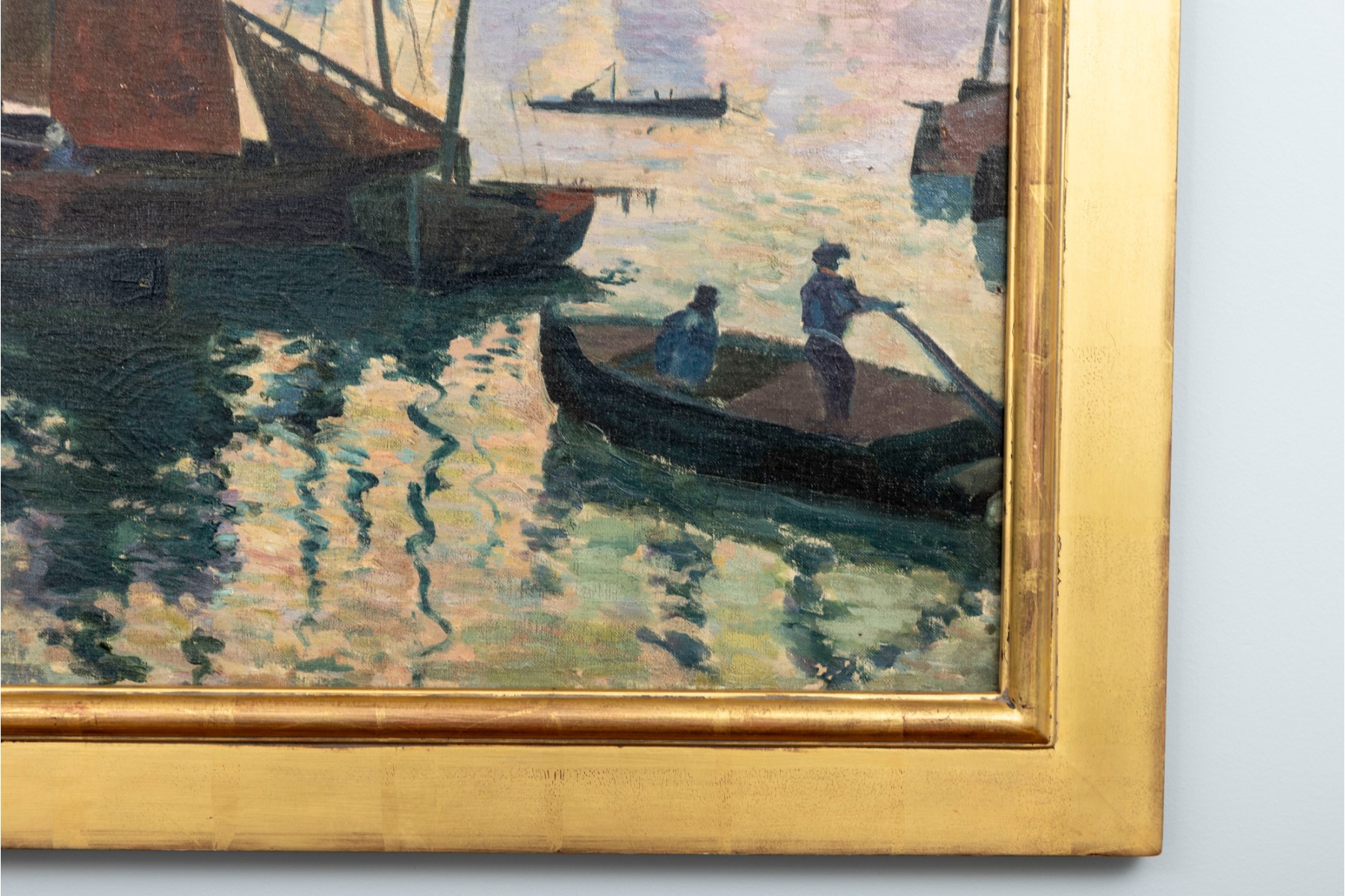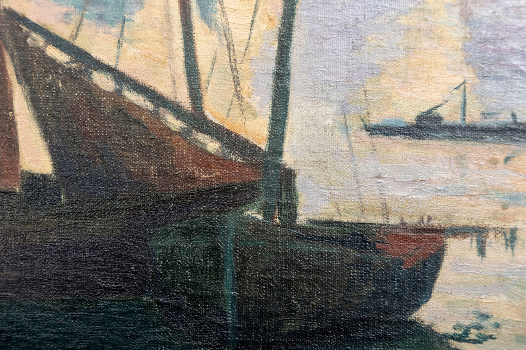 A large oil painting of a harbor at dusk by Hattie Hill (1847 - 1921). Well known, Hill studied and taught art in Paris. After returning to the United States, she maintained a portrait studio in Los Angeles from 1895 to 1898 and did a series of portraits of Bourbon County, Kentucky judges which hangs in the courthouse to this day.