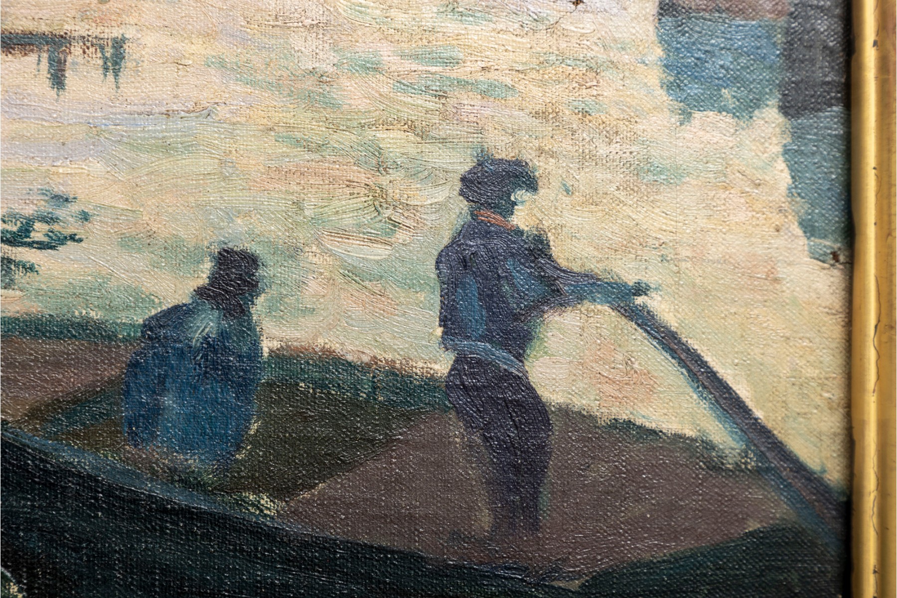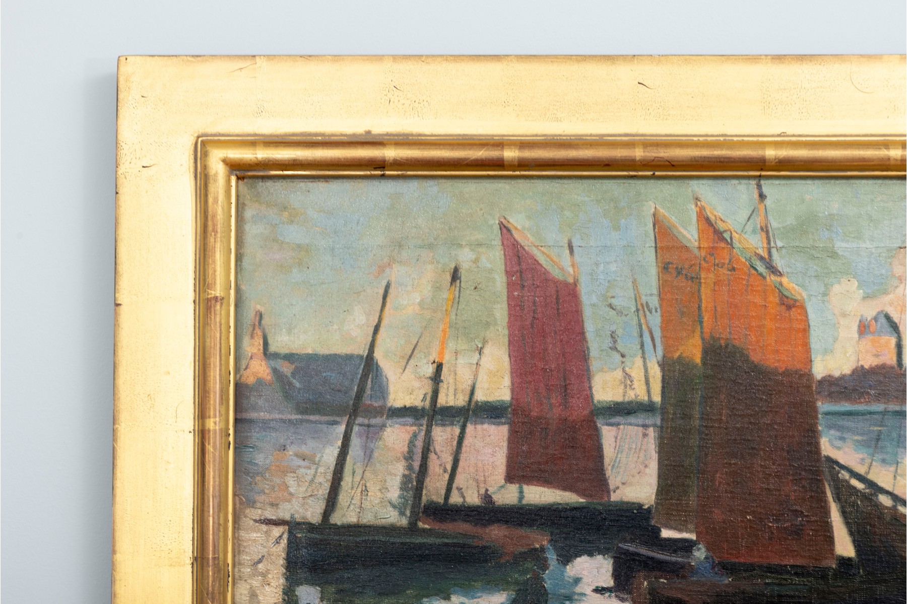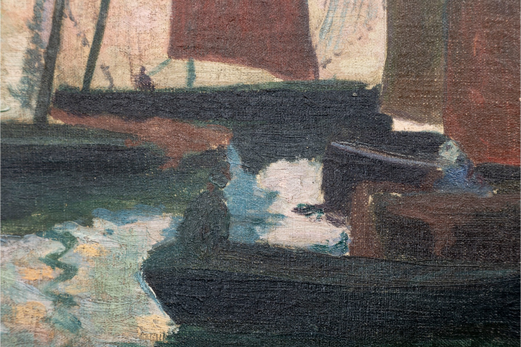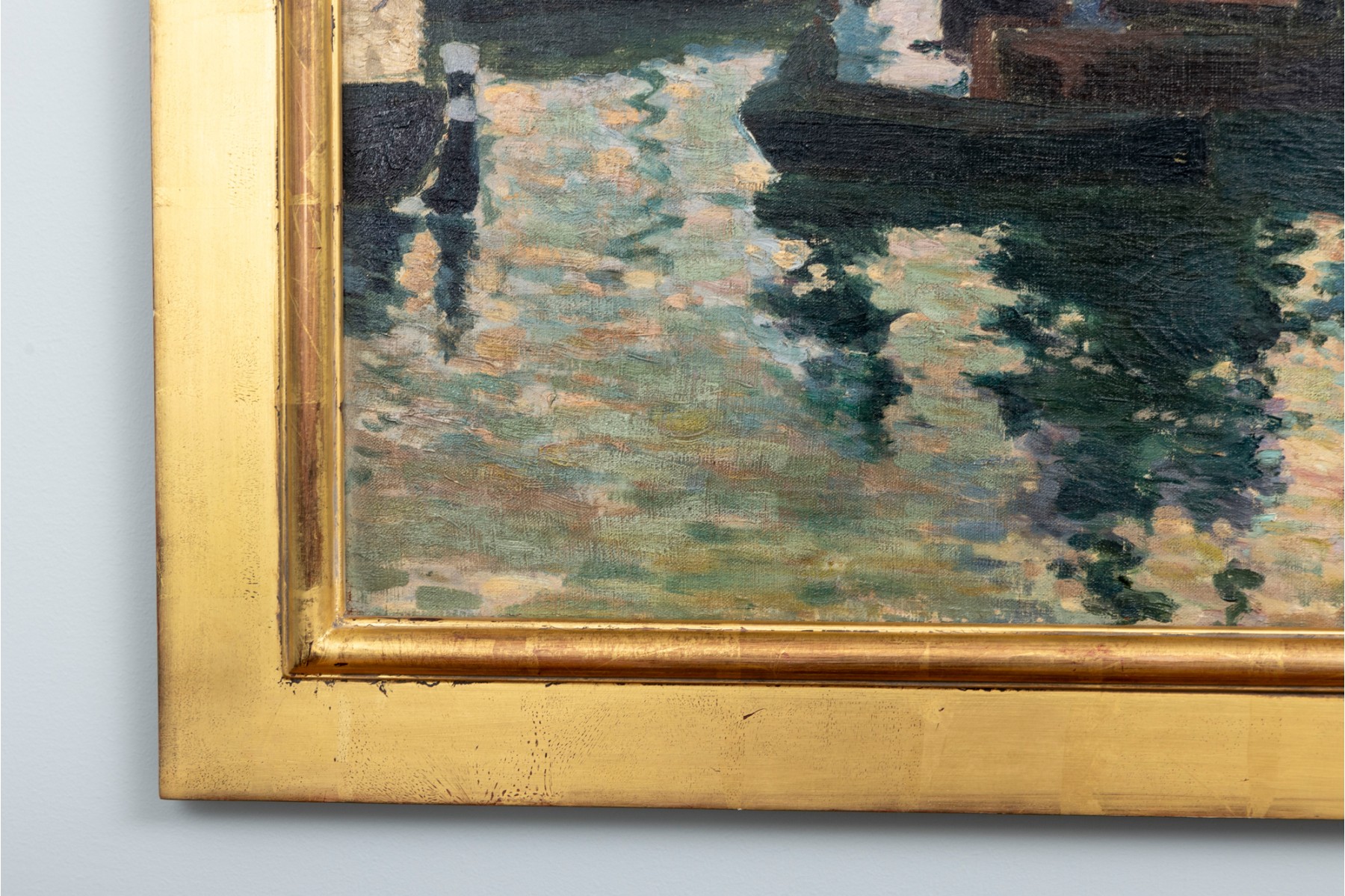A large oil painting of a harbor at dusk by Hattie Hill (1847 - 1921). Well known, Hill studied and taught art in Paris. After returning to the United States, she maintained a portrait studio in Los Angeles from 1895 to 1898 and did a series of portraits of Bourbon County, Kentucky judges which hangs in the courthouse to this day.