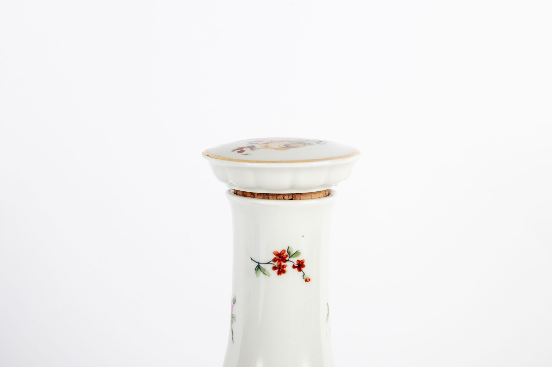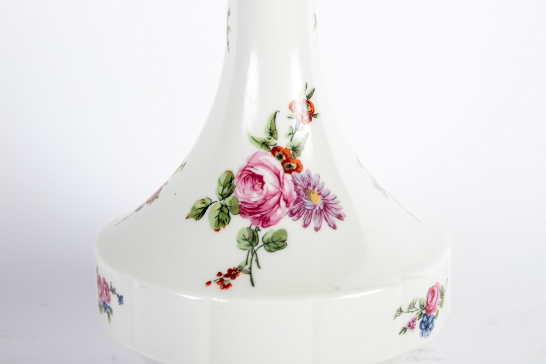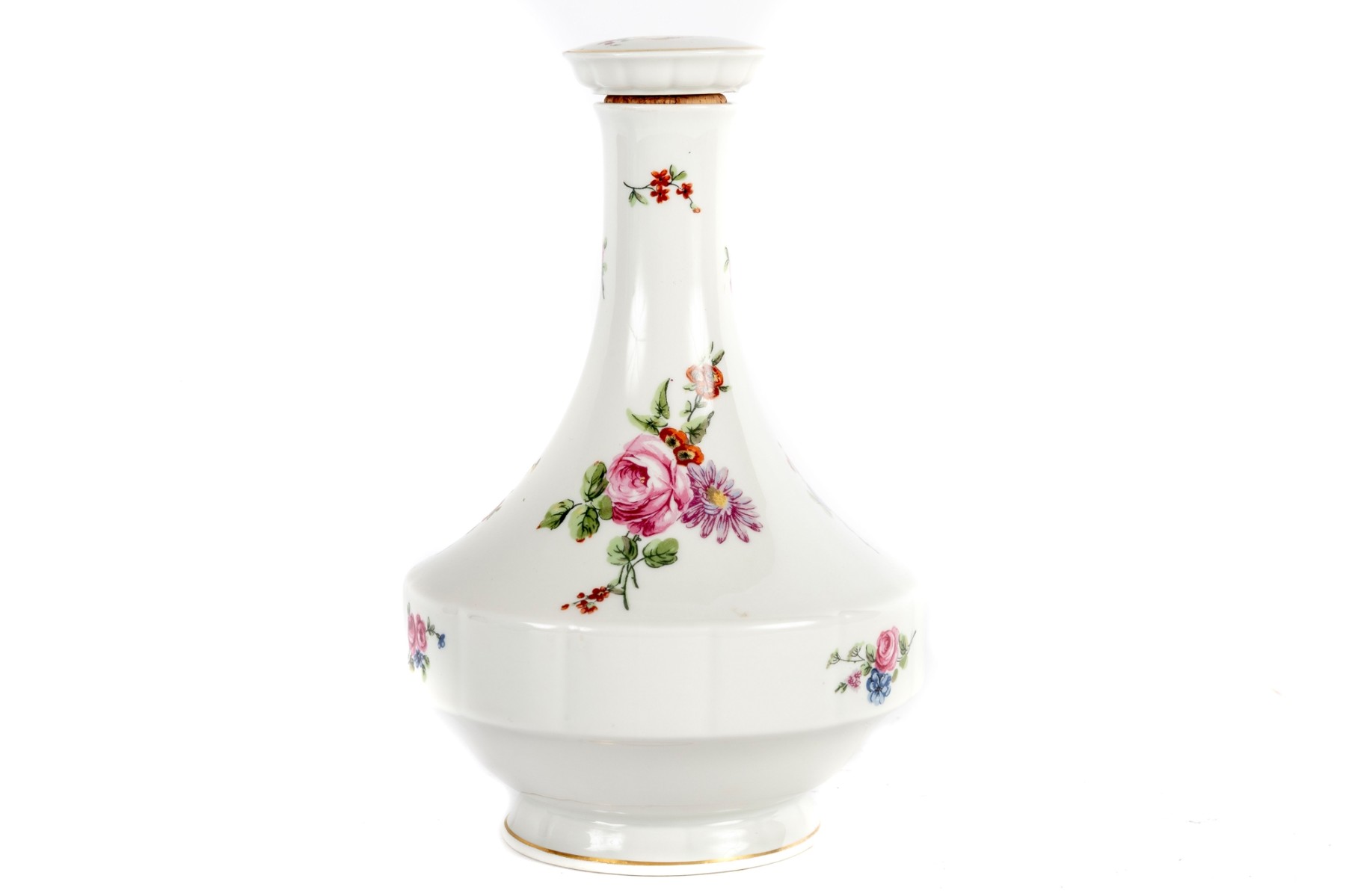 A gorgeous Haviland Limoges "Chantilly" pattern porcelain decanter showcasing a gently scalloped stopper over a tall bottle neck dramatically tapering out to a lobed waist before swooping into a circular foot. Decorated with gorgeous, vibrant floral sprays in pink, purple, red, and blue. Marked underfoot.