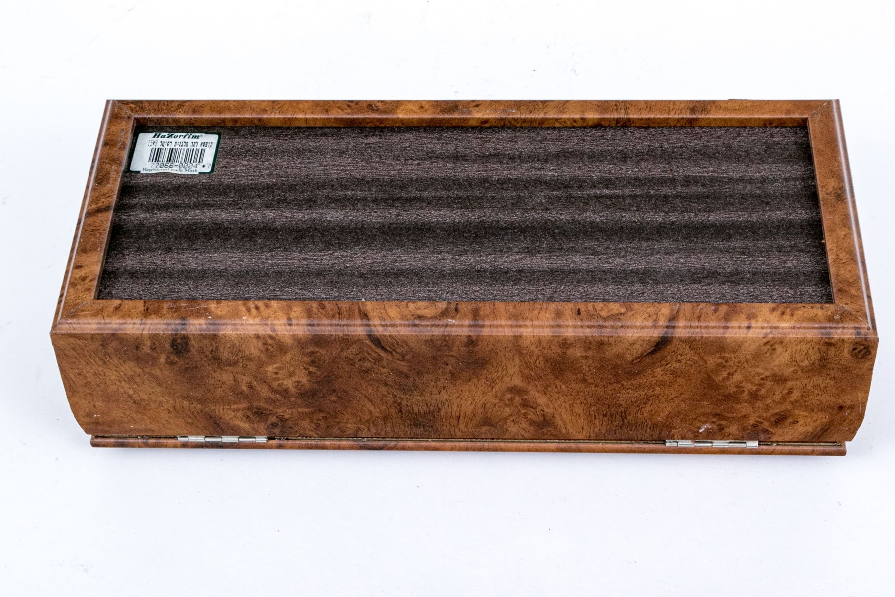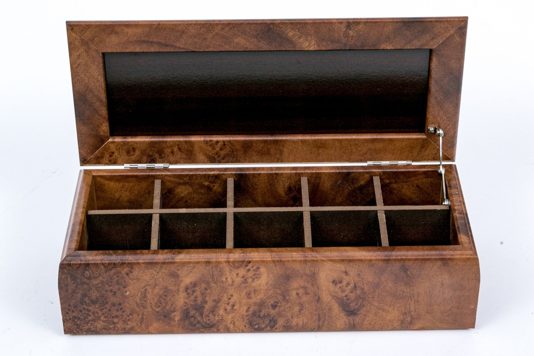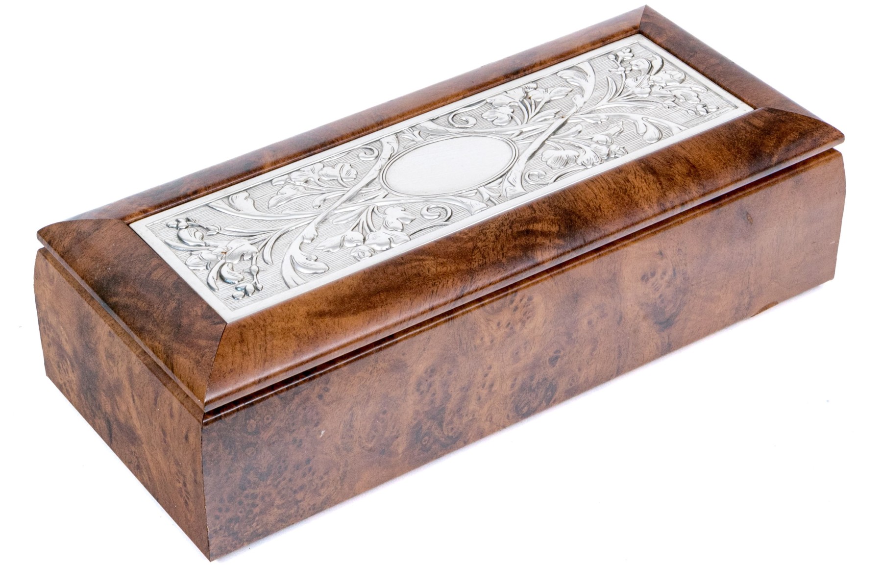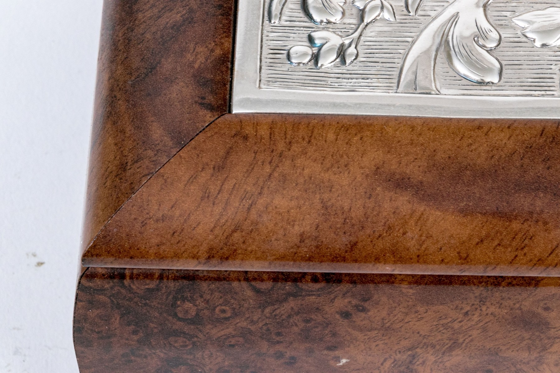 A beautiful Hazorfim tea box with gorgeous burled veneers in rich medium brown wood, inlaid with a sterling silver plaque at the center of the hinged lid. The plaque is finely detailed with foliate flourishes around a central oval medallion. The lid is nicely finished with a rounded bevel, opening to an interior with ten slotted compartments. The rectangular body is also nicely rounded around the top corners, creating a unique and elegant profile overall.