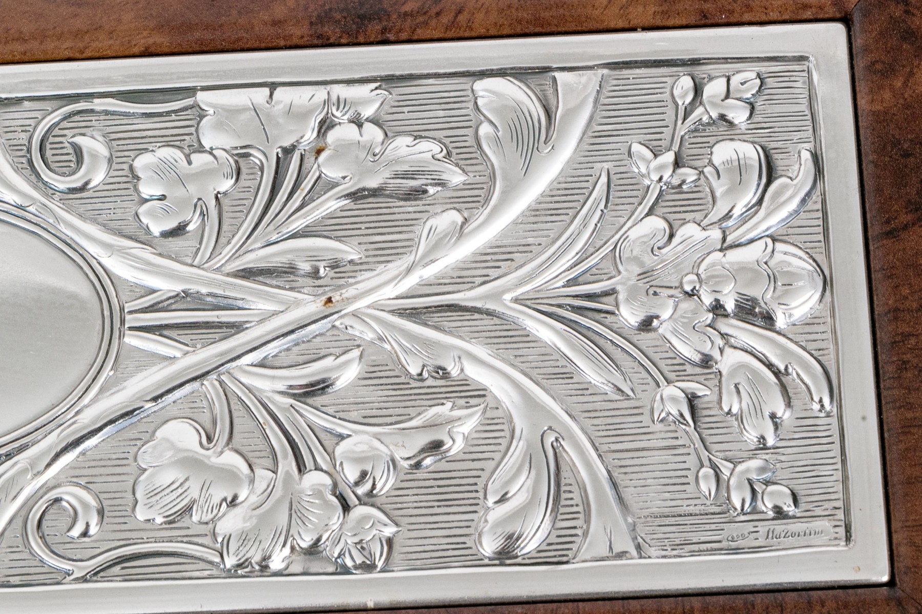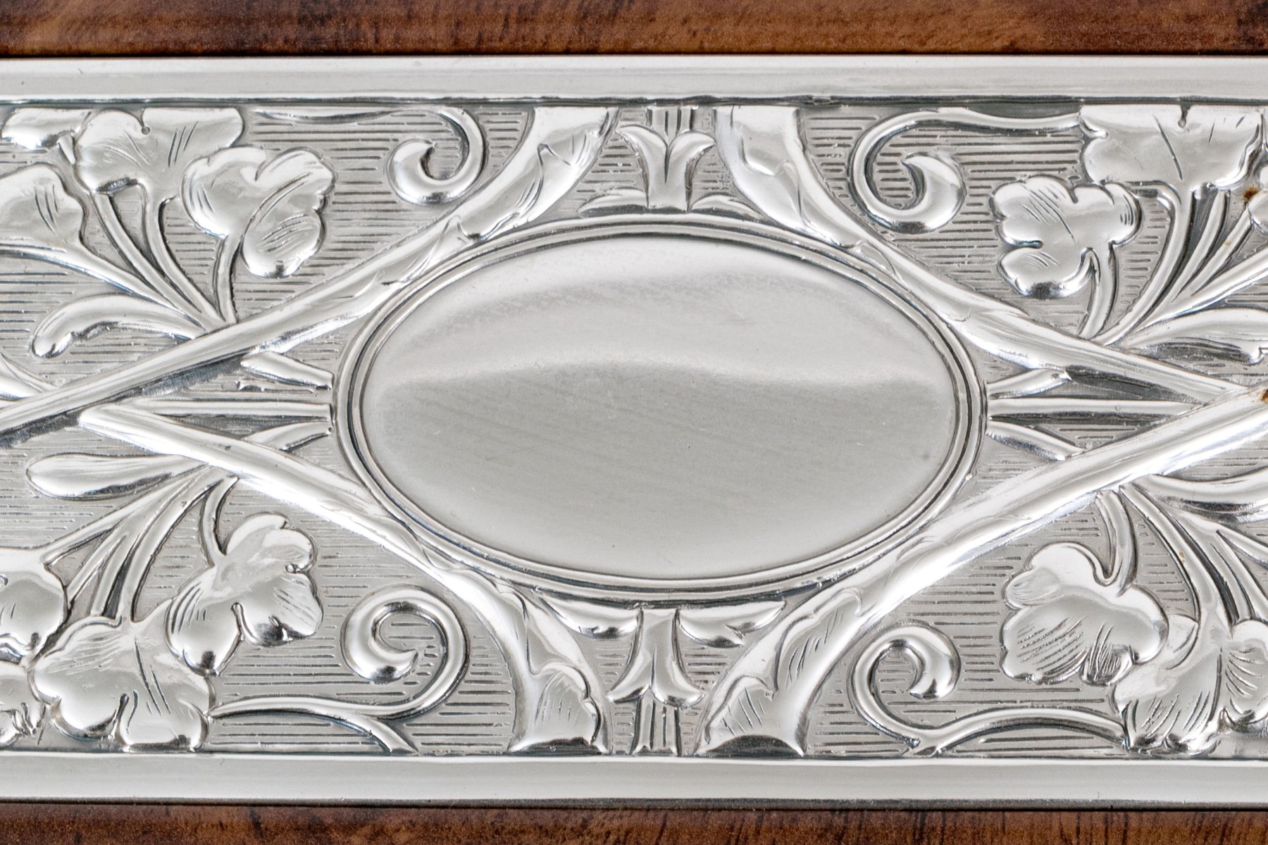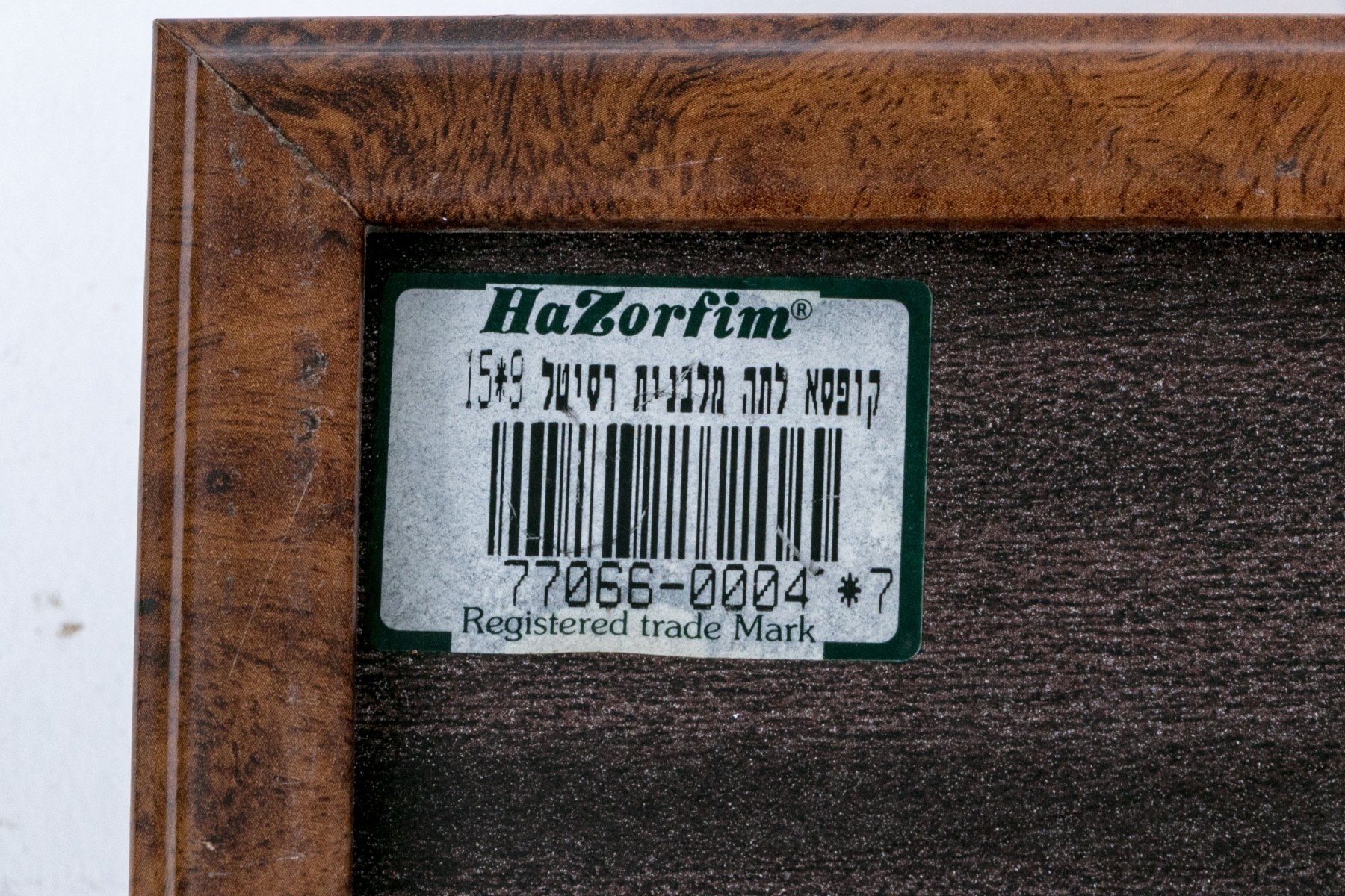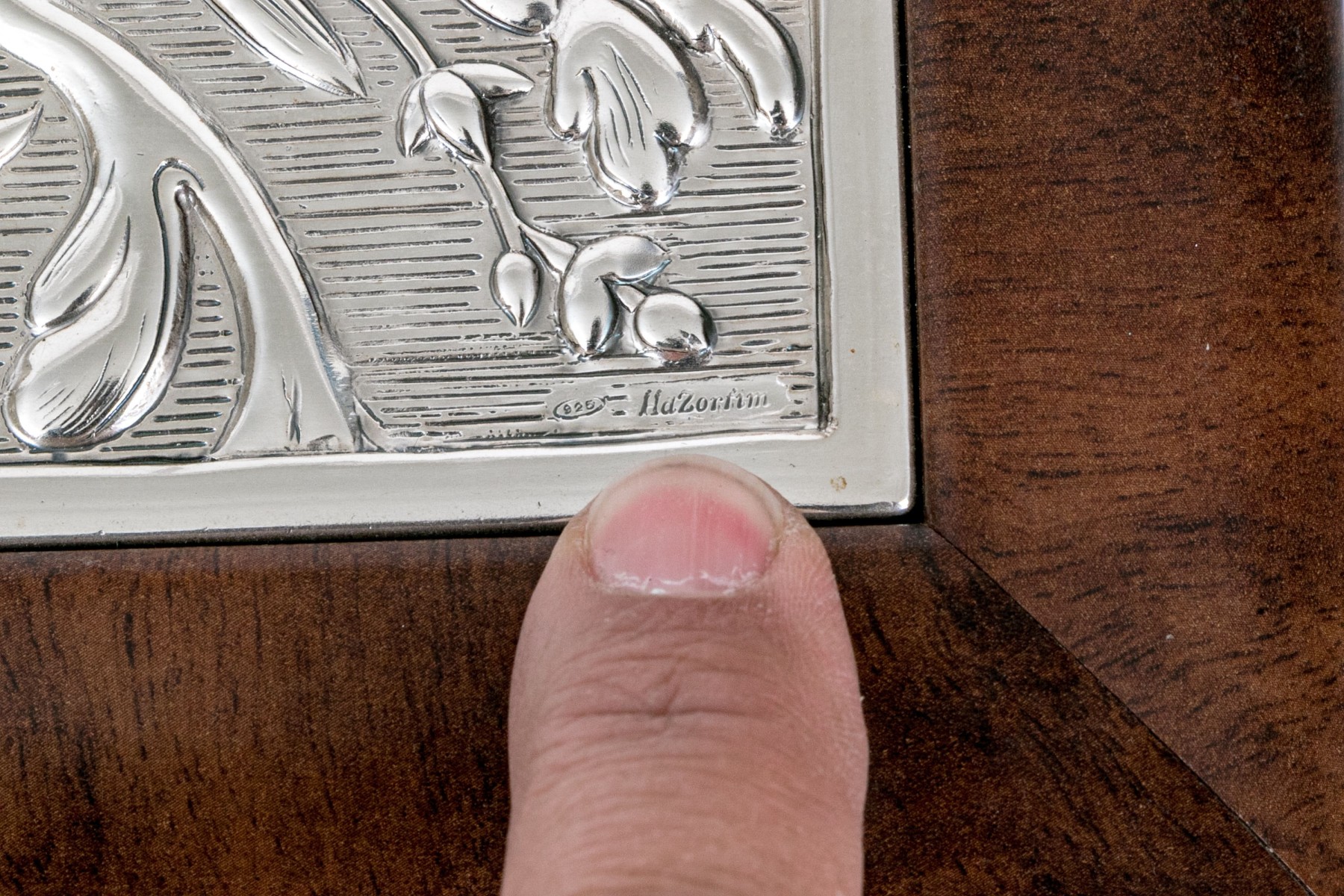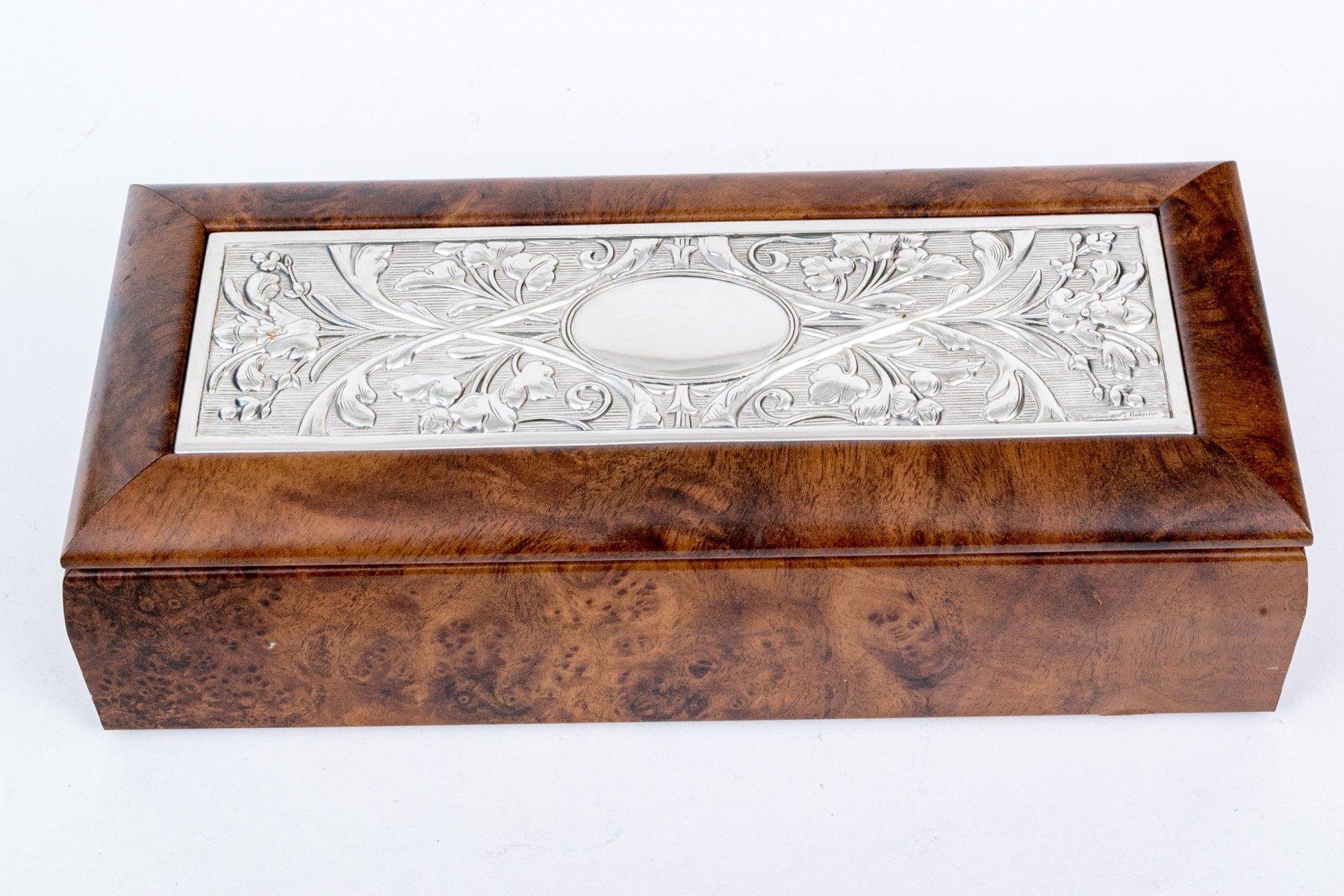 A beautiful Hazorfim tea box with gorgeous burled veneers in rich medium brown wood, inlaid with a sterling silver plaque at the center of the hinged lid. The plaque is finely detailed with foliate flourishes around a central oval medallion. The lid is nicely finished with a rounded bevel, opening to an interior with ten slotted compartments. The rectangular body is also nicely rounded around the top corners, creating a unique and elegant profile overall.