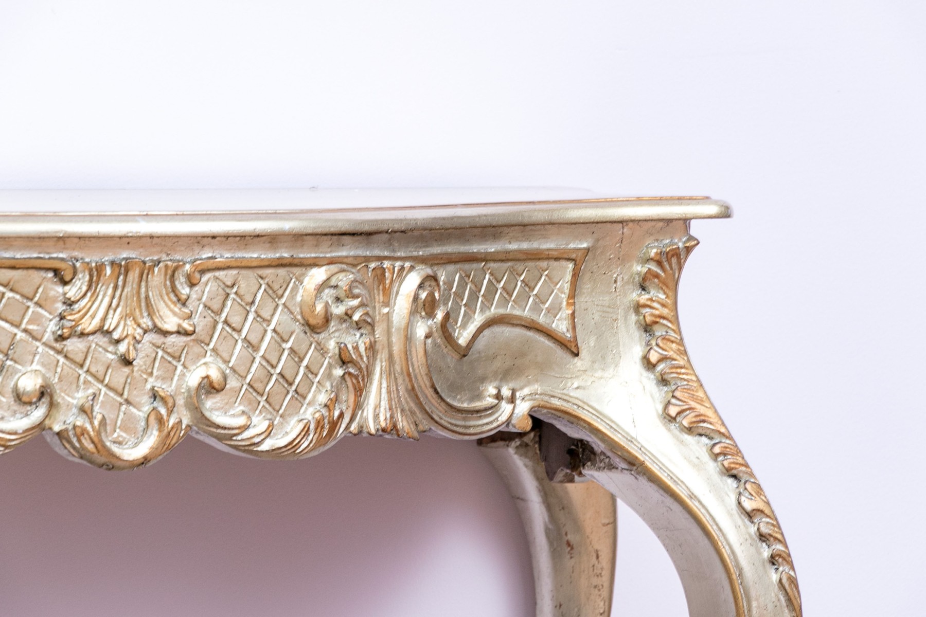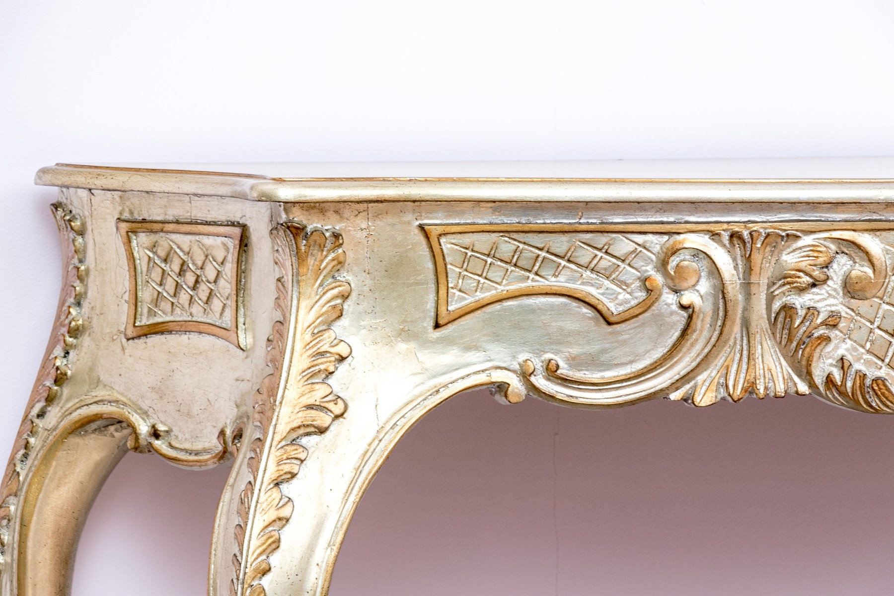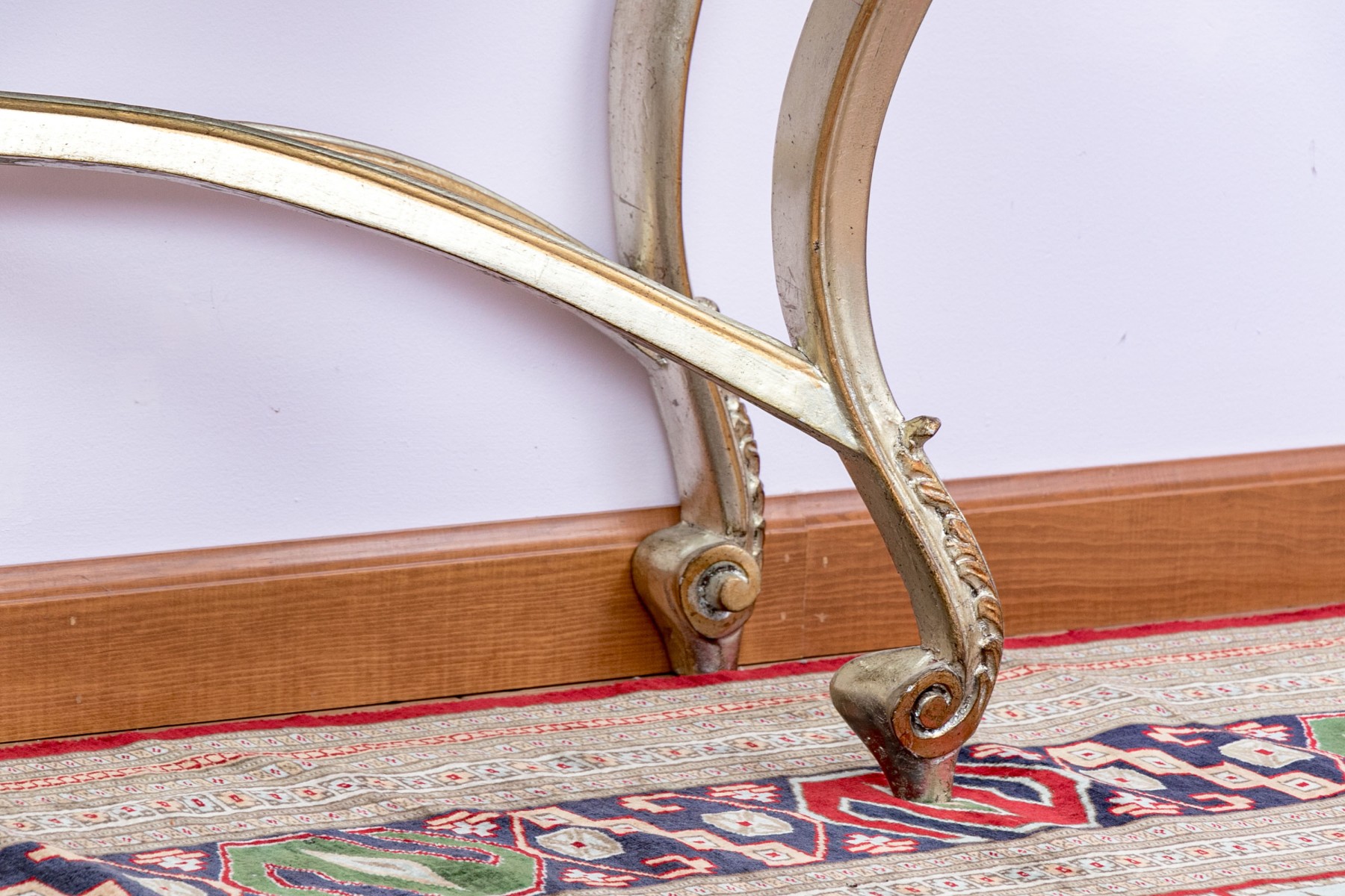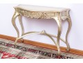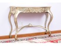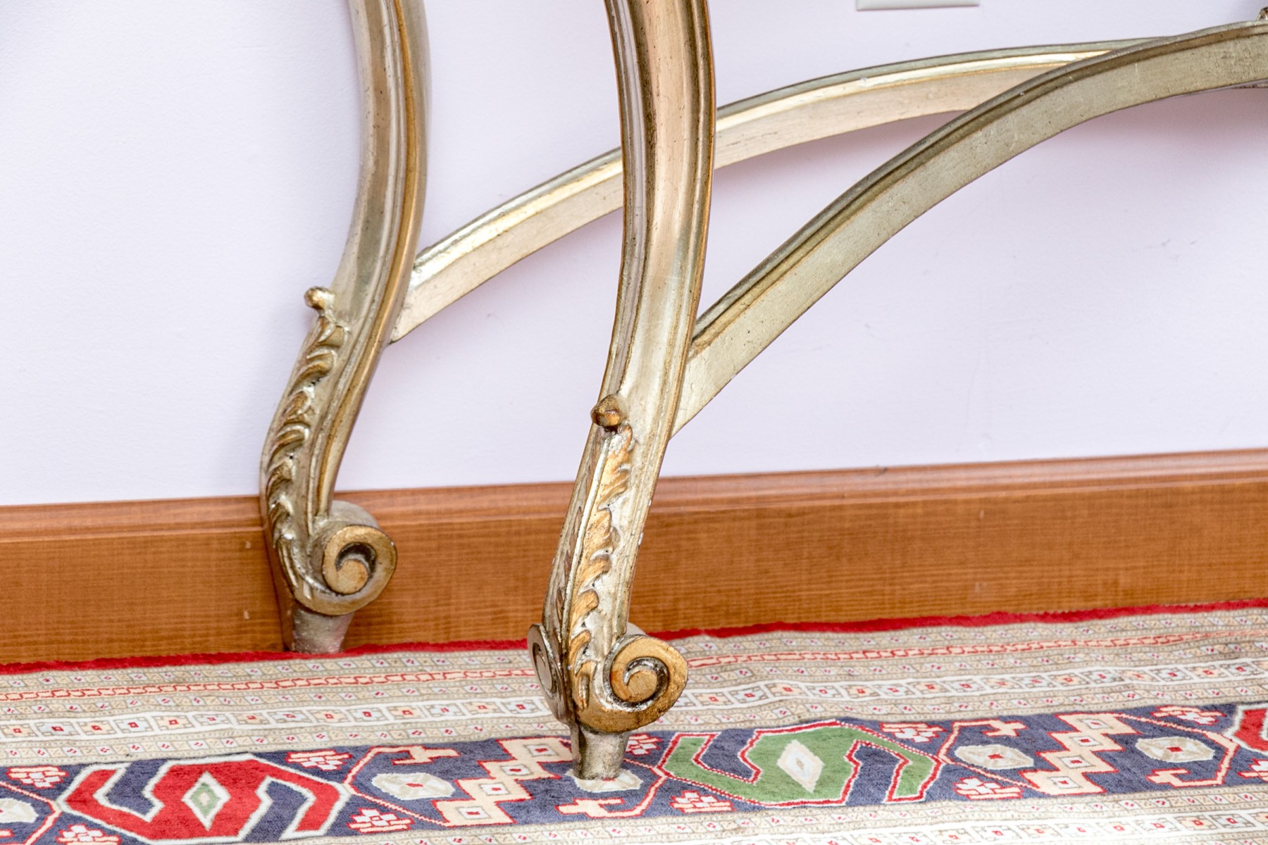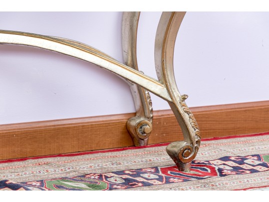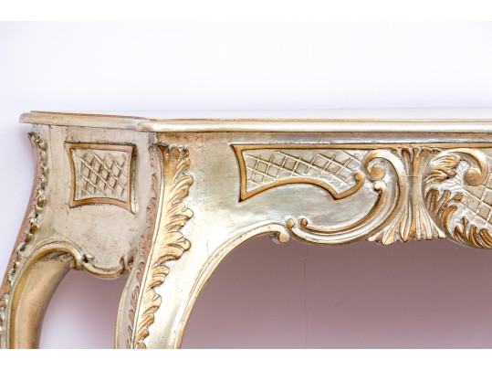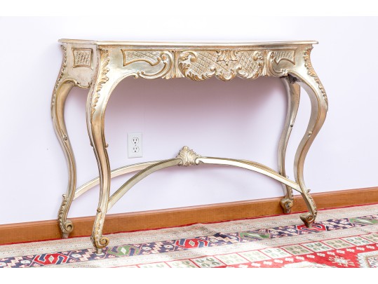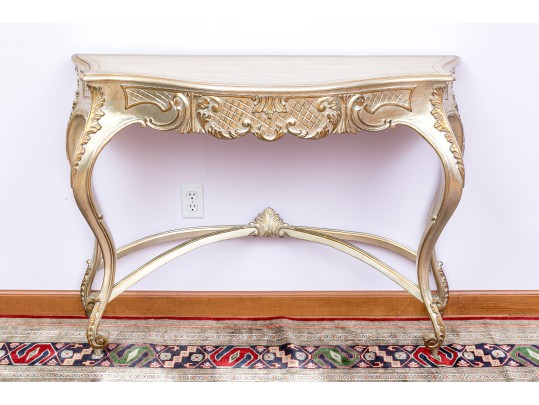 A shiny gilt painted console that is perfect for the entrance to any house. The piece raised on curved legs terminating on scrolled feet on a curved "x" stretcher with crosshatched marks and acanthus leaf decorations.