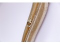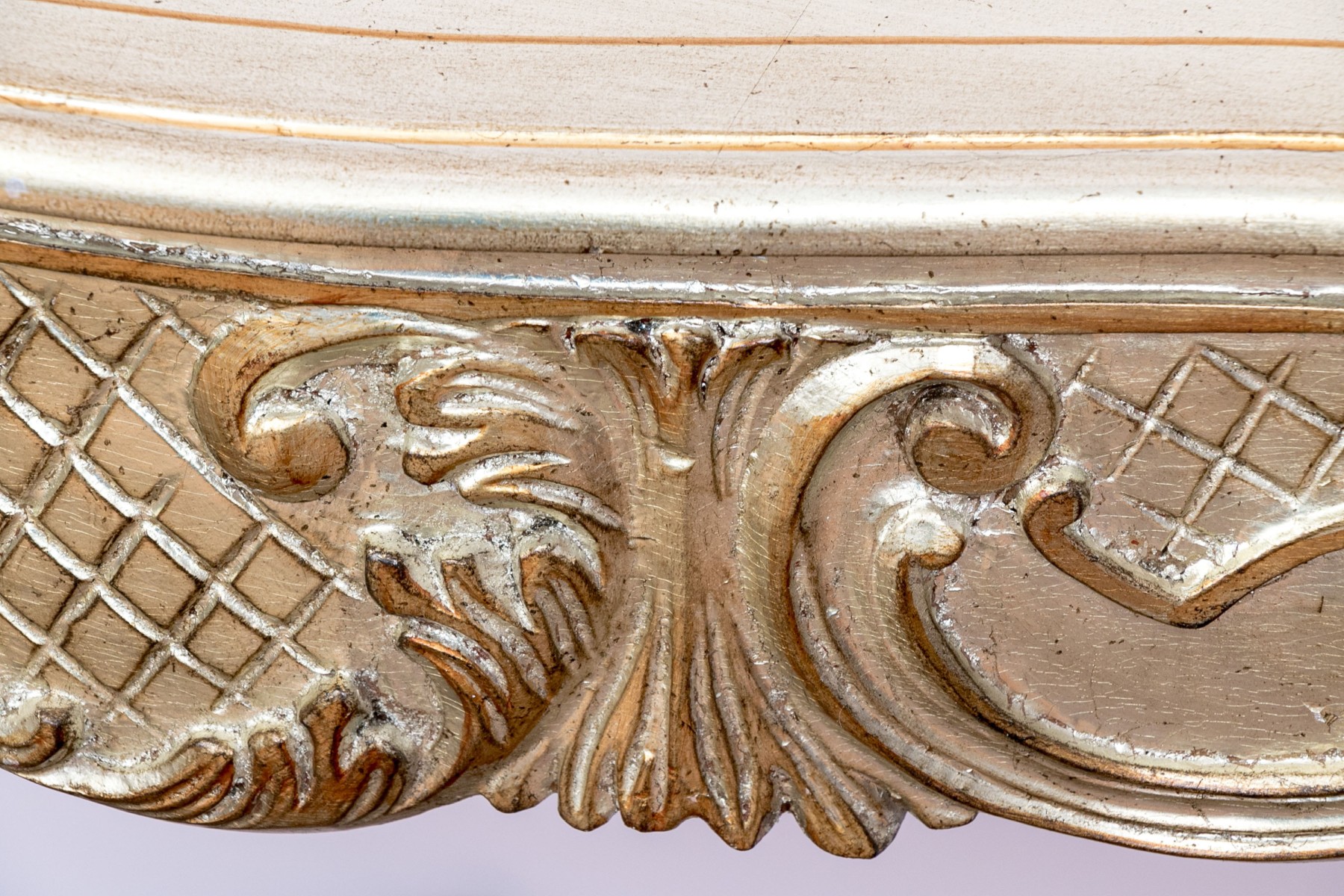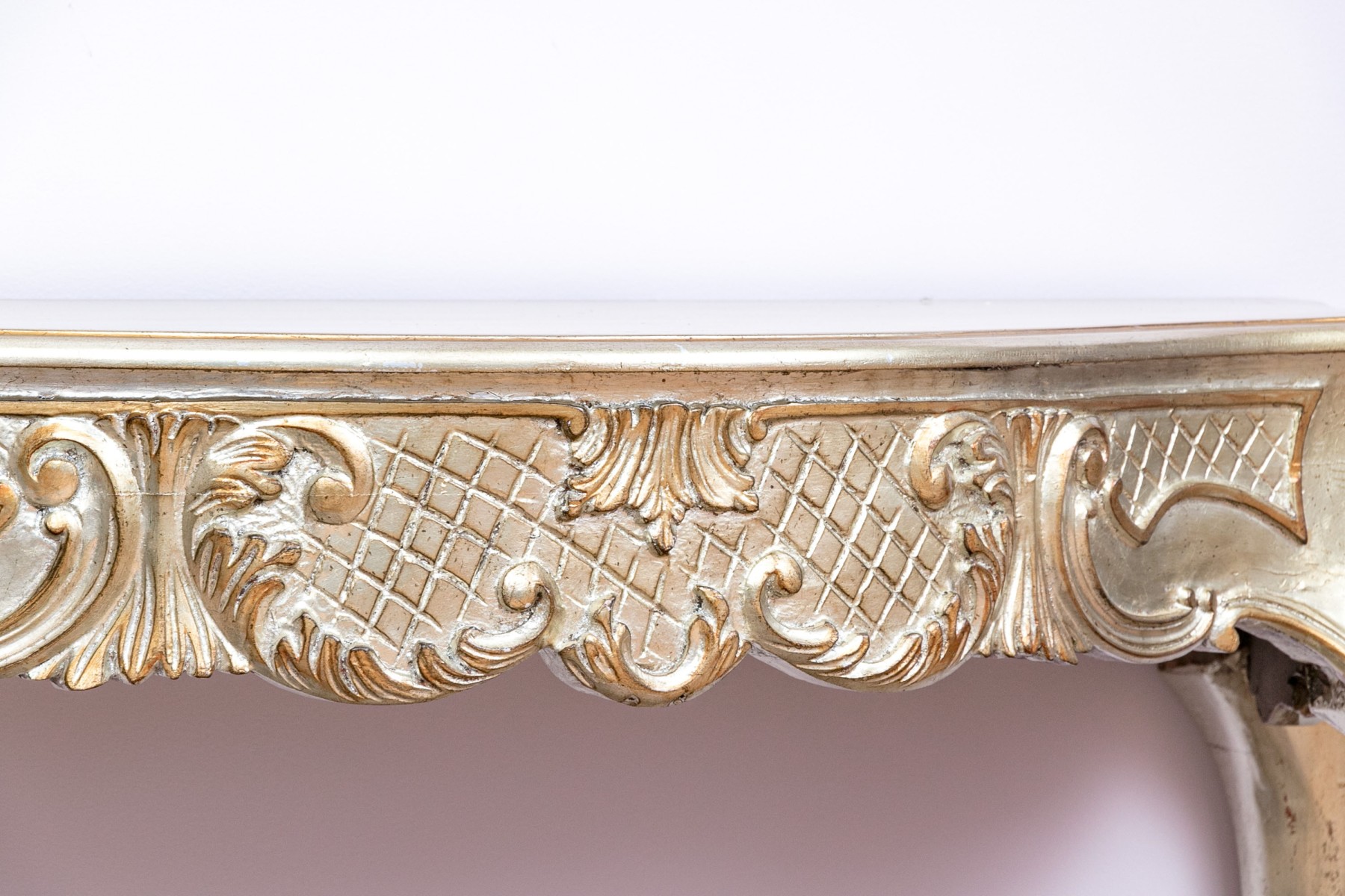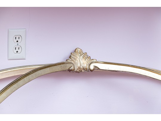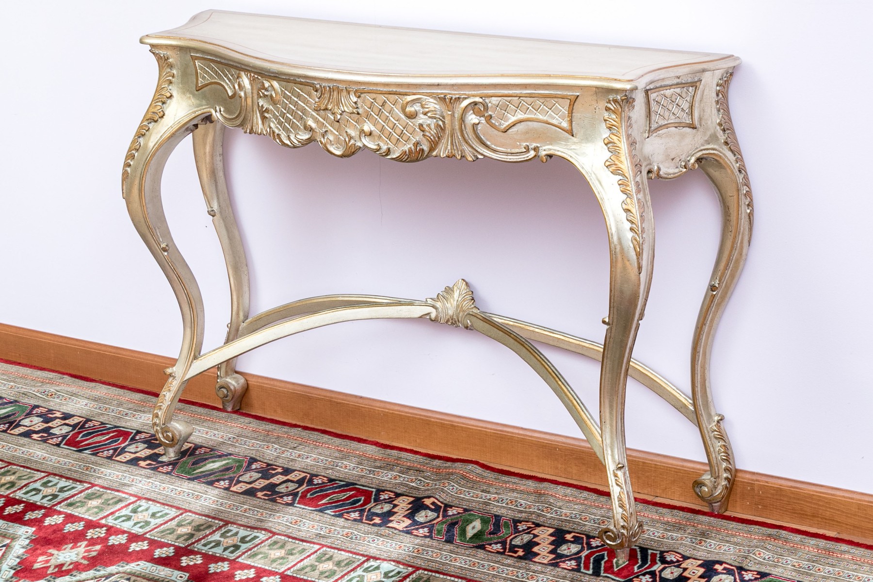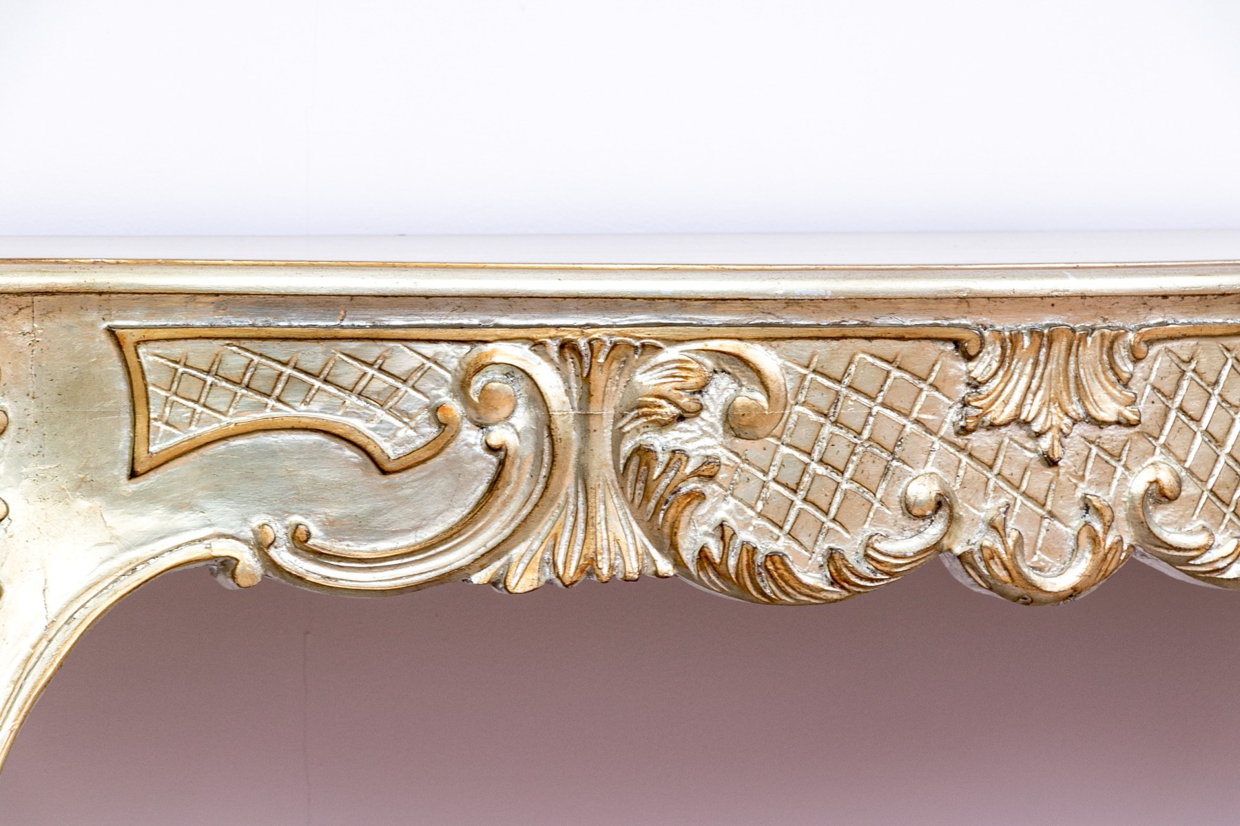 A shiny gilt painted console that is perfect for the entrance to any house. The piece raised on curved legs terminating on scrolled feet on a curved "x" stretcher with crosshatched marks and acanthus leaf decorations.