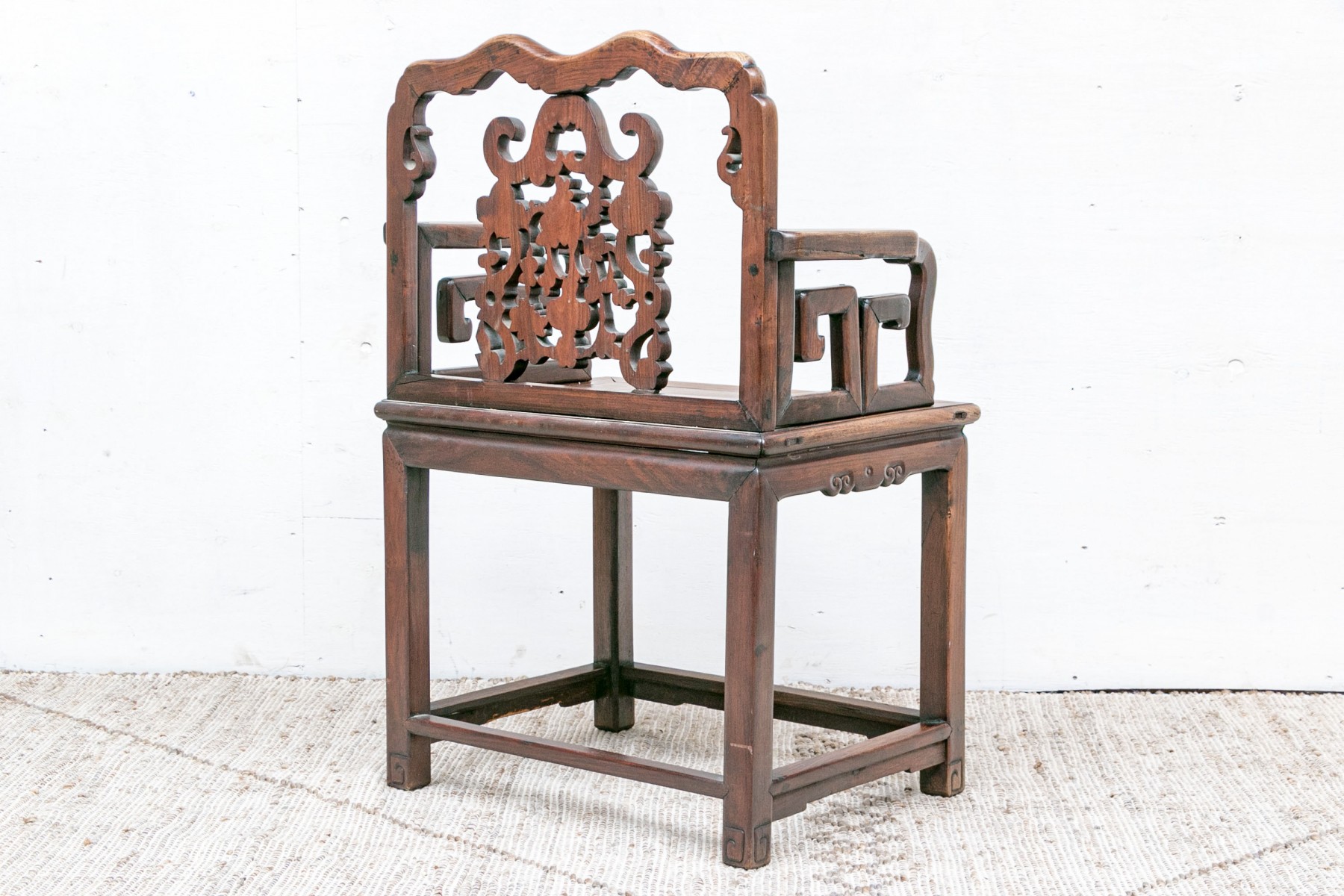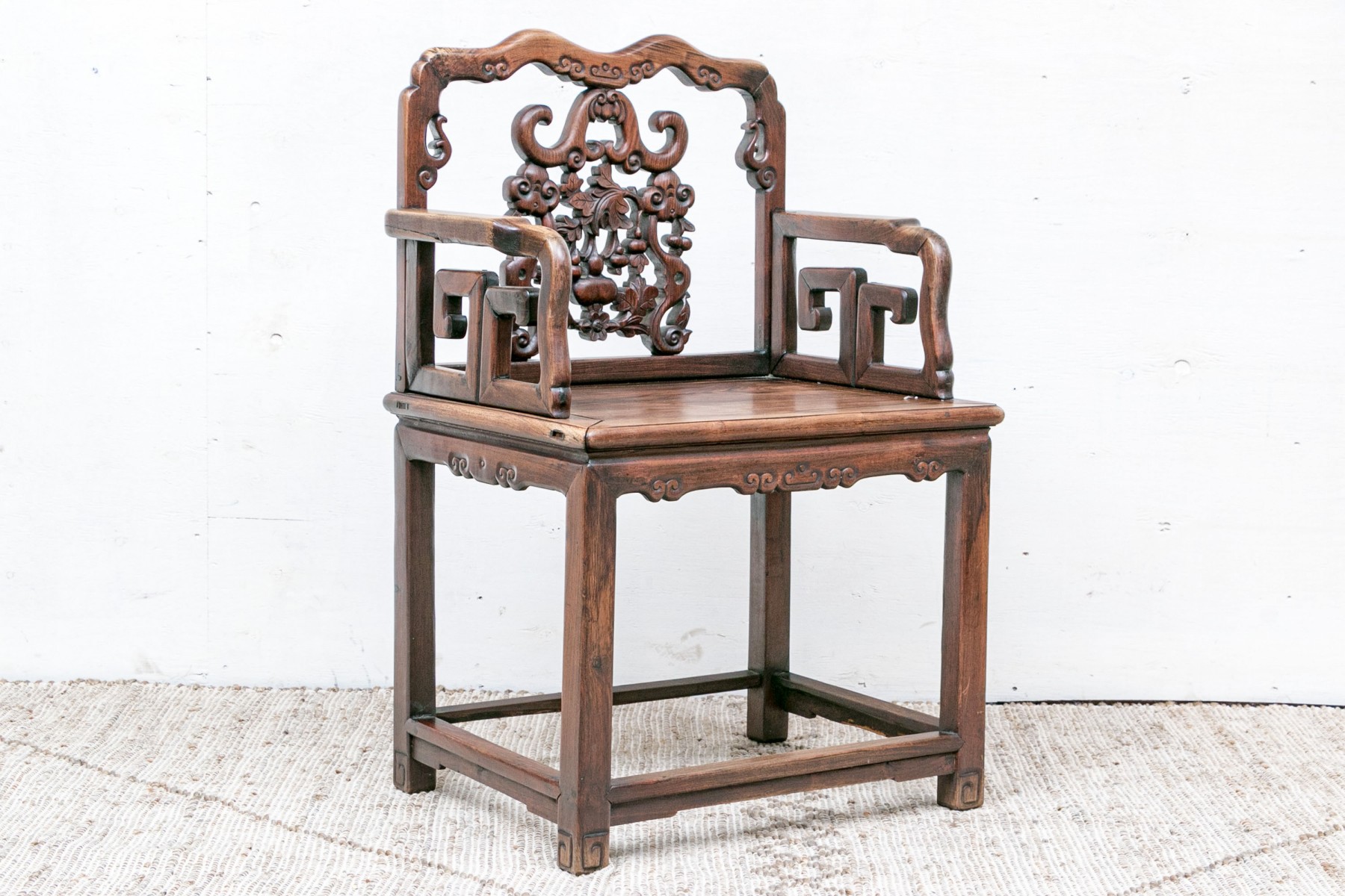 With a shaped crest rail and carved openwork splat with scrolls, buds and leaves. The arms with carved openwork angular supports, the seat with banding and carved decorated seat rail. Raised on square legs with stretchers and carved feet.