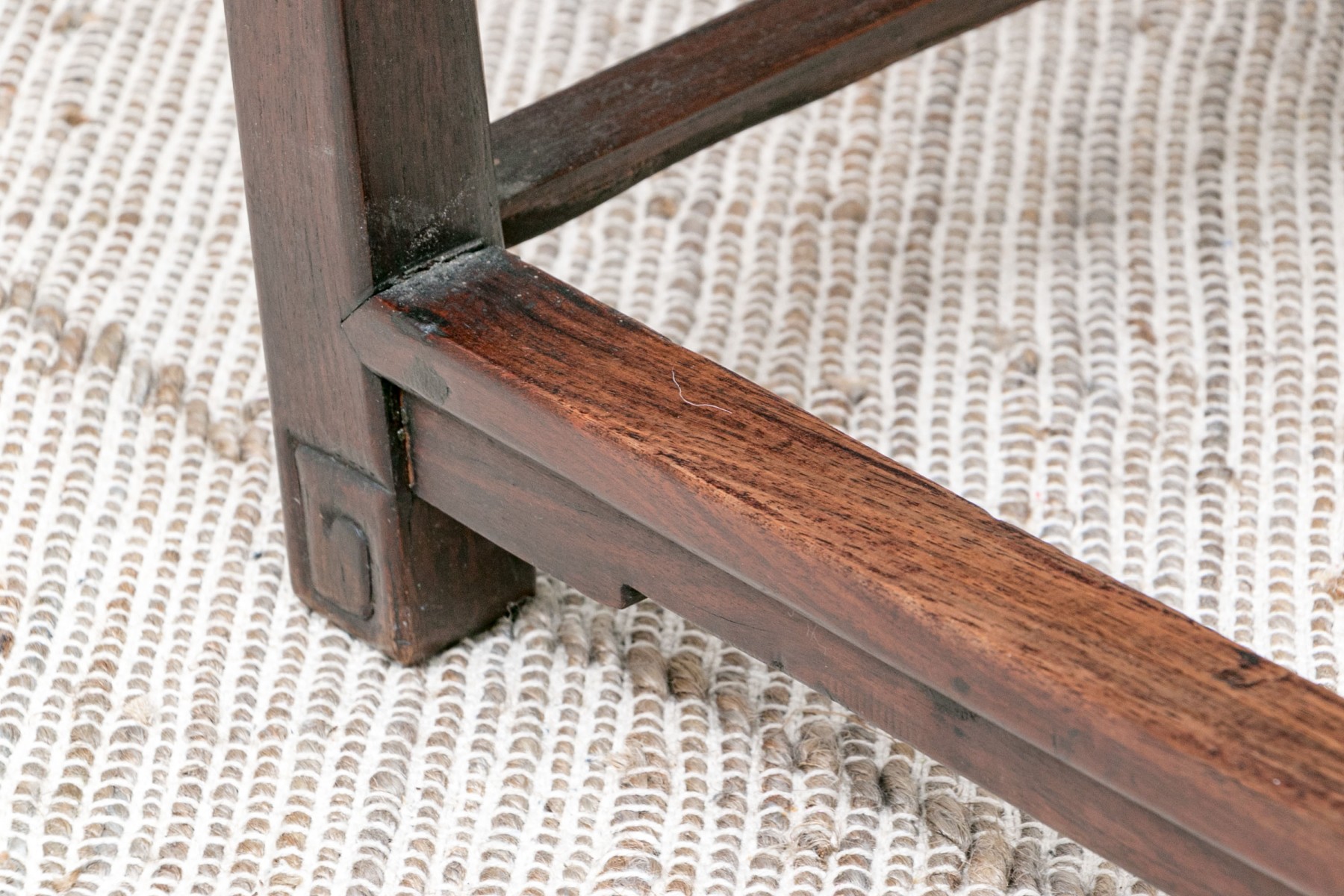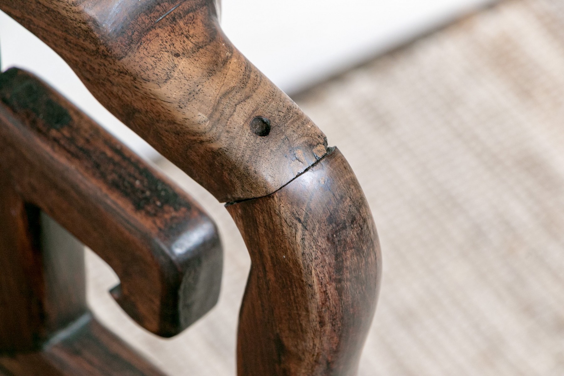 Condition: wear to the crest rail and arms, chips to the left arm top end and with loose joinery, some expected wear to the seat with slight open joinery at the banding. Please review the photos as they are part of the condition report.