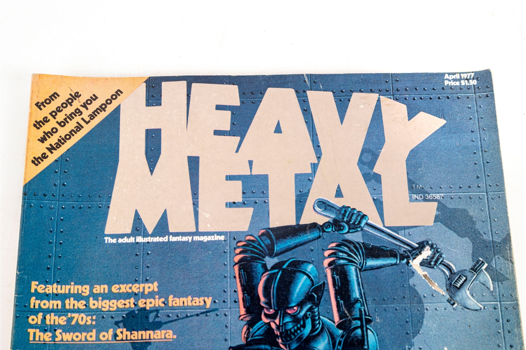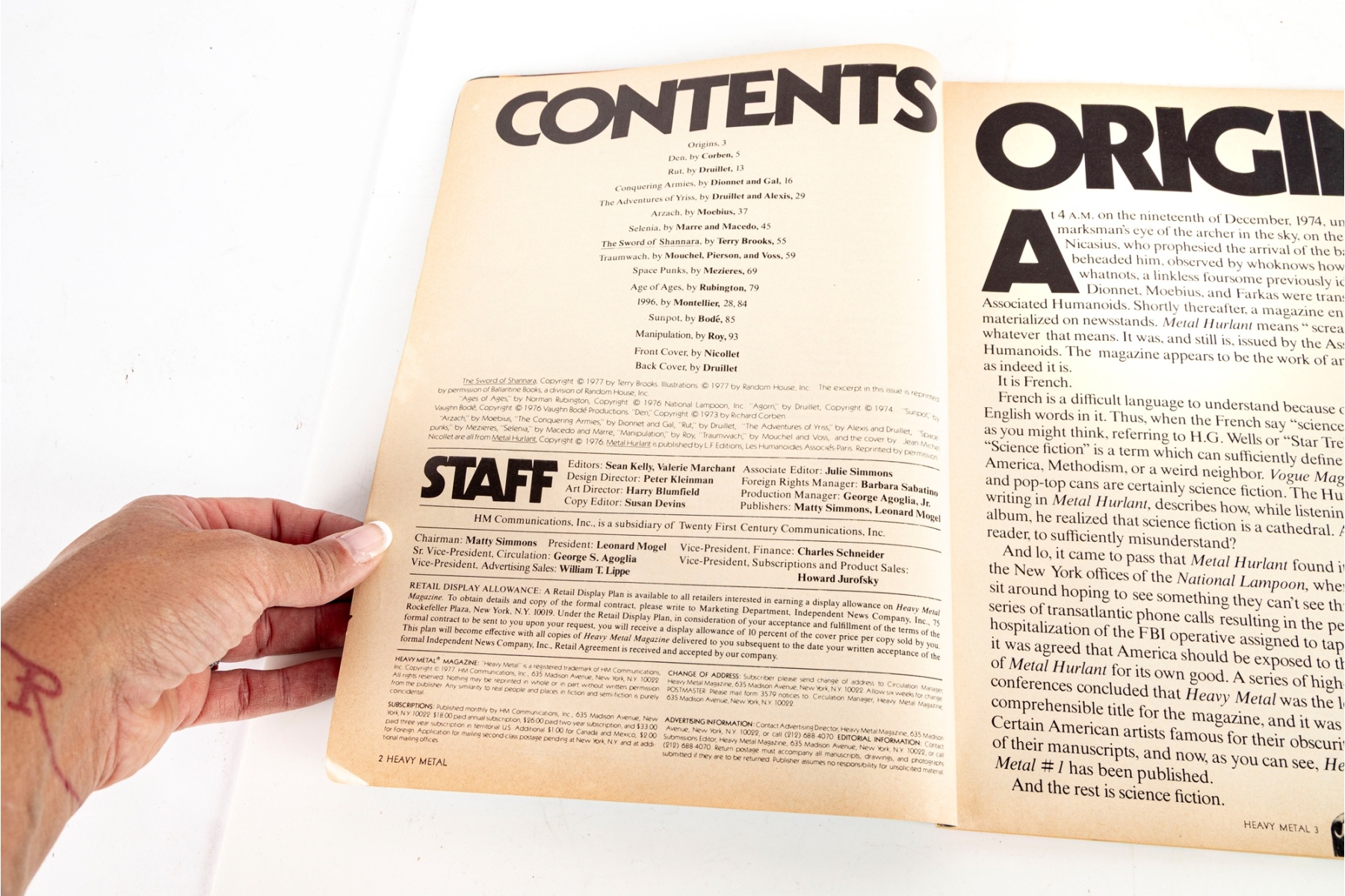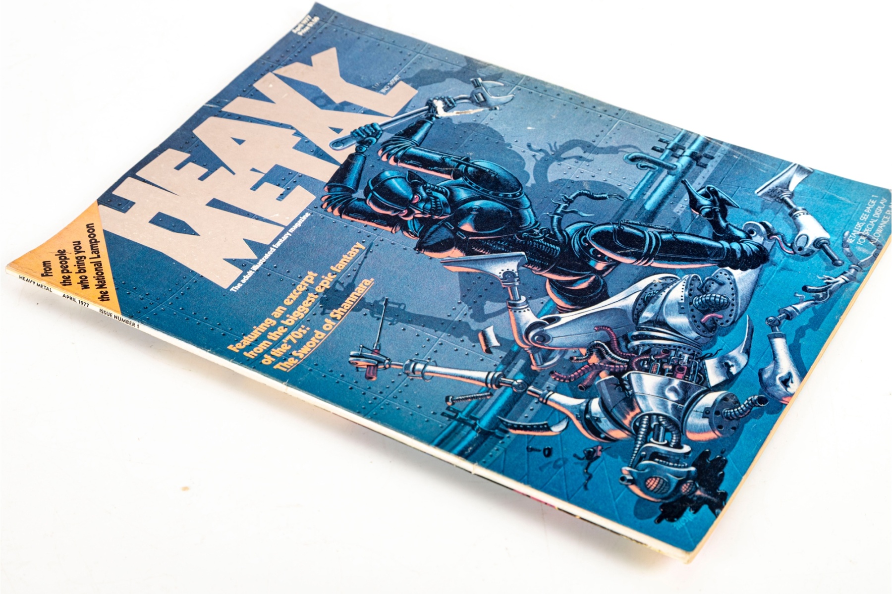 An original first issue of Heavy Metal magazine, April 1977, the debut publication of the legendary adult illustrated fantasy magazine adapted from the French Métal Hurlant. Published by National Lampoon’s HM Communications, this inaugural issue introduced American audiences to groundbreaking European artists and writers such as Moebius, Druillet, and Philippe Caza, establishing Heavy Metal as a cornerstone of sci-fi and fantasy illustration.