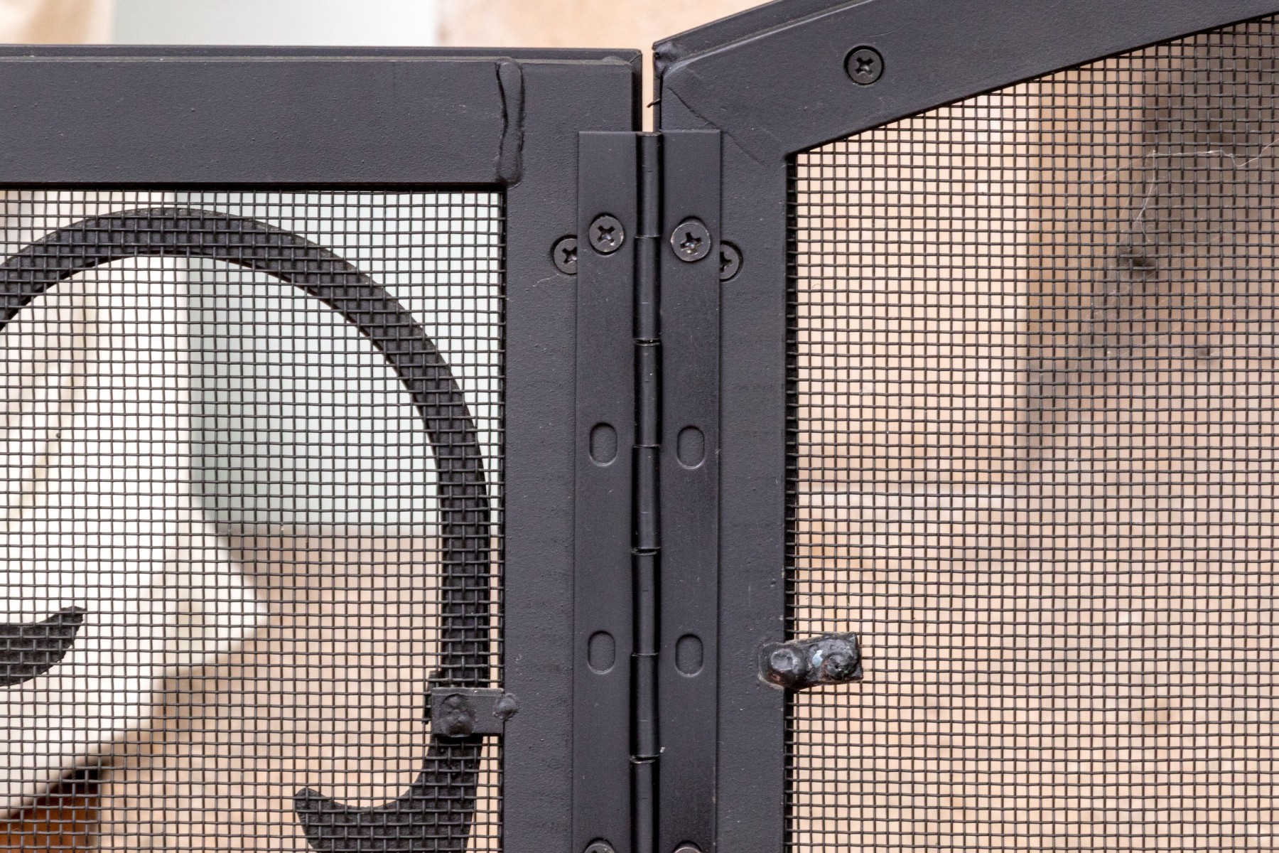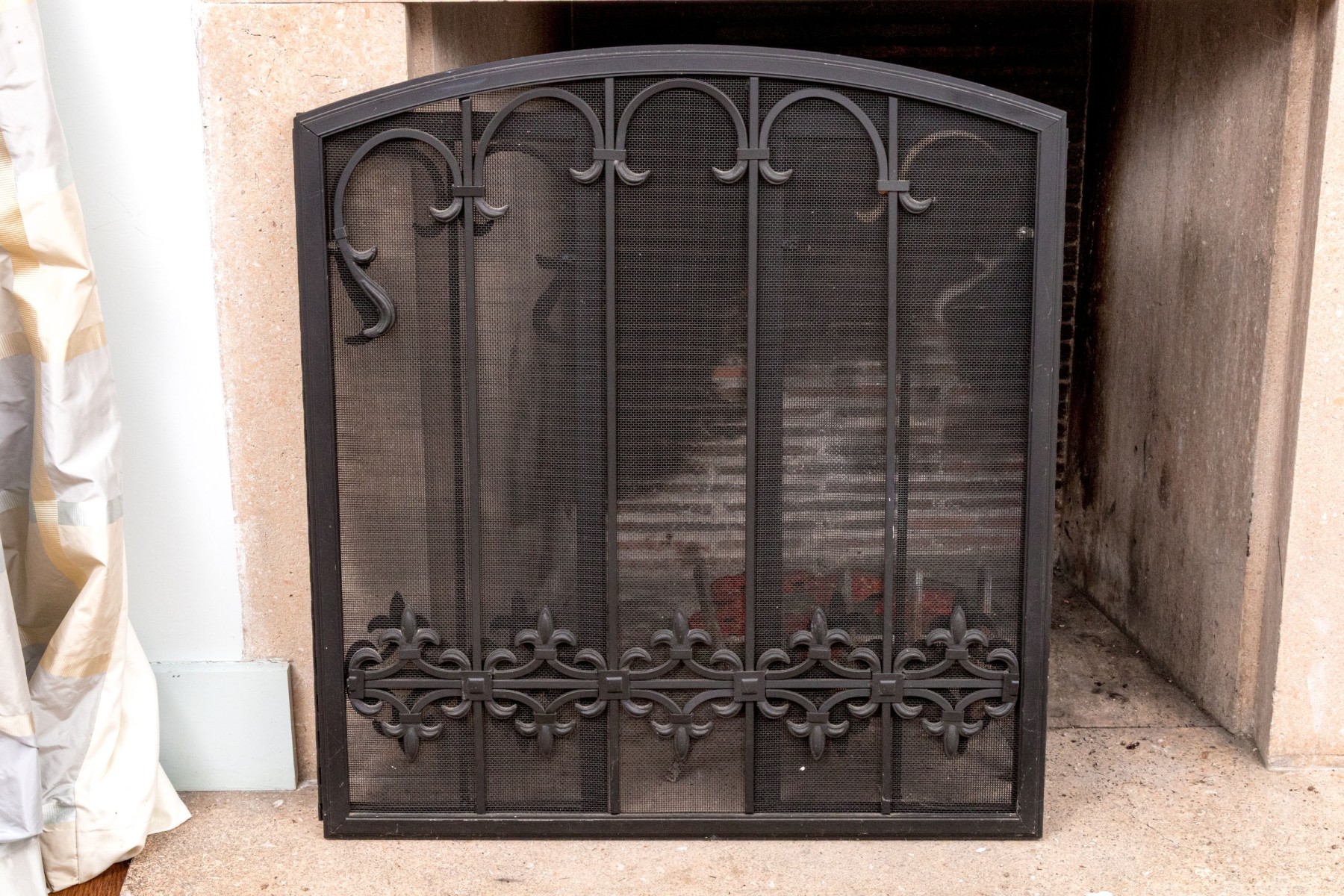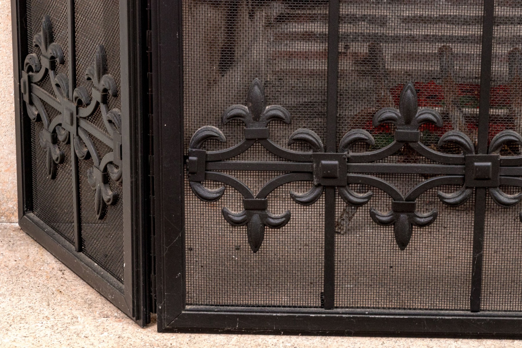 A high quality fireplace screen in sleek black iron with an arched center panel and two straight side panels decorated with elegant curved brackets along straight columns at the top, and ornate fleur-de-lis motifs along the bottom. The screen is heavy duty, likely 20-30 lbs.