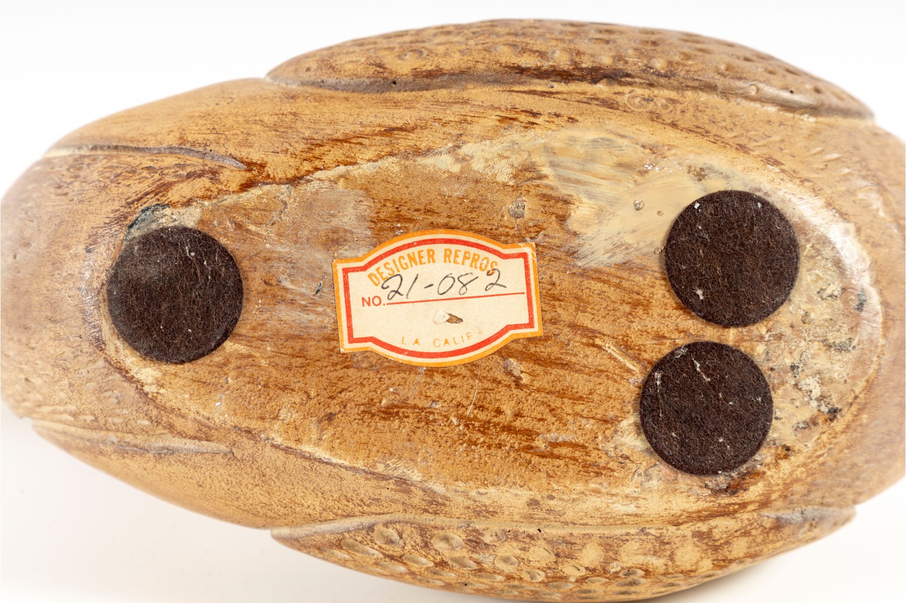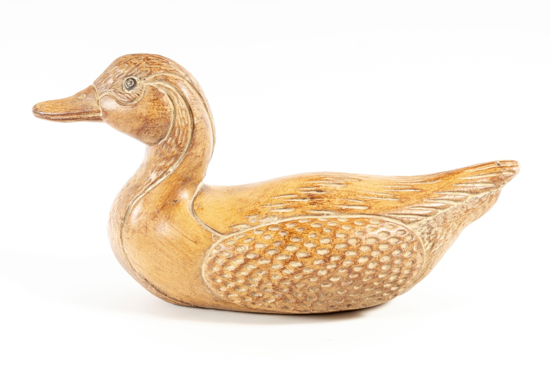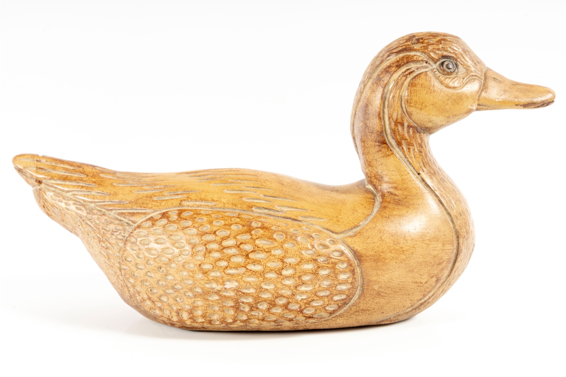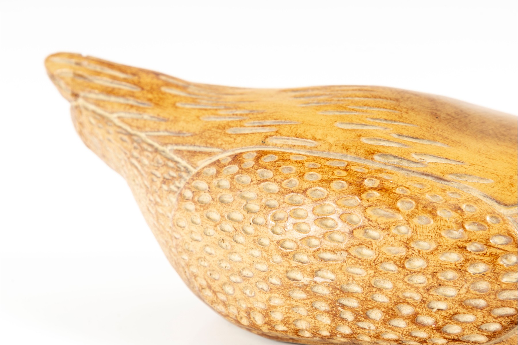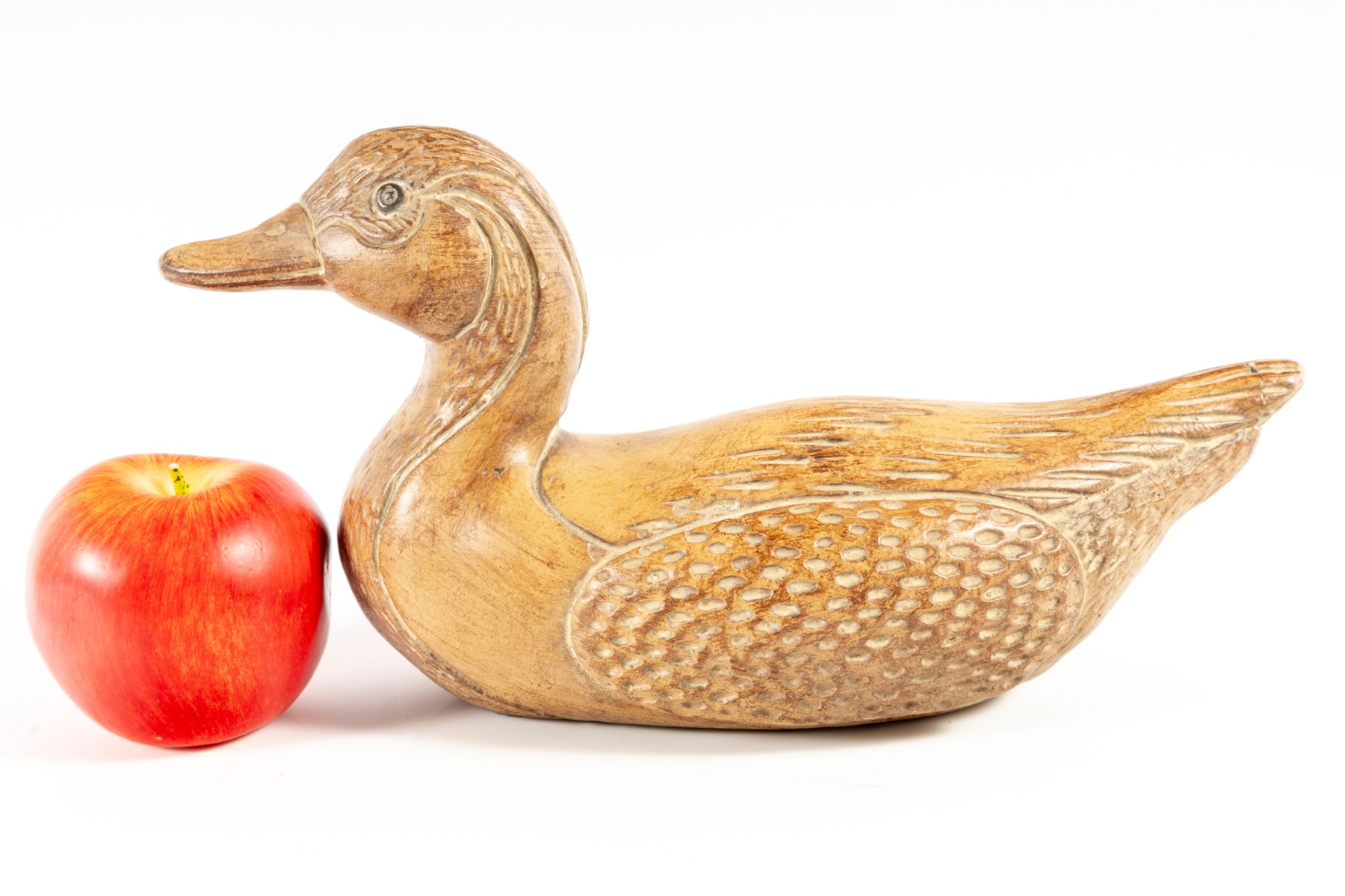 An 11.5" hand-carved wooden duck decoy heavily incised with feathered patterns and facial details.