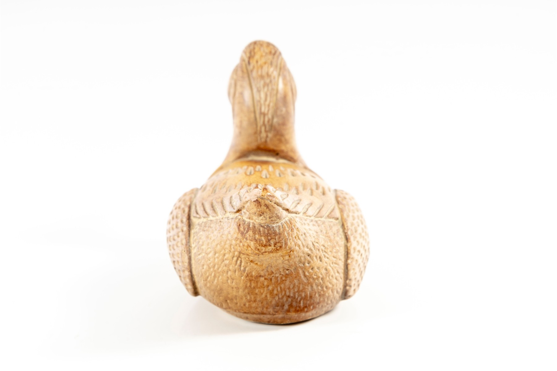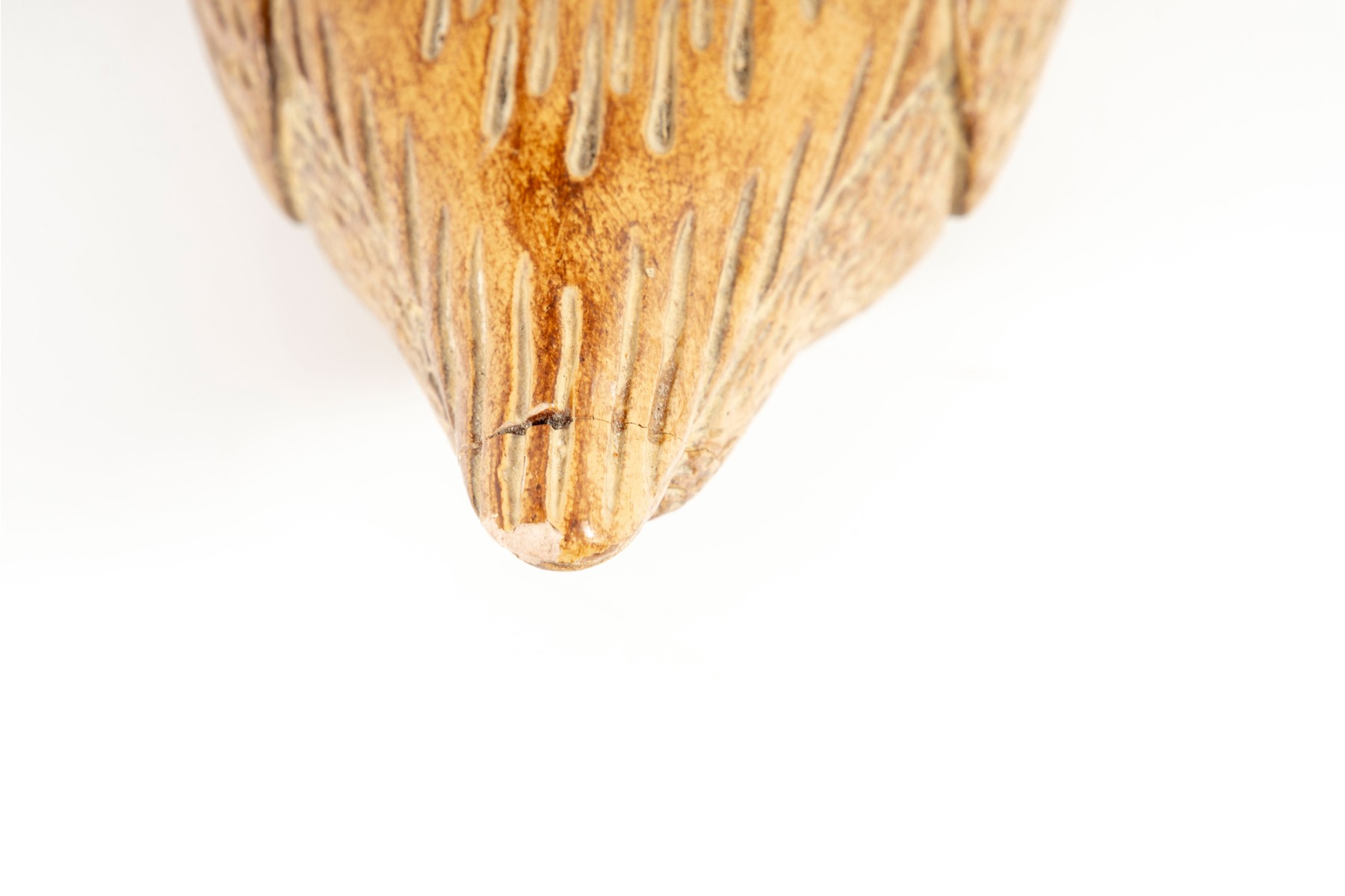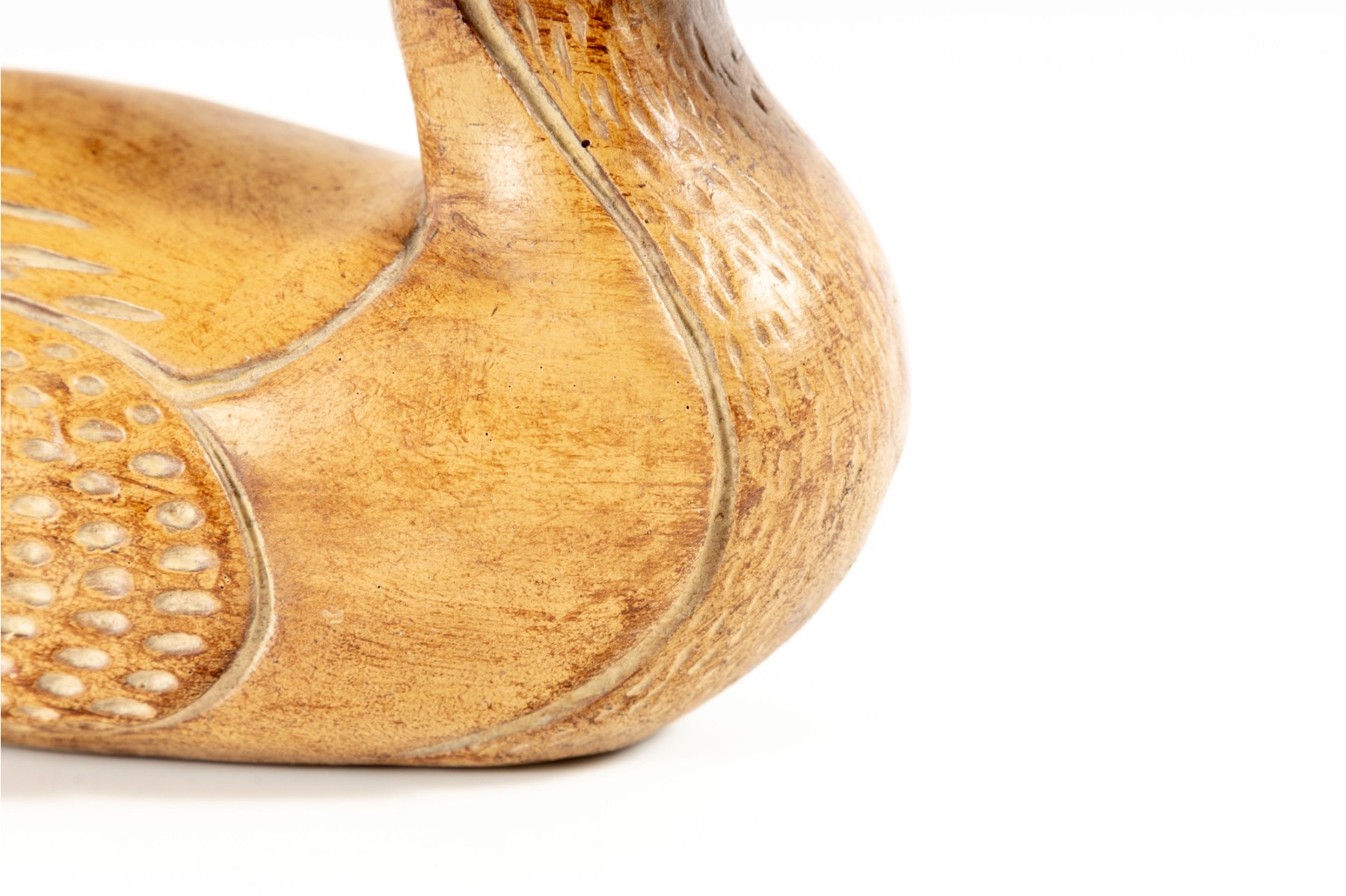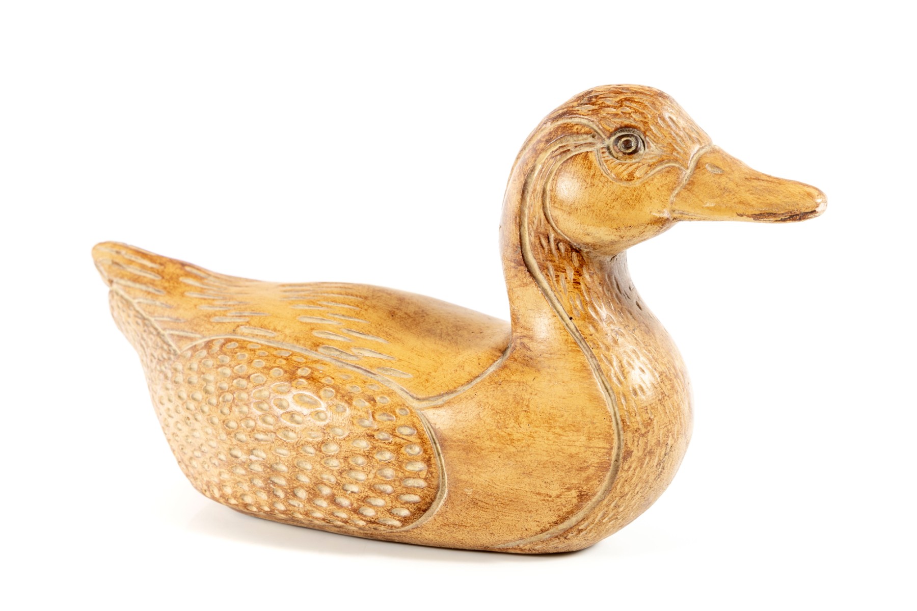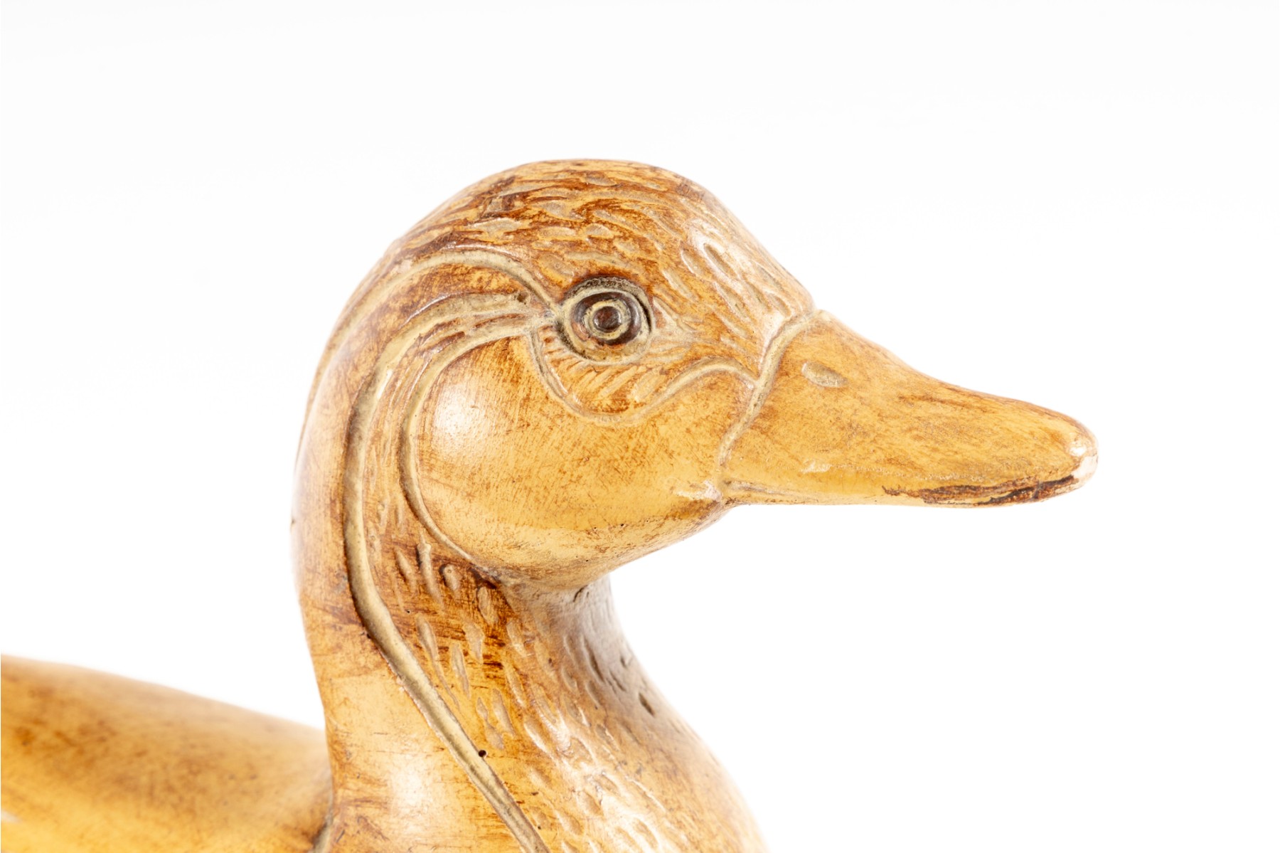 An 11.5" hand-carved wooden duck decoy heavily incised with feathered patterns and facial details.