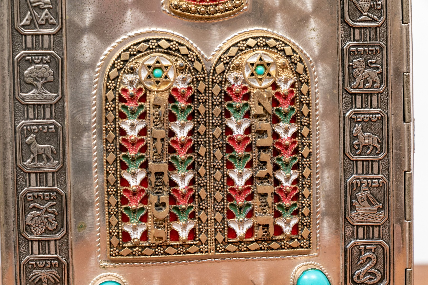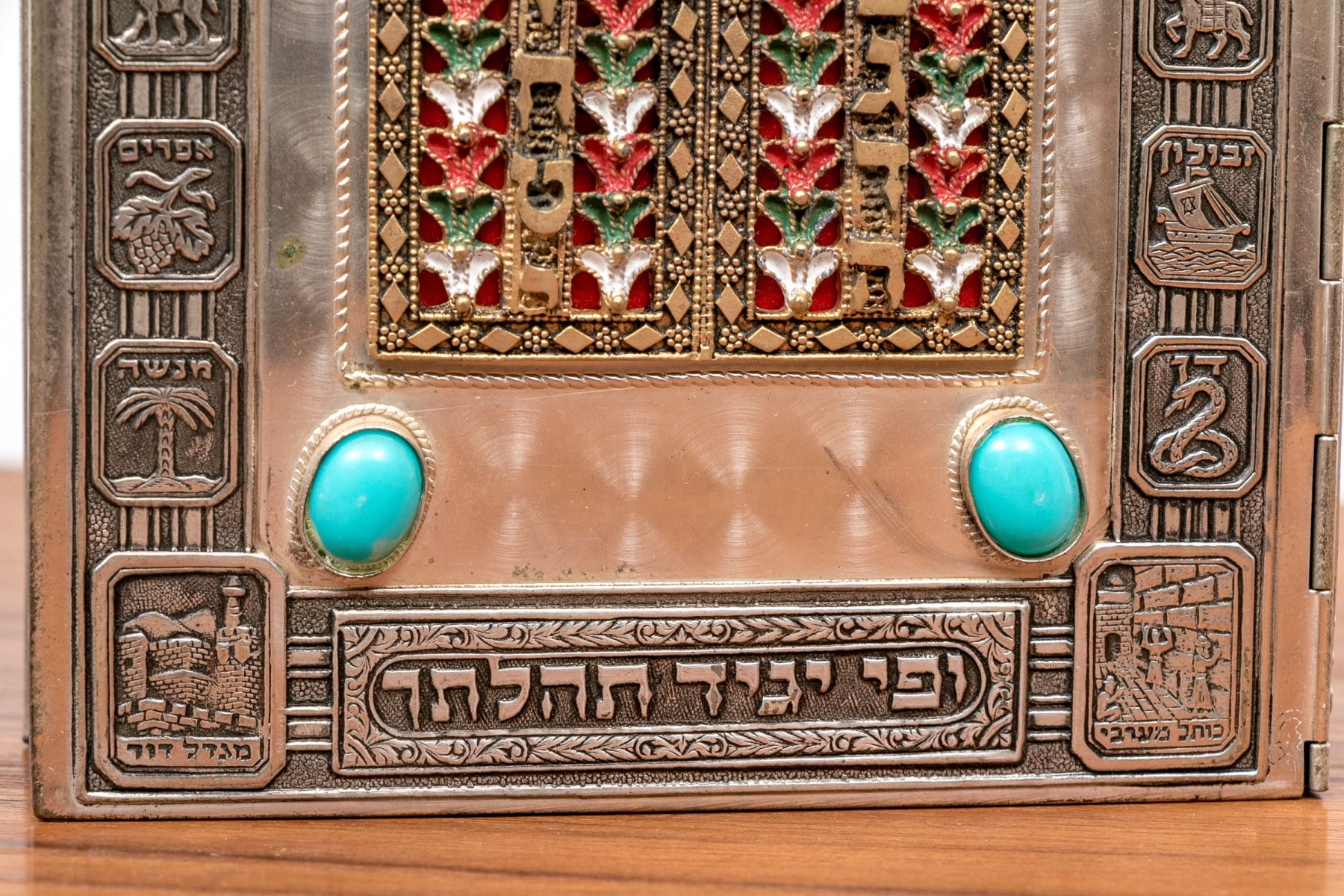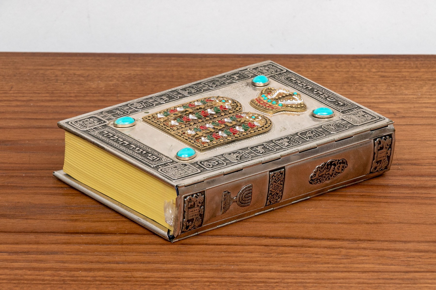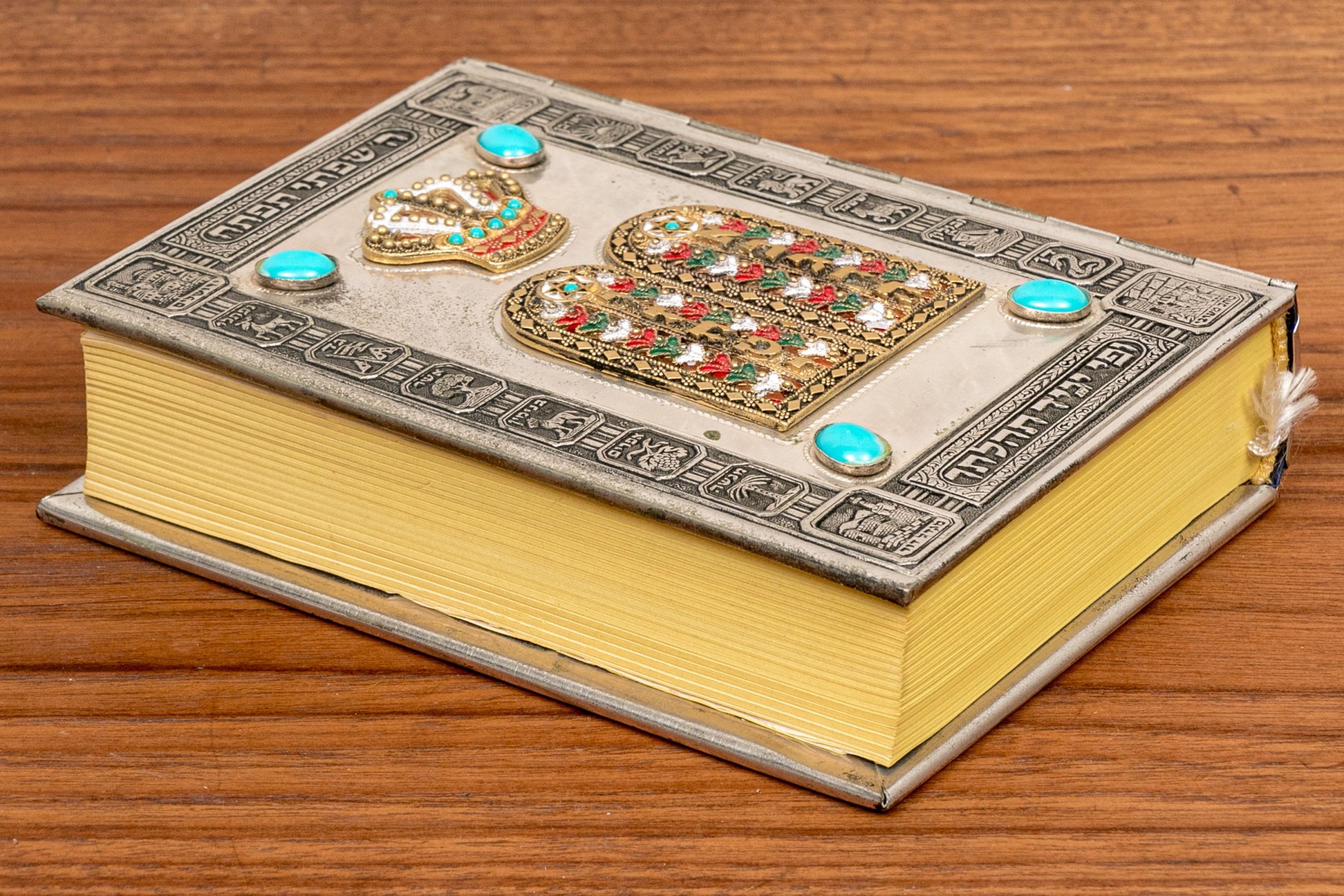 Printed in Israel. The cover with raised inscriptions and a variety of religious motifs- a menorah on one cover and the spine, and an elaborately decorated cover with the tablets with colorful floral details surmounted by a colorful crown. Faux turquoise stones in the corners.