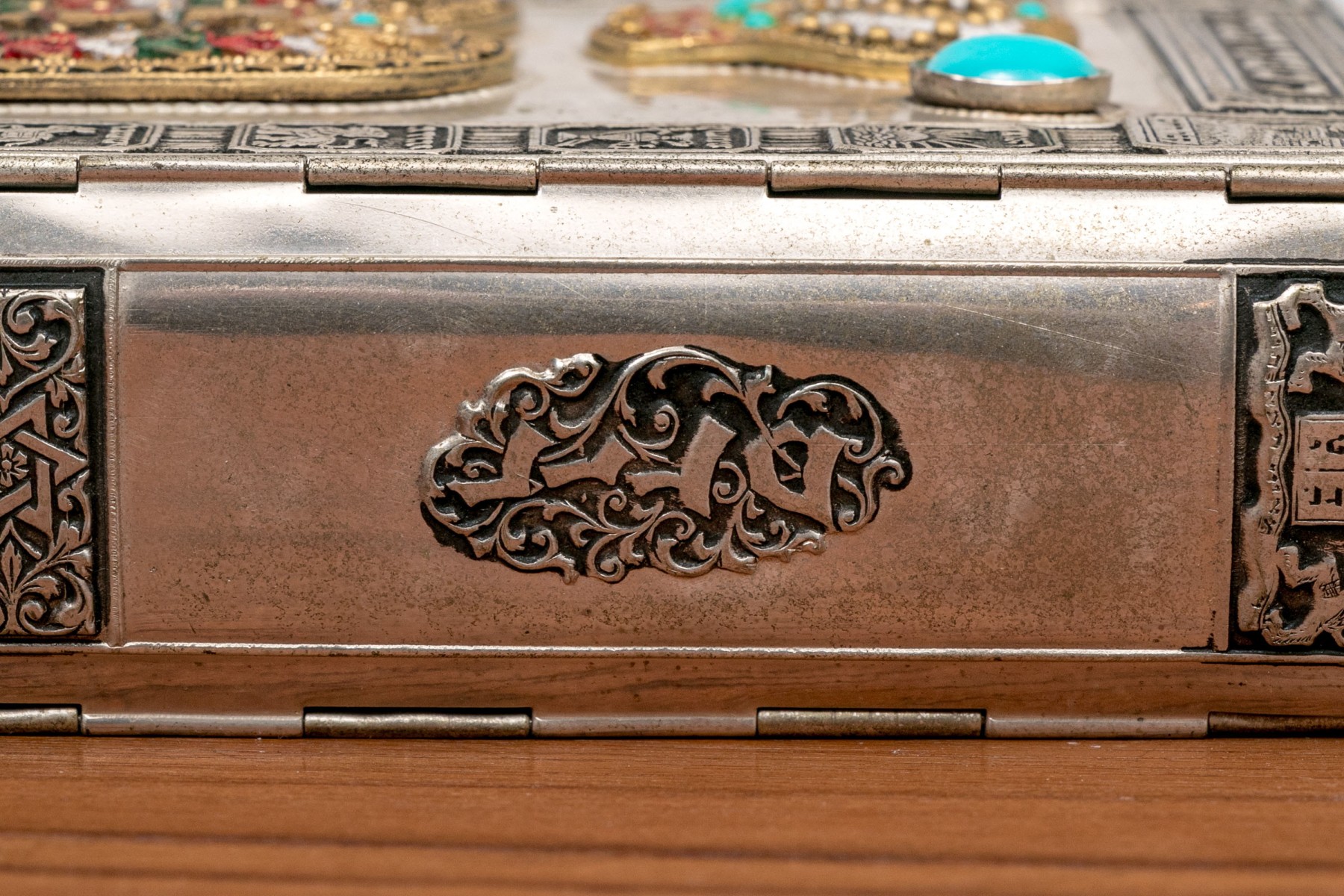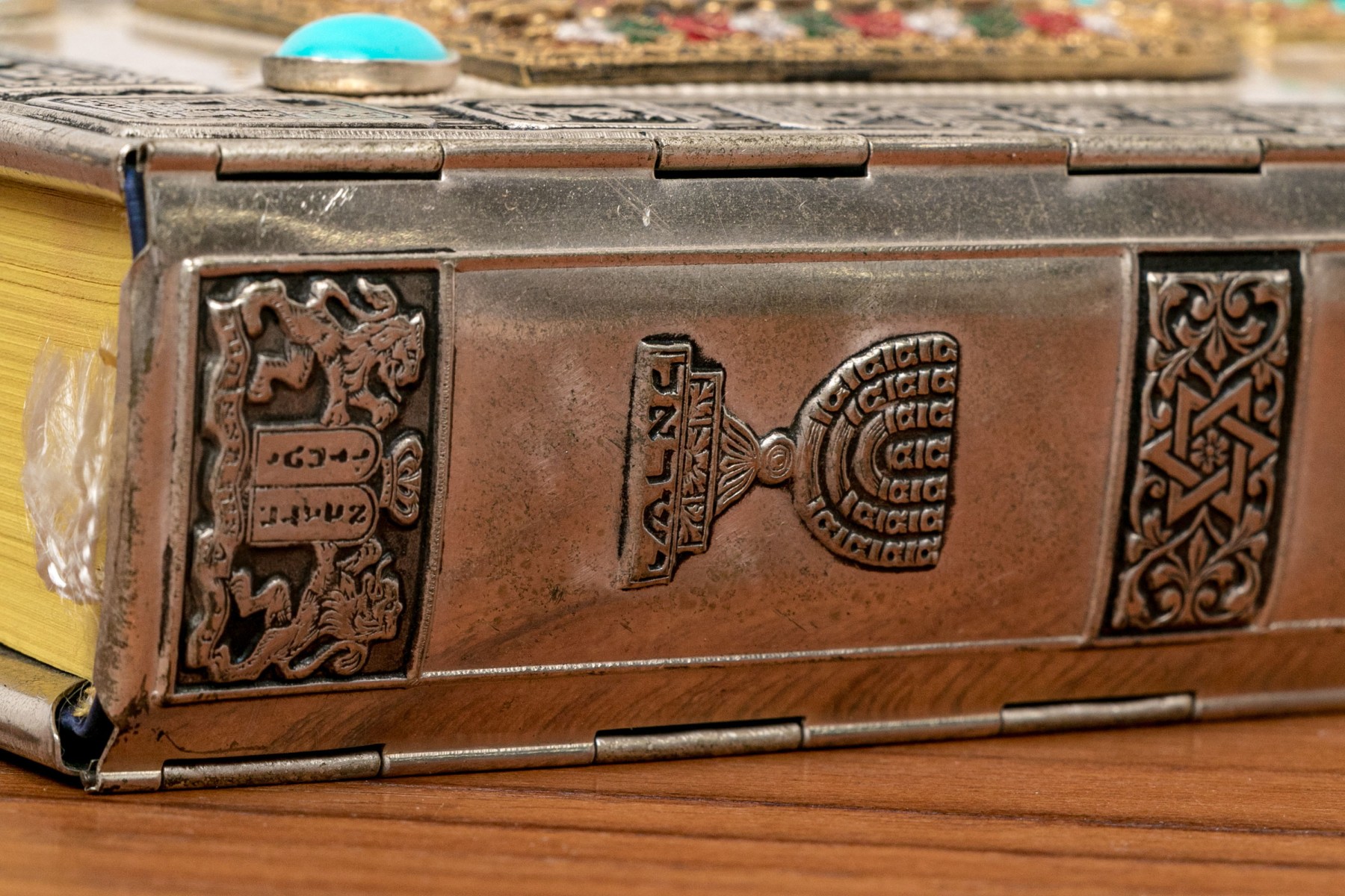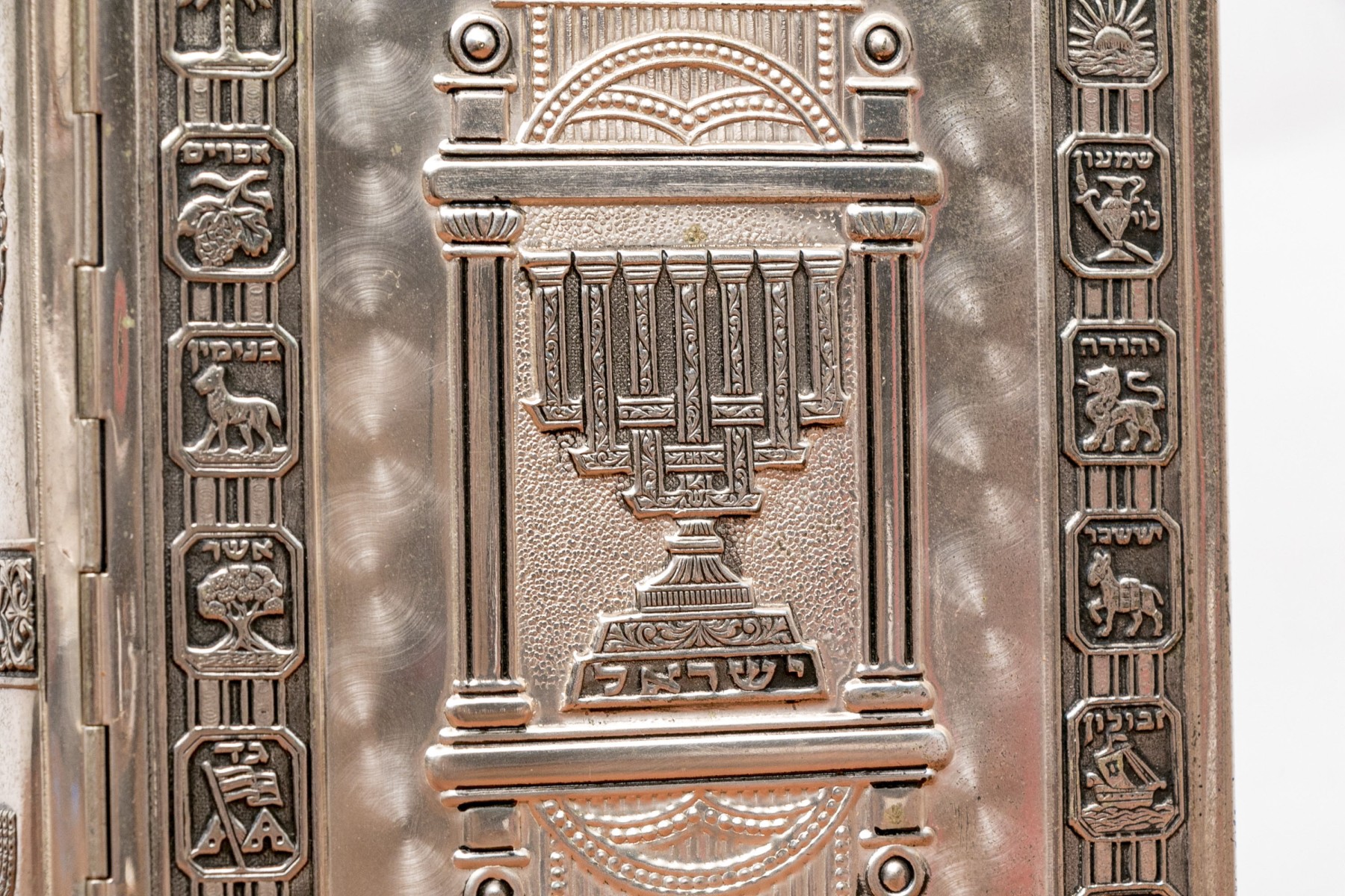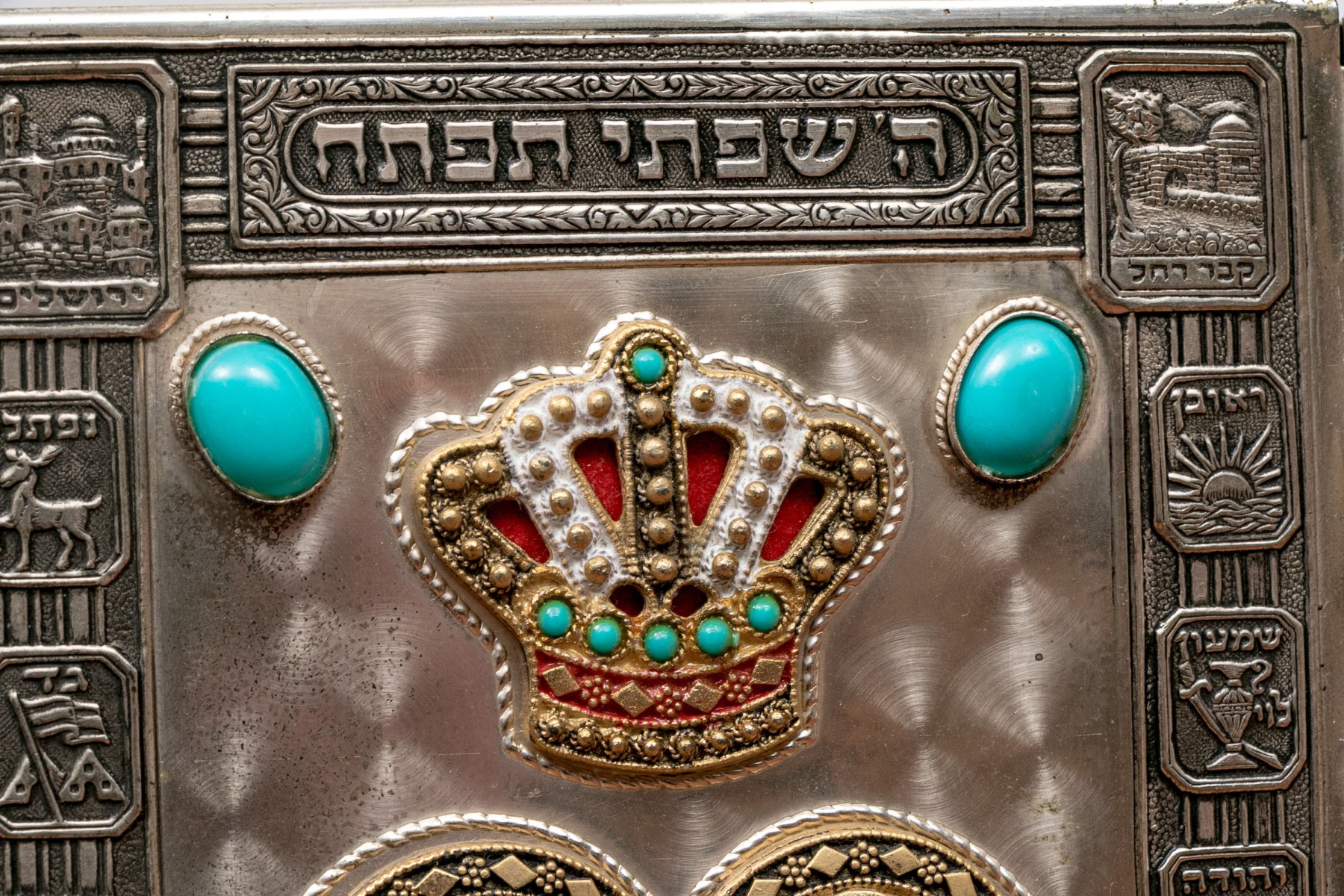 Printed in Israel. The cover with raised inscriptions and a variety of religious motifs- a menorah on one cover and the spine, and an elaborately decorated cover with the tablets with colorful floral details surmounted by a colorful crown. Faux turquoise stones in the corners.