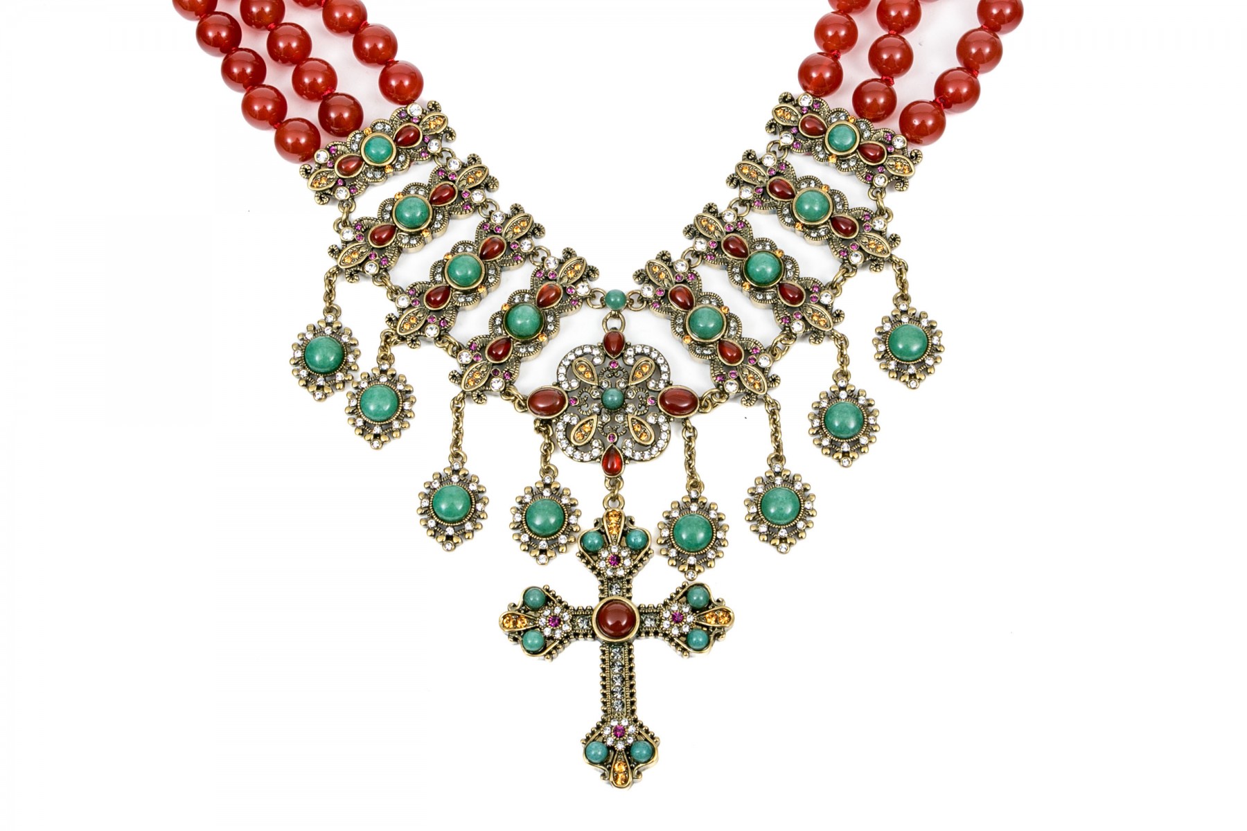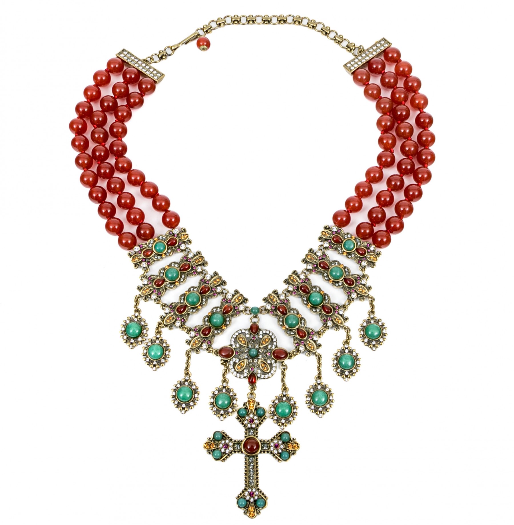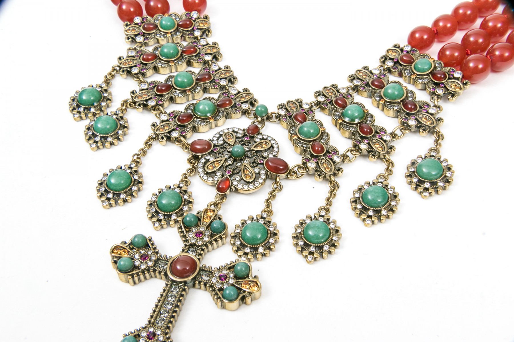 This ornate necklace displays beads of red agate leading to elegant settings with agate and aventurine. Suspended from the center is a cross pendant set with matching stones. Adjustable hook style clasp.