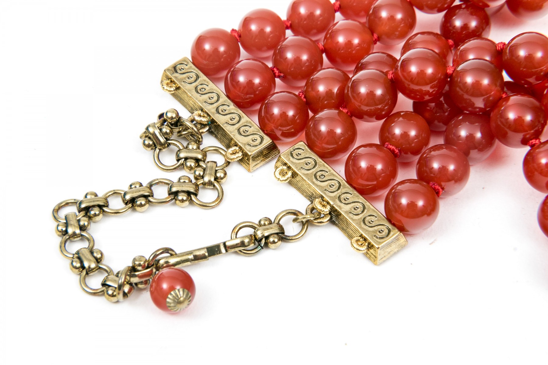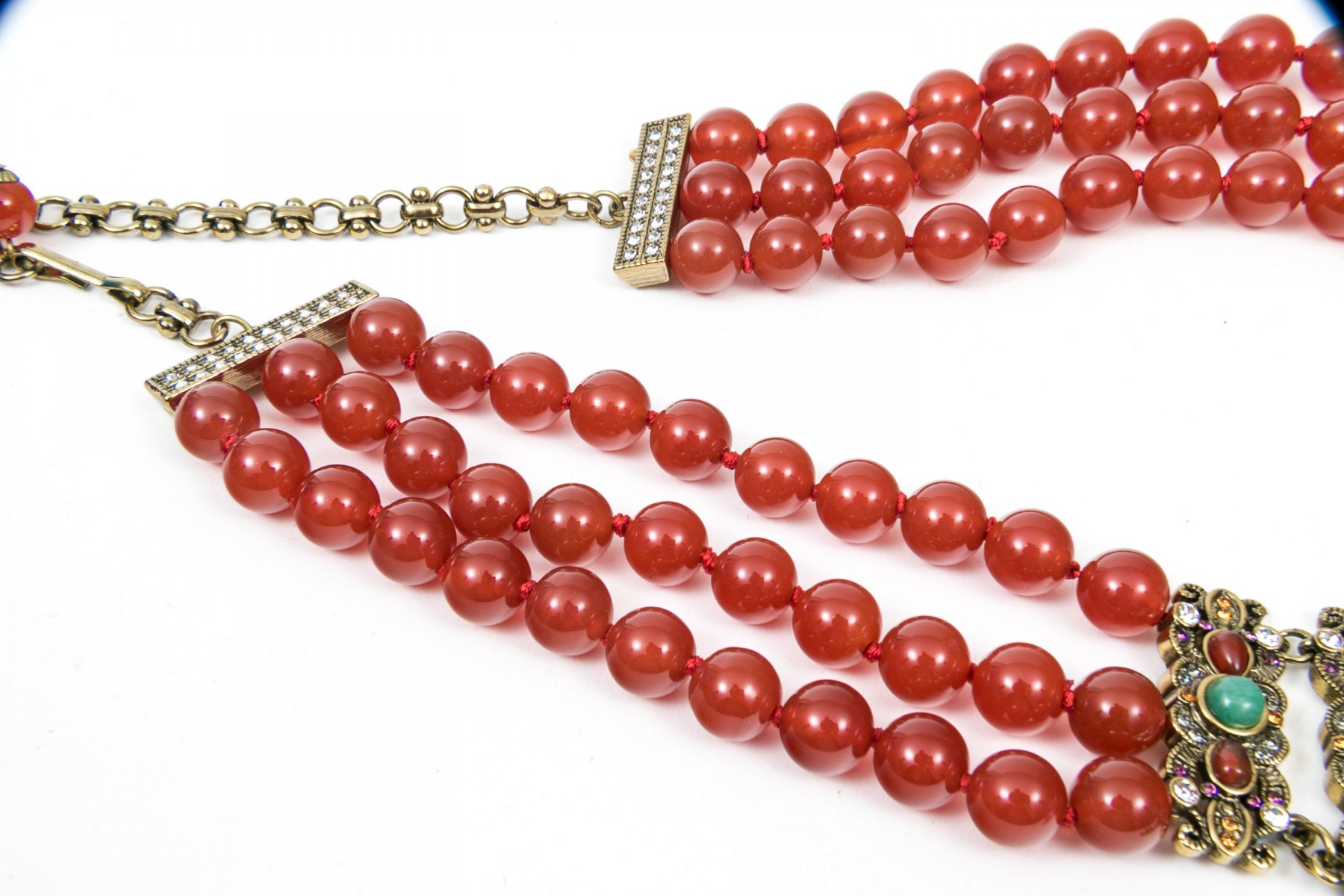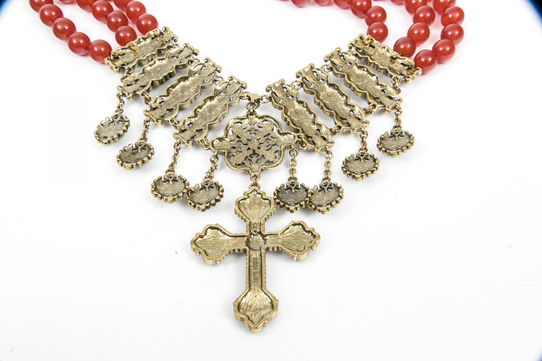 This ornate necklace displays beads of red agate leading to elegant settings with agate and aventurine. Suspended from the center is a cross pendant set with matching stones. Adjustable hook style clasp.