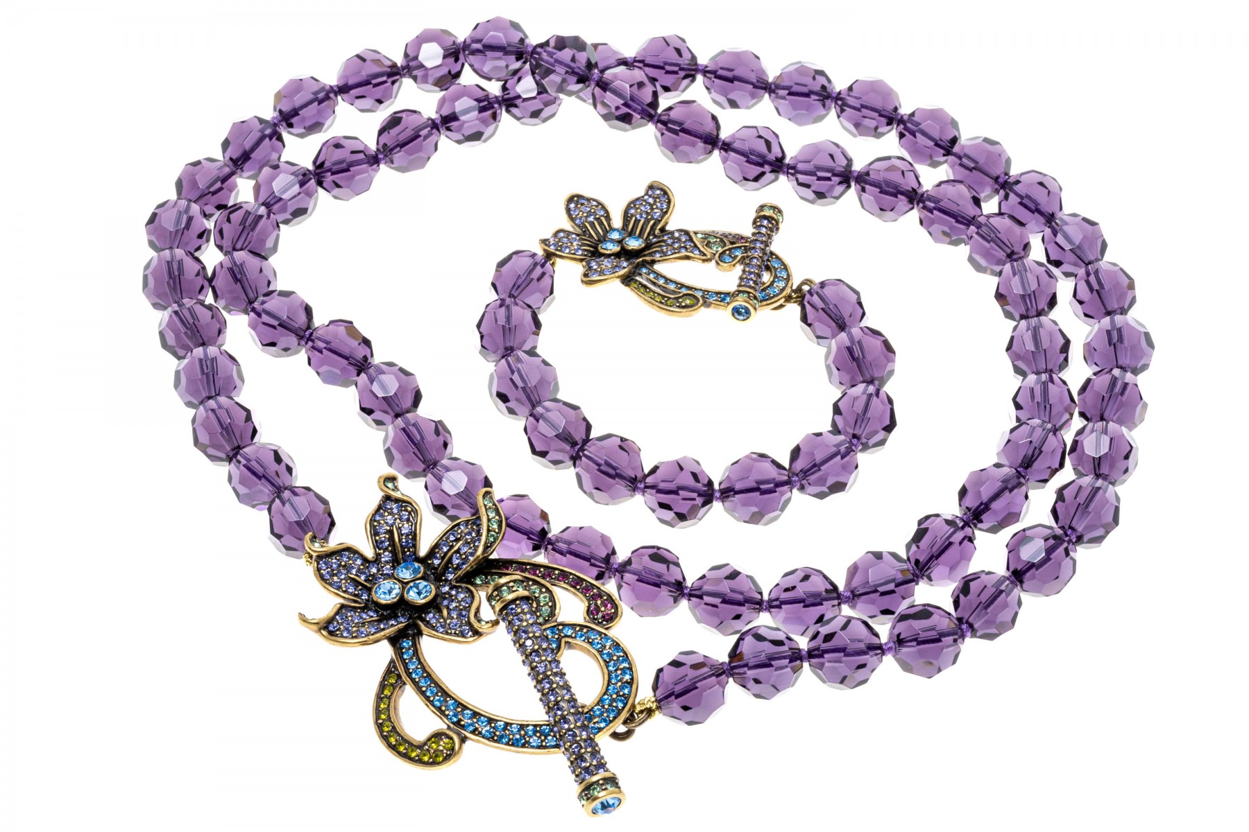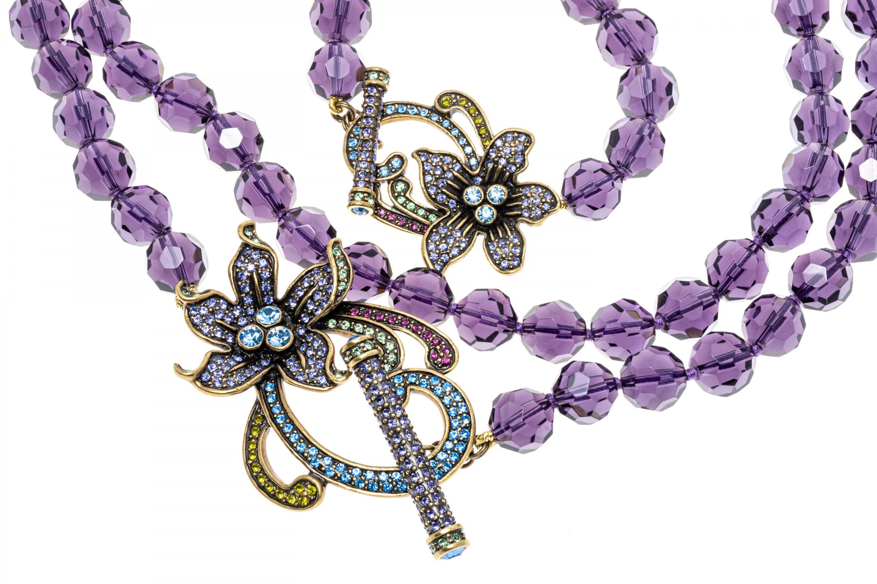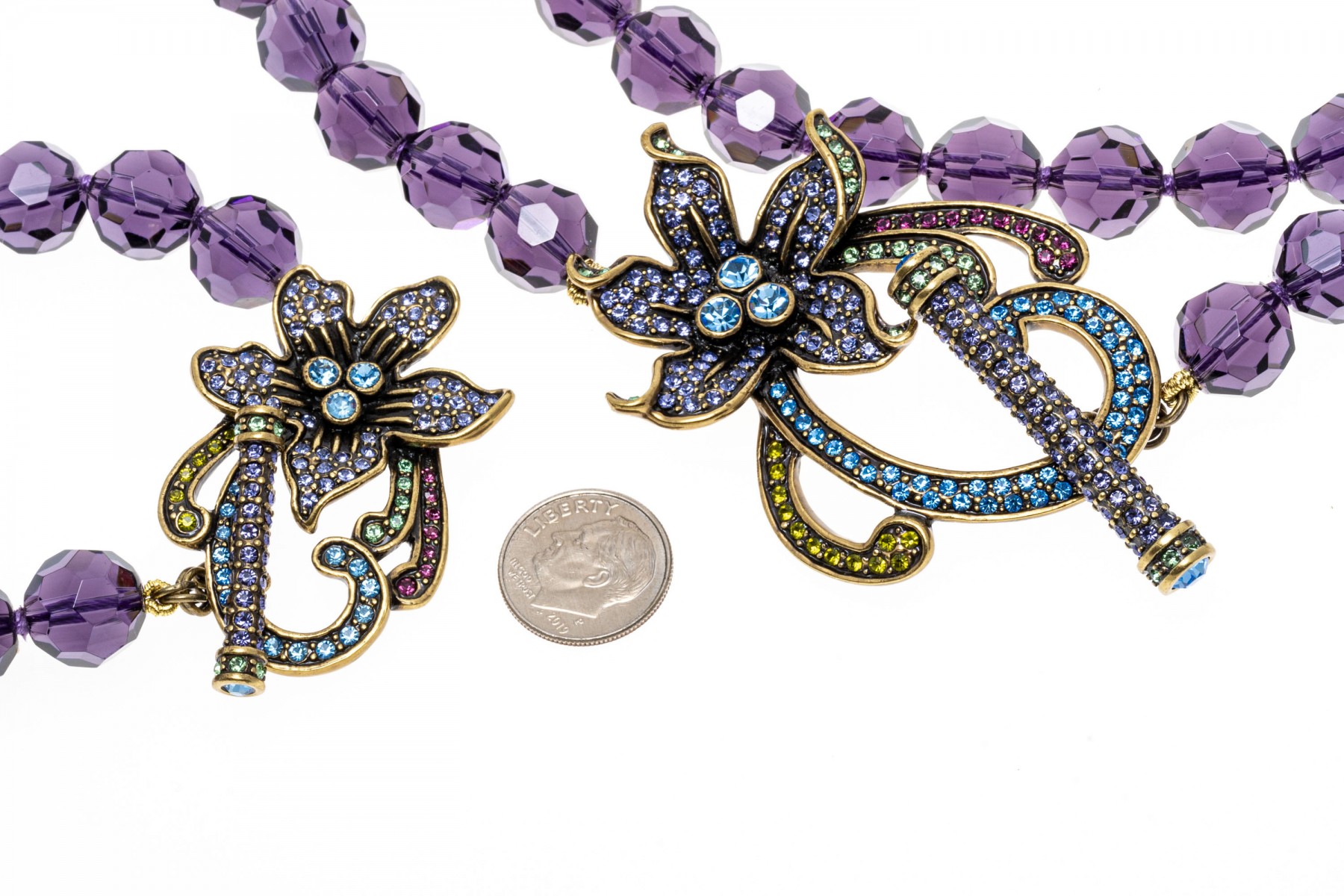 This stunning necklace displays beads of purple crystal, and floral clasps set with rhinestones