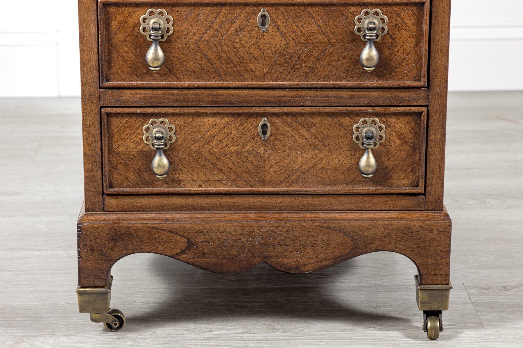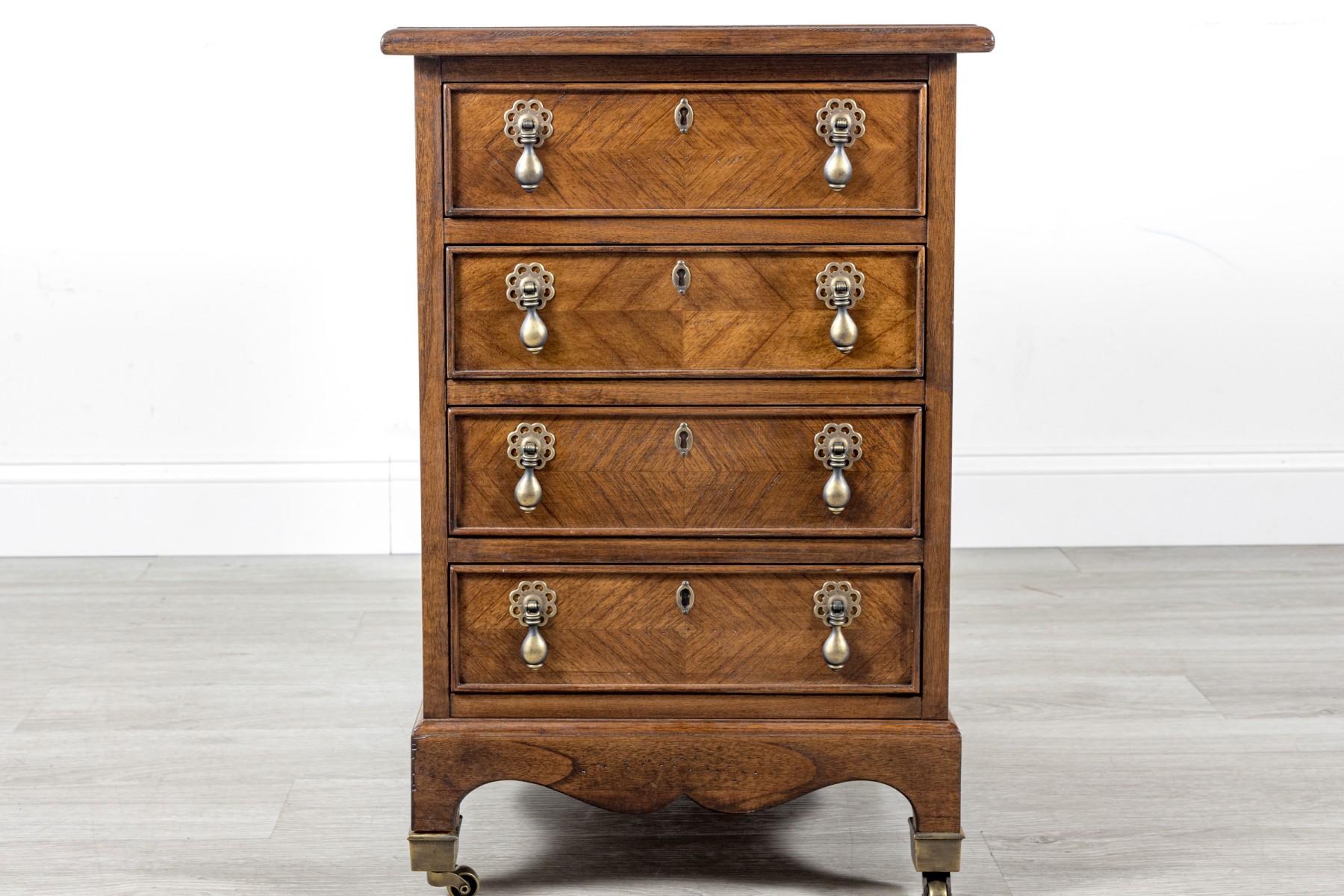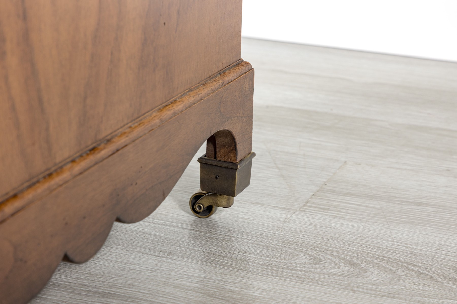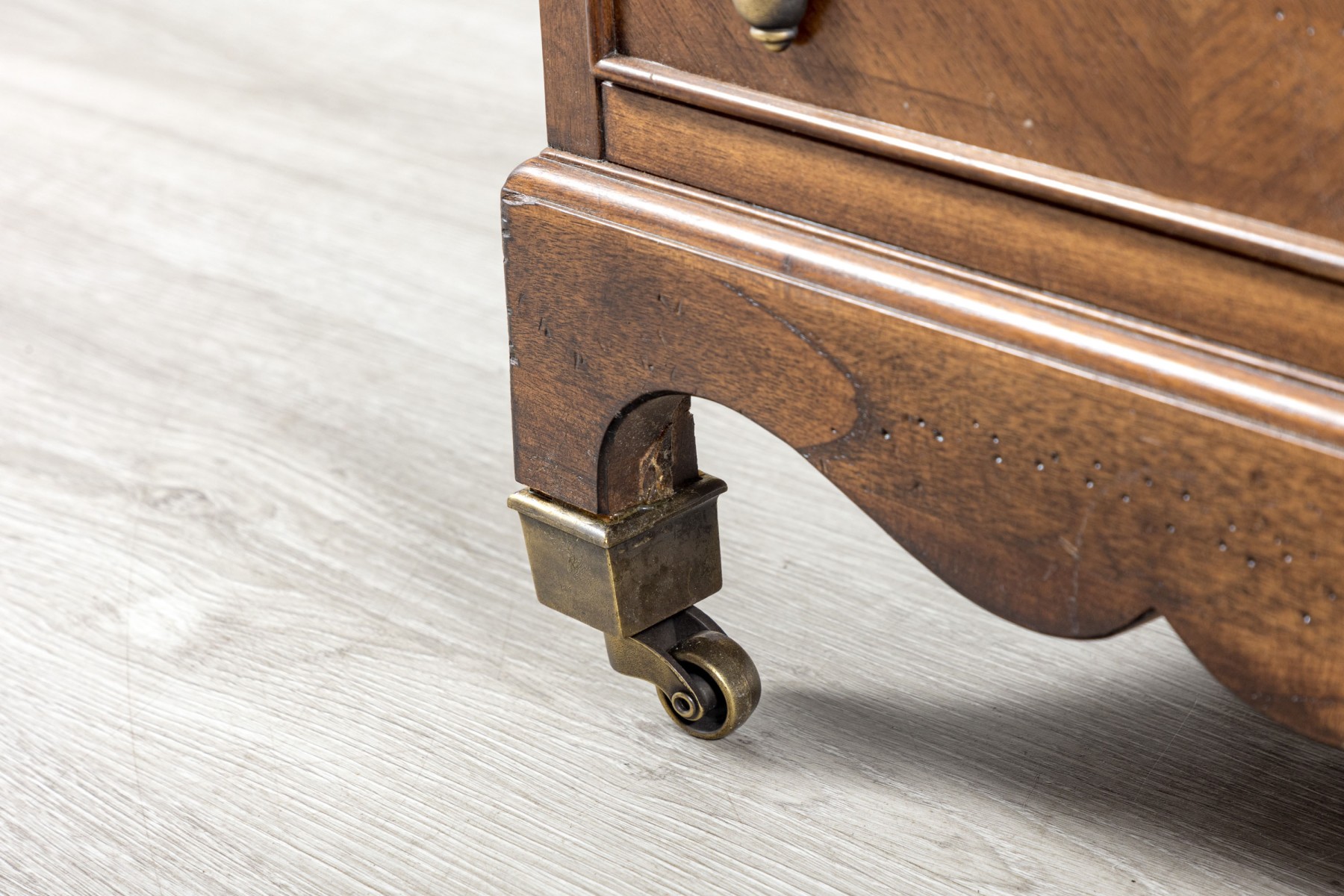 Ideal for a home office, this mango wood, Georgian-inspired chest produced by Hekman Furniture glides on brass castors. Additionally features brass pendant pulls and faux keyholes over four dovetailed and veneer-matched drawer fronts.
