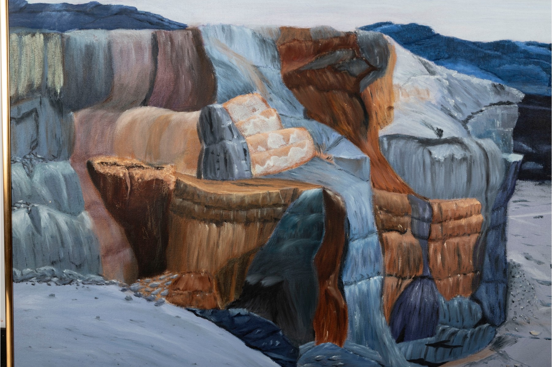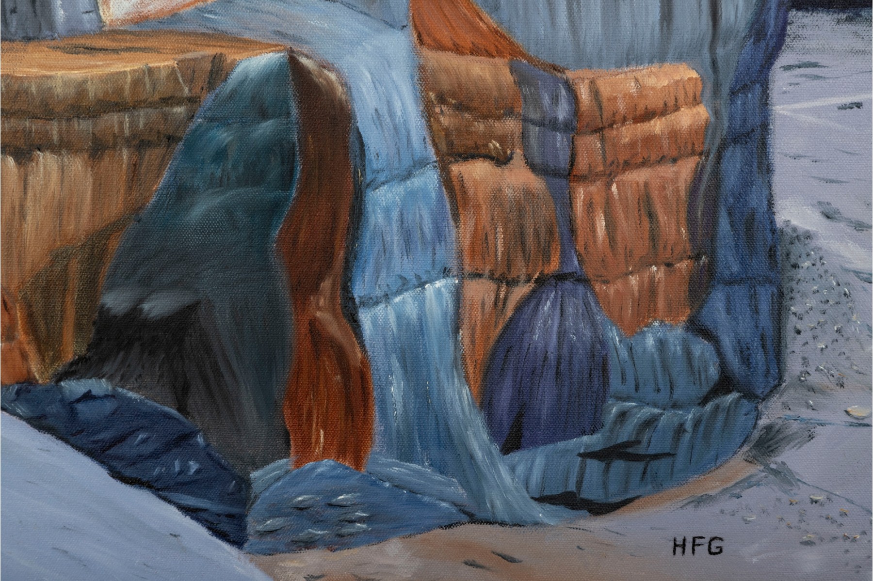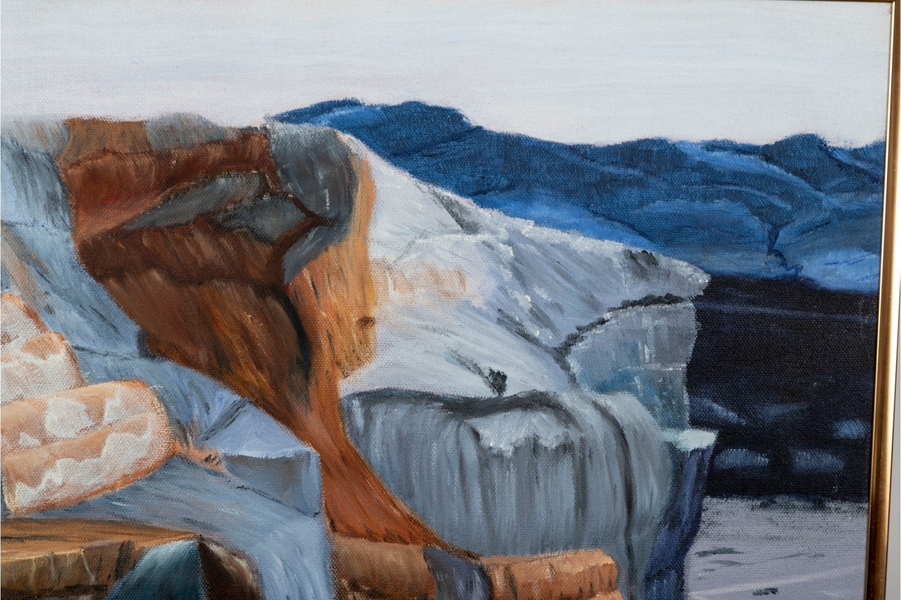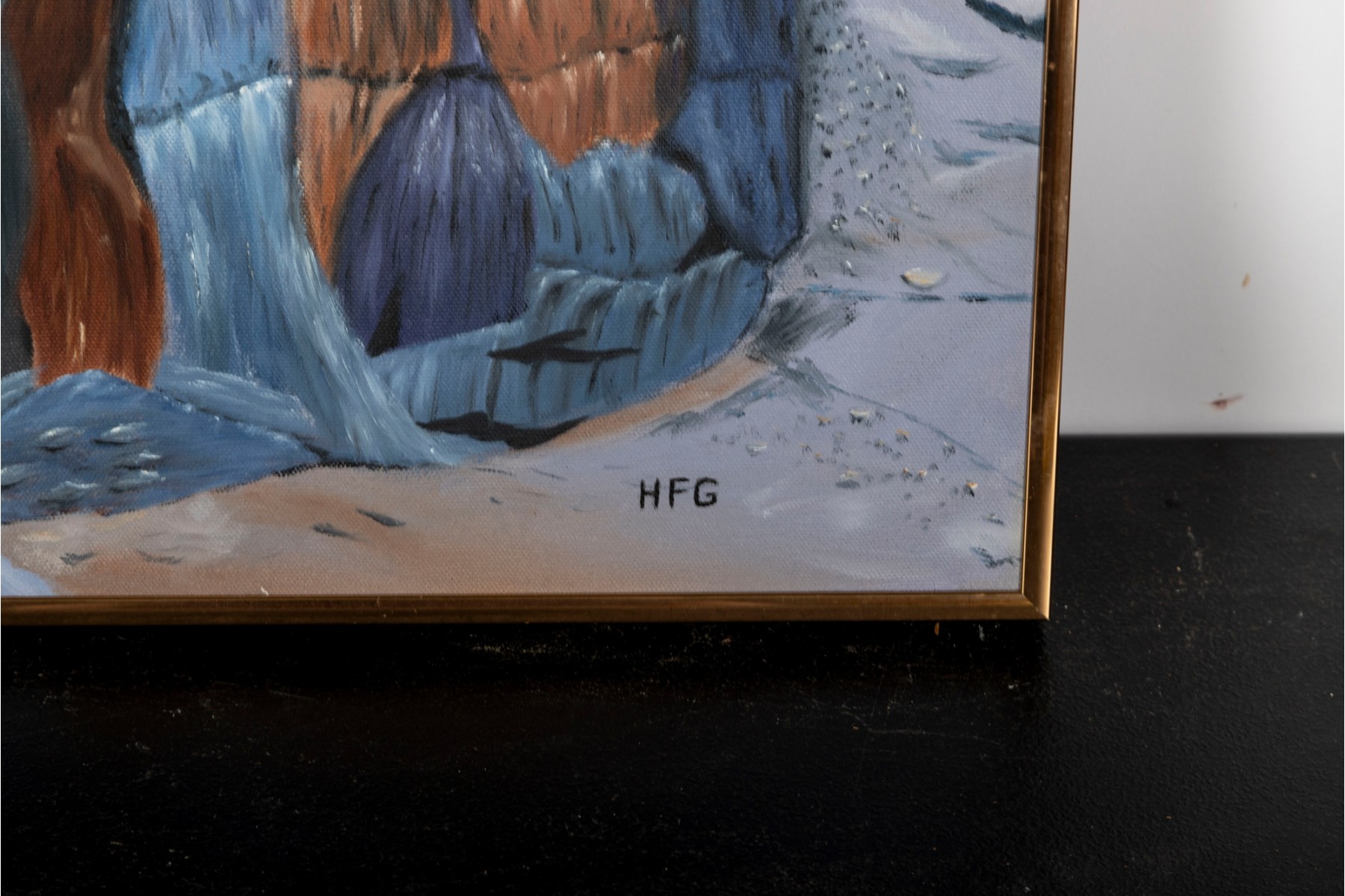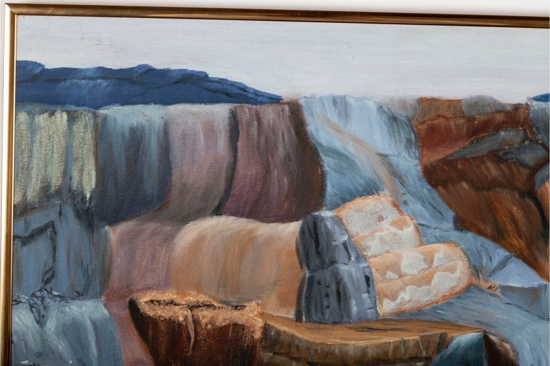 Helen F. Ginsberg (American, 1922-2011) oil painting on canvas depicting badlands with rich colors and wonderful texture. Cool blues, mauves, and warm browns make a captivating composition. Initialed lower right, with a hand-written label affixed to the verso. Displayed without glass in a simple gilt metal frame.