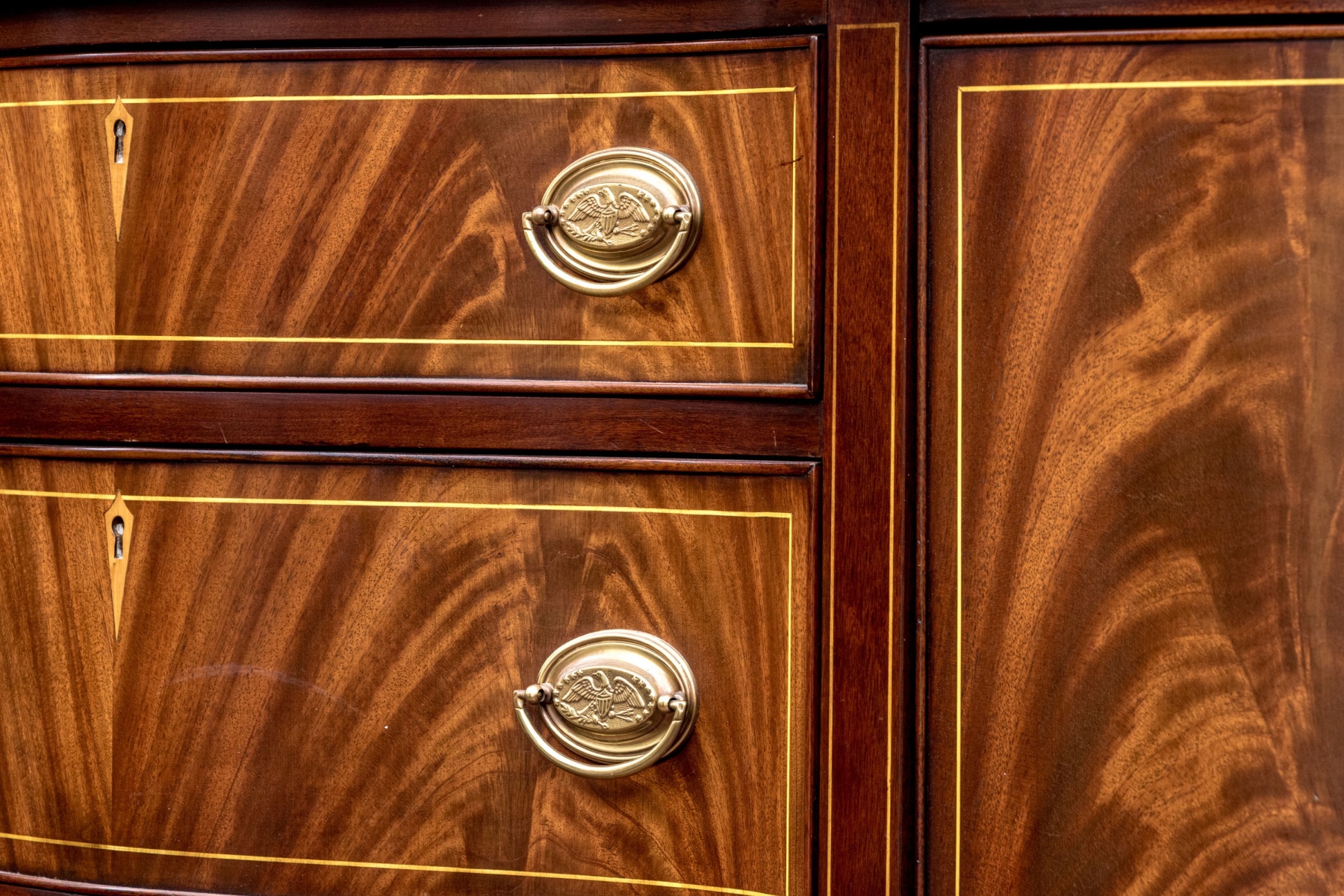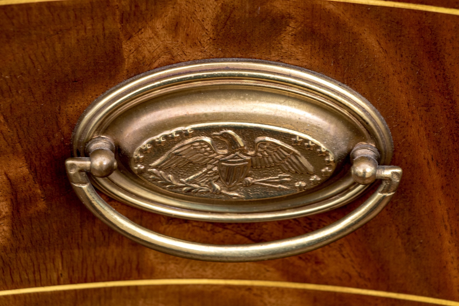 Below the tabletop, a center case of two graduated drawers sports twin brass handles on oval plaques with Great Seal of the United States motifs. Square cabinet doors flank the center, showcasing mesmerizing wood grain and fine shoestring inlays for a touch of contrast. Marquetry along the apron and straight, tapered legs completes the design, making for a timelessly elegant appearance.