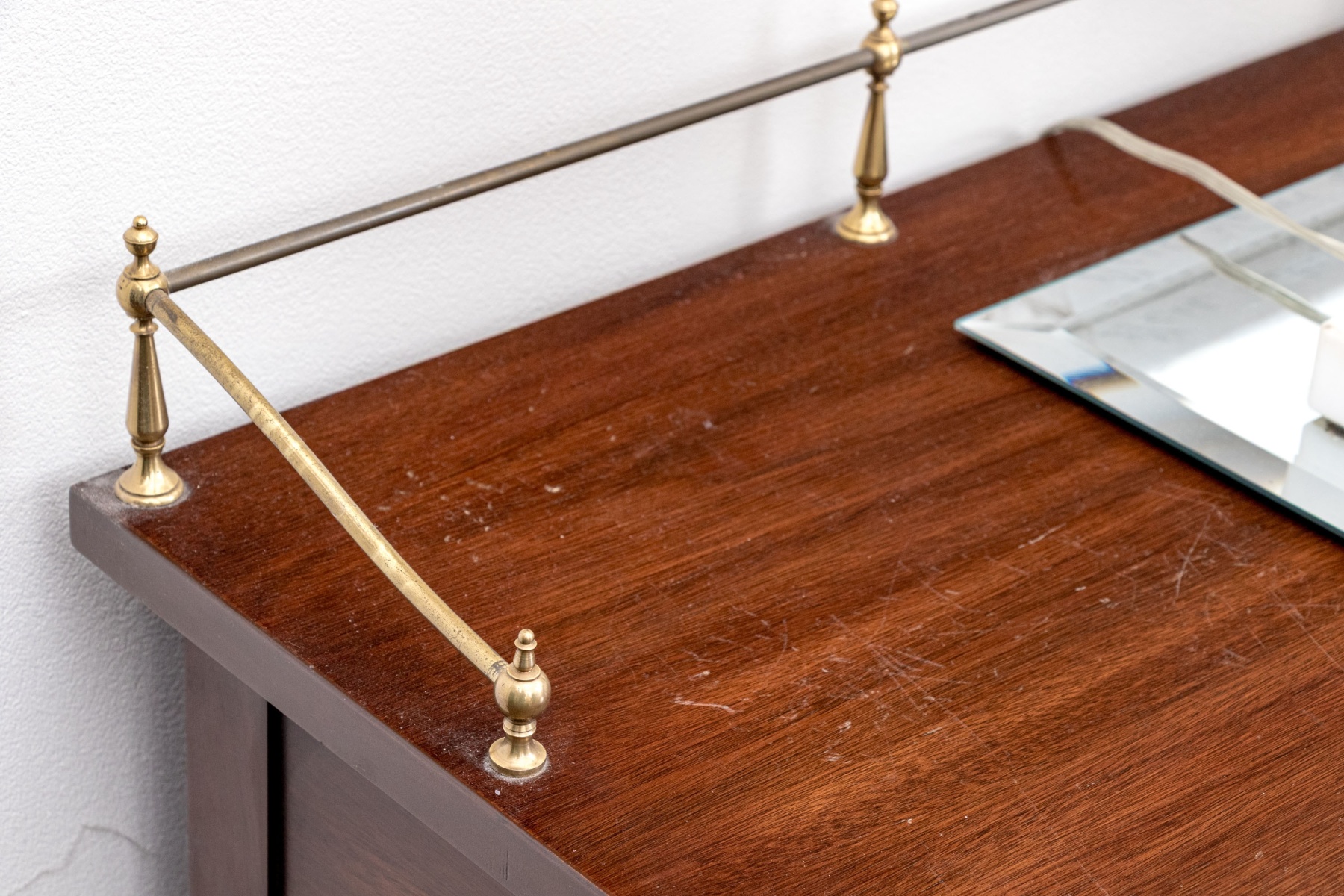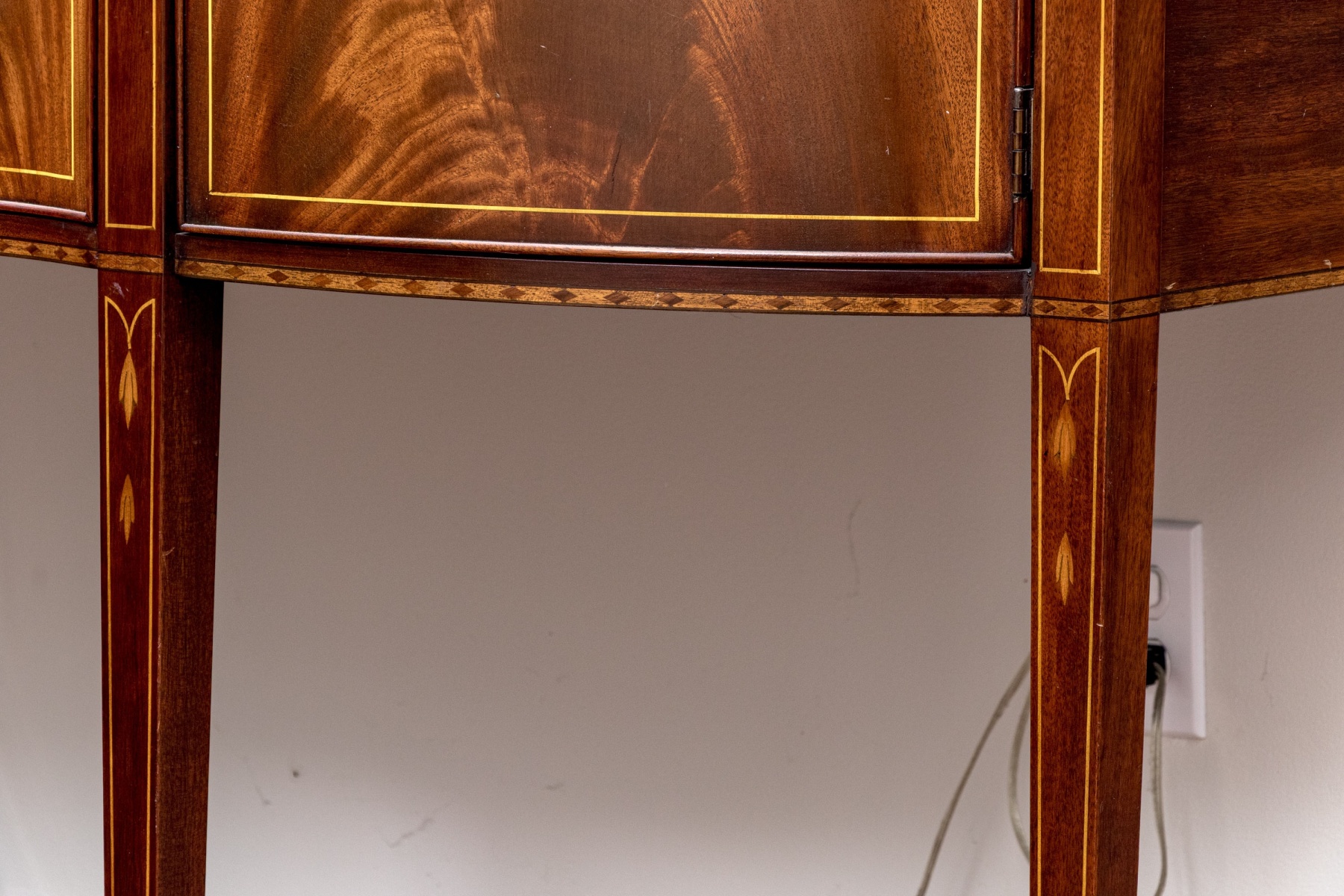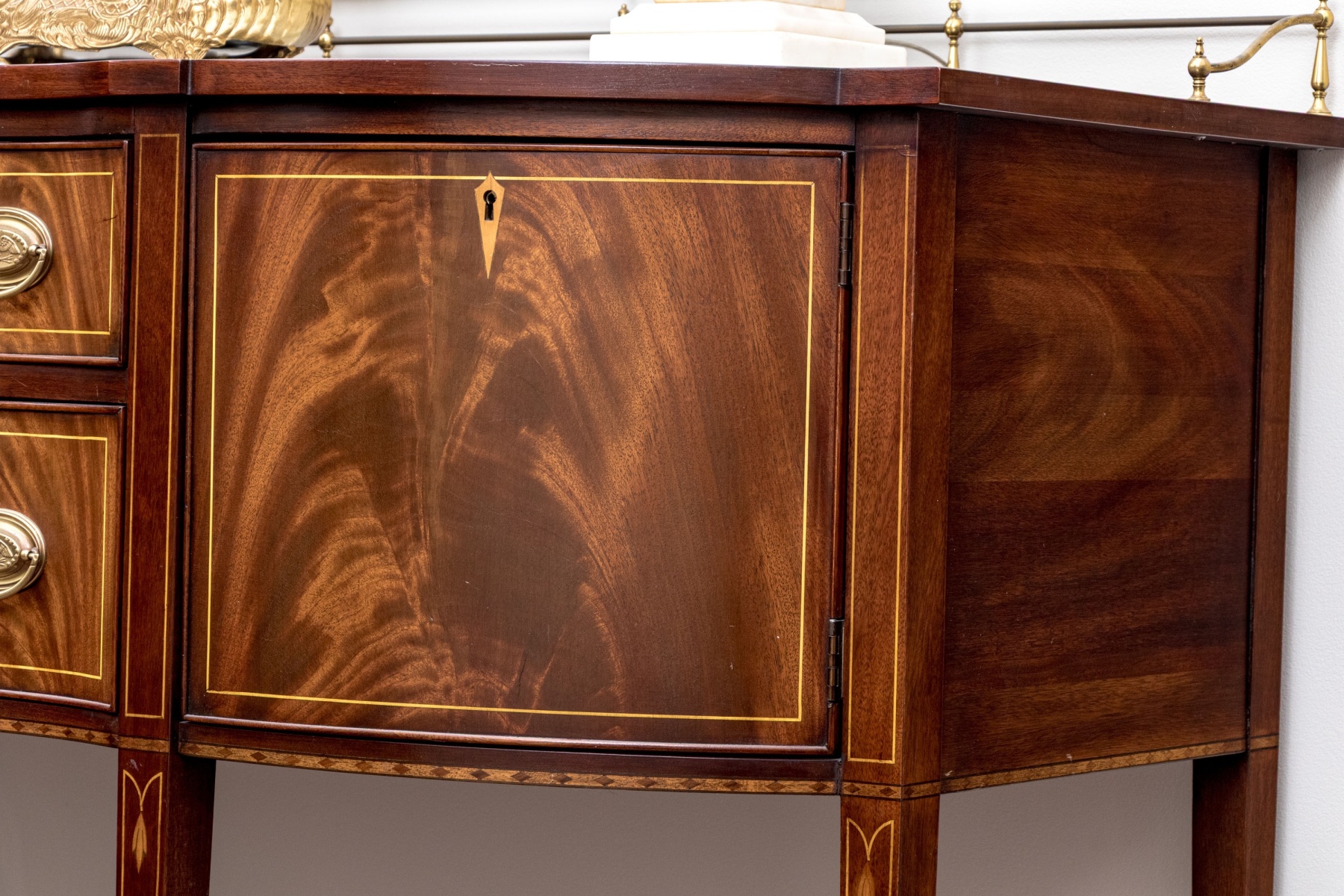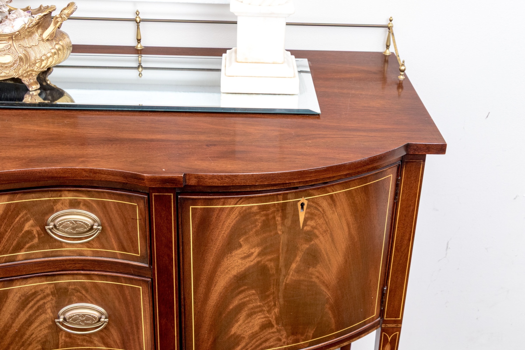 A stunning and high quality Henkel Harris sideboard with great Federal appeal, well crafted with rich, warm-toned medium brown mahogany veneers. The sideboard sports a stately oxbow form with bracketed swells creating a shapely profile along the front edge opposing a brass gallery at the back.