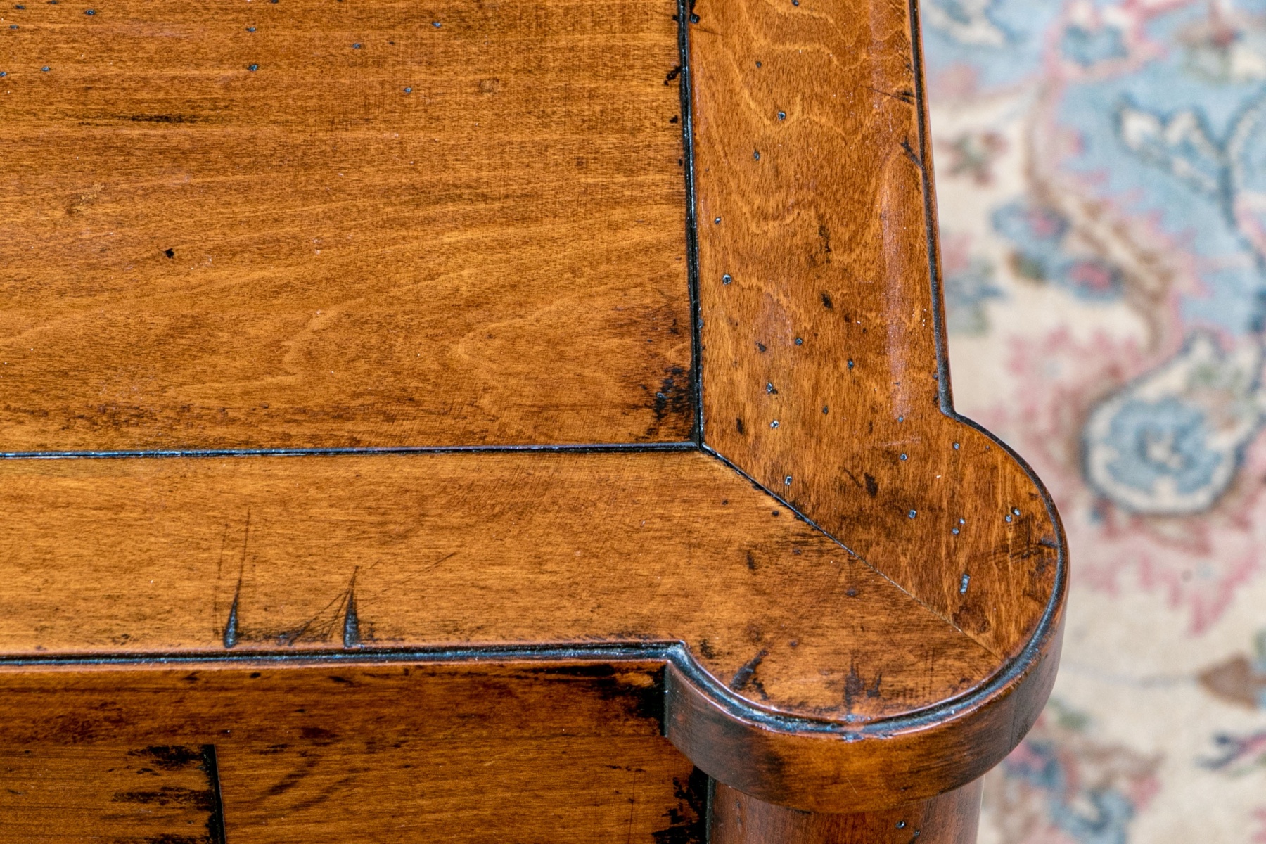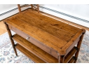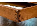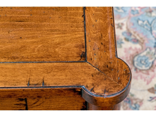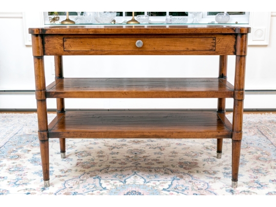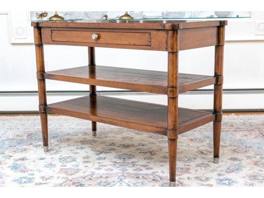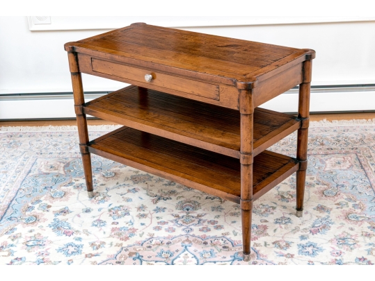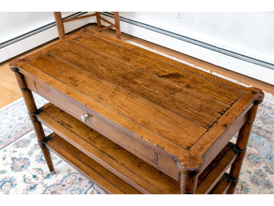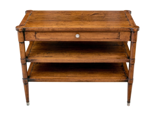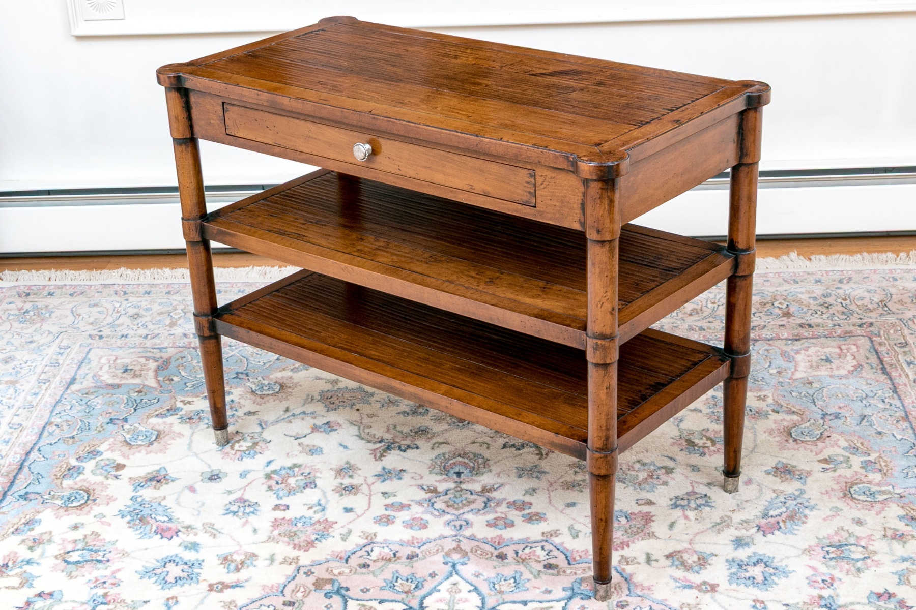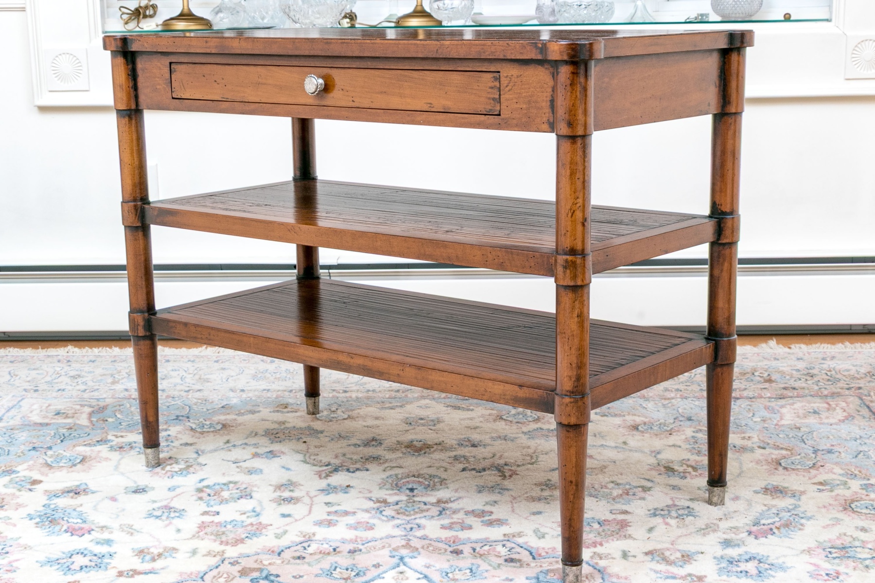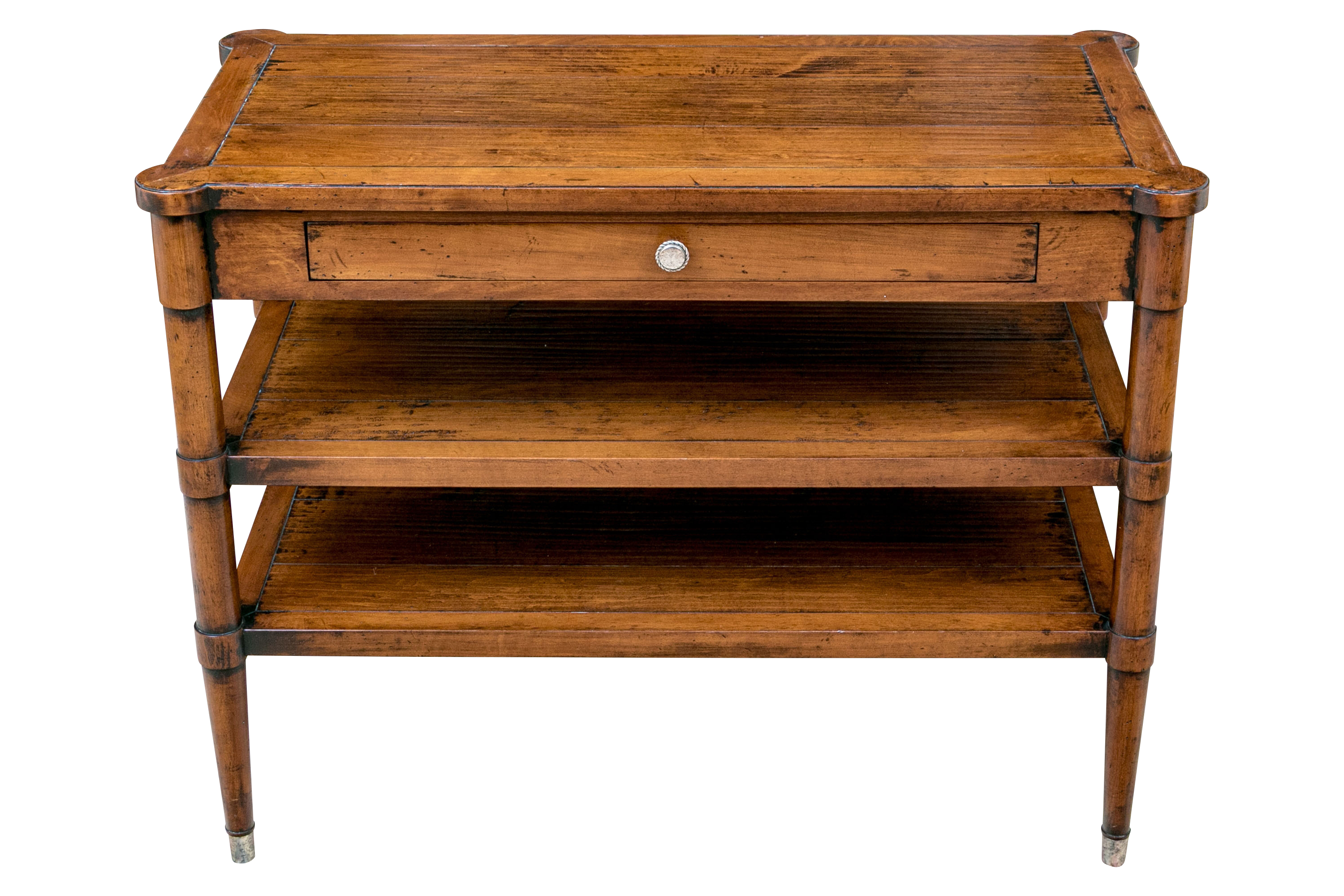 A side table by Henredon from their Acquisitions collection with planked hand hewn-style finish, cookie corners, shallow drawer, with silver-tone knob and resting on round tapering legs with brass caps. Original hangtag included.